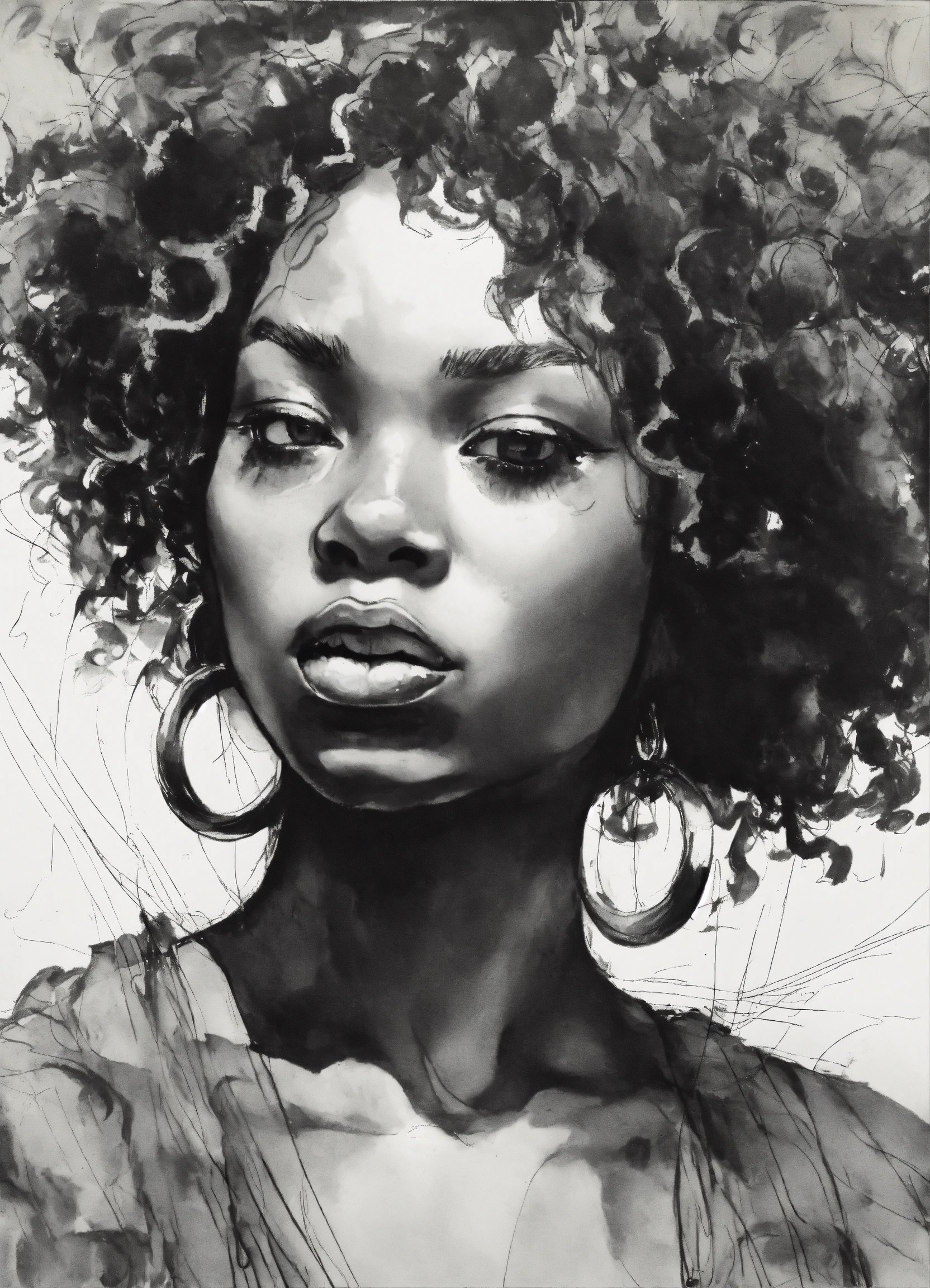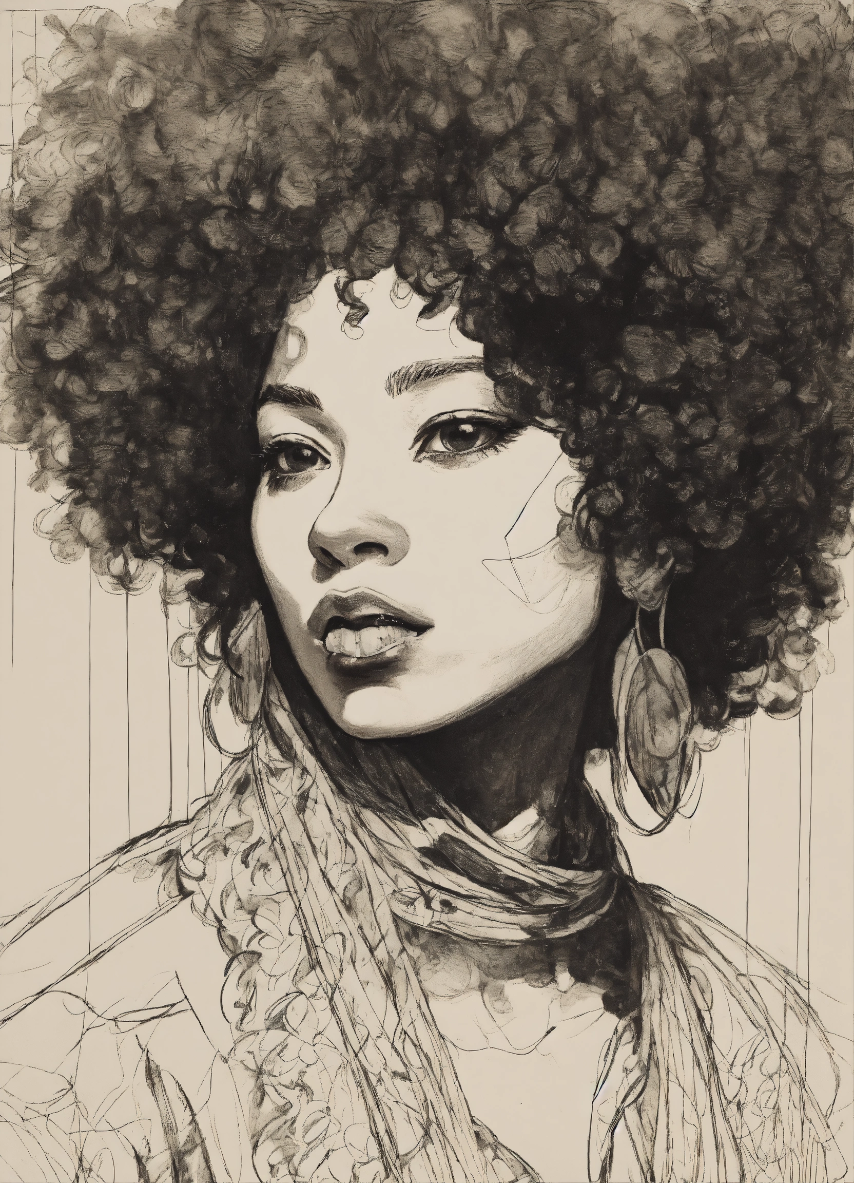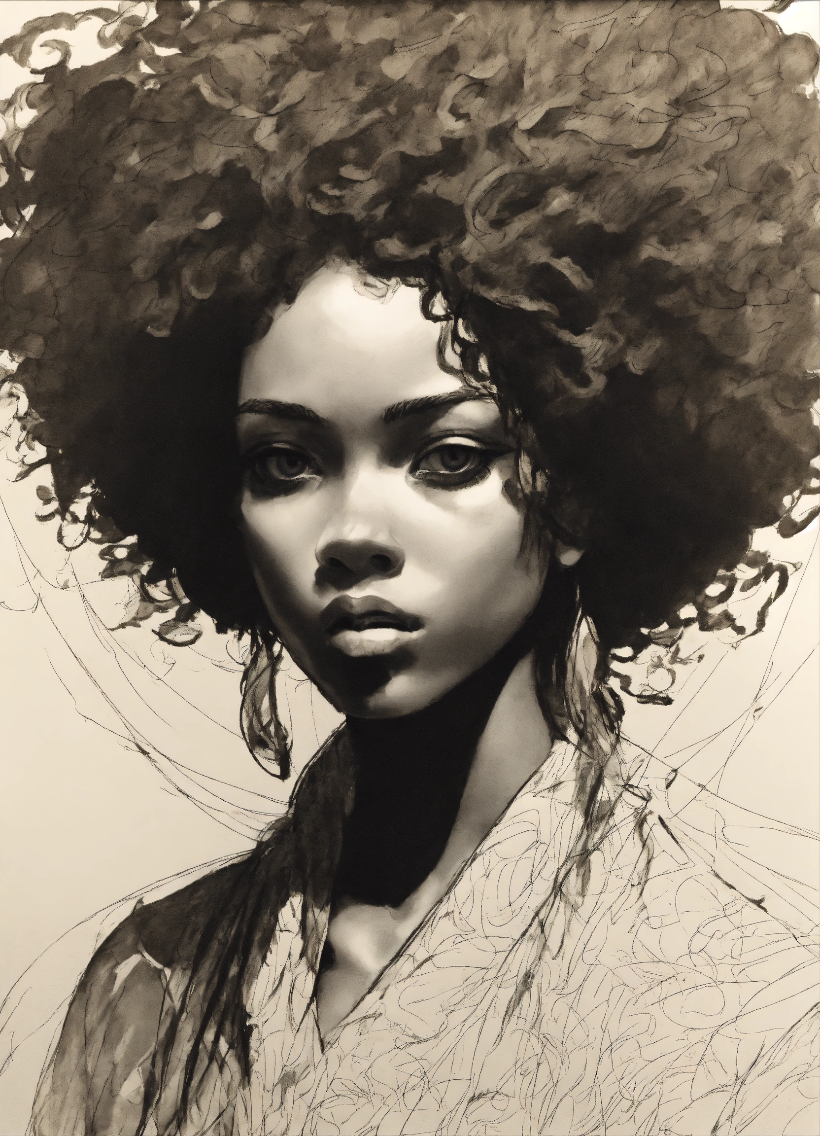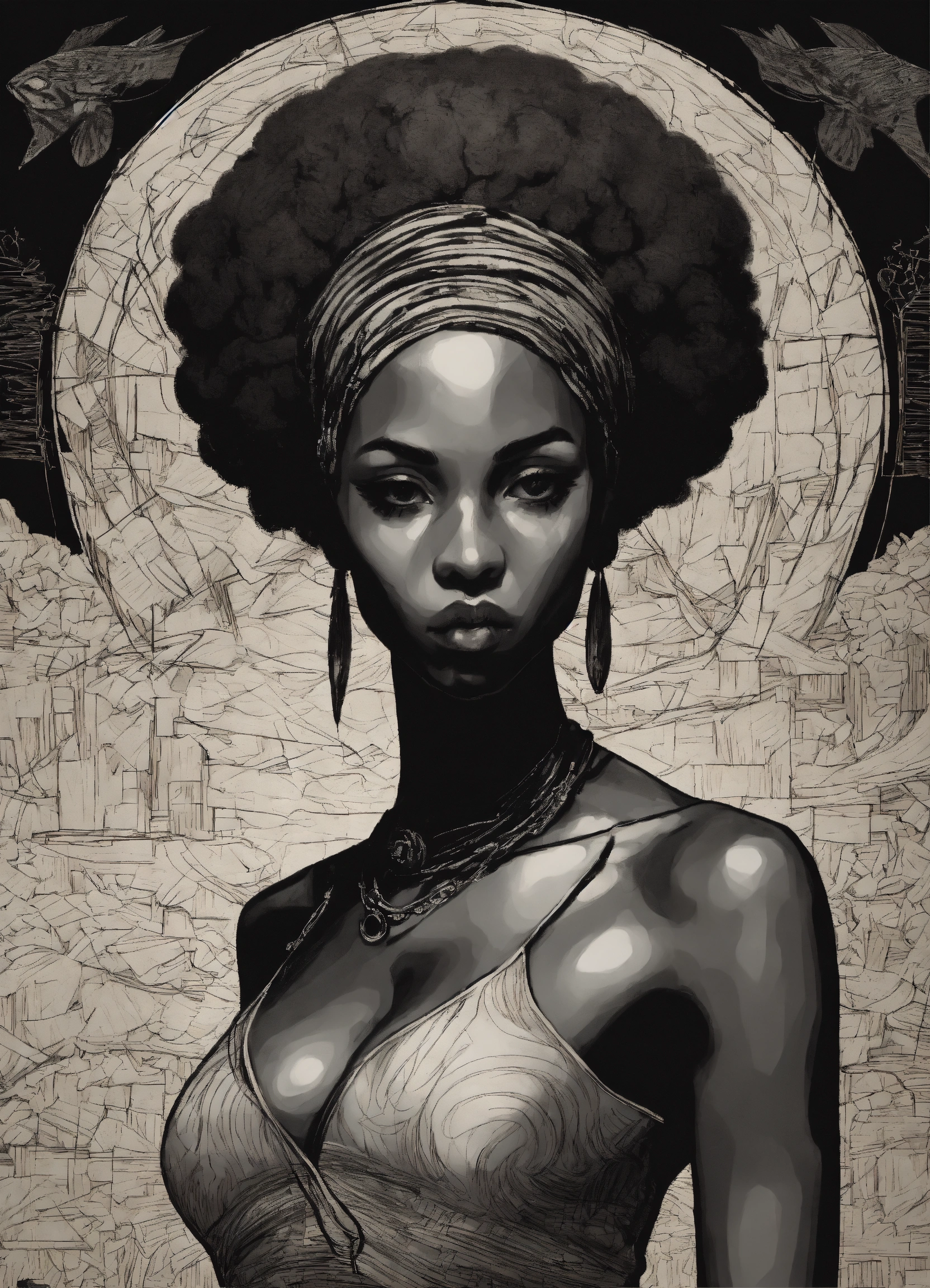 Afro, arabesque, warior, tribal, african, baroque, leonardo da vinci, motif africain, caravaggio, scratchy pen strokes, blind contour, fisheye perspective closeup, beautiful girl, s face in darkness, stark hatch shaded sketchy scribbly, ink, strong angular shapes, woodcut shading, pen strokes, pouty lips, hungry eyes, minimalist realistic, anime proportions, distorted perspective