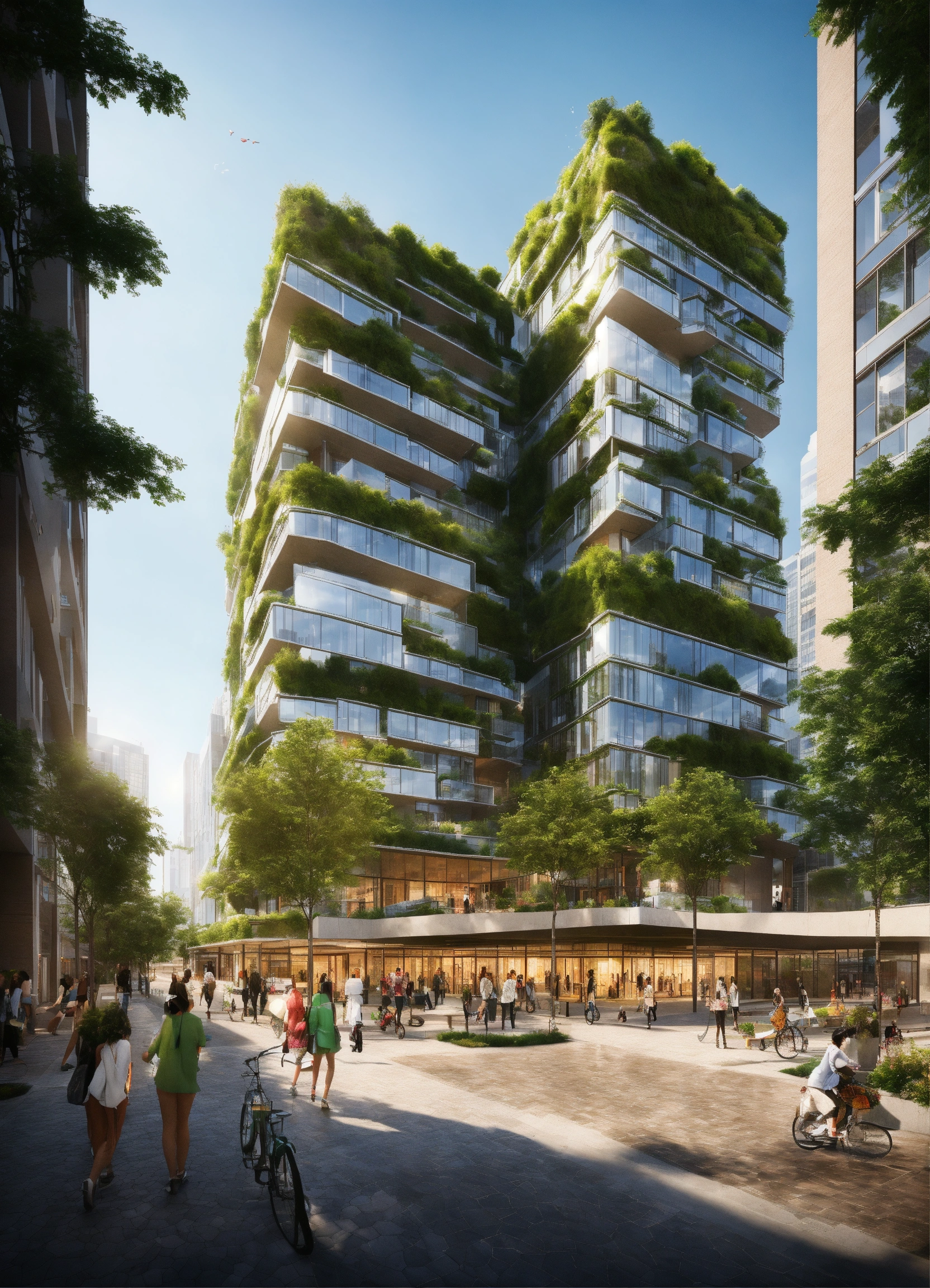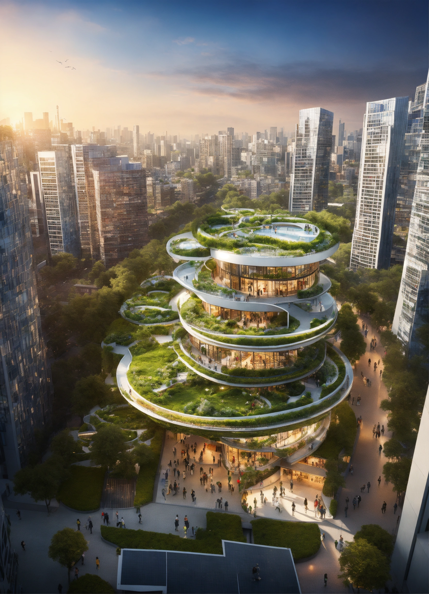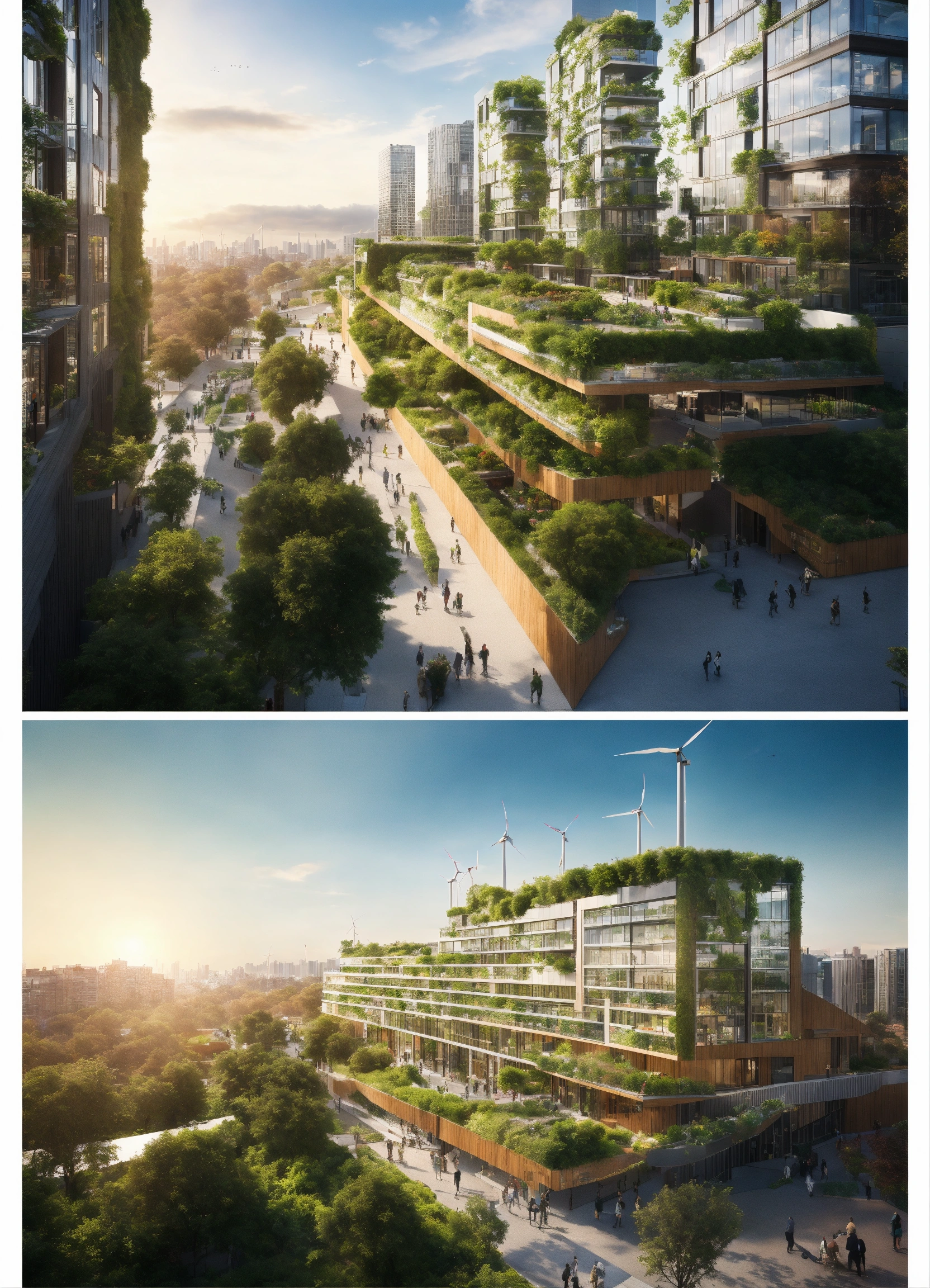 "create an image of a sustainable and modern cityscape that integrates green technology and eco-friendly architecture. include rooftop gardens, solar panels, wind turbines, and electric public transportation. the buildings should be modern with clean lines and glass facades to reflect a high-tech environment. there should be pedestrian-friendly spaces with people enjoying the outdoor green areas. the atmosphere should be vibrant and the sky clear to emphasize a pollution-free environment."