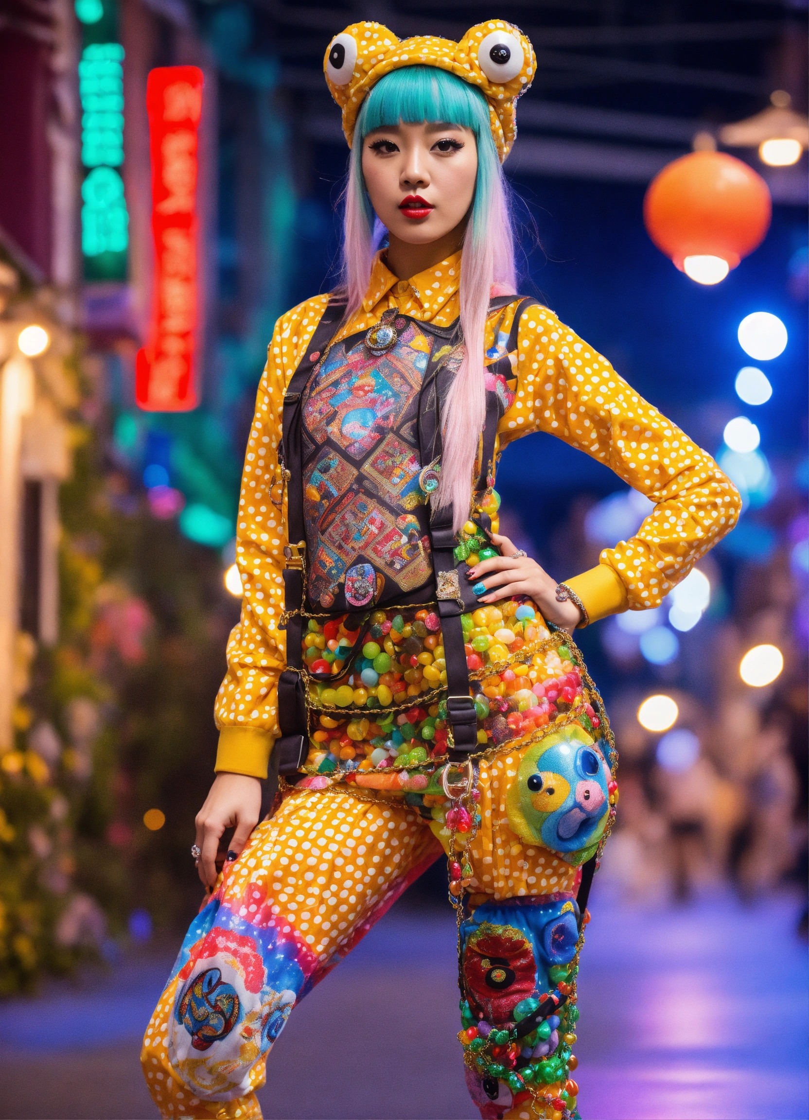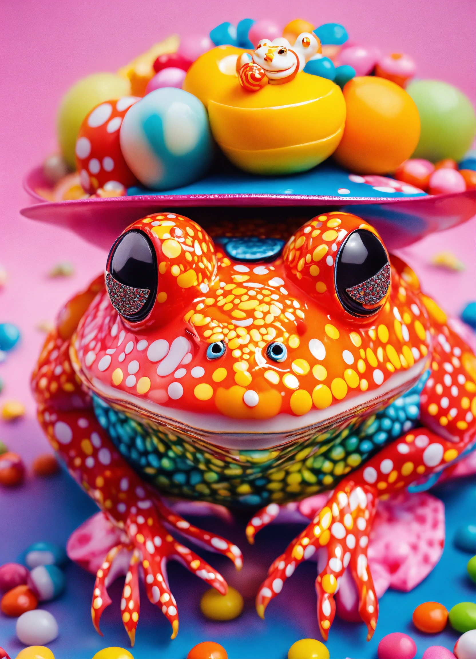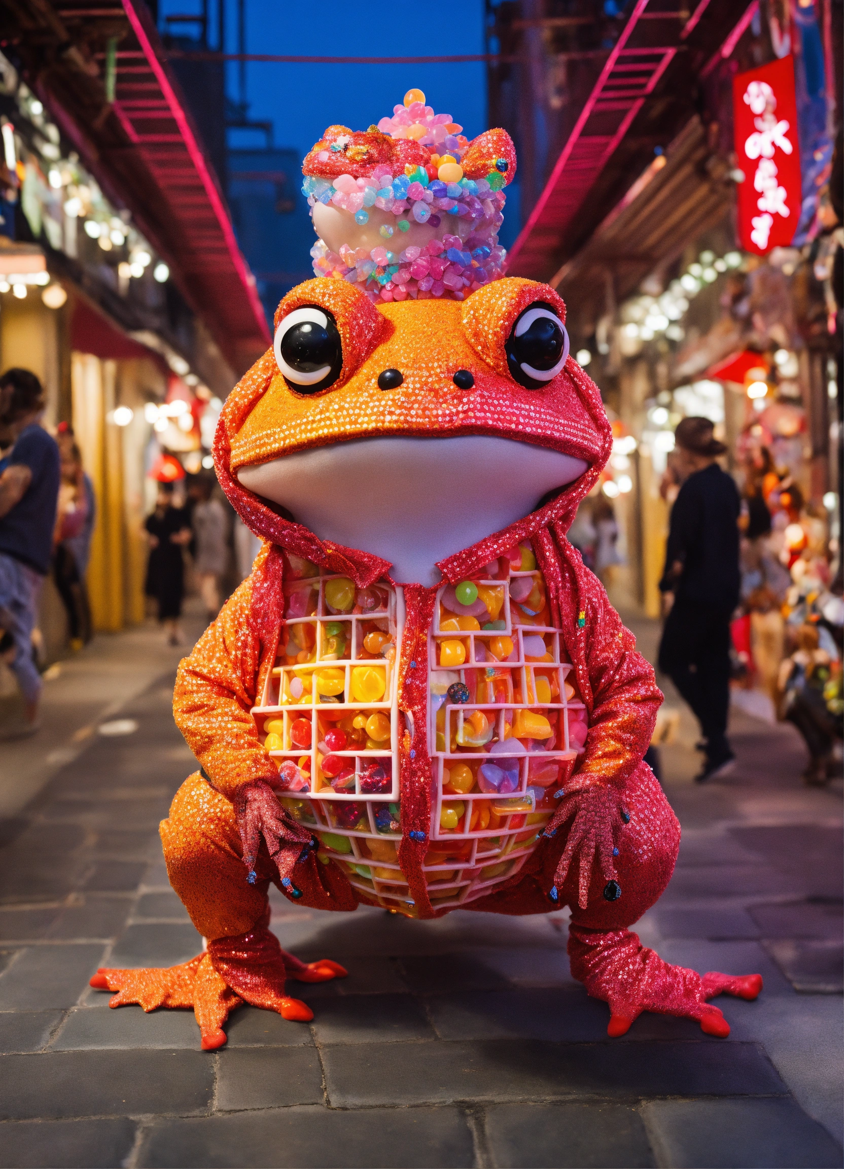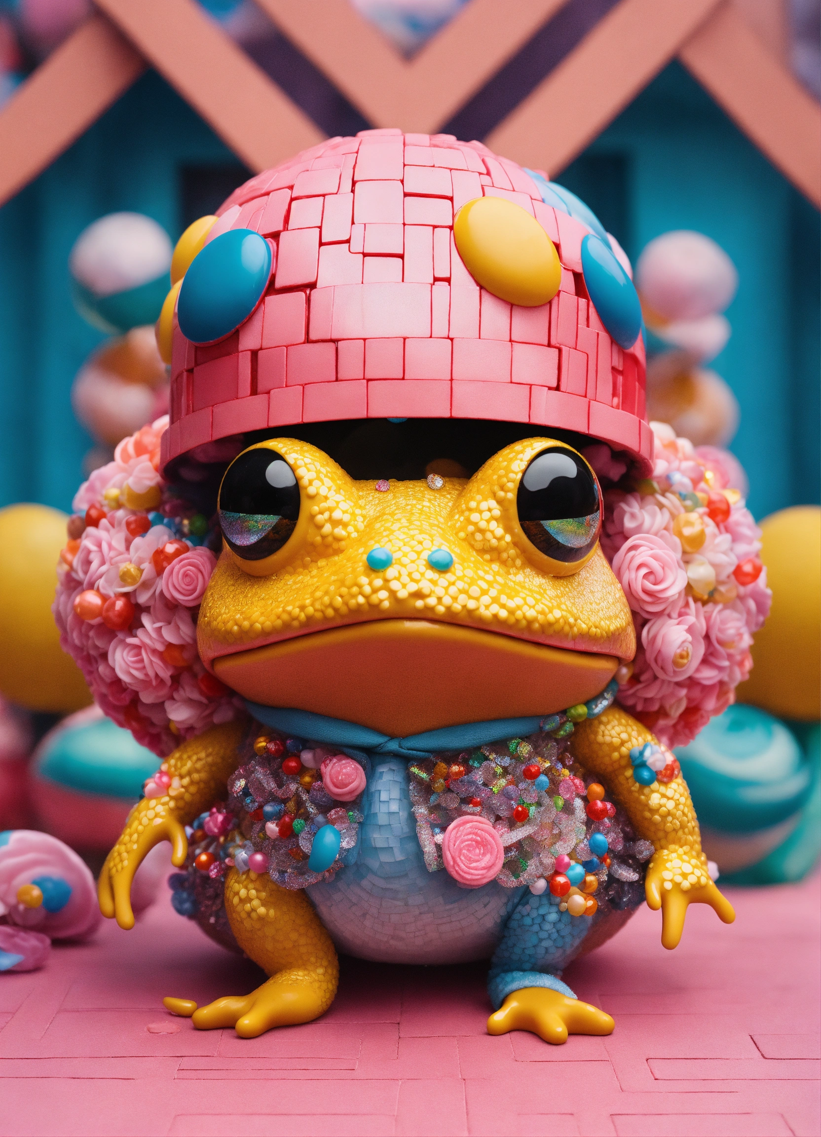 Photorealistic fashion full body portrait toad made out of 3d optical illusion ying yang maze haute couture street wear, kawaii colorado candy festival raver dancing with crystal kawaii chains, ninja in folk costume in a fashion magazine
