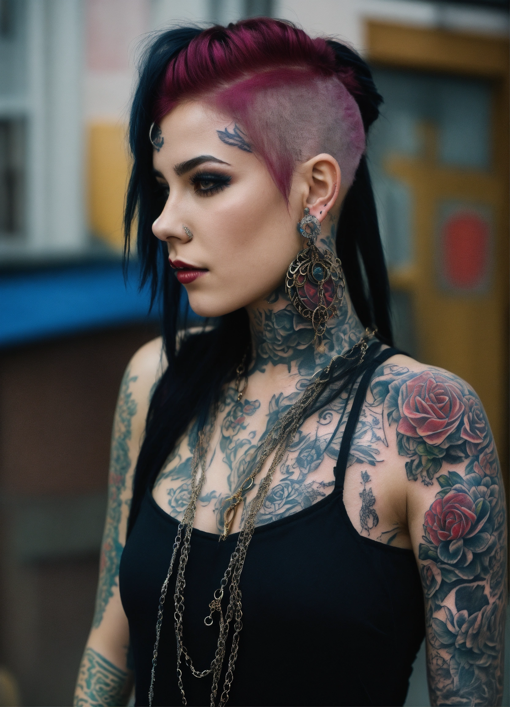 Goth girl, tattoos on face, bustier, both arms heavily tattooed, big earrings in the ears, a strong chain around the neck, hair coloured and brushed strongly upwards.
