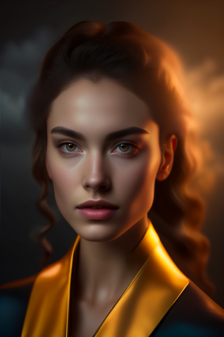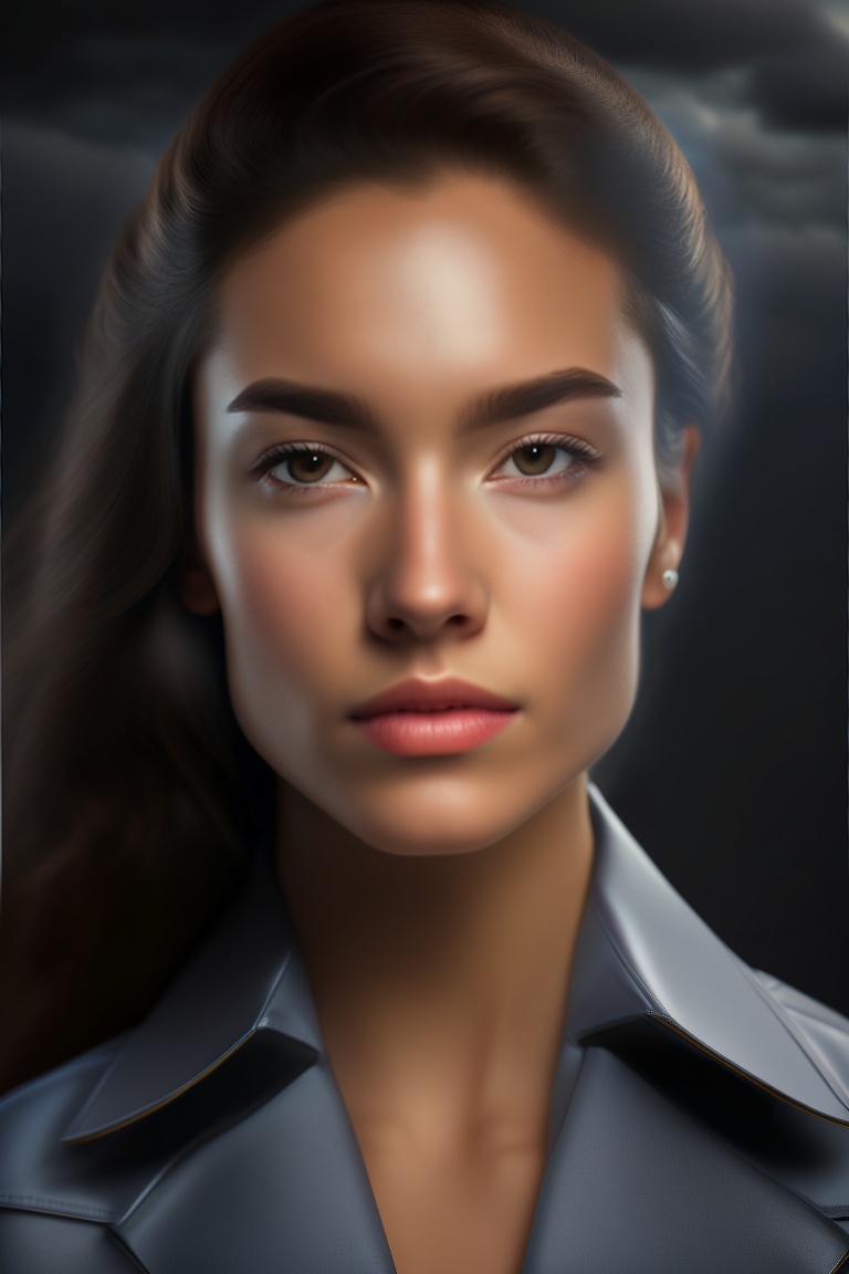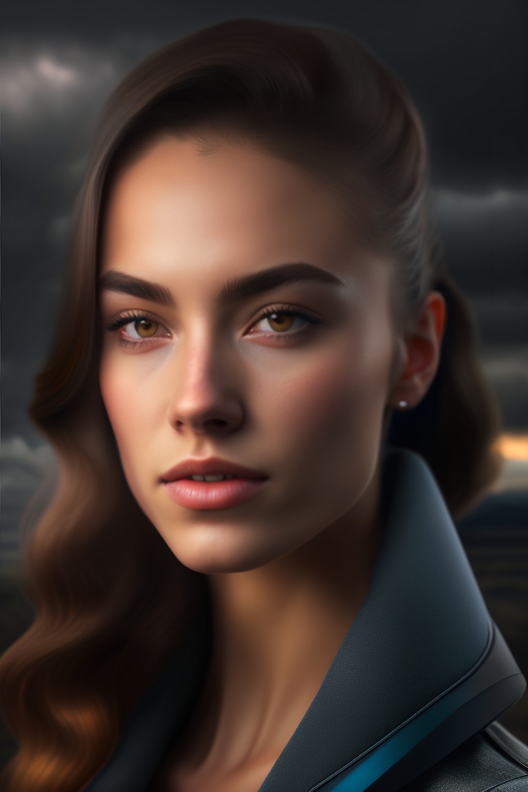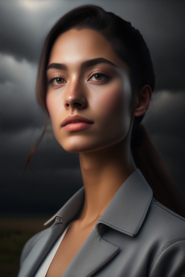 Ultra-realistic photograph of a young woman with a dynamic expression, captured with a fujifilm gfx 100 and a 110mm f/2 lens. photo realism, balanced studio lighting, capturing the drama and emotion in her intense gaze. taken far from urban distractions, against the backdrop of a stormy sky. the intensity of her gaze mirrored in the brooding storm clouds. 8k resolution, hdr, highly detailed, rtx, cinematic lighting, unreal engine.