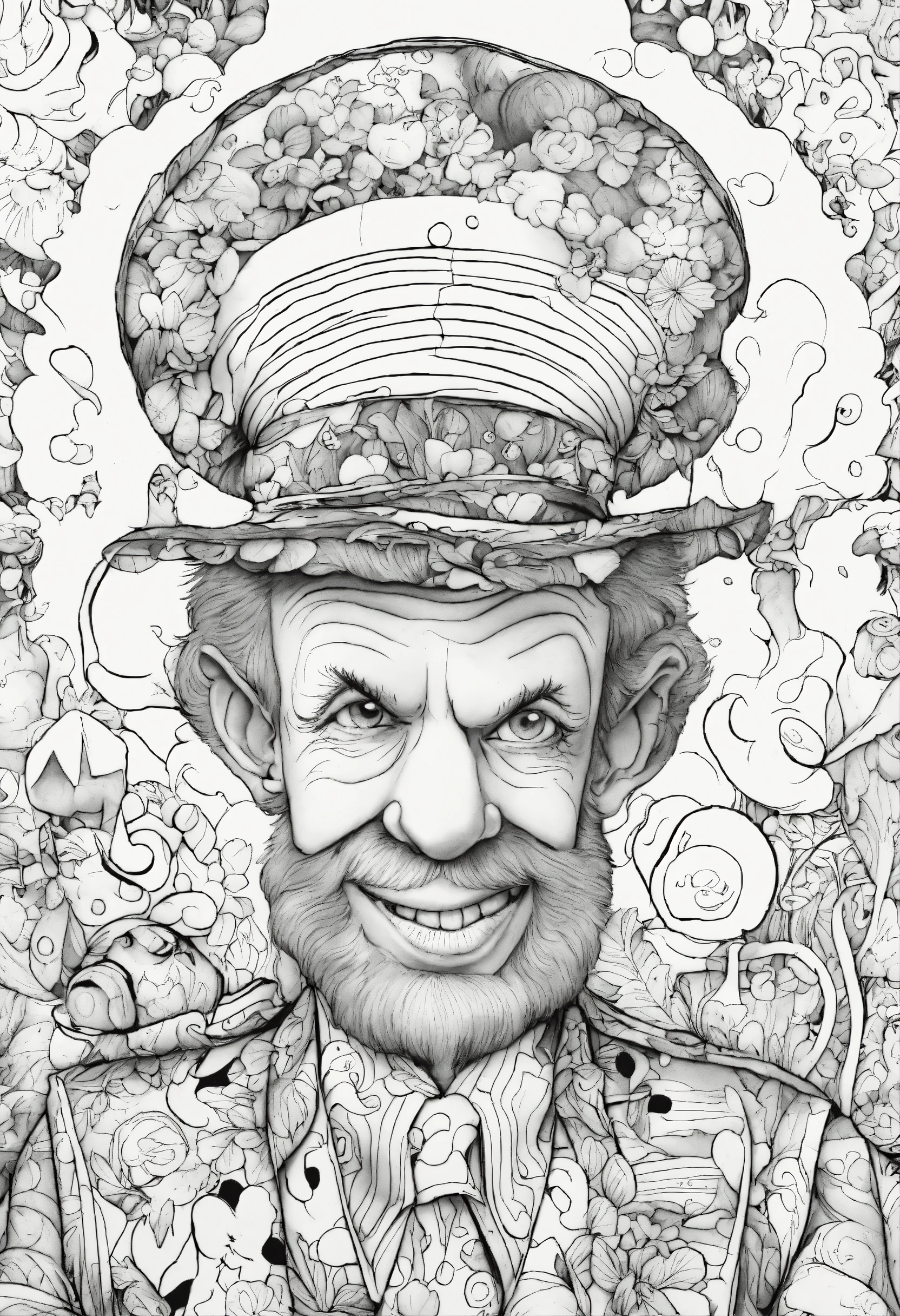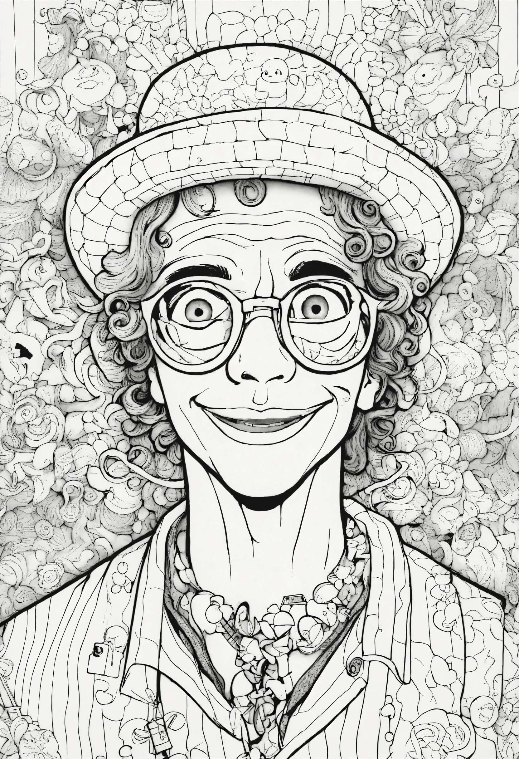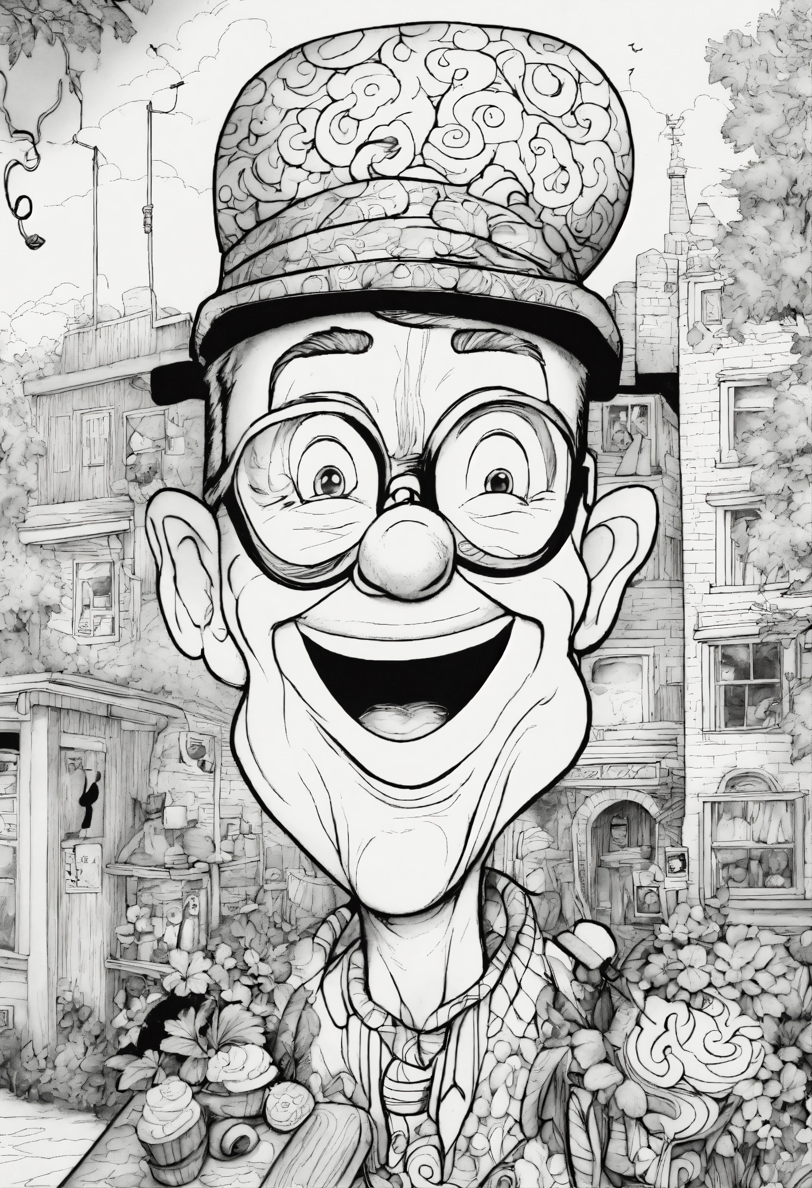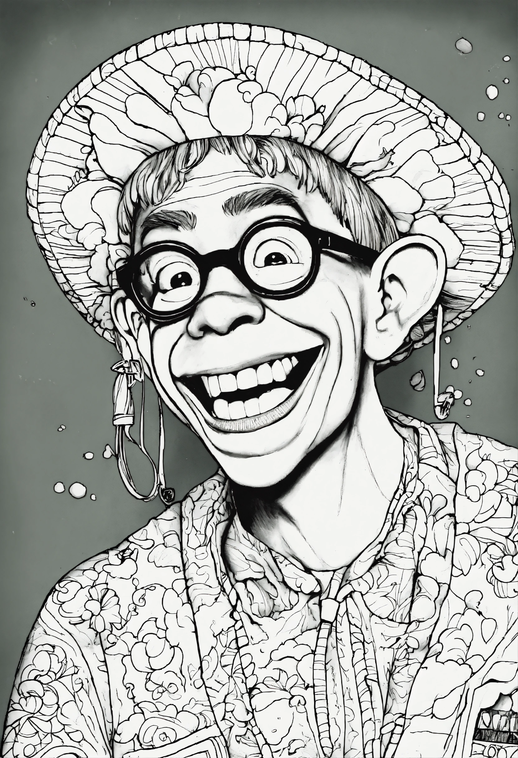 Coloring page for adults, whimsical art, mad magazine character goofball, black and white, white background