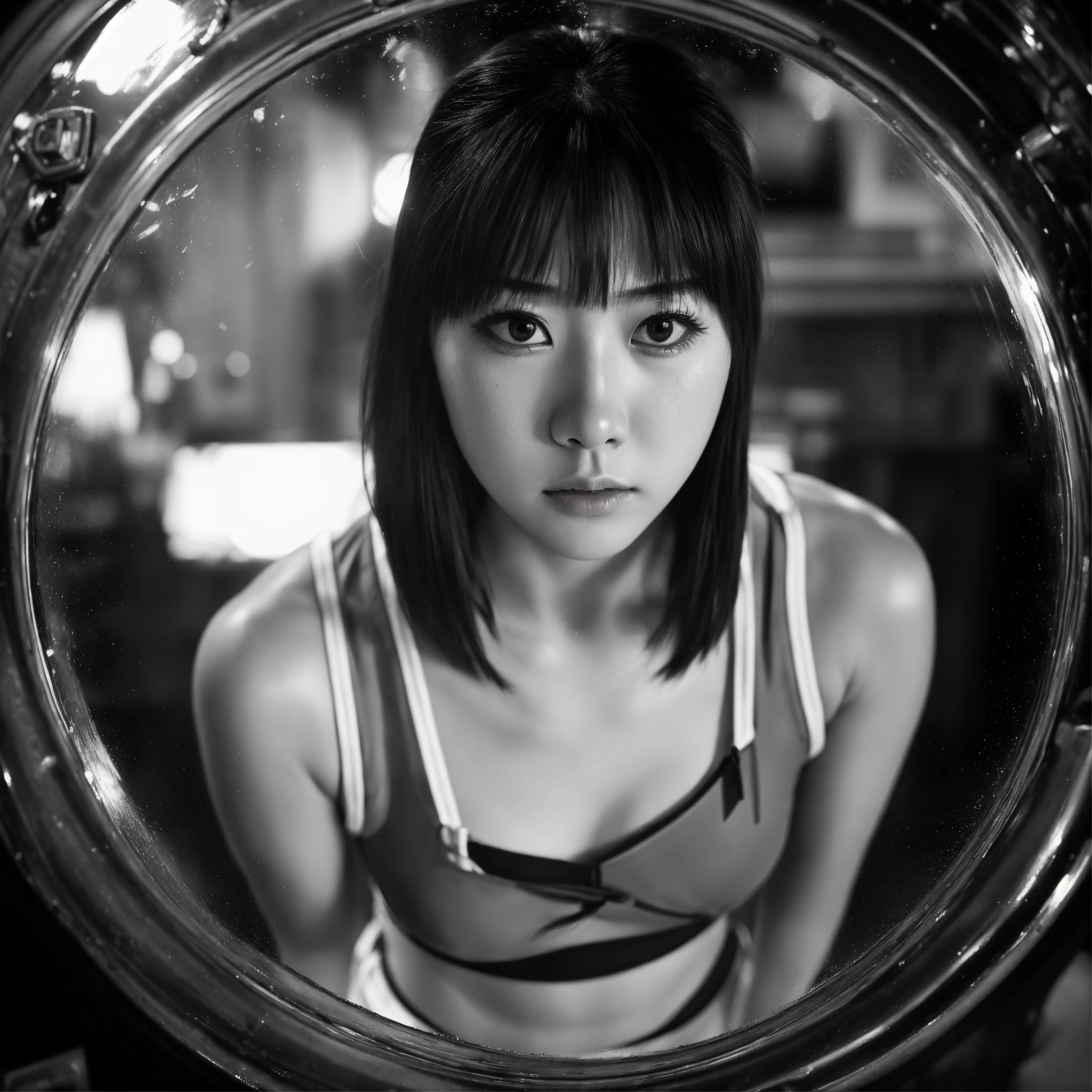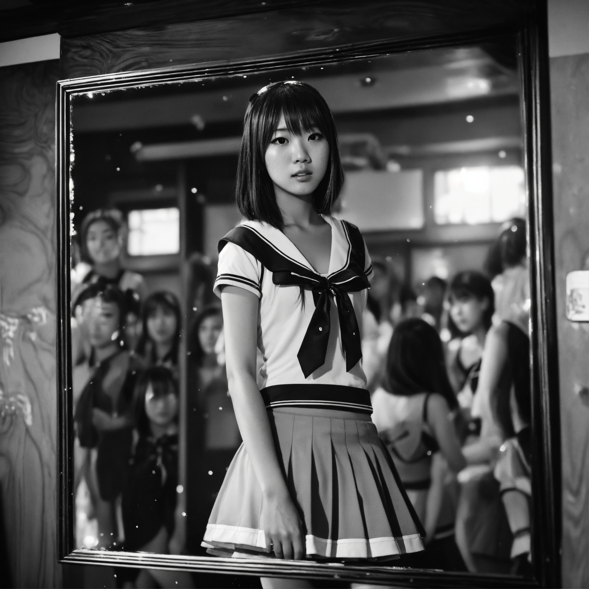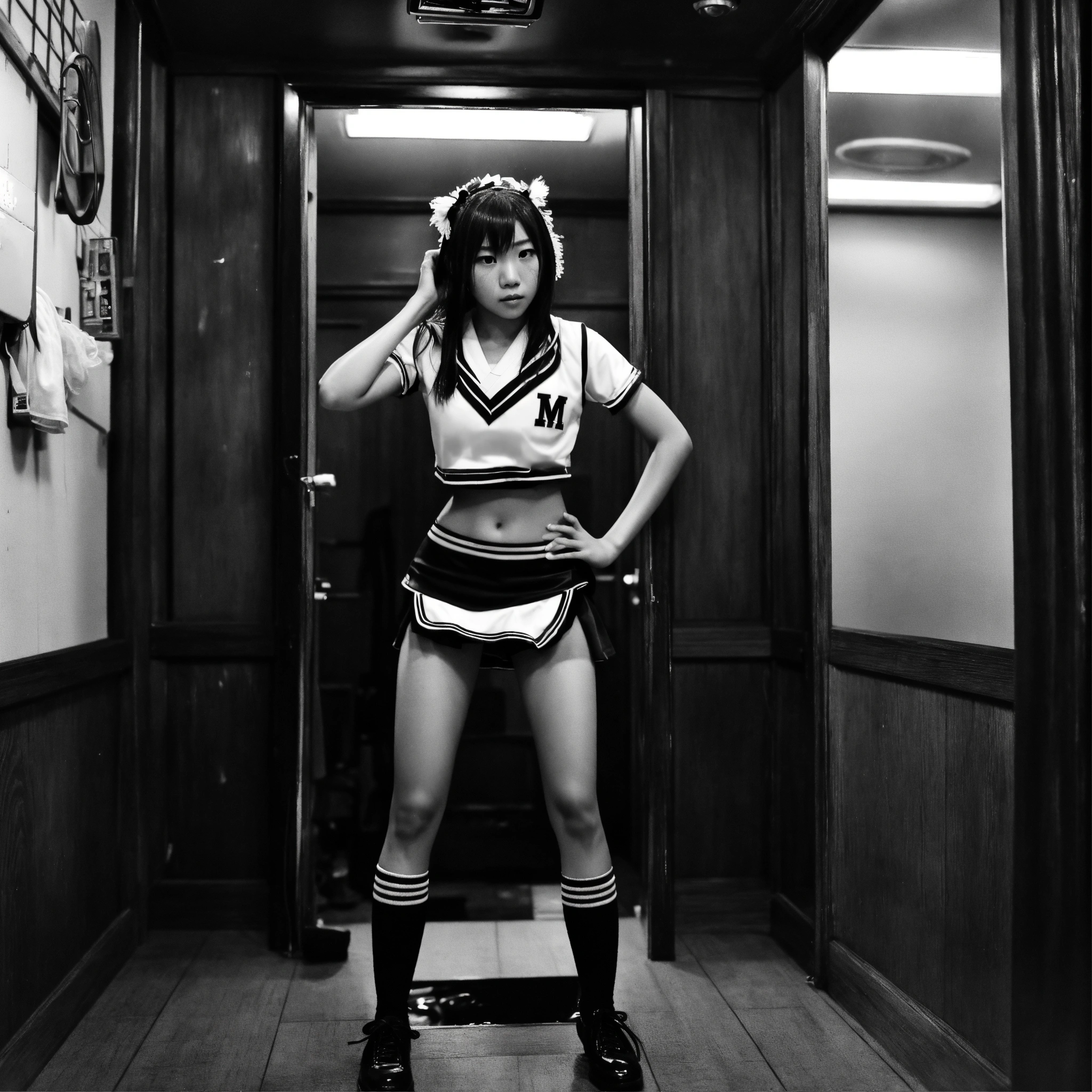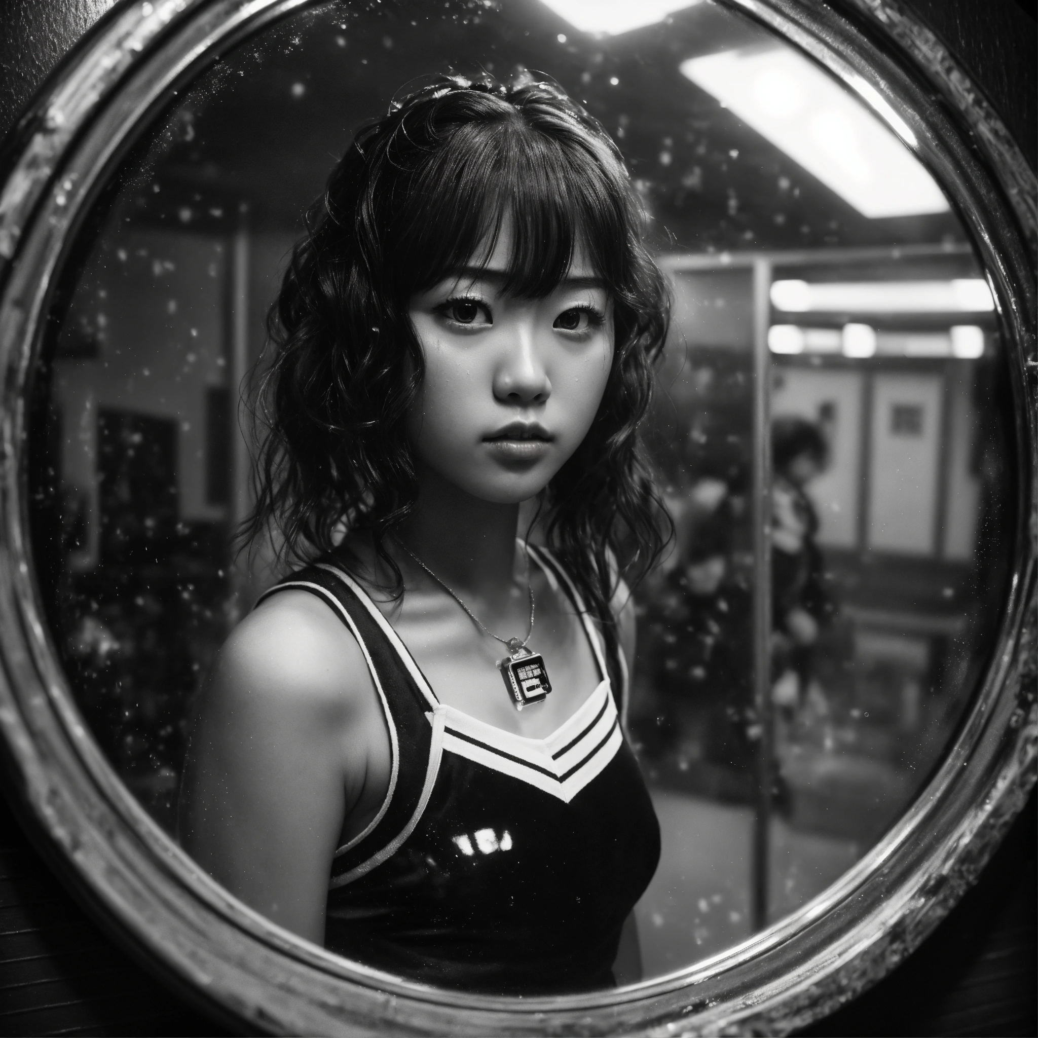 Extremely detailed photographic image, portrait of an extremely sweat-drenched beautiful japanese realistic high school idol girl, captured by a surveillance camera inside a mirror, from the ceiling of the scene, dressed in a idol-like cheerleader costume with mini skirt, in a grainy monochrome image, staring into the camera