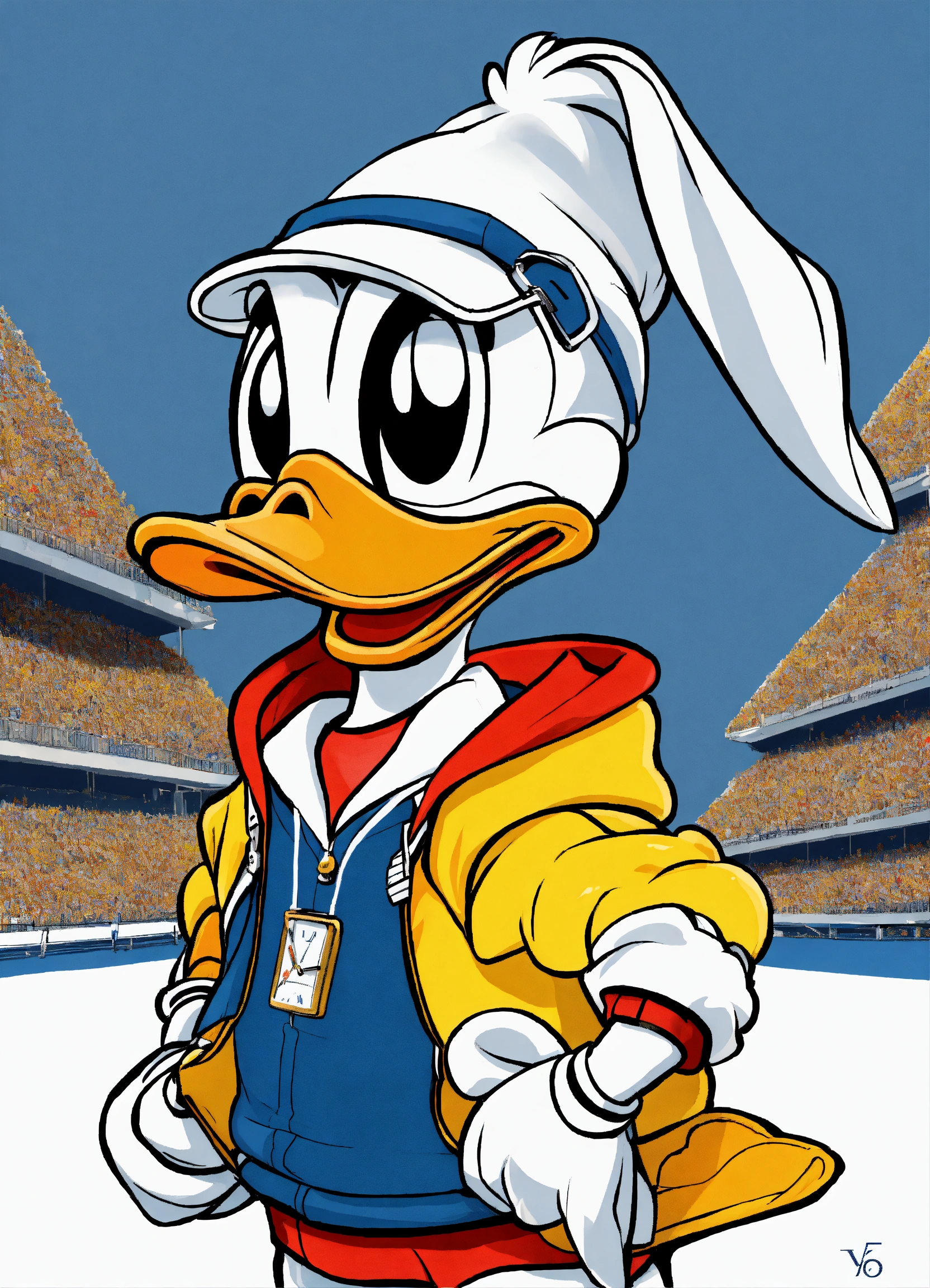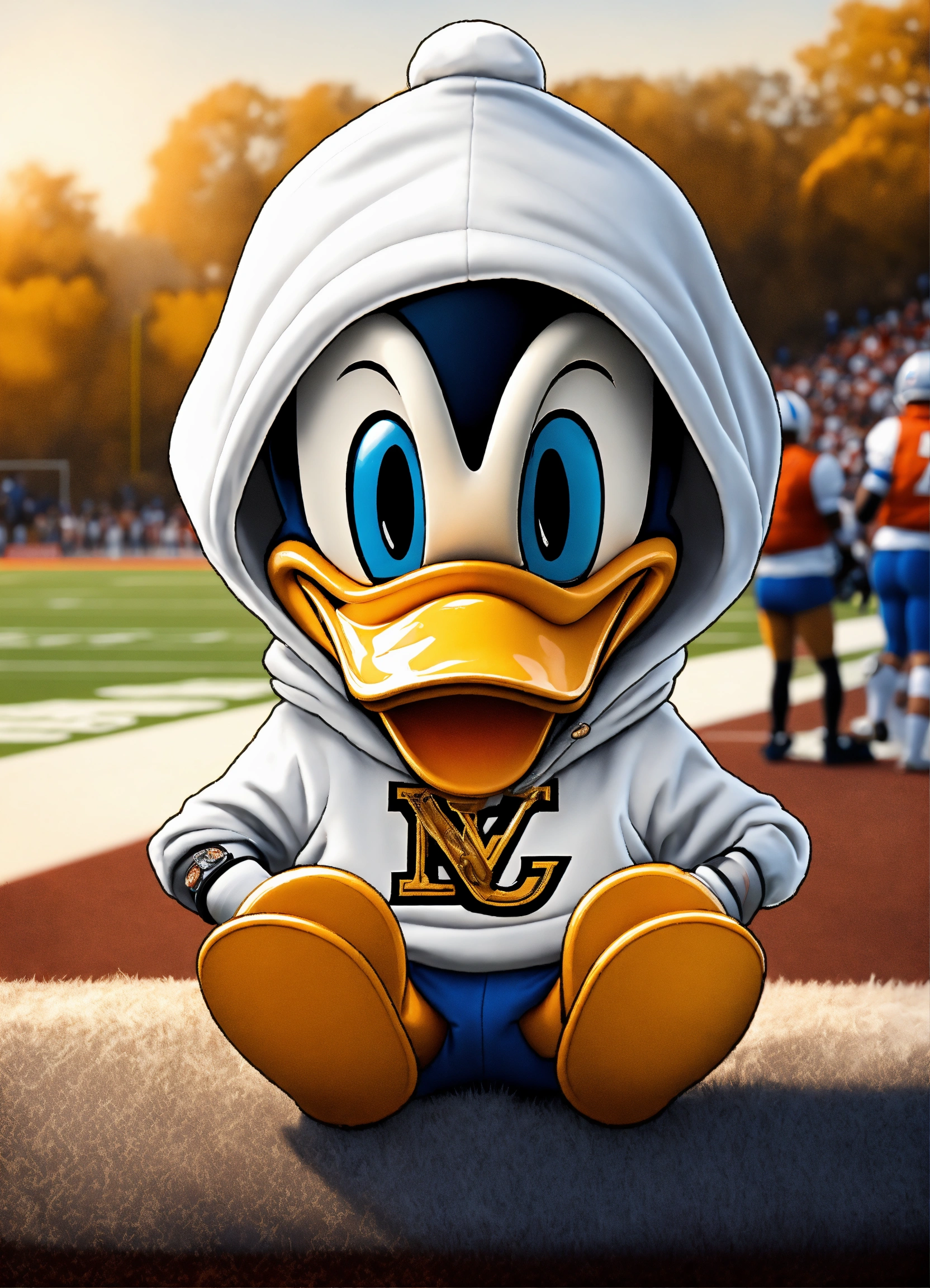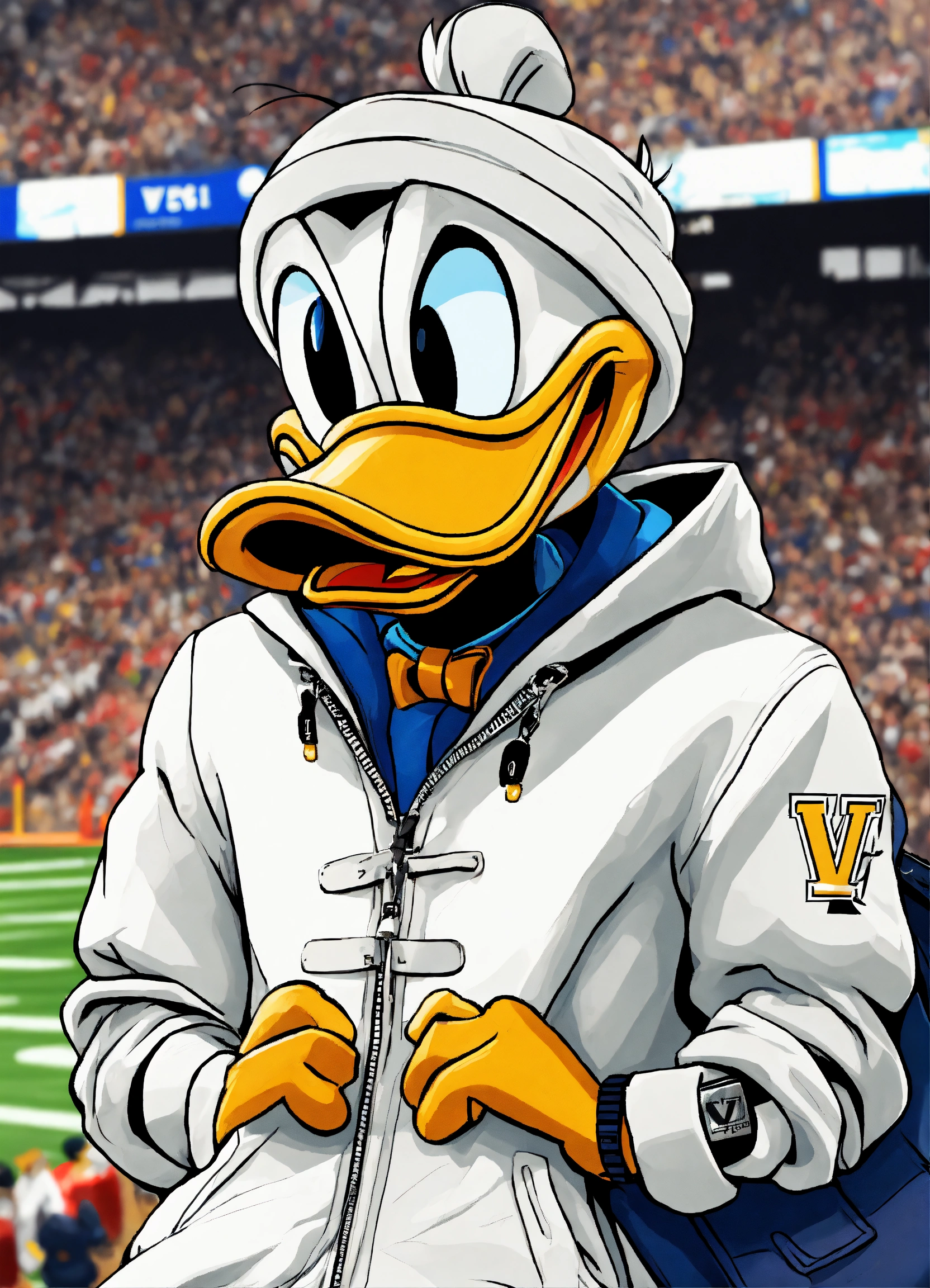 Handsome cartooned donald duck in a white hoodie and wristwatch, inspired by louis vuitton, on the sideline at a college football game--v 5.0