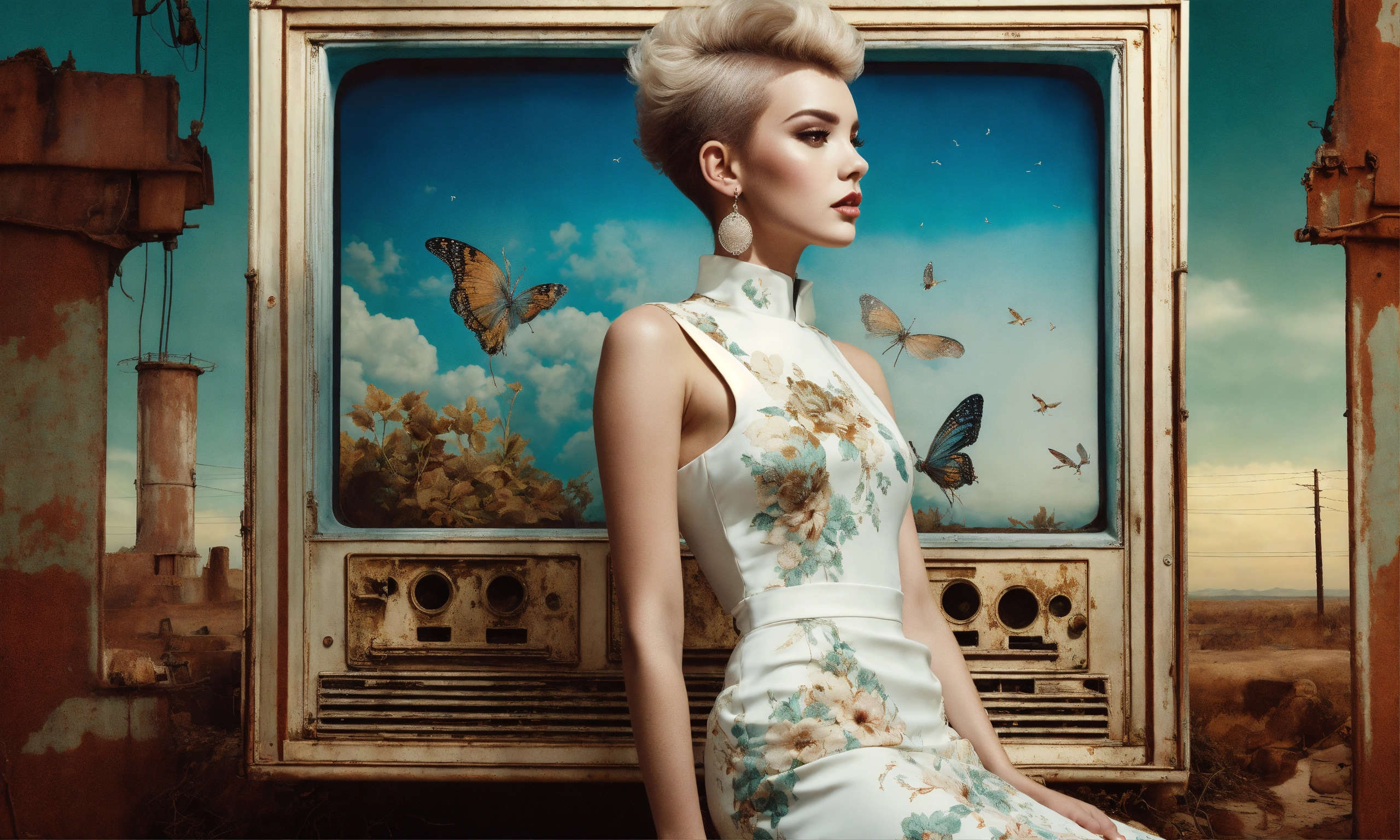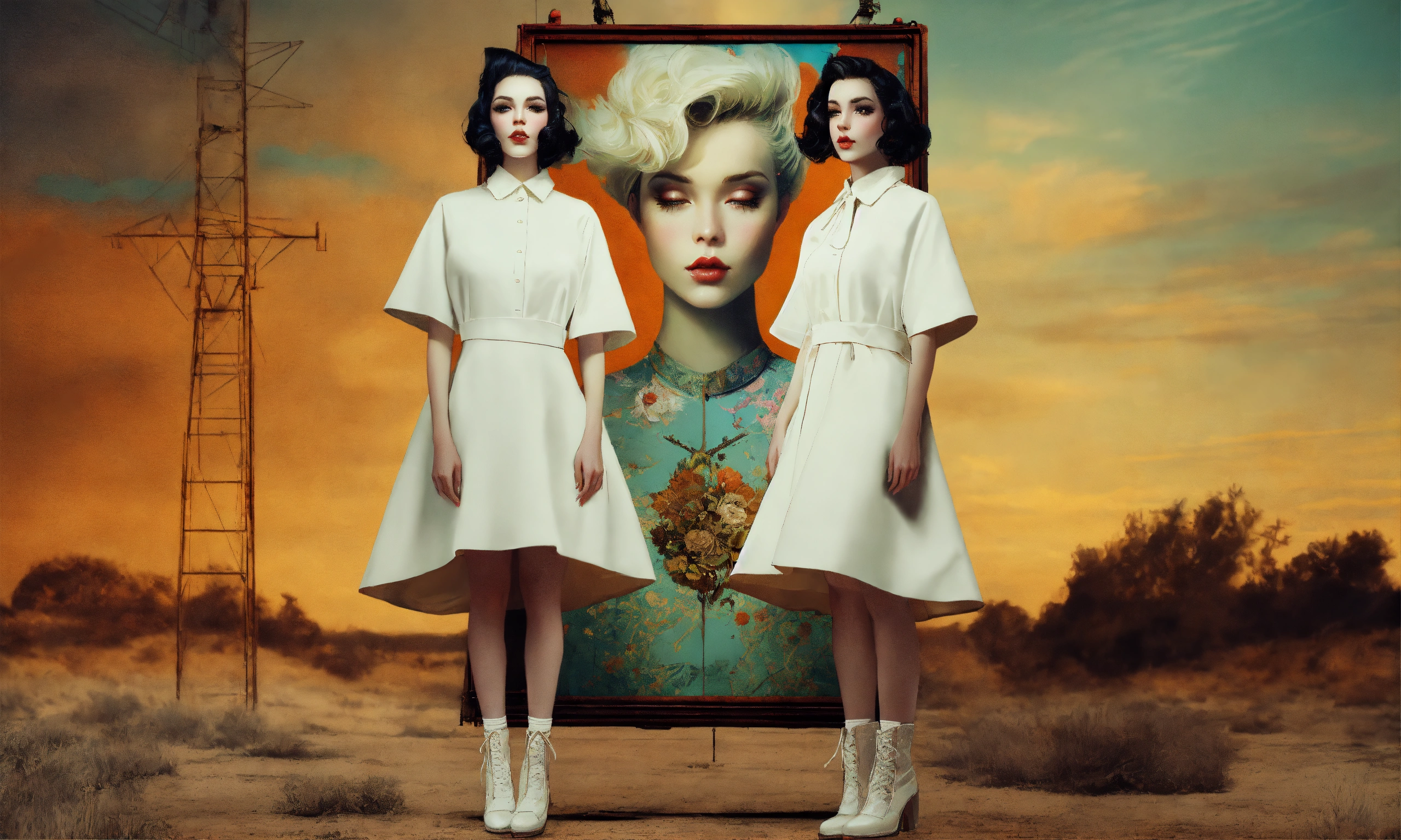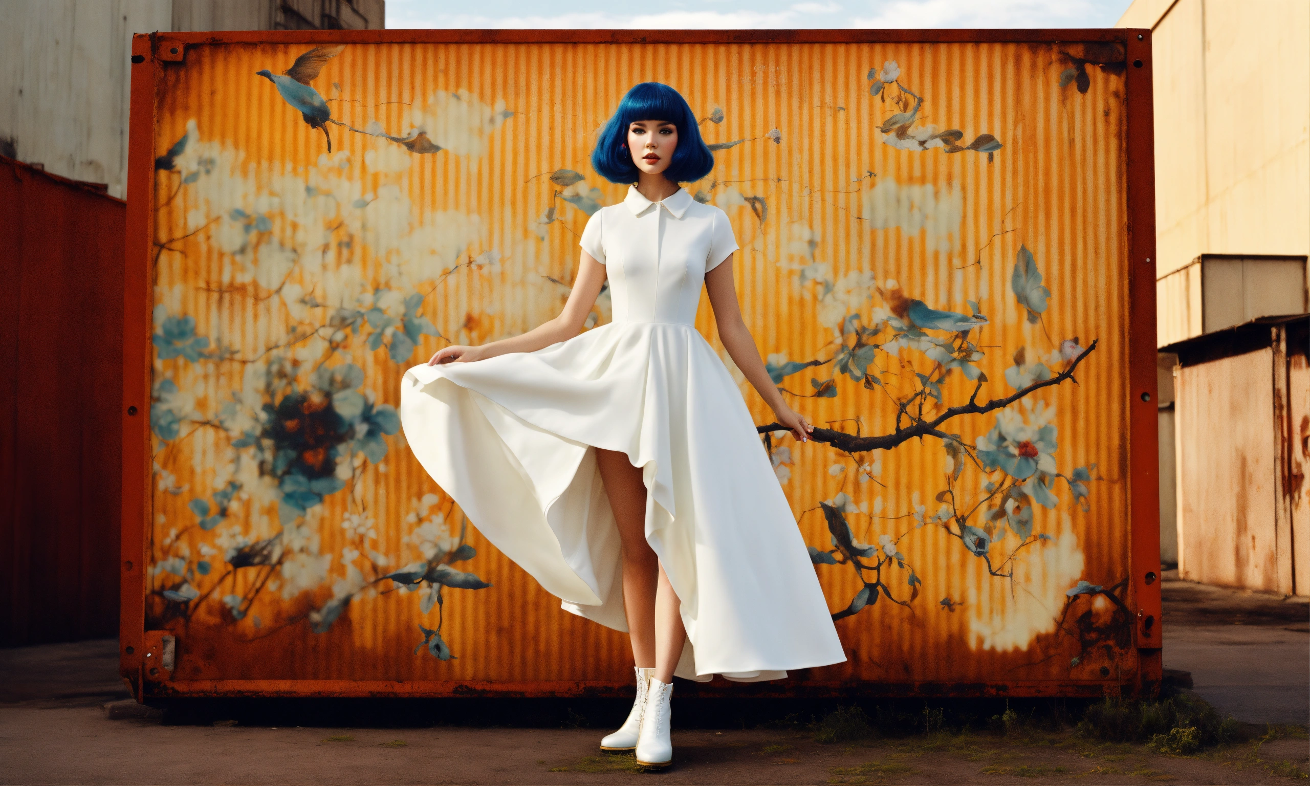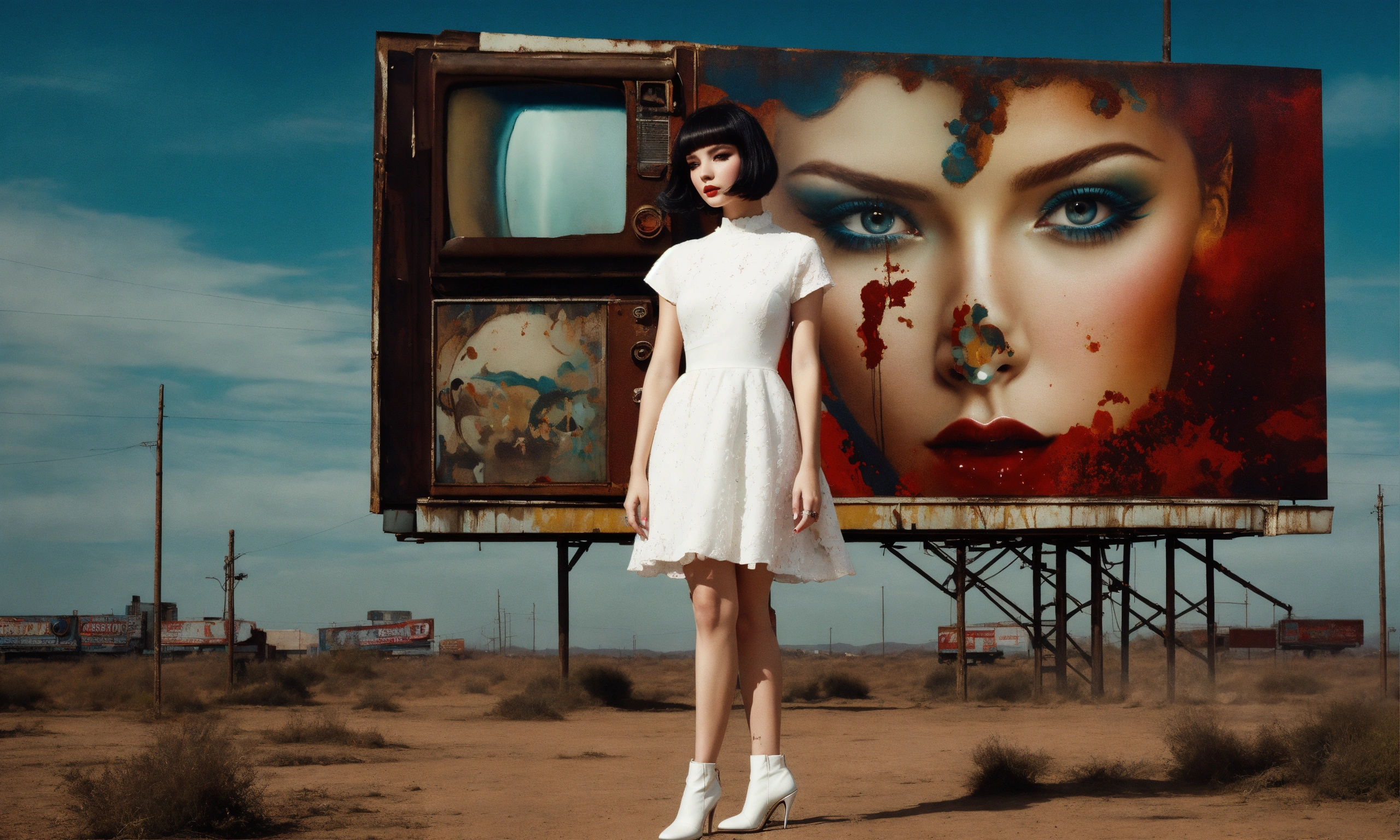 Front profile full body photography, in font of a rusty billboard, a hip hop 80's british model woman with 50's haircut, in a white and k dress, 80 degree view, art by sergio lopez, natalie shau, james jean and salvador dali