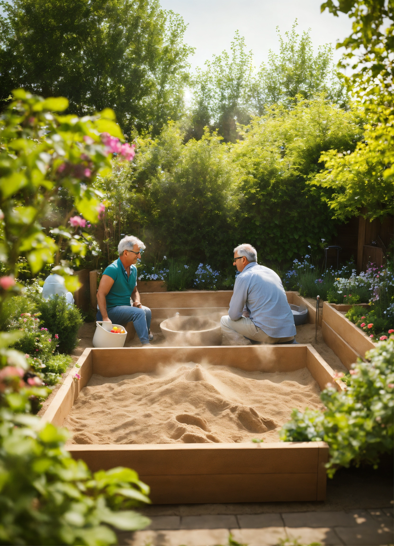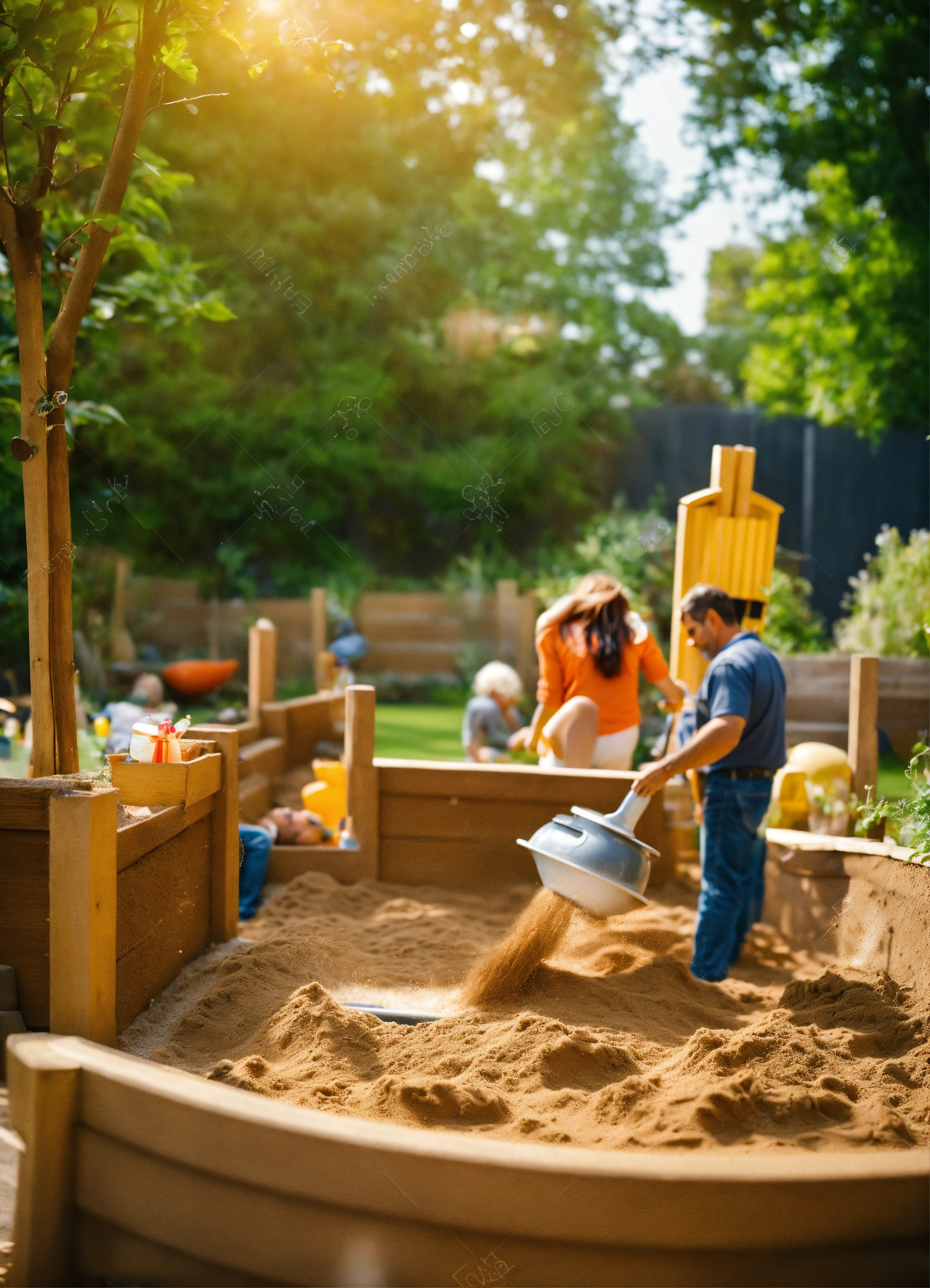 Generate a middle-aged couple in a garden with a sandpit in the garden