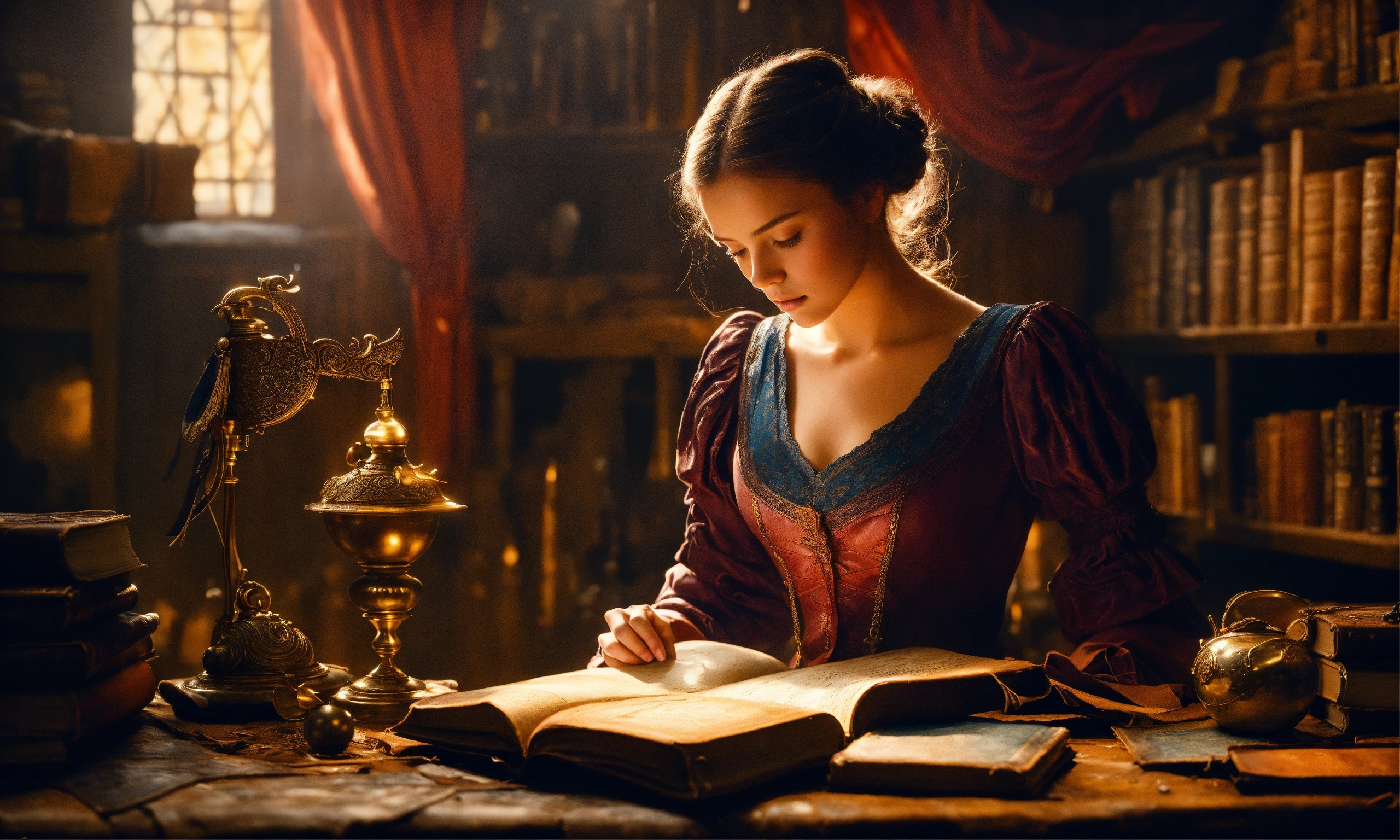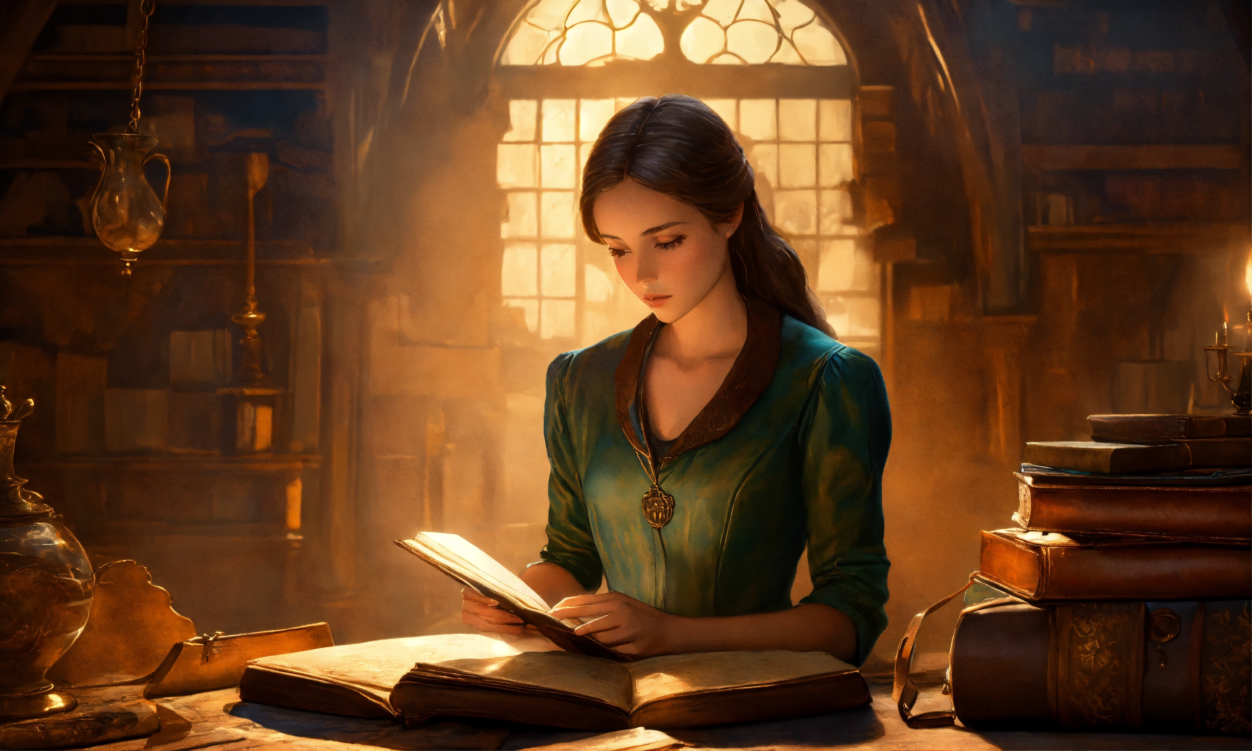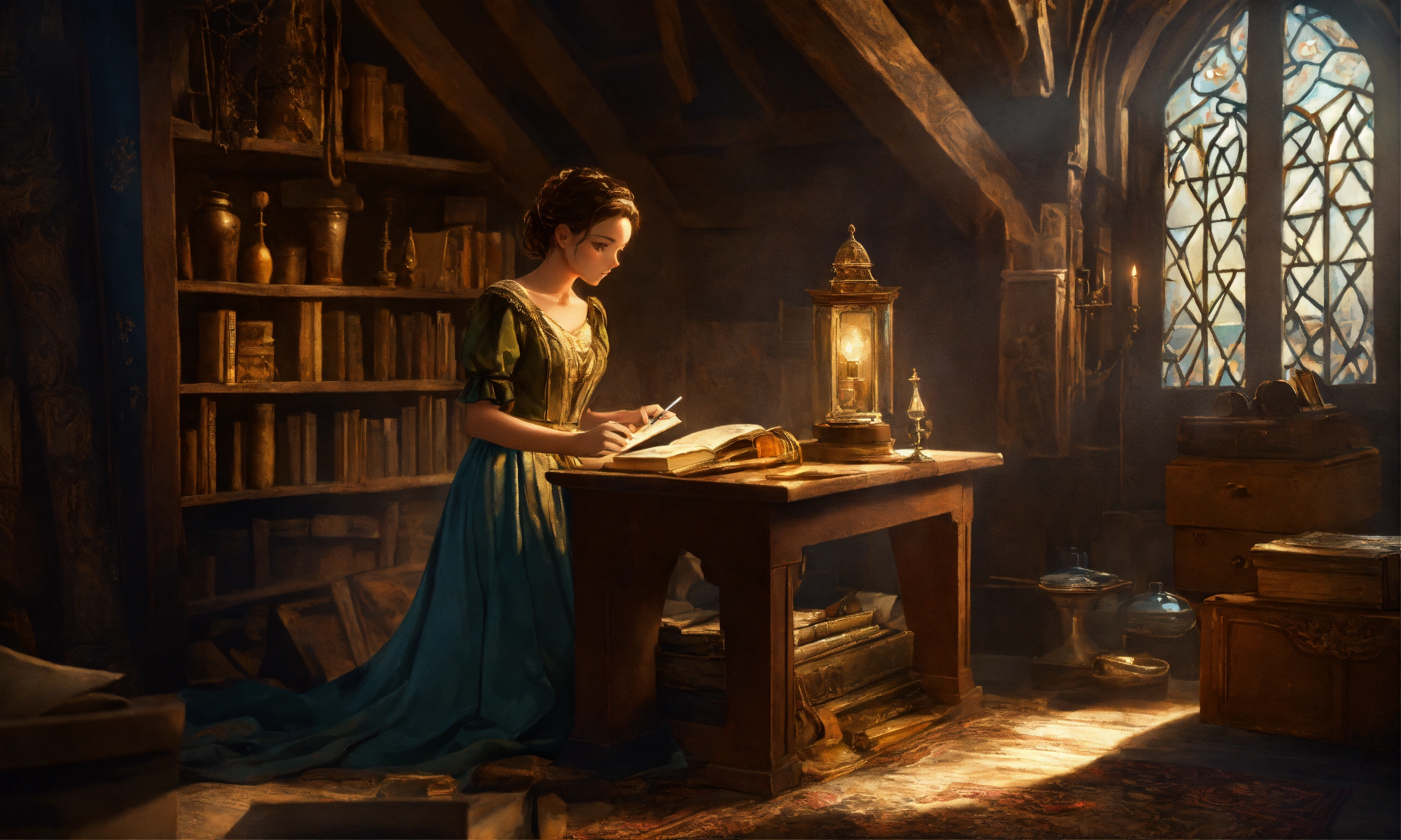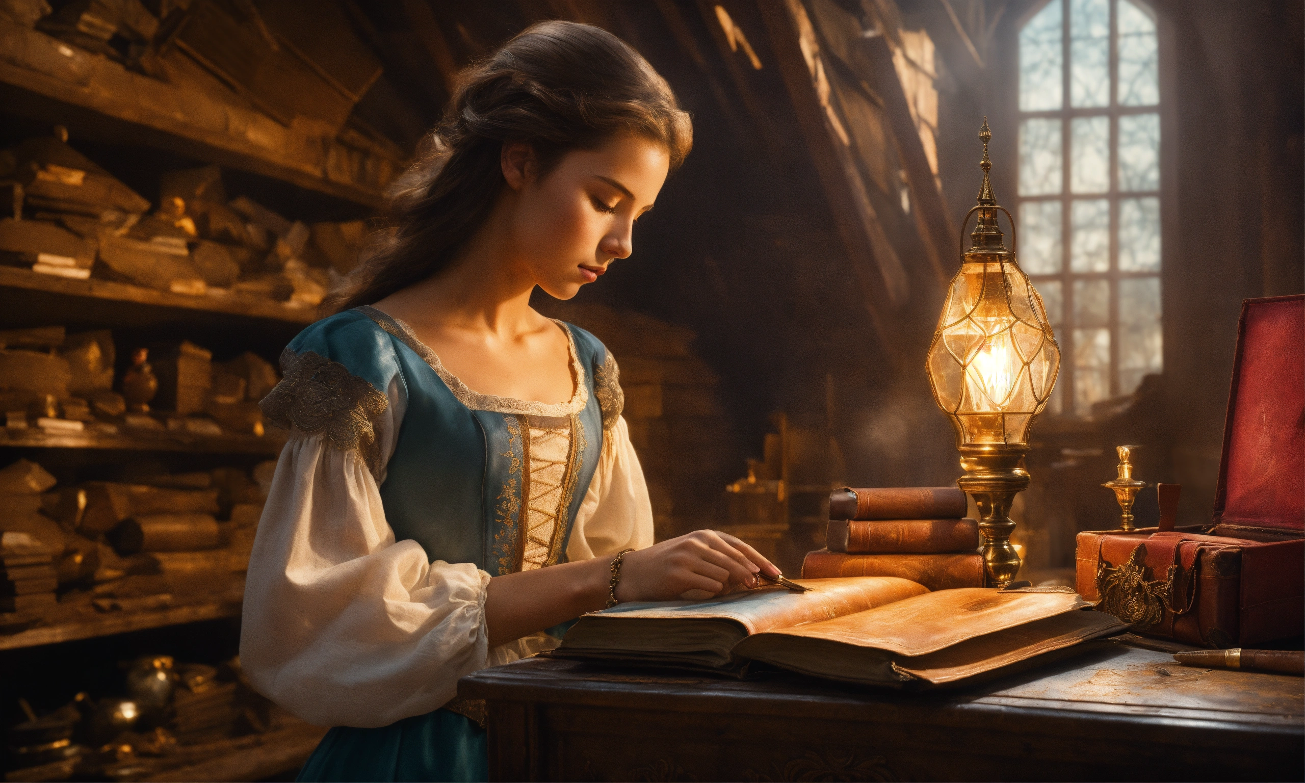 The young beautiful lady, dressed in modern clothing, stands amid the attic's relics. she curiously examines an old leather-bound diary, her fingers brushing away the dust to reveal intricate patterns on the cover. stunning 8k matte oil painting