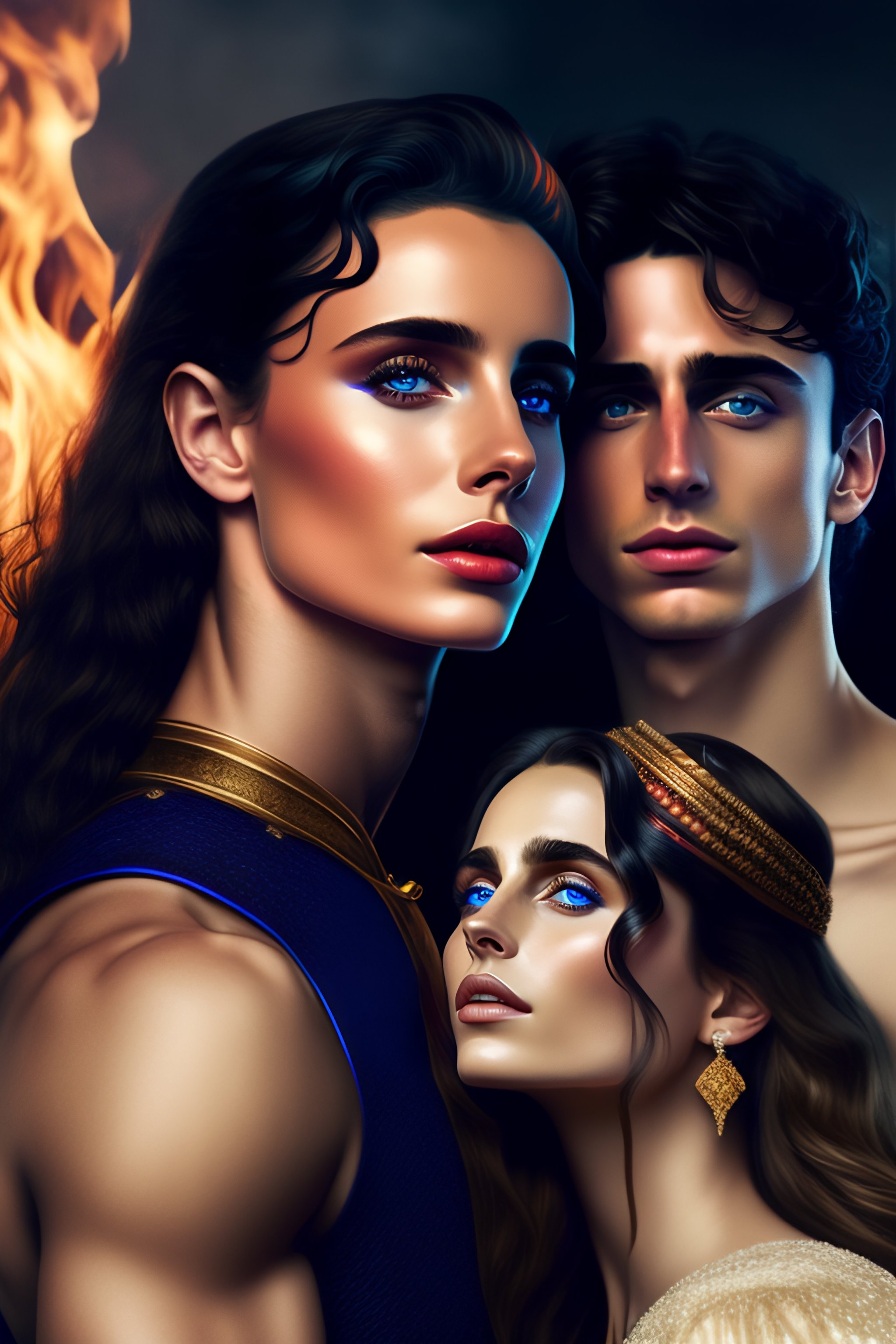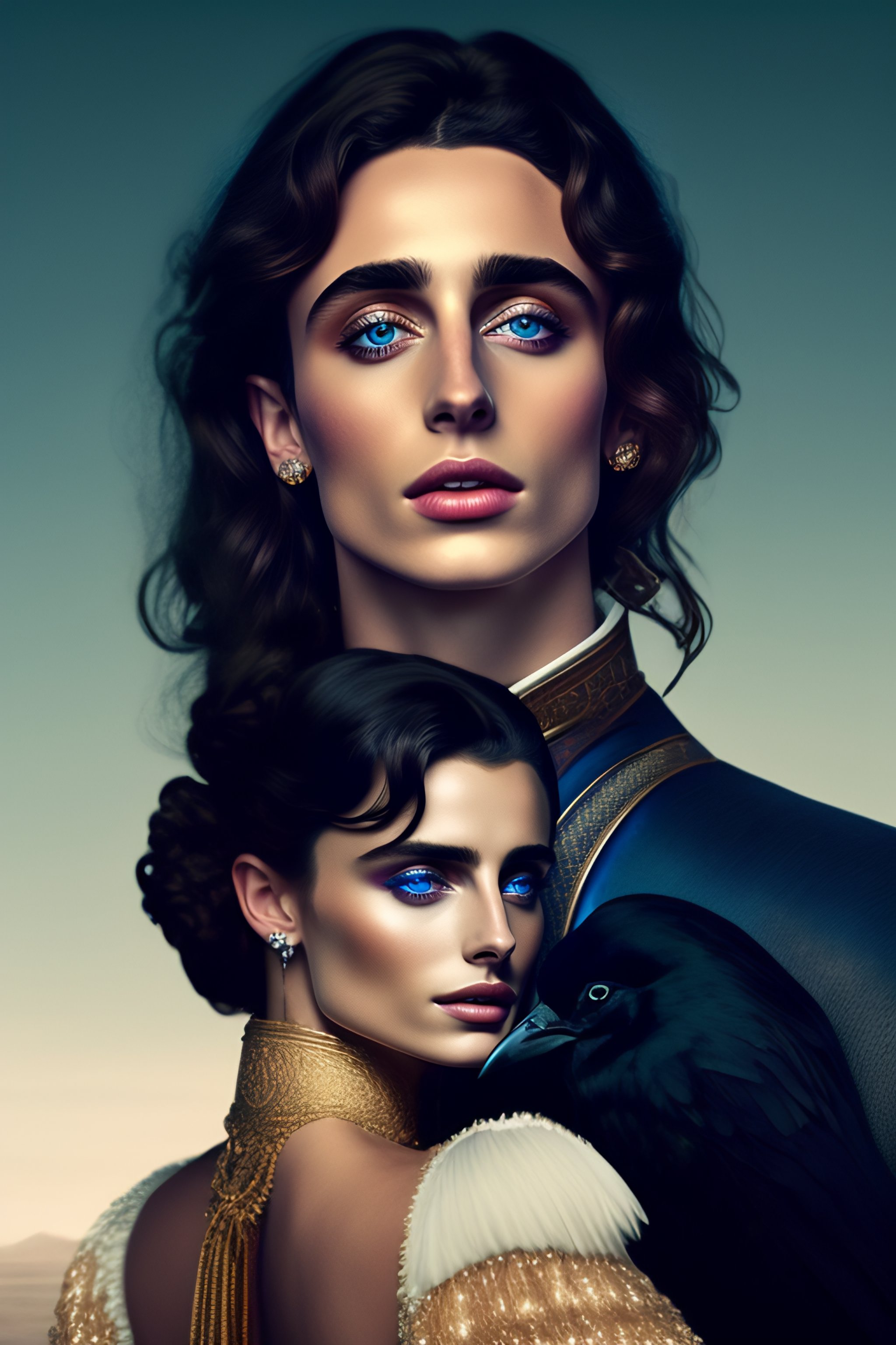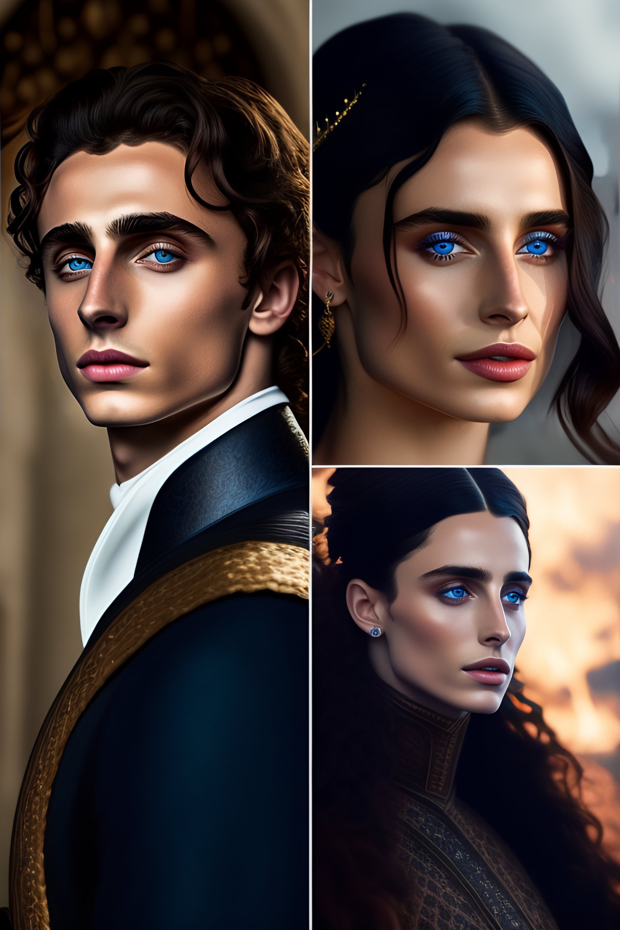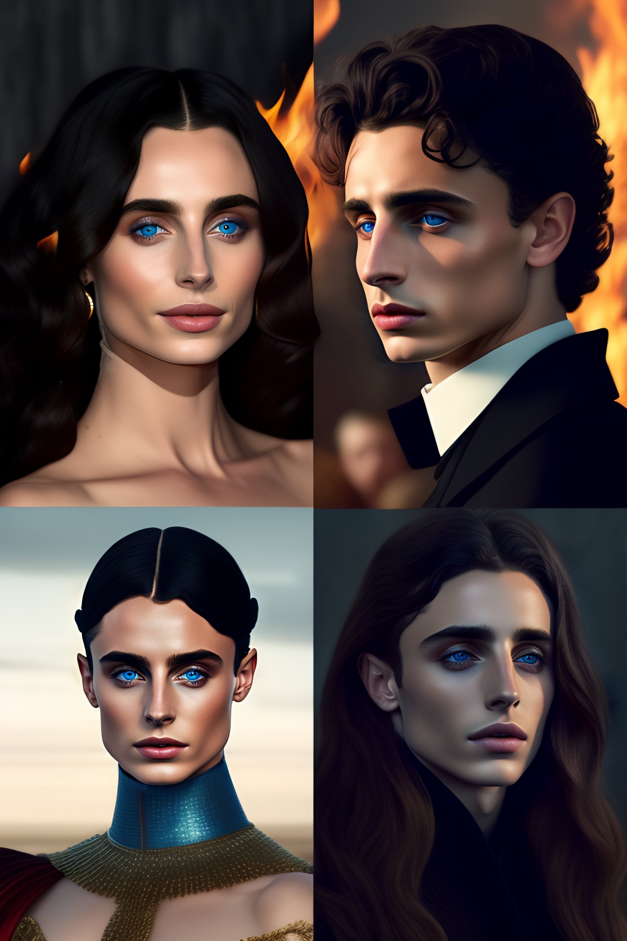 Medieval timothée chalamet and dark haired blue eyes princess with ravens against the background of fire