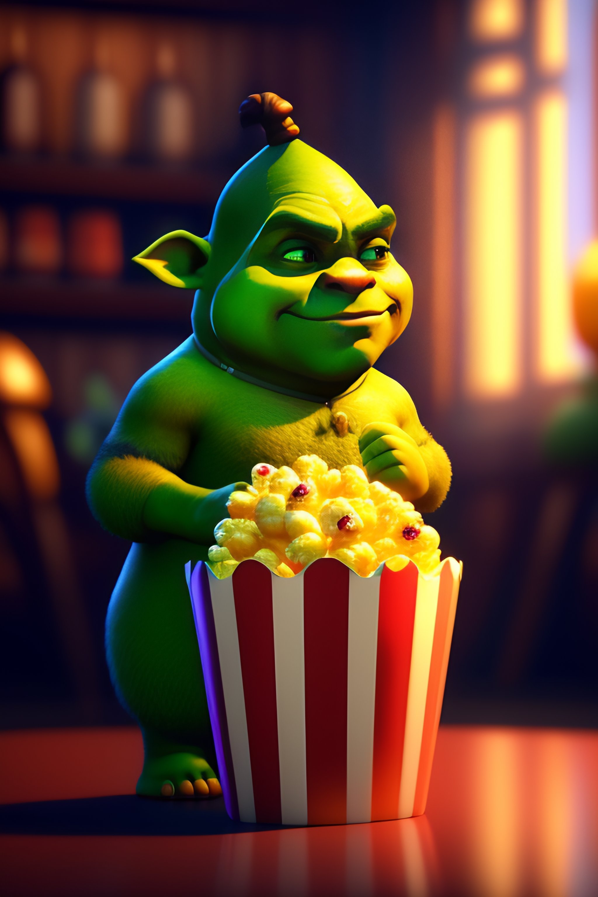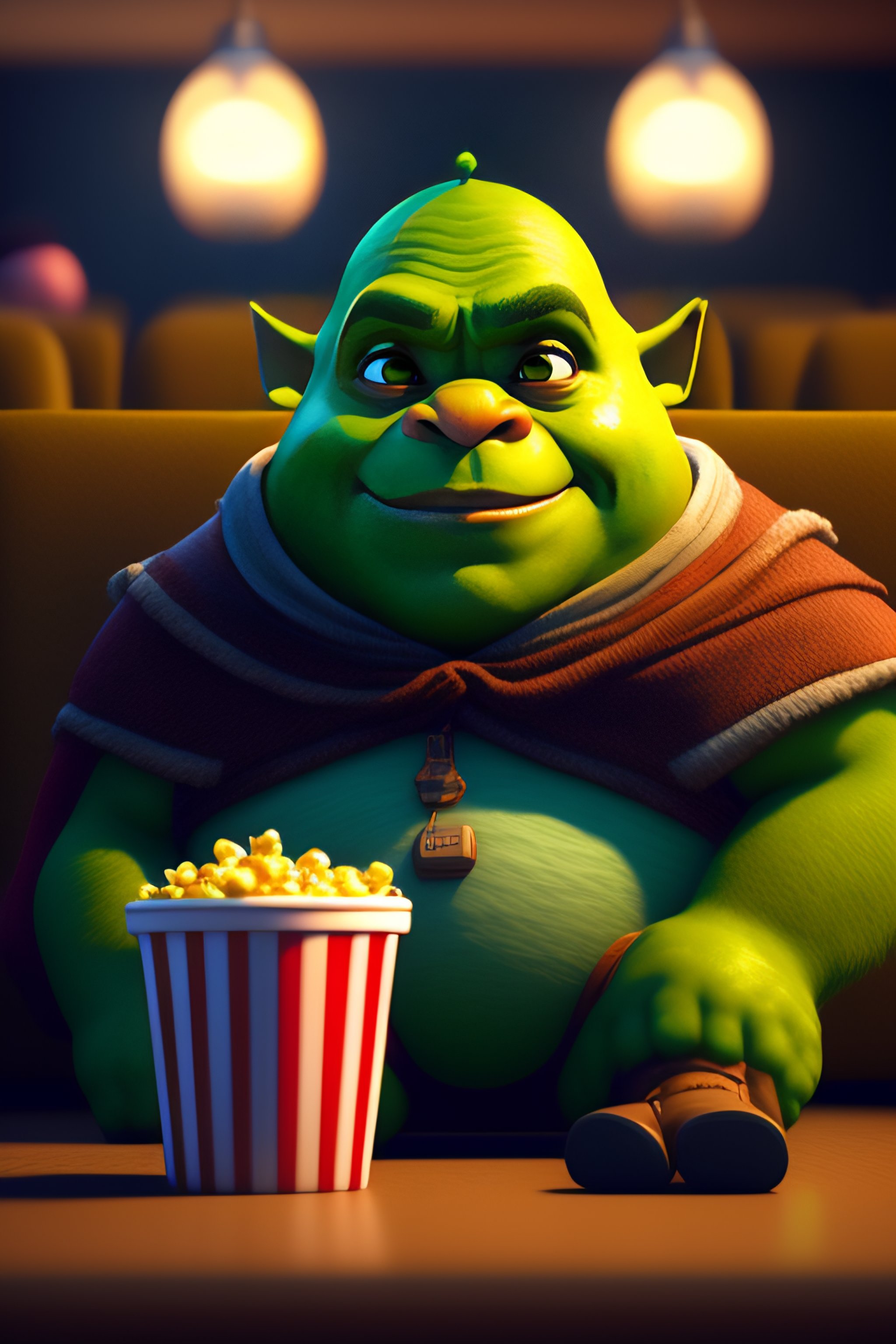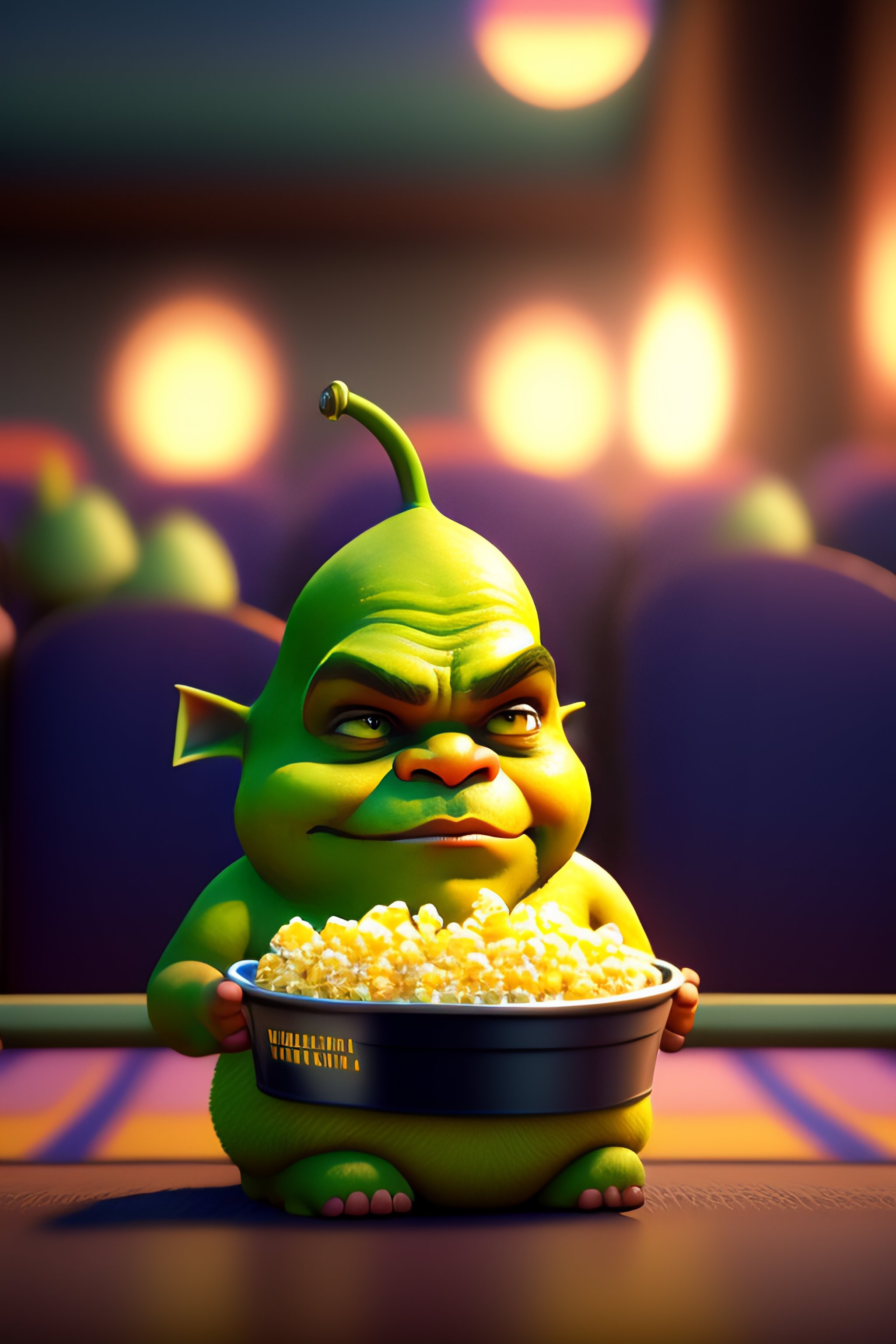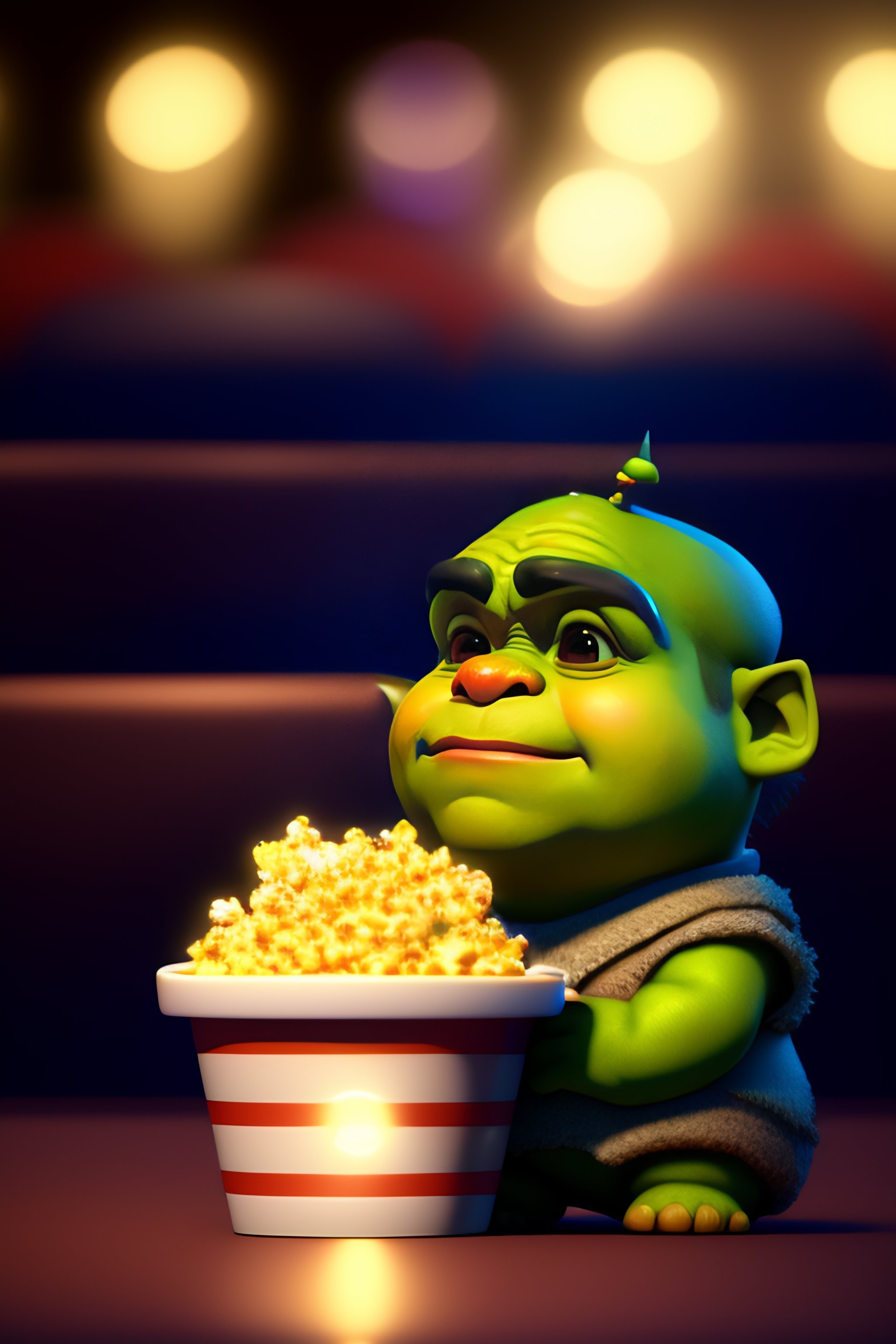 Cute small humanoid shrek sitting in a movie theater eating popcorn watching a movie, unreal engine, cozy indoor lighting, artstation, detailed, digital painting, cinematic, character design by mark ryden and pixar and hayao miyazaki, unreal 5, daz, hyperrealistic, octane render