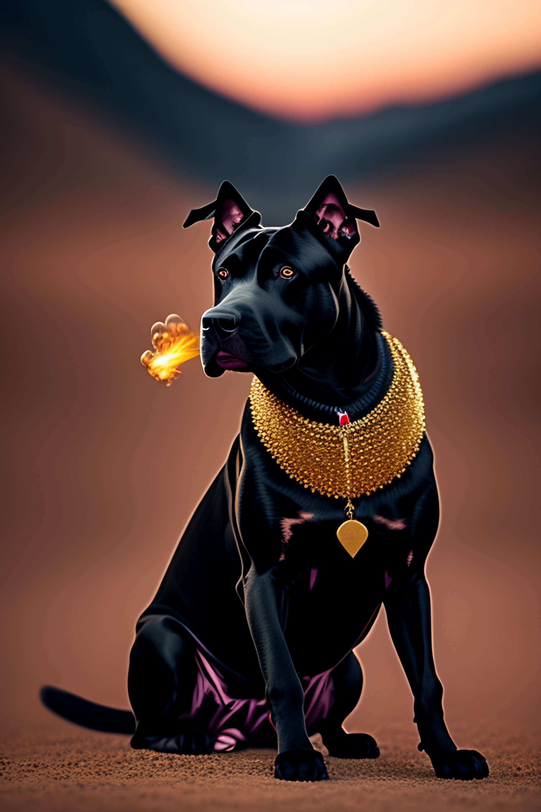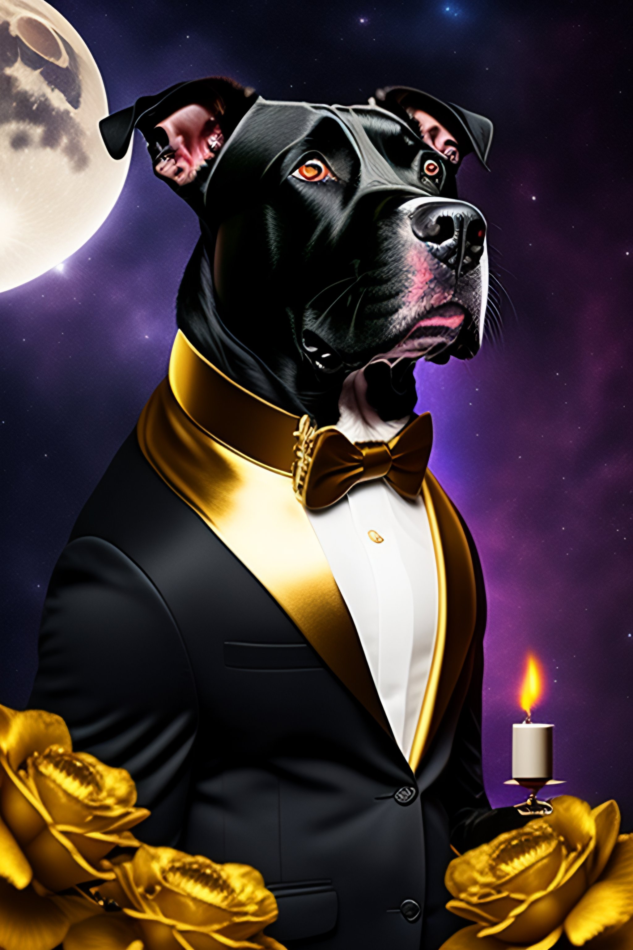 Black pitbull wearing a black blazer and smoking cigar sitting on the moon with gold roses around