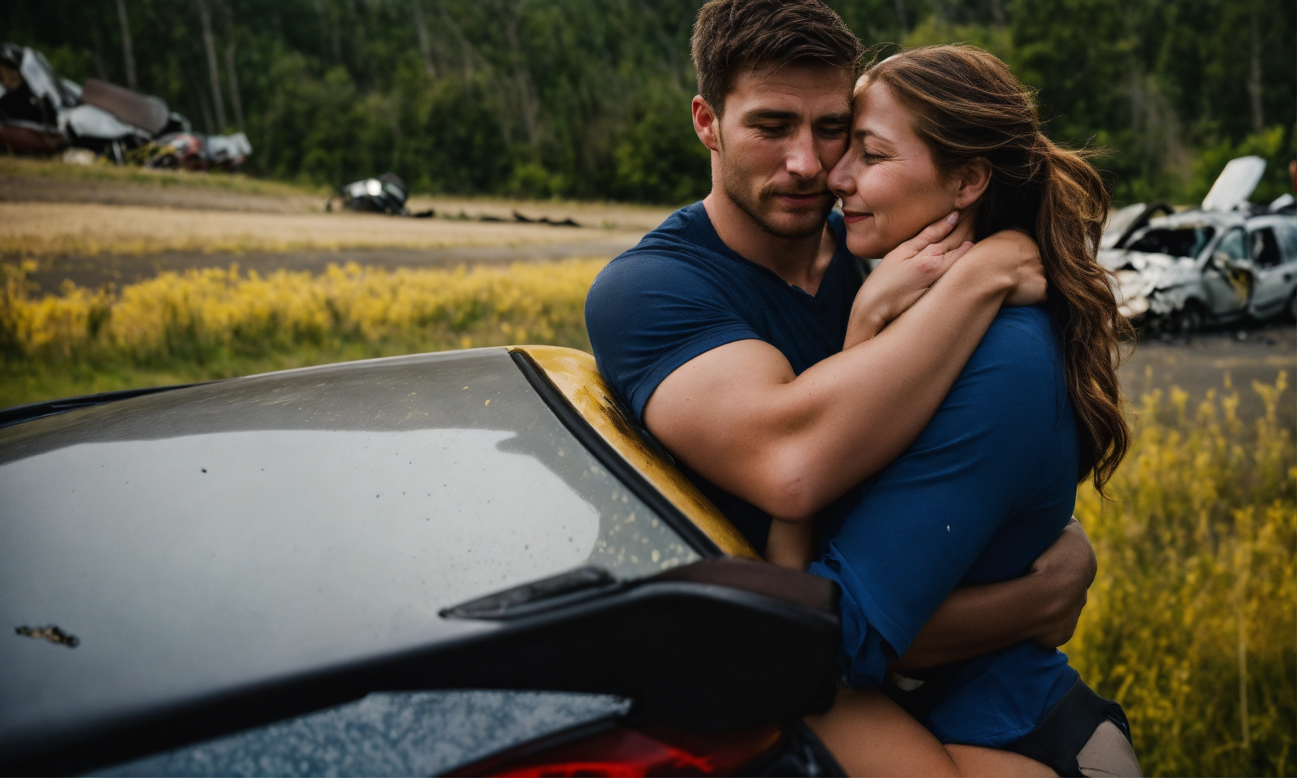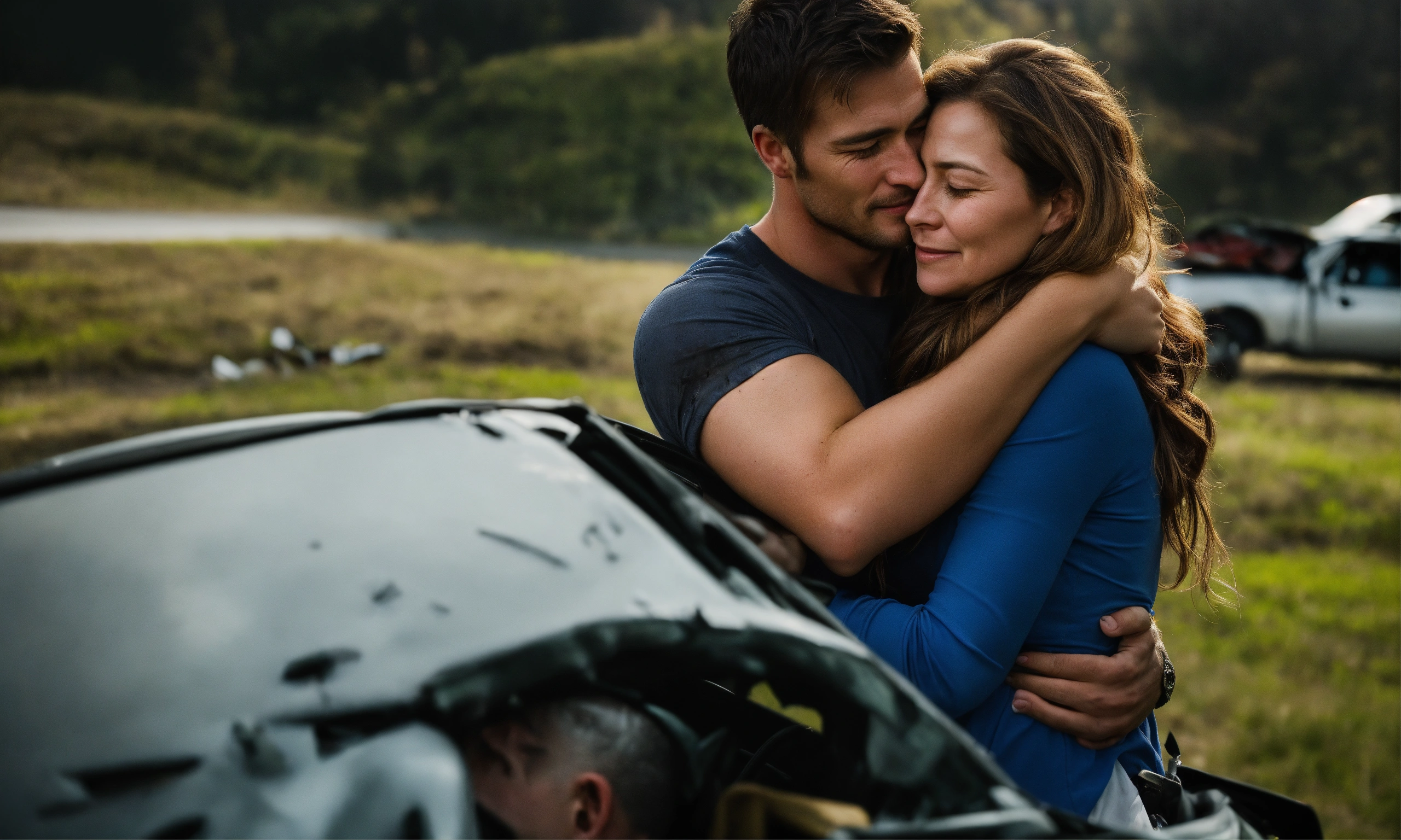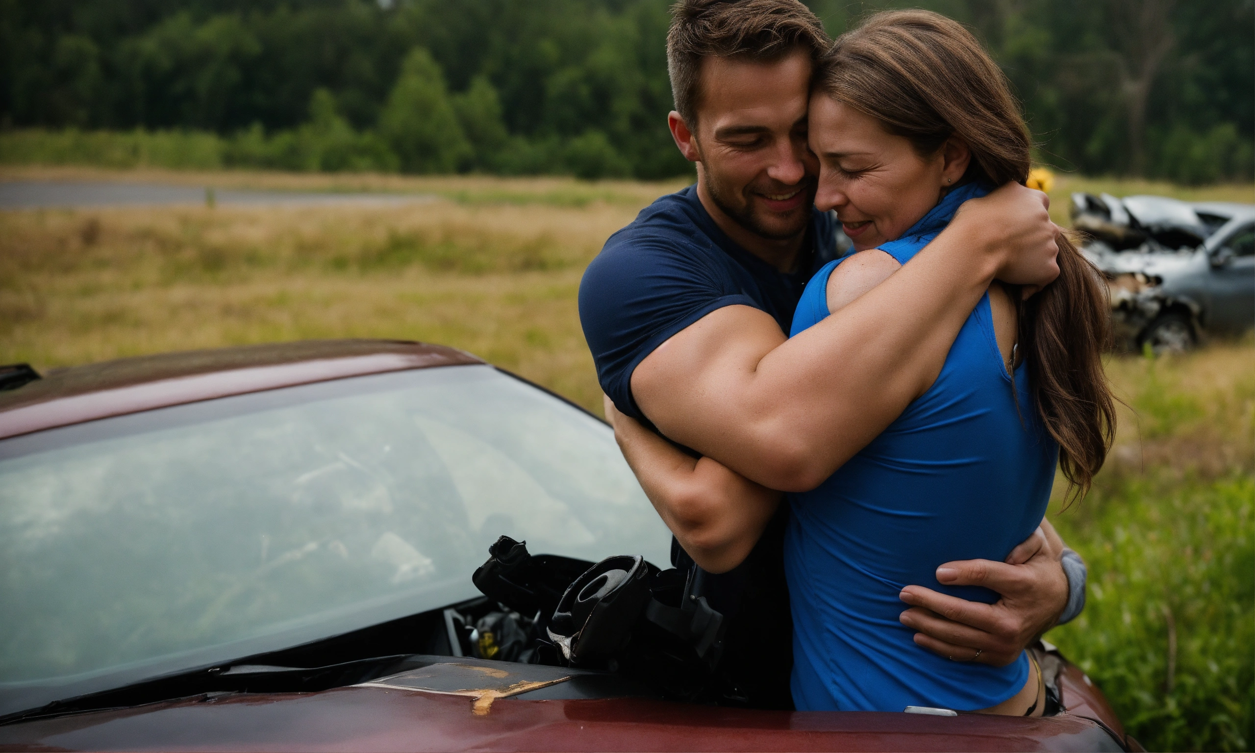 A powerful photo captures the moment when the woman, her face filled with gratitude, embraces david, her rescuer (27 year old handsome). their eyes reflect the intensity of the car accident scene, showing the profound connection forged through his heroic actions. it's an image of gratitude and the bond formed in the face of adversity. caucasian