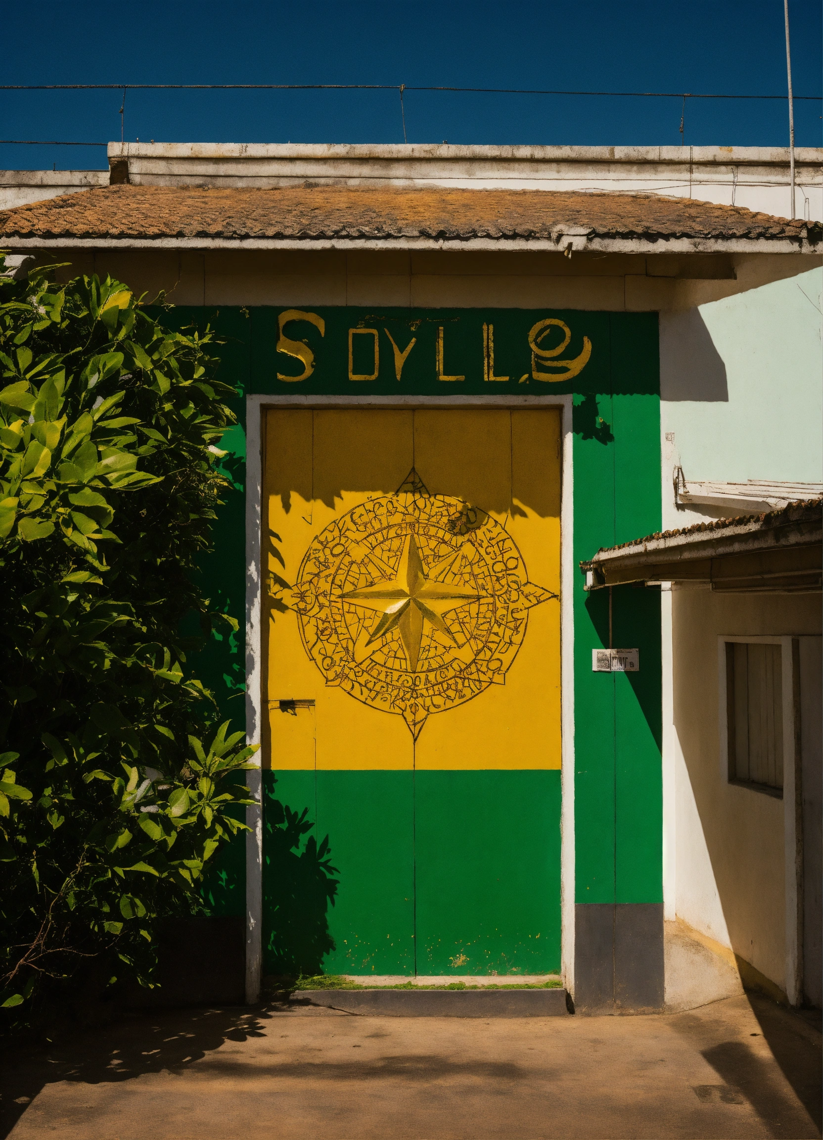 O sol brilha no céu enquanto uma escola é mostrada com o título acima da porta "escola das letras"