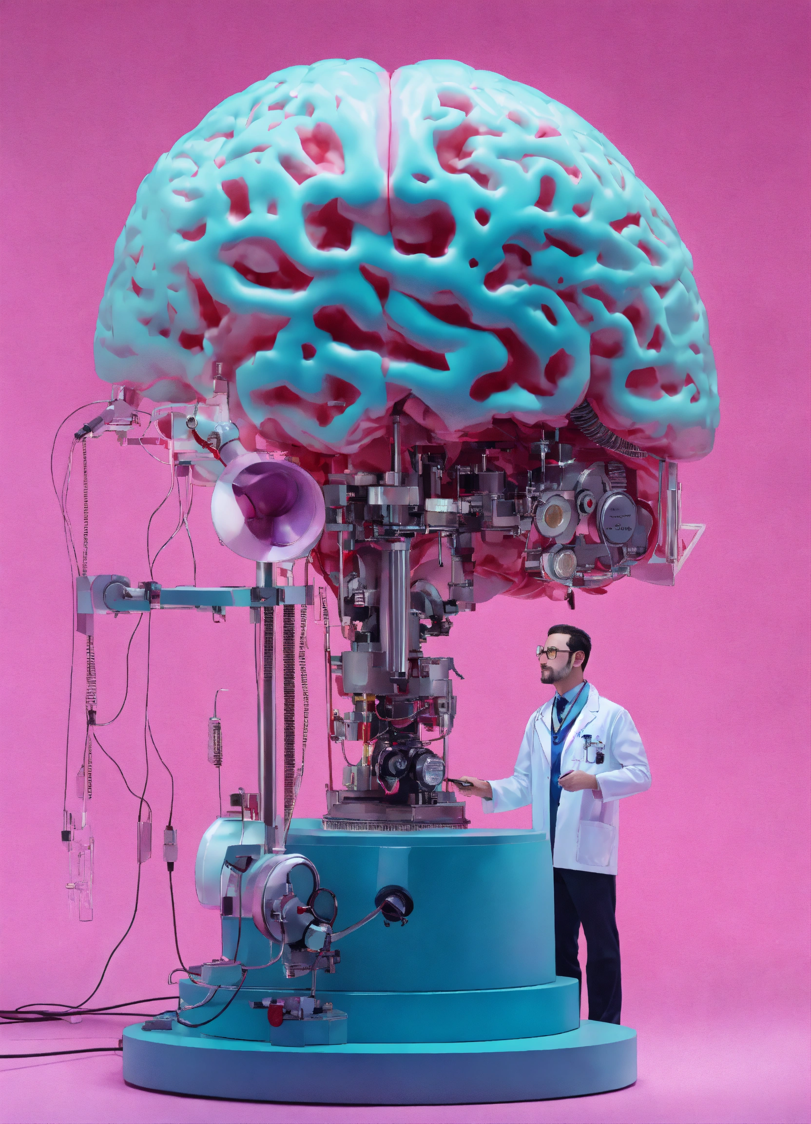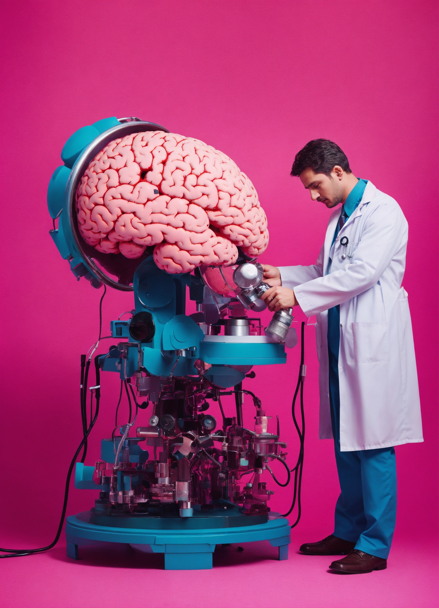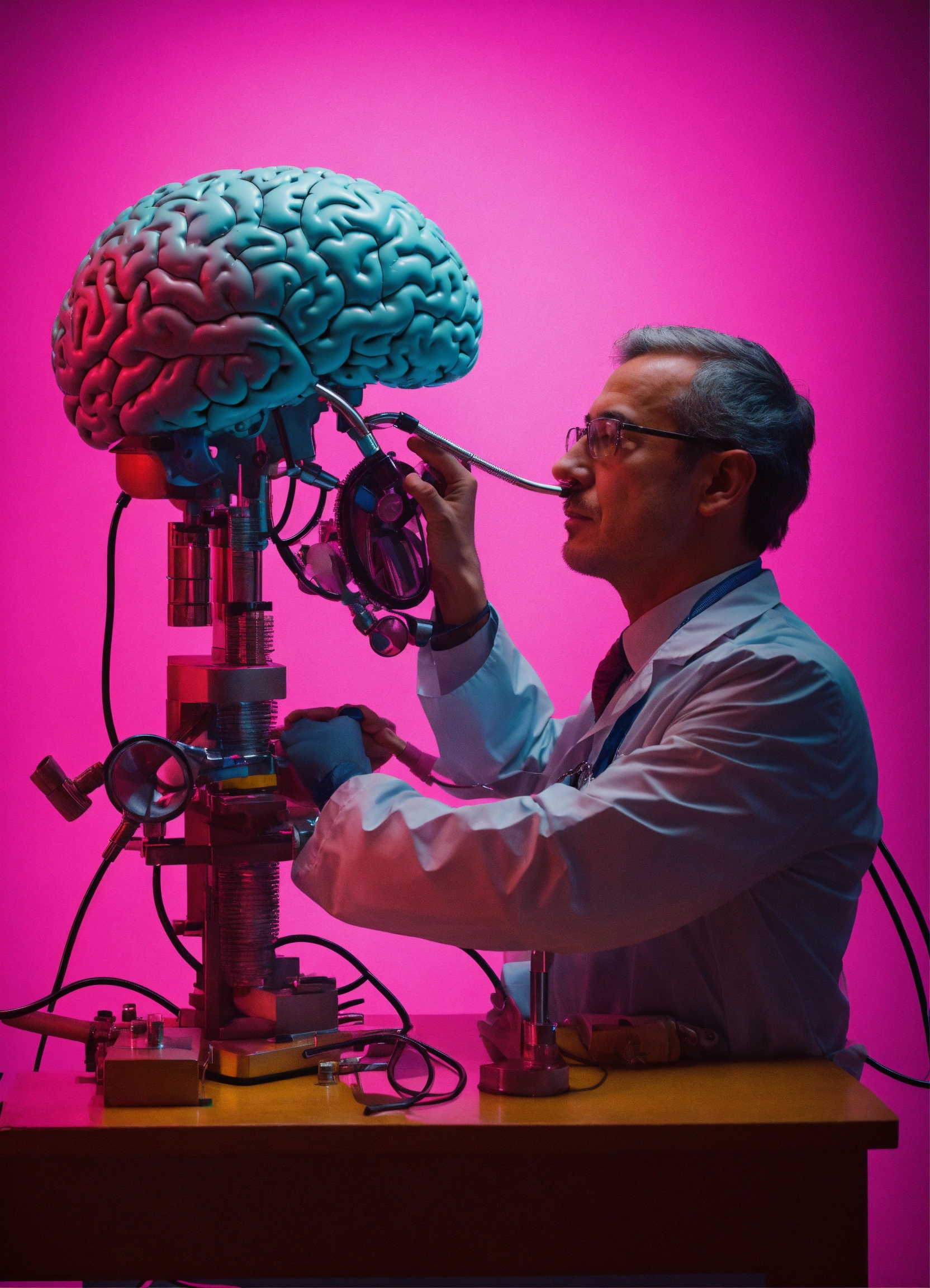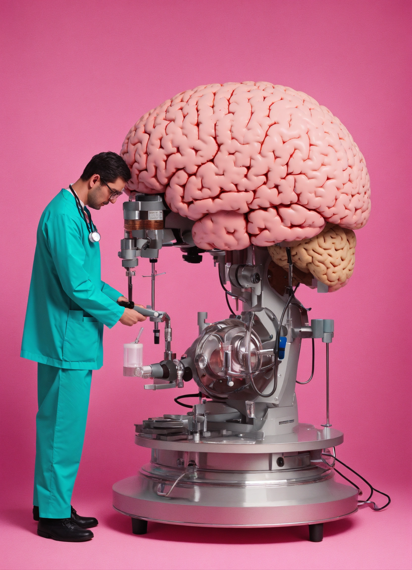 A doctor use his stetoscope on a huge mechanical brain