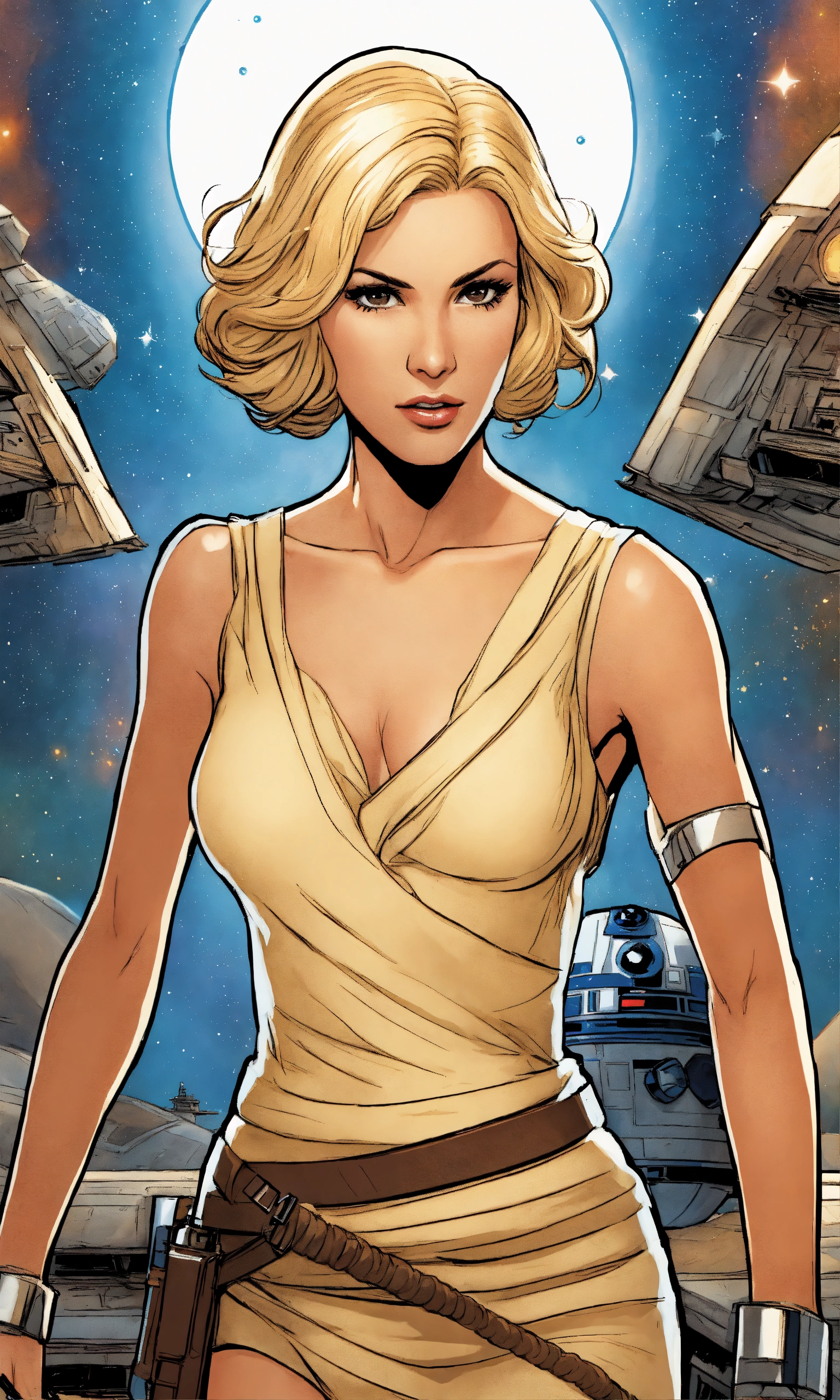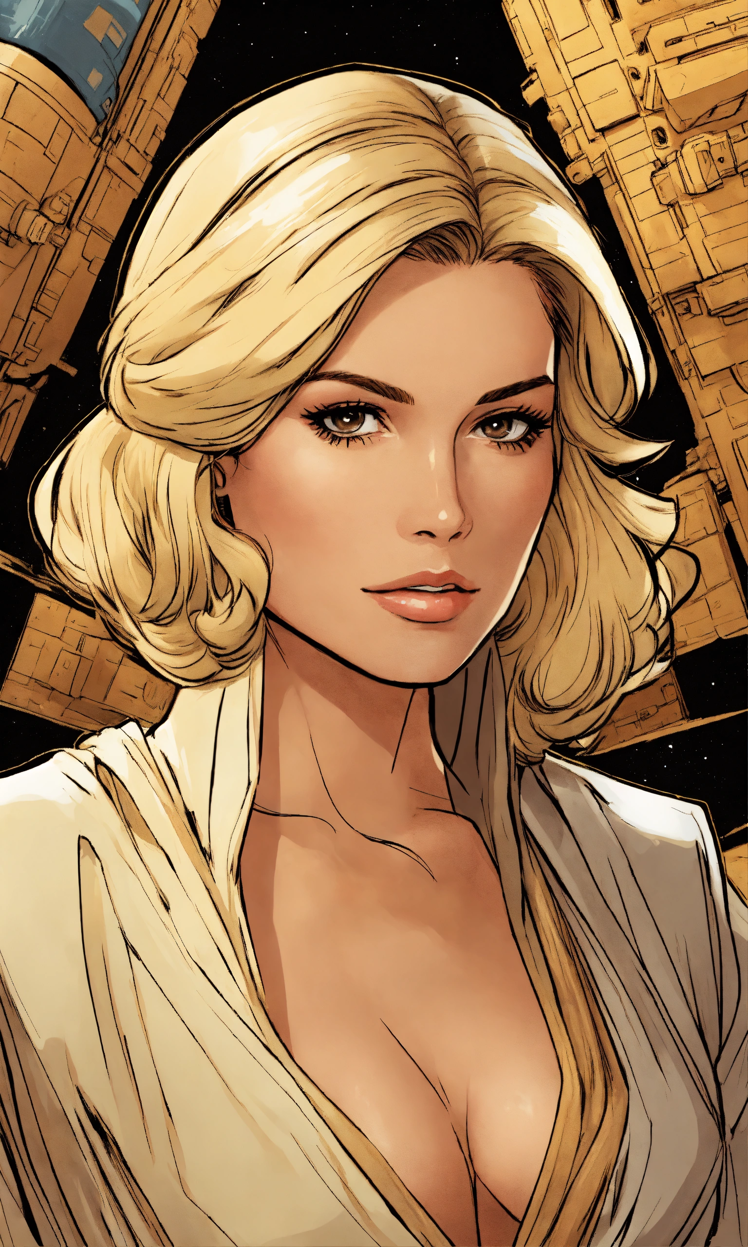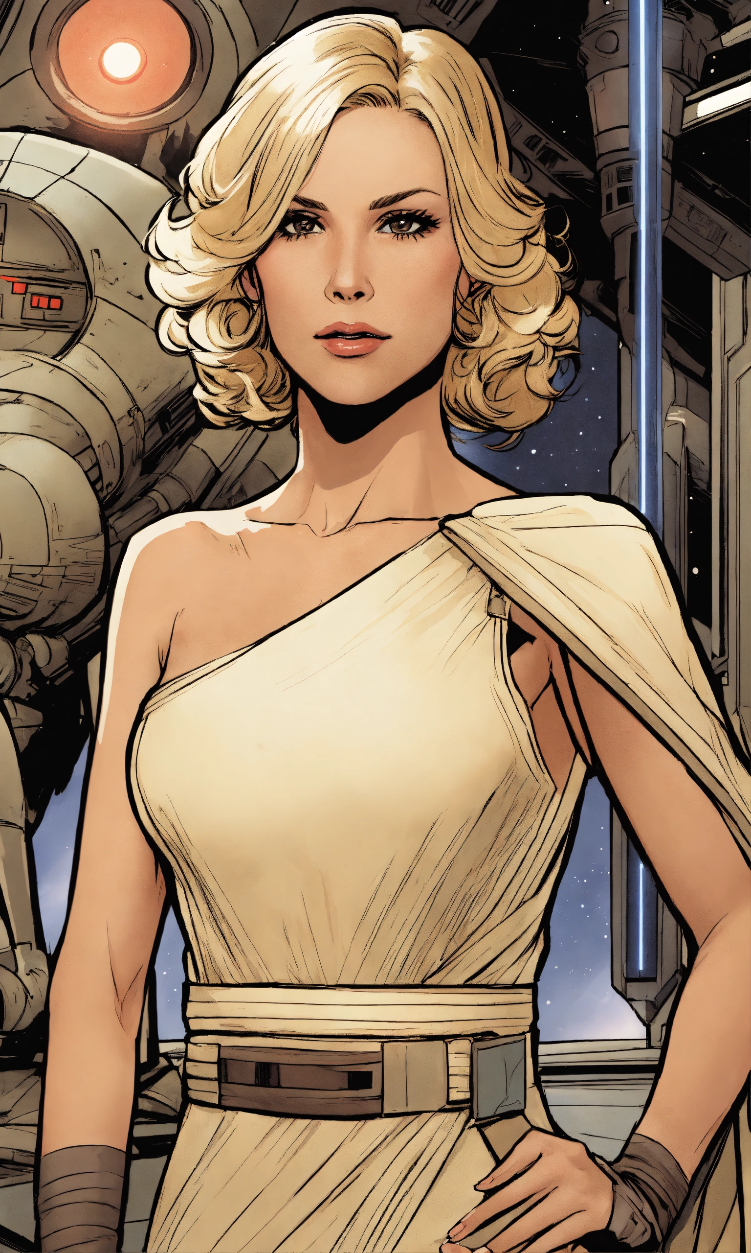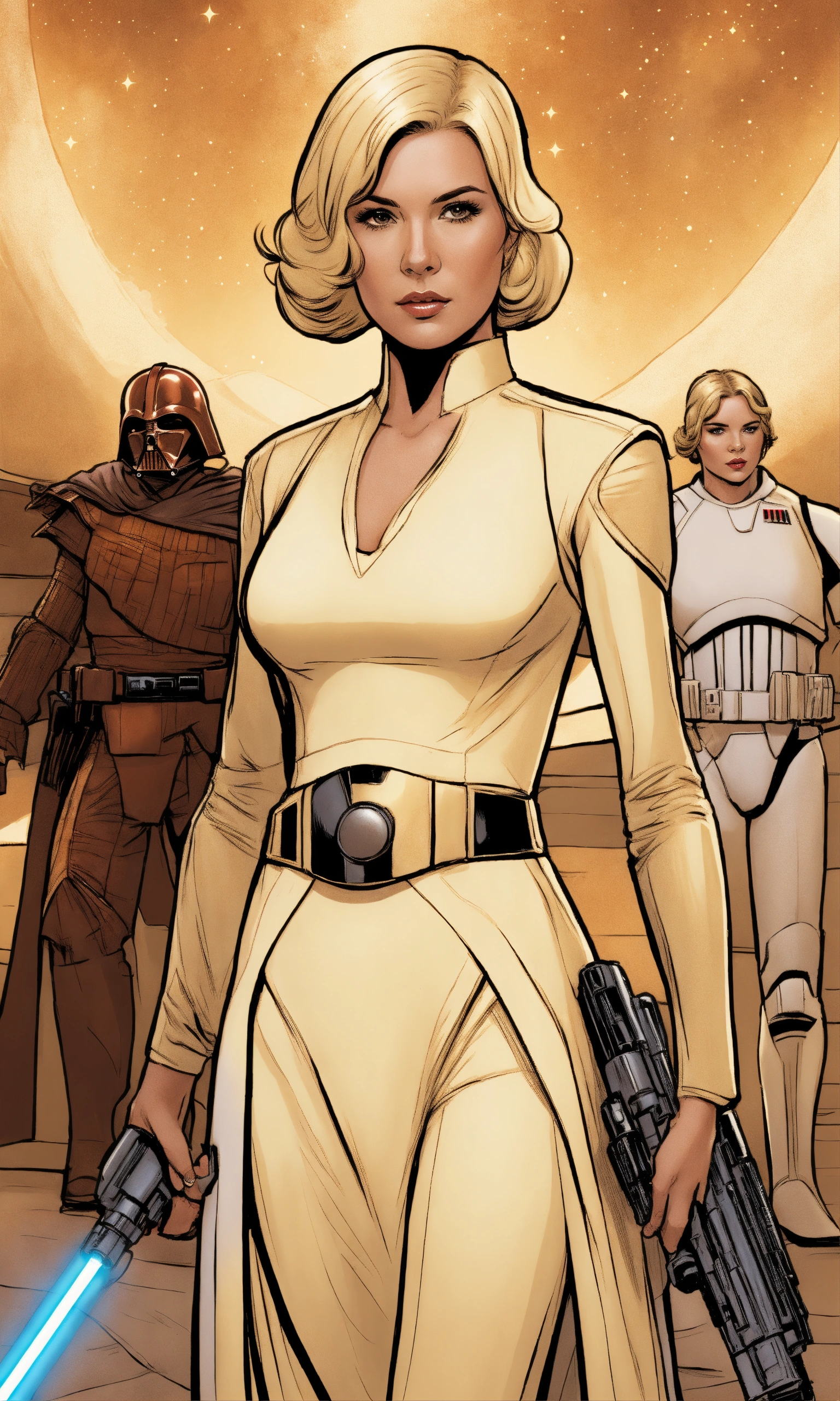 In comic book style, a star wars woman in her forties with straight blonde hair and dark brown eyes, wearing a cream dress.