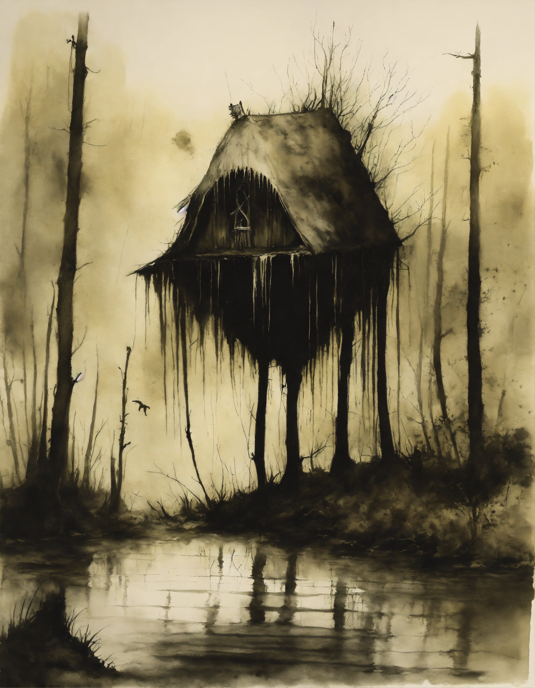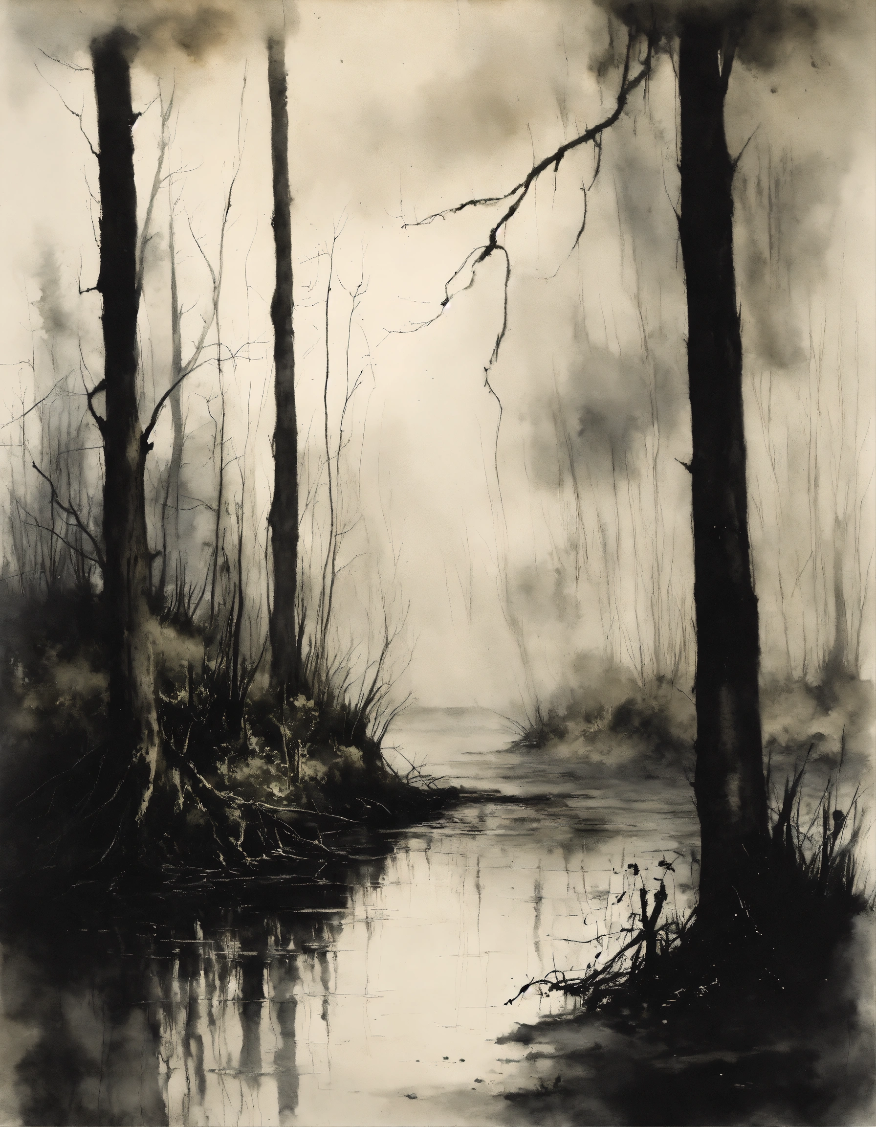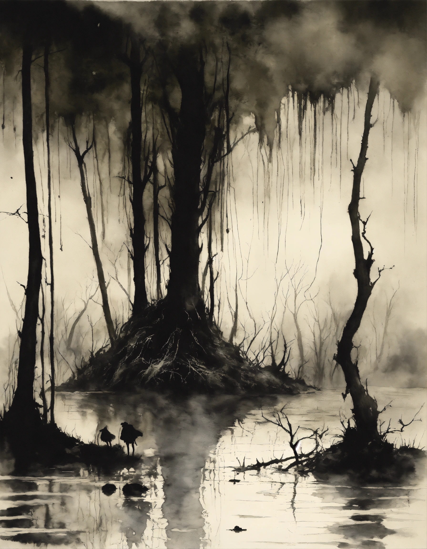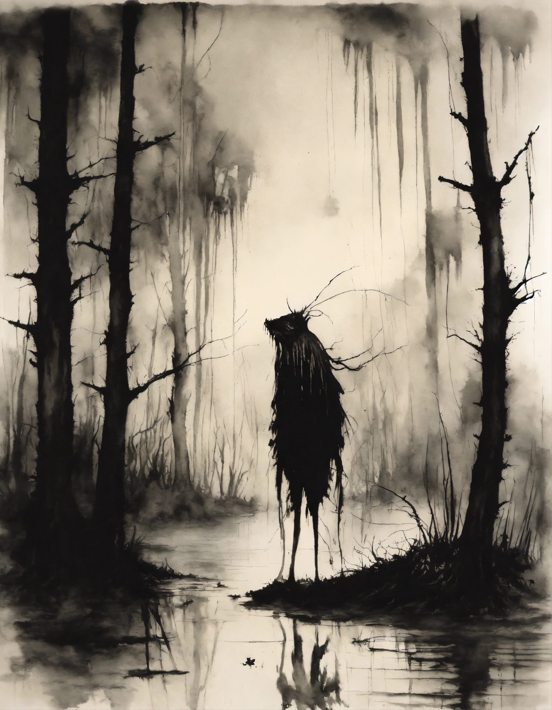 Style of stephen gammell, watercolors, black and white, swamp, shadowy creatures, dripping, infected, evil, wooden tail