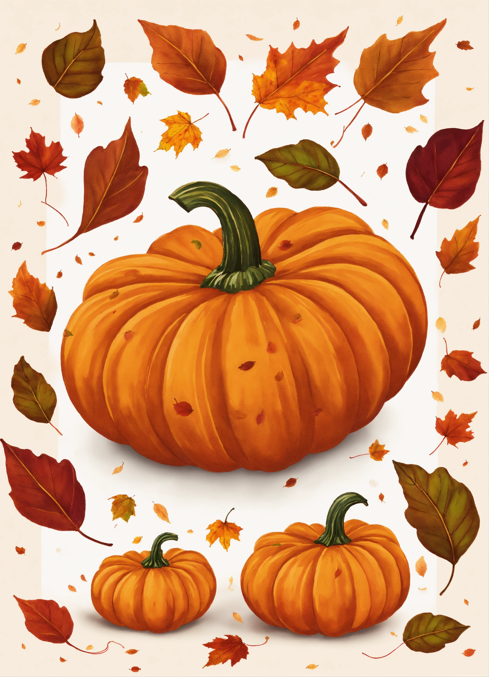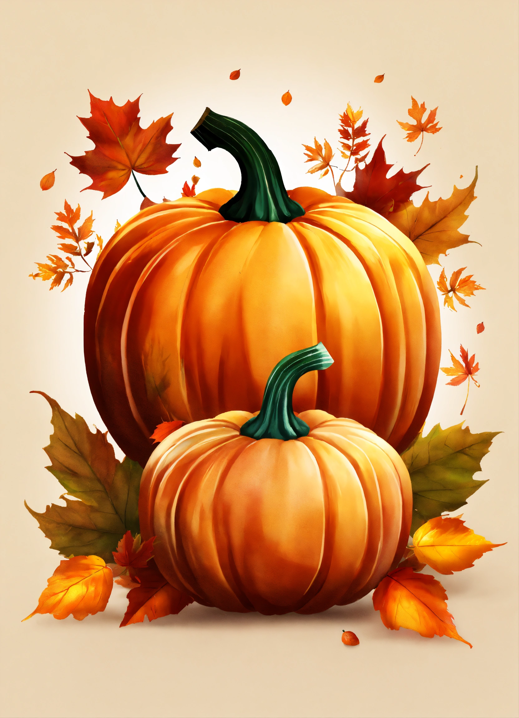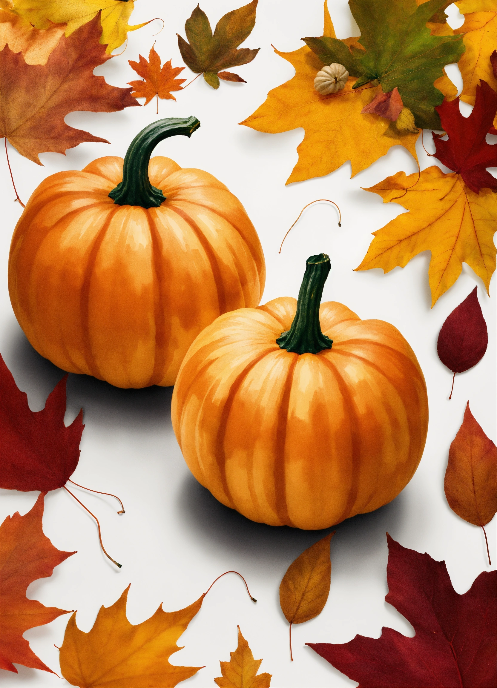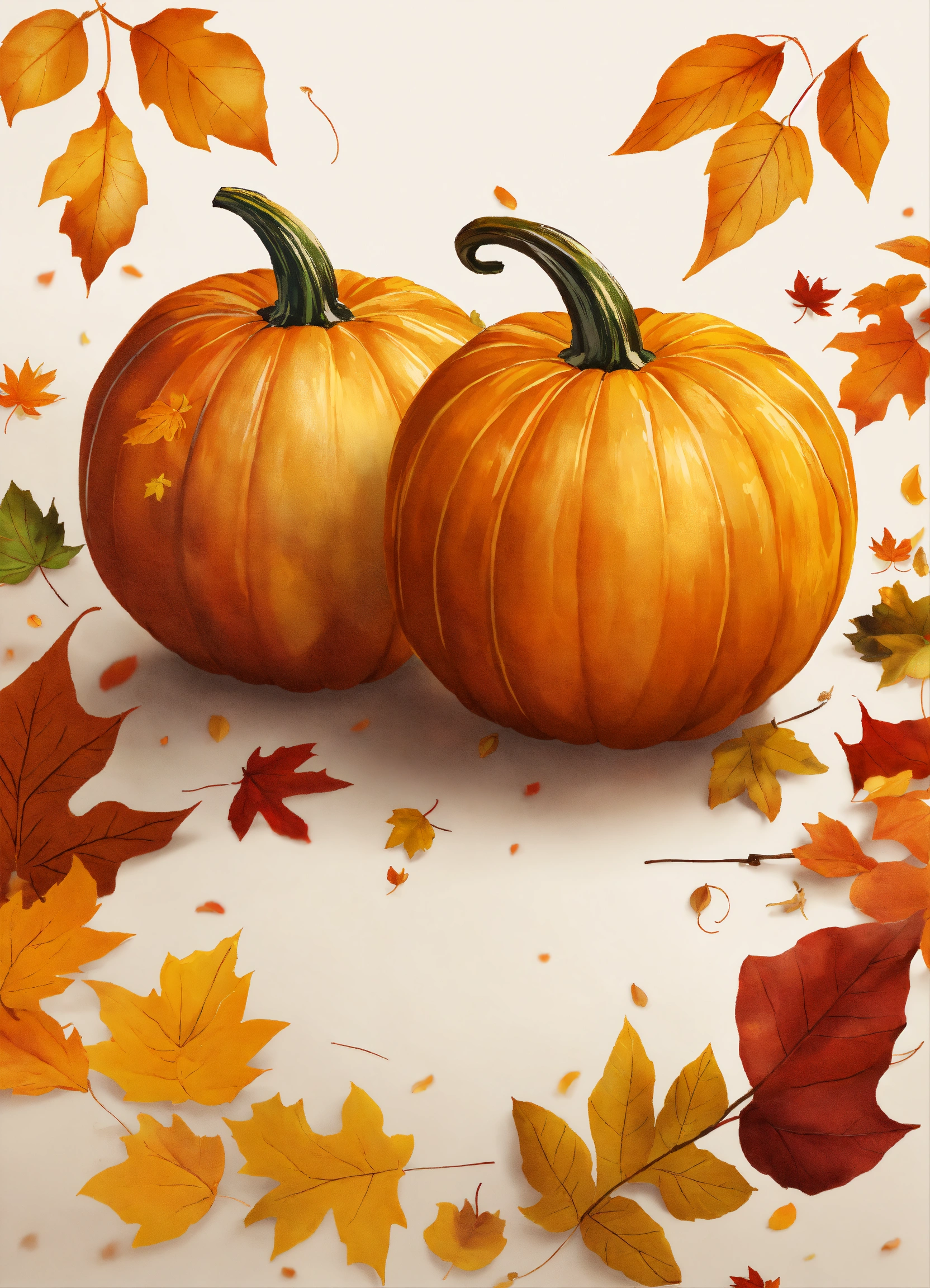 Create an illustration of two pumpkin with fall leaves around it on a white background