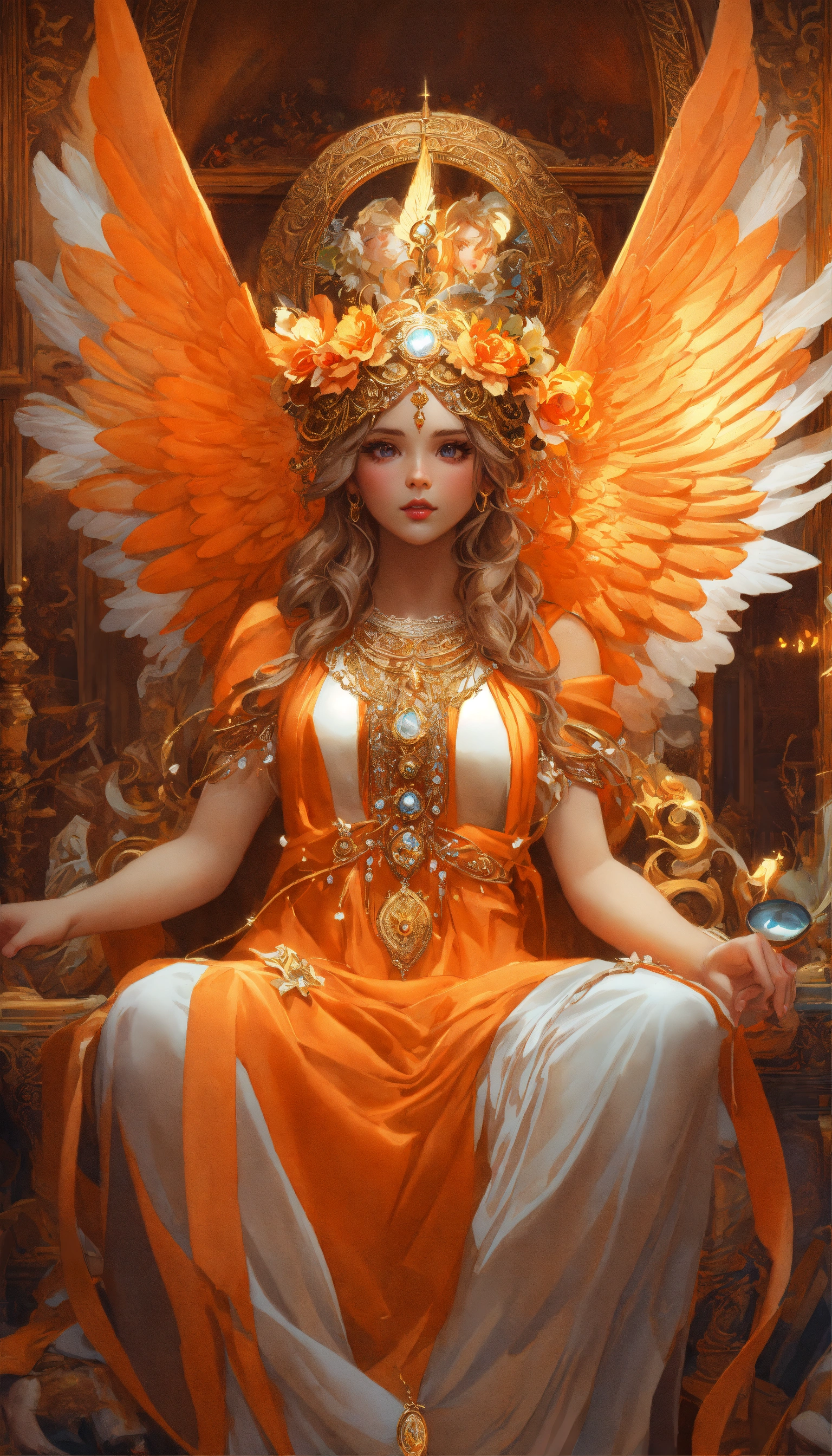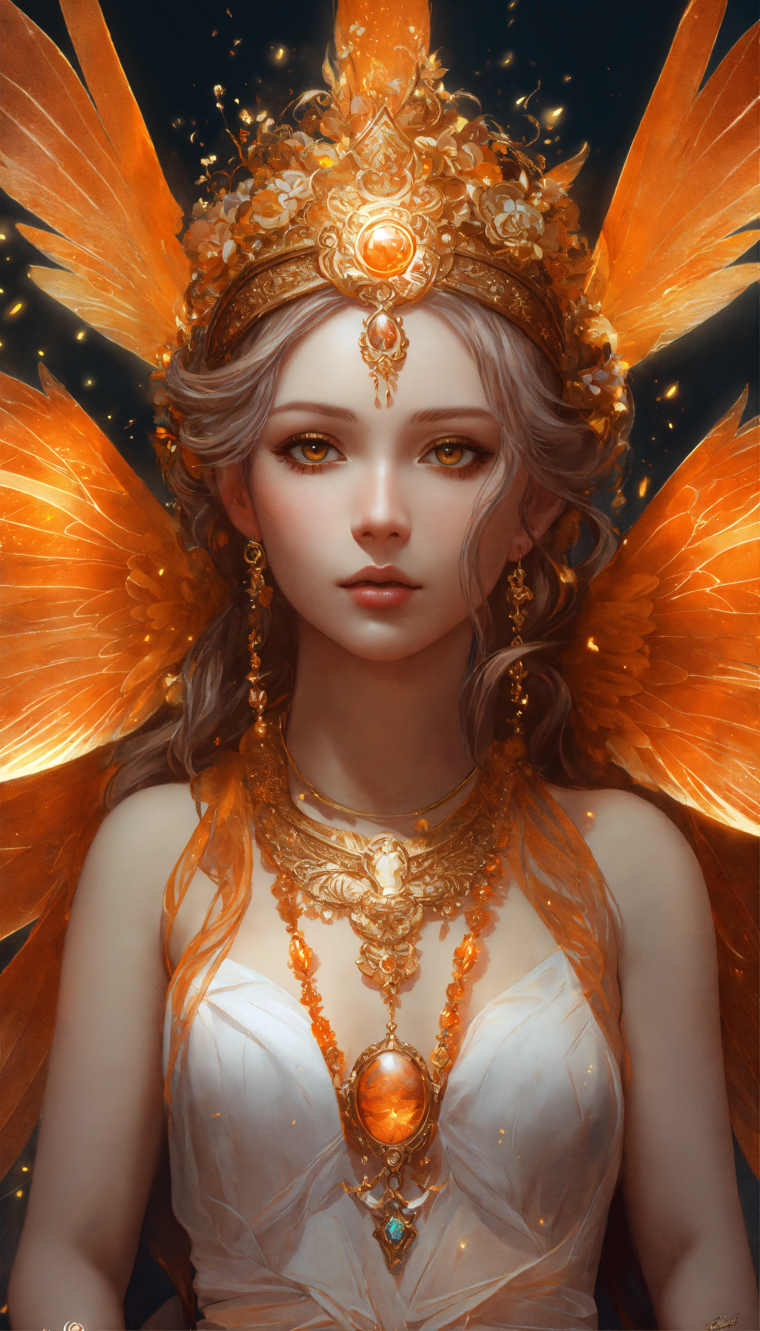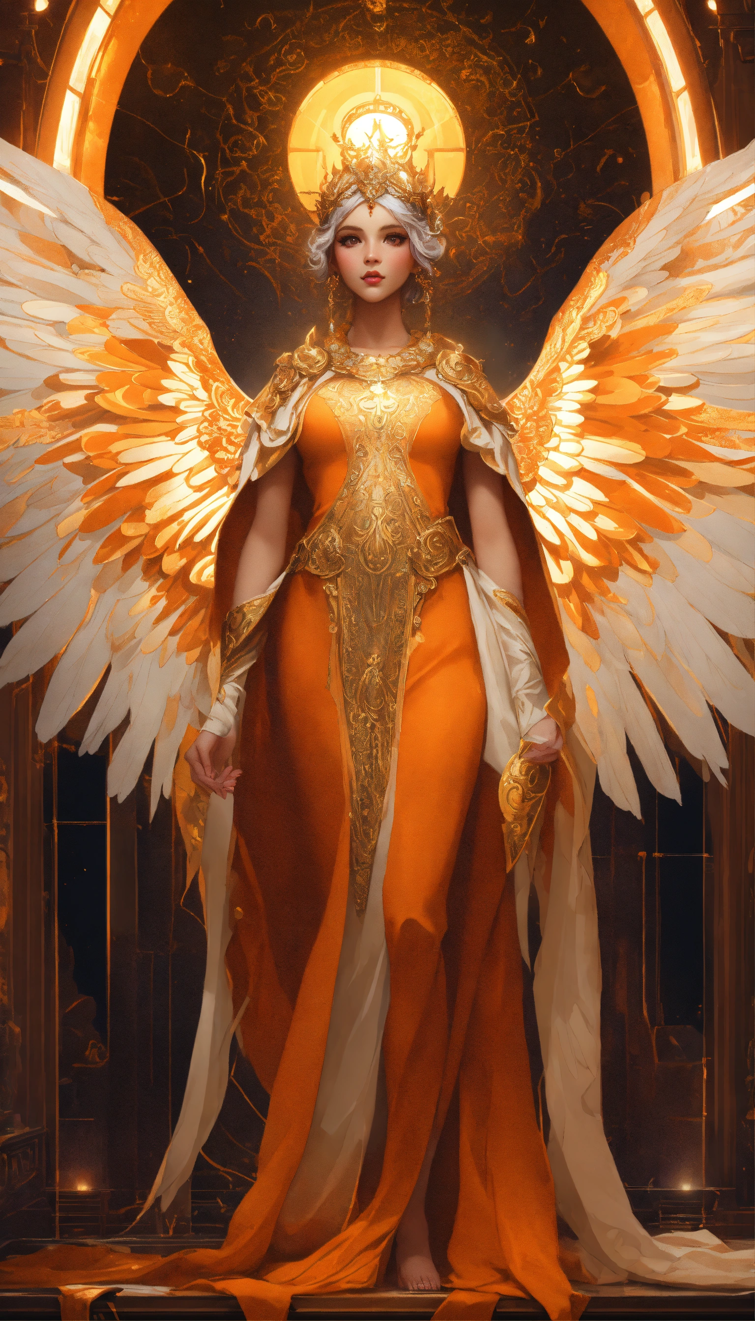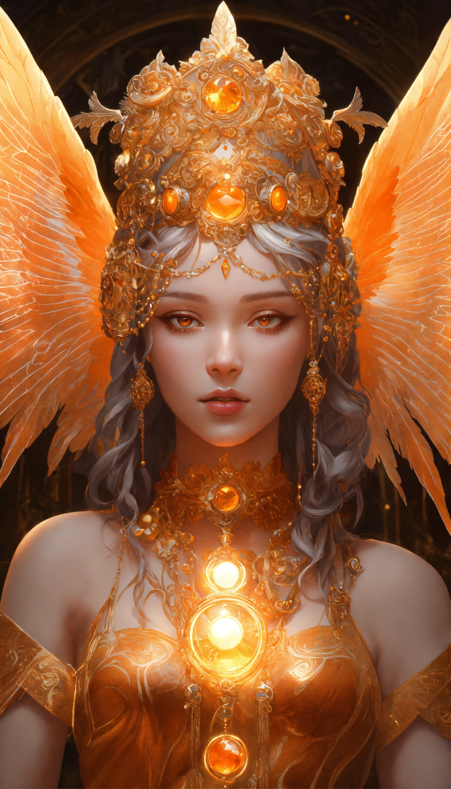 Cherub, wings, intricate, highly detailed, digital painting, art station, real, 3d, orange wings with luminous white flashes, large and detailed wings, clear eyes and deep look, face perfect in beauty and detail, jewel in the third eye, orange robe with white and gold details, sacred, mystical, sharp focus, cinematic lighting, 8k, illustration, art by artgerm and greg rutkowski, alphonse mucha, cgsociety, high quality and resolution, hyper realistic