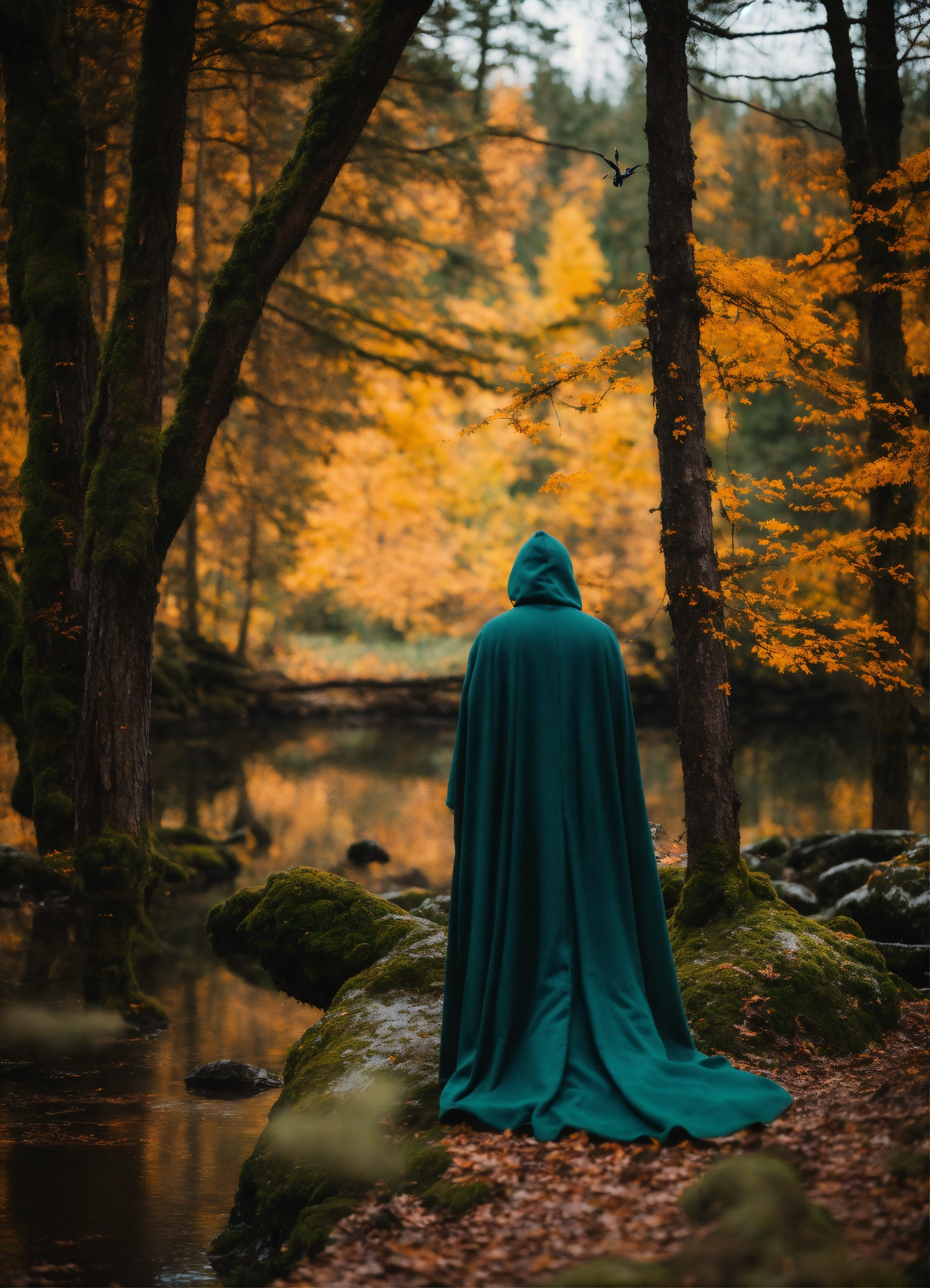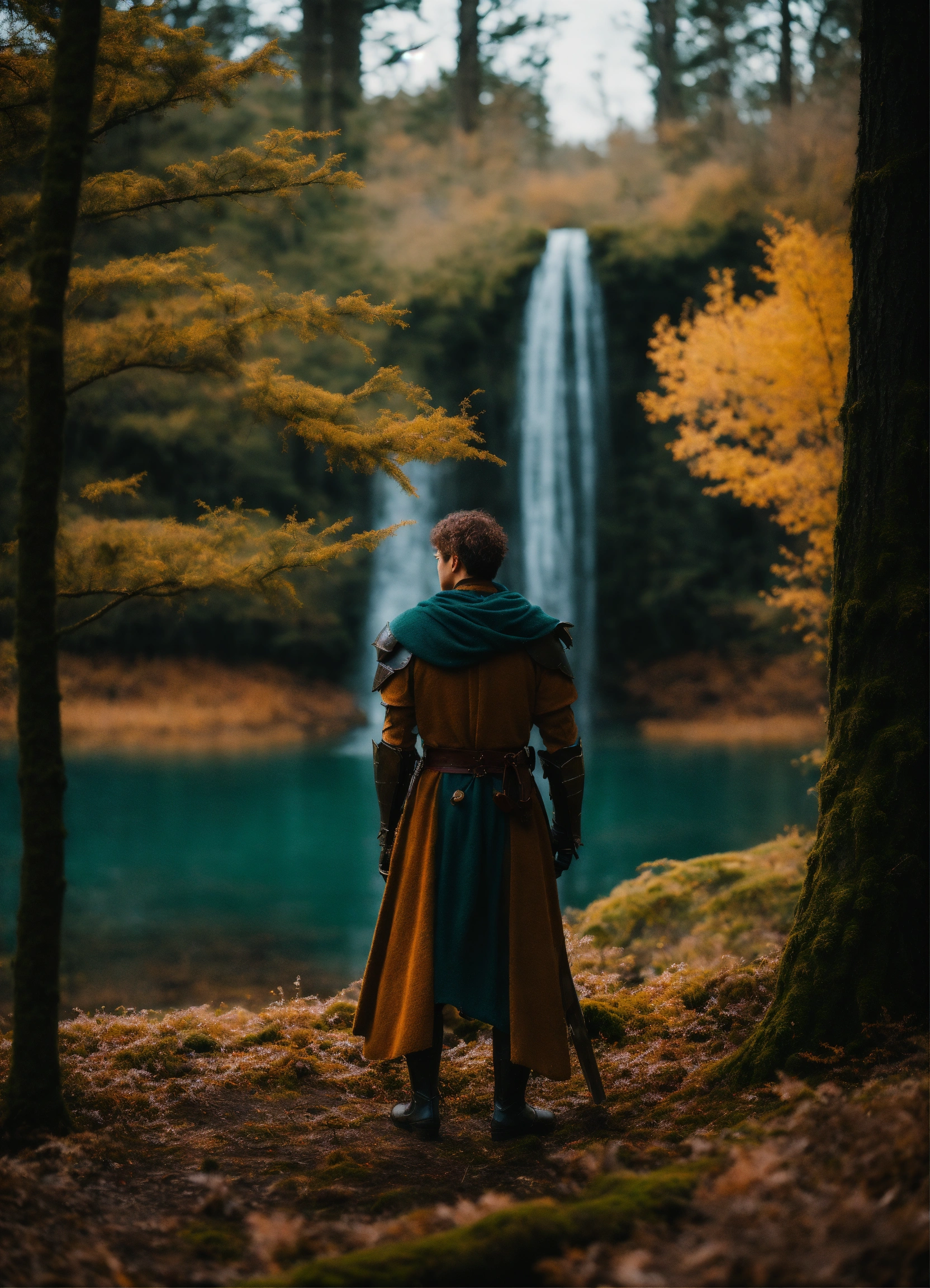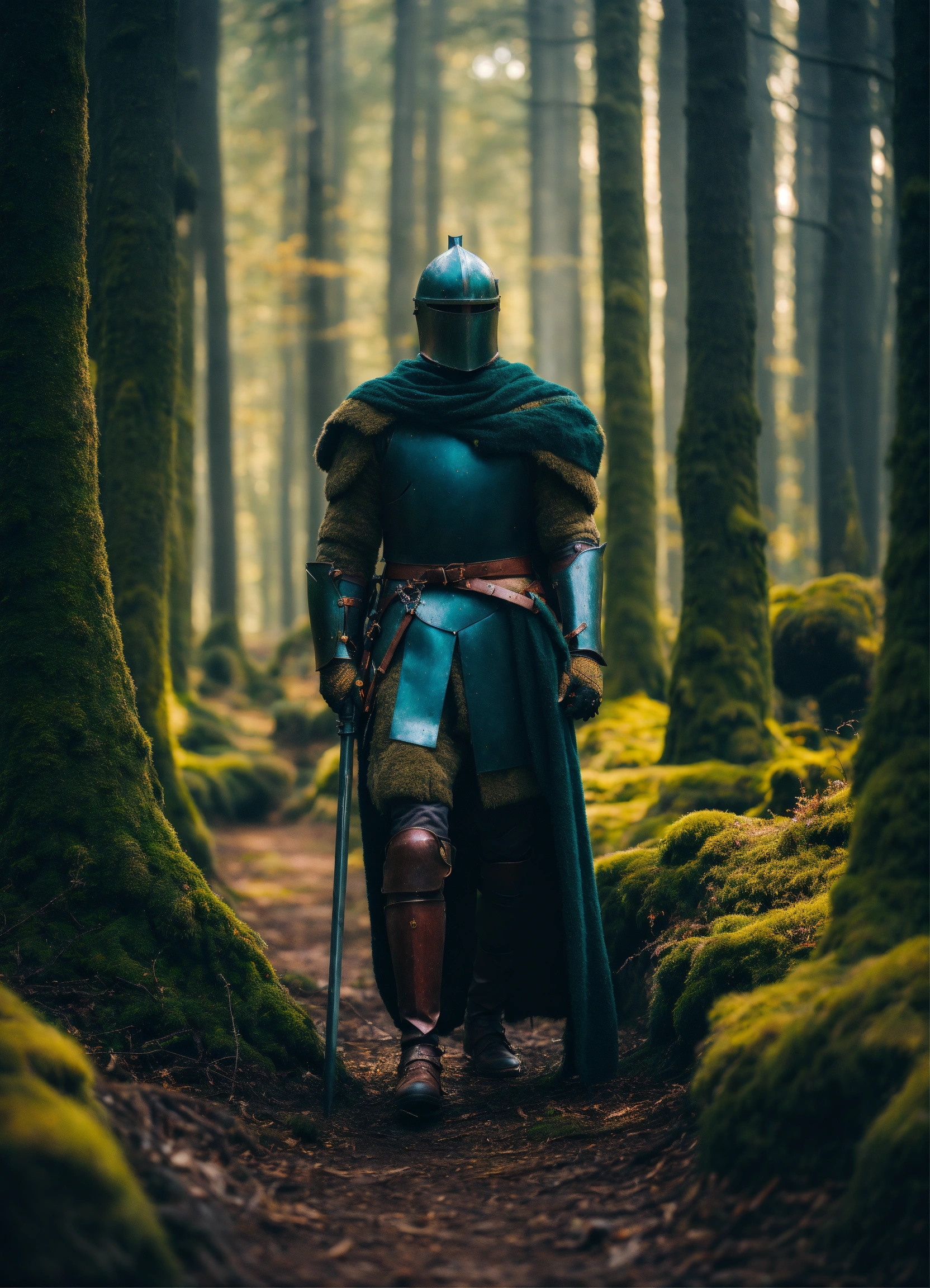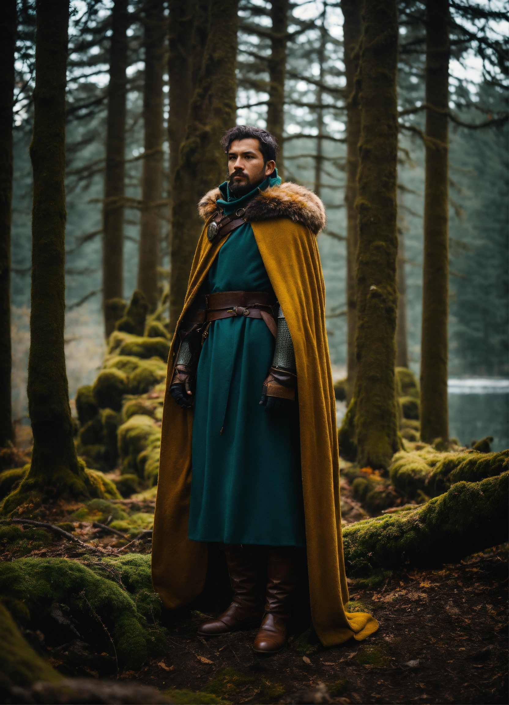 A brave human knight among the trees, forest lake, moss, cold weather, dark teal and amber, sony a7 iv