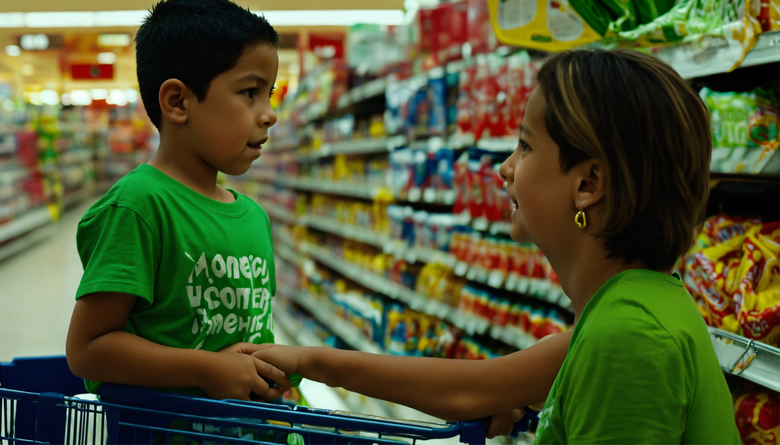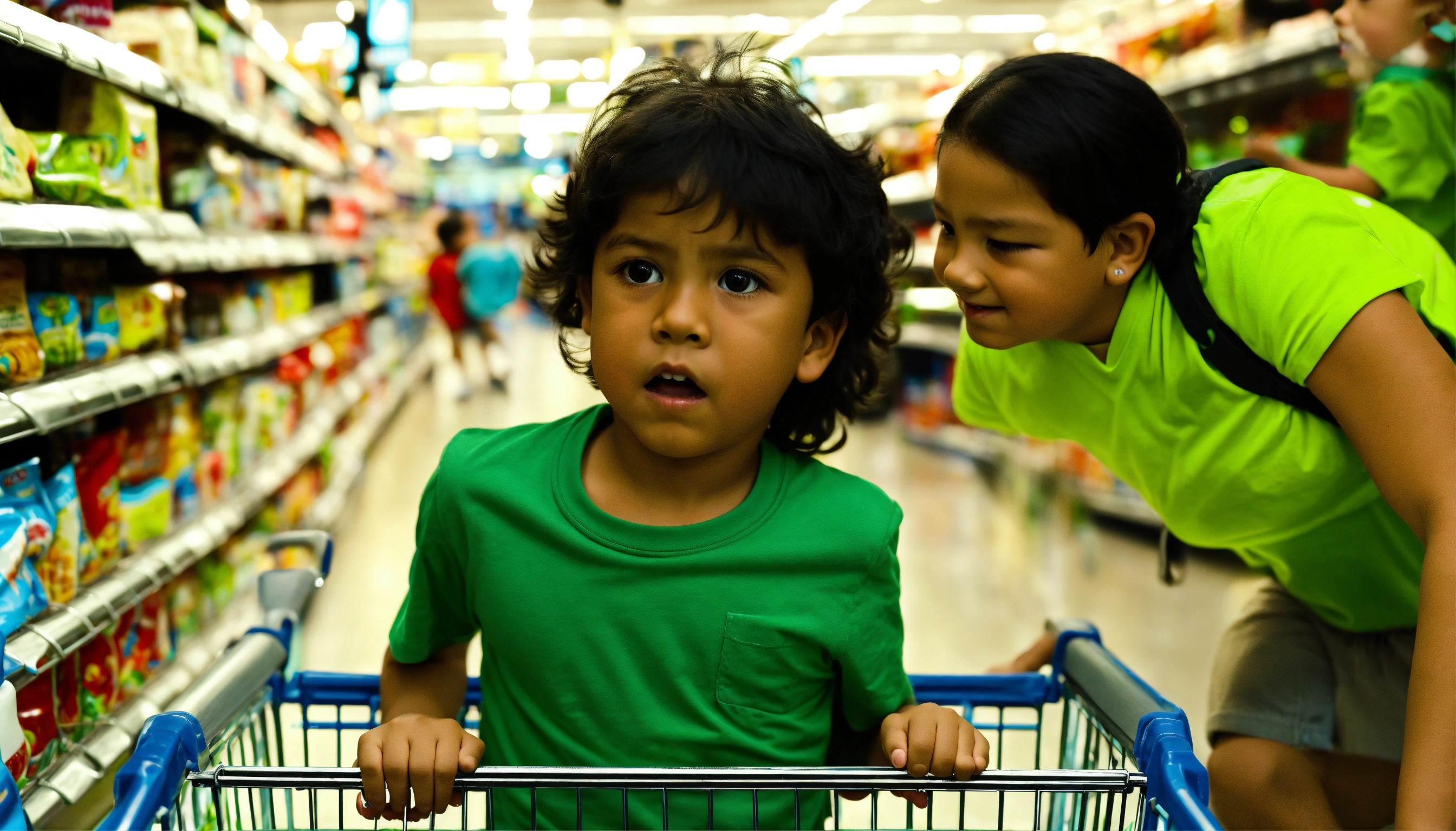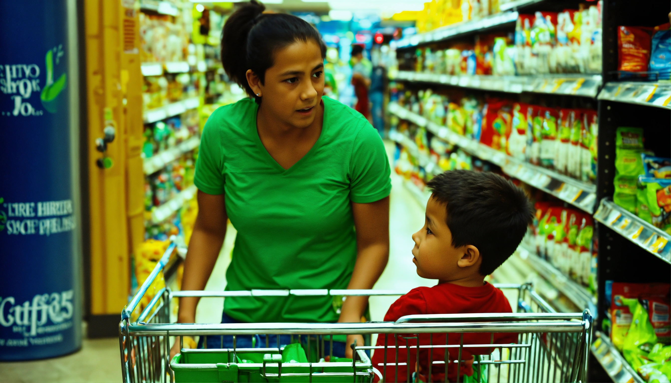 Mother pushing her 5 year old hispanic boy in a green tee shirt inside of a shopping cart looks at the little boy with concern because the little boy looks sick
