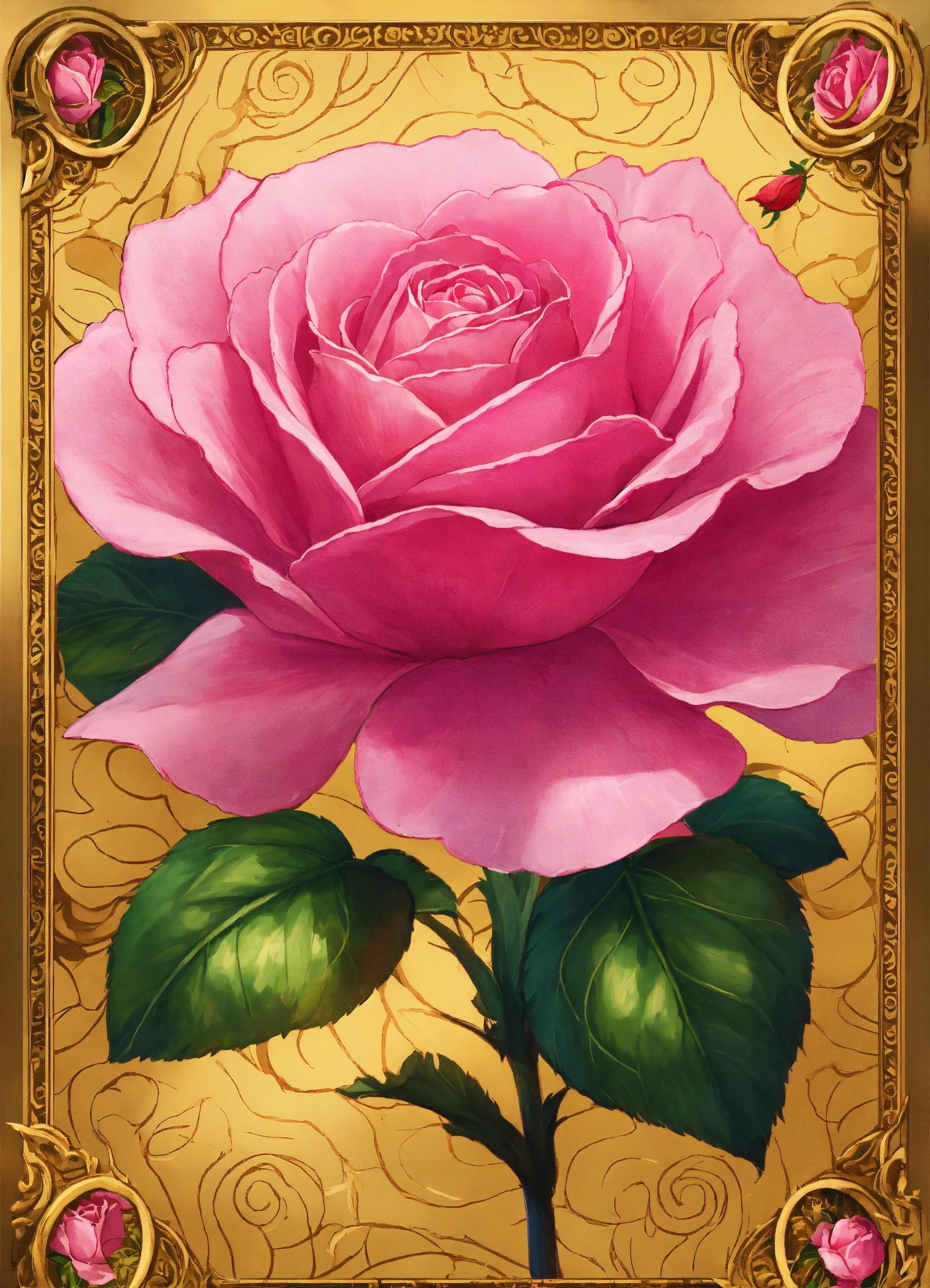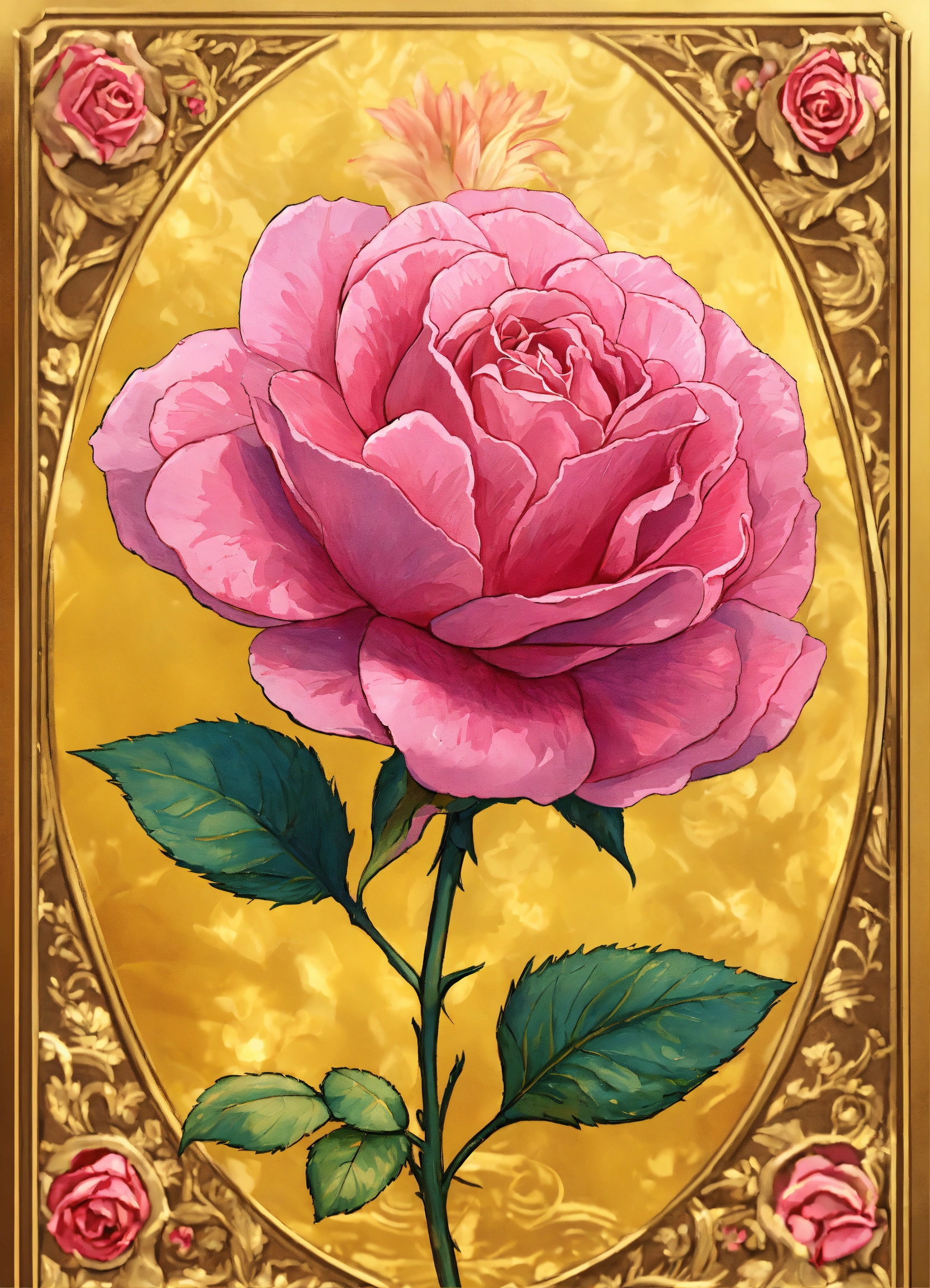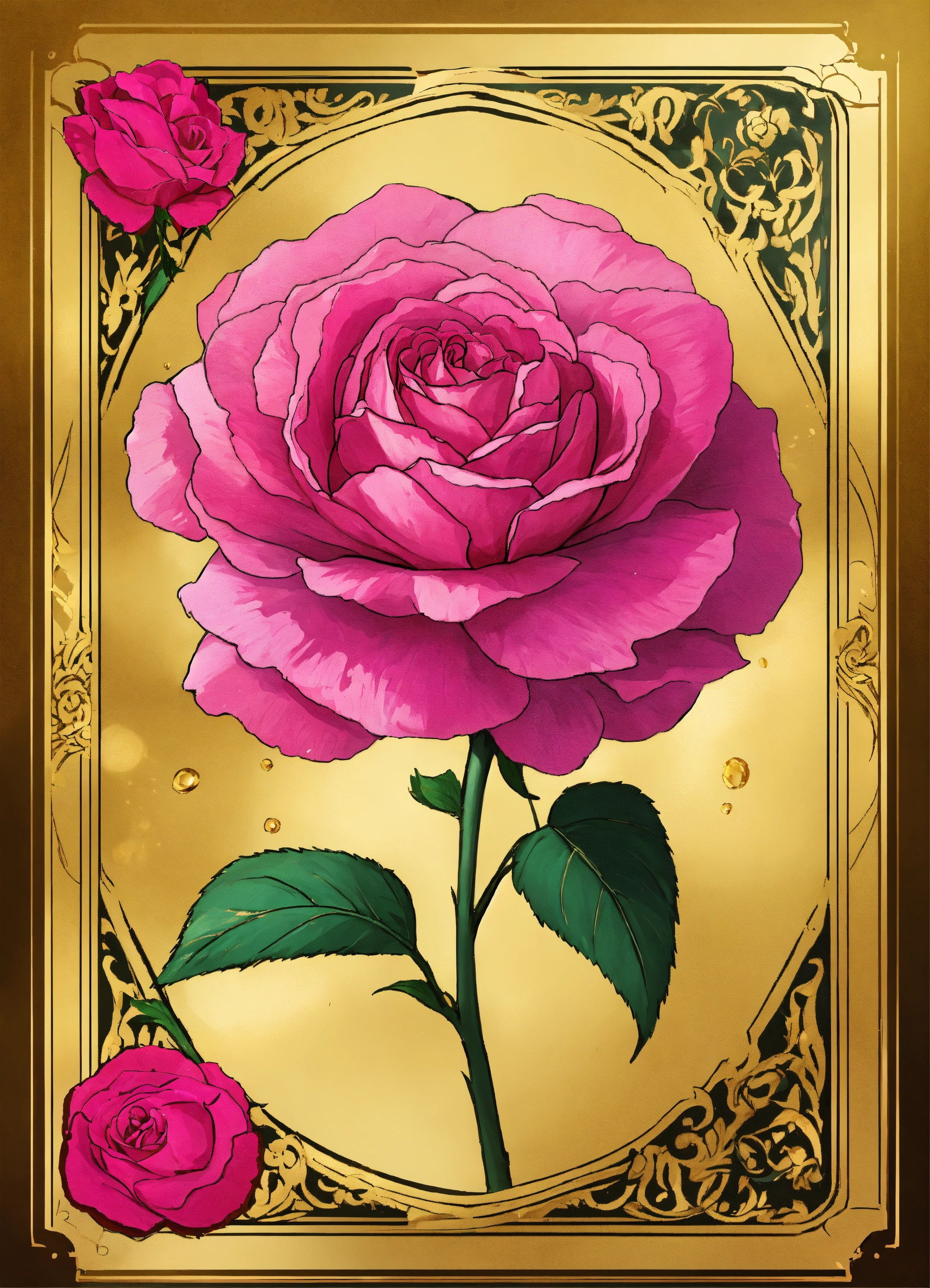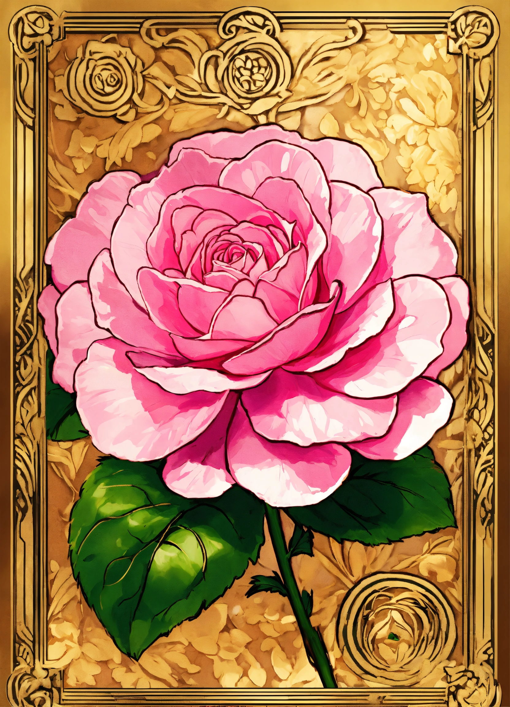 A pink flower, a rose, based on the card "la rosa" of the mexican lottery deck in anime style. gold background card styled.