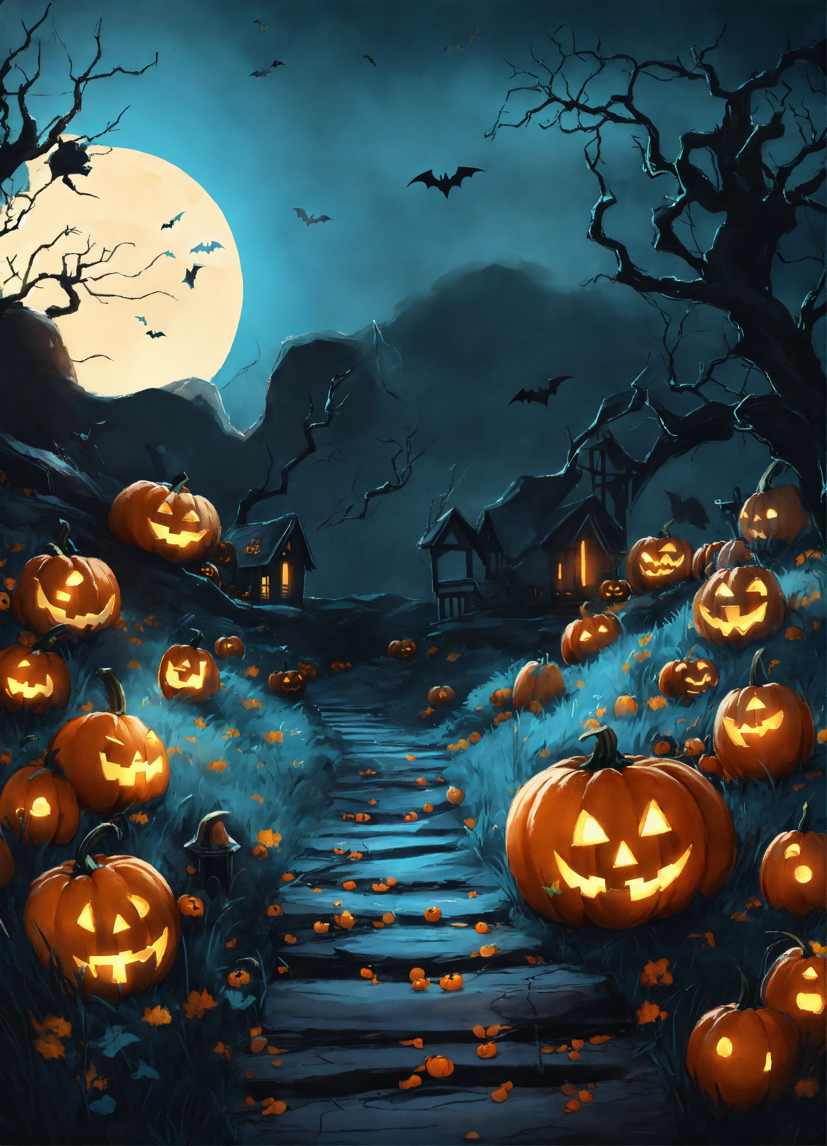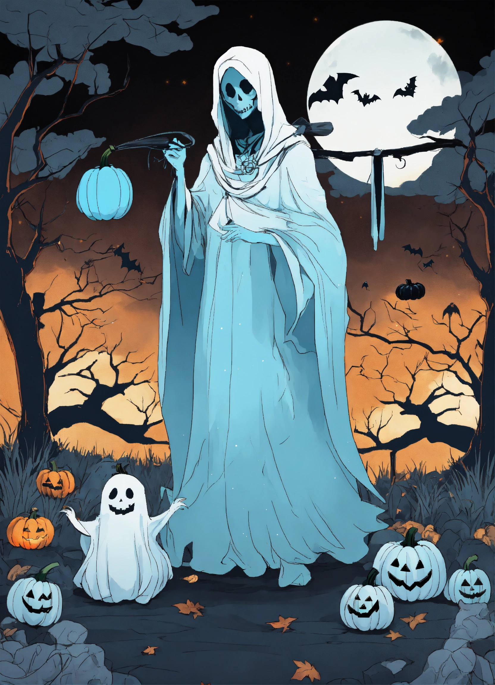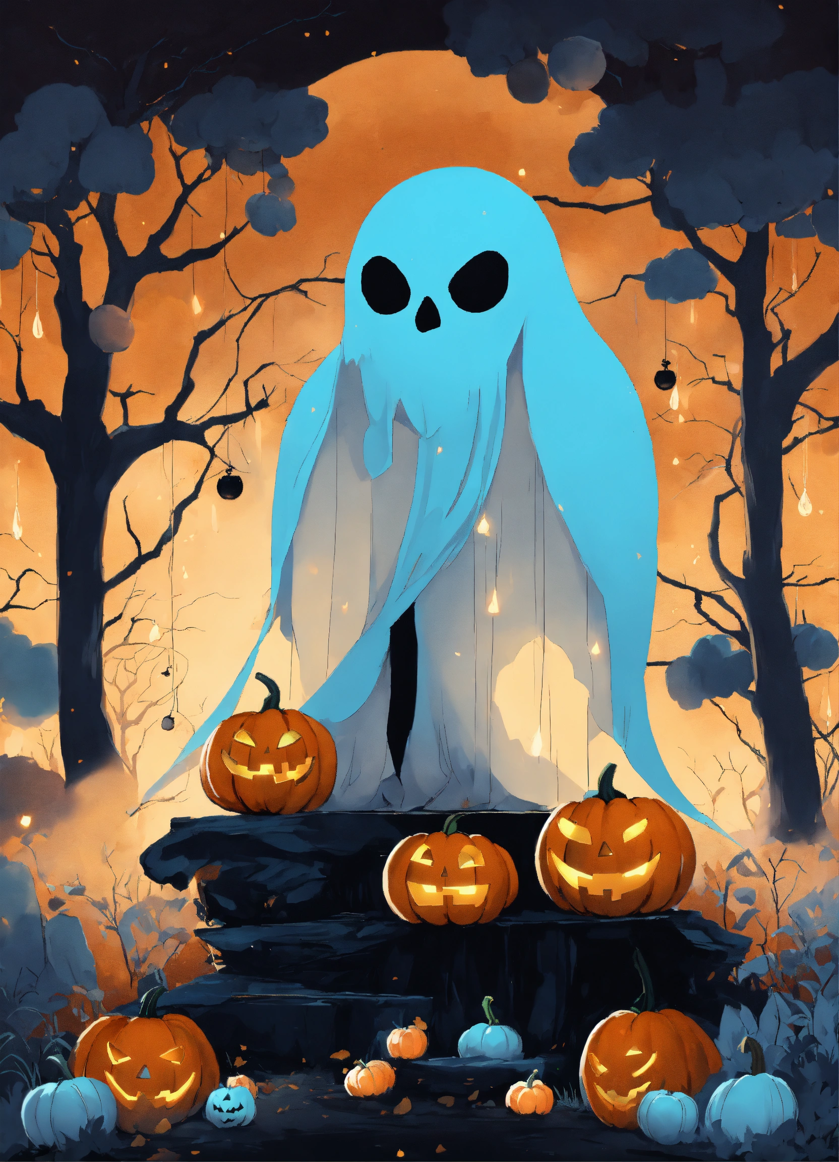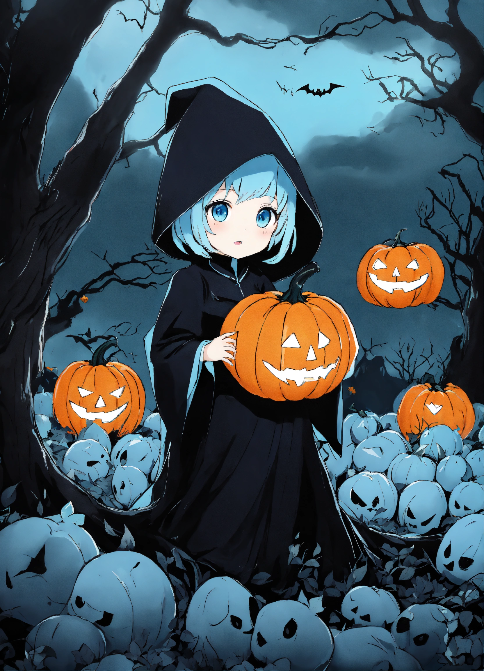 Magical halloween land anime style dominant black and baby blue colors epic background with white ghost and baby blue pumpkins no humans no orange color in picture