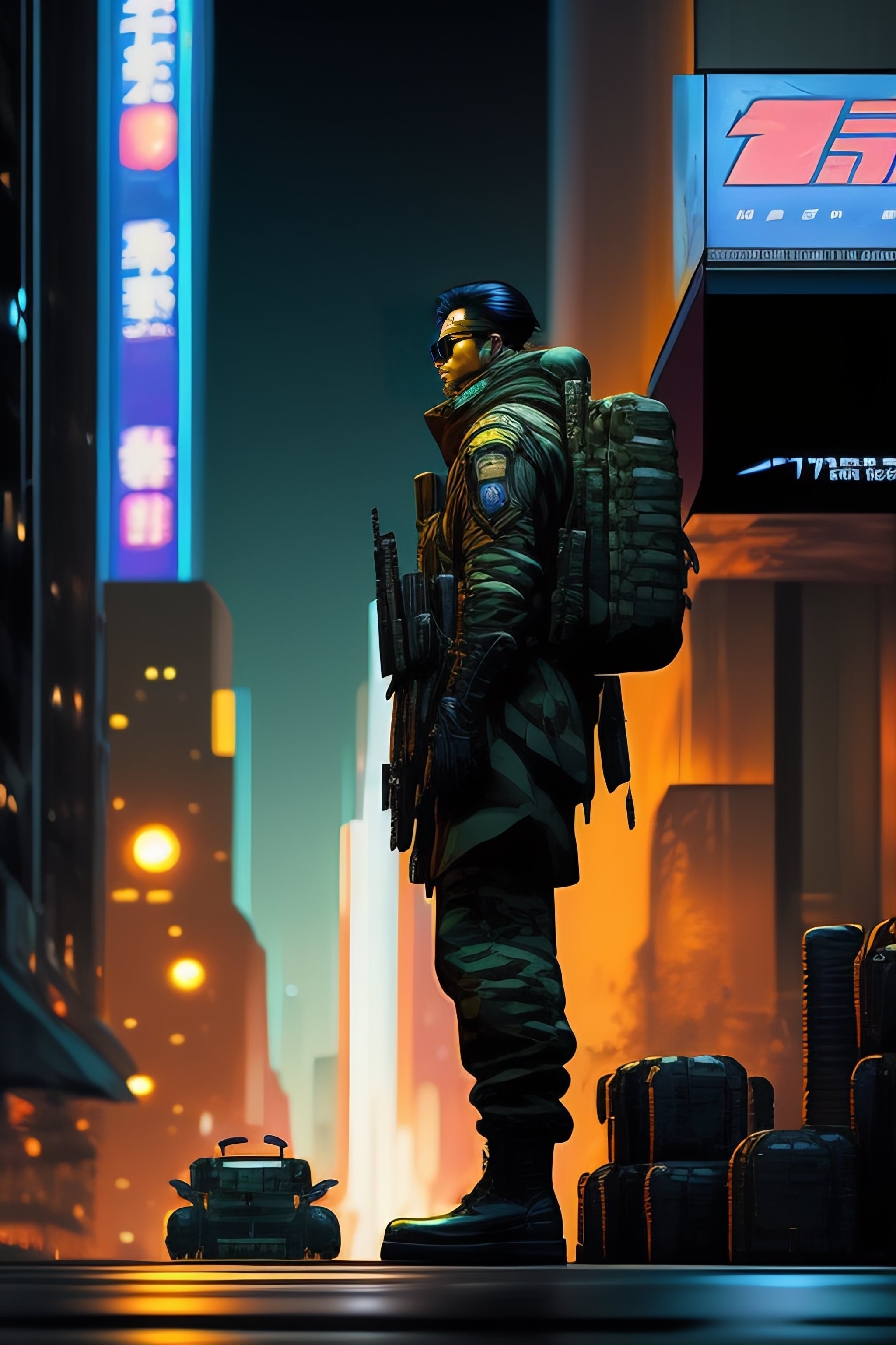 Art of stealth soldier in the city at night drawn like yoji shinkawa's style