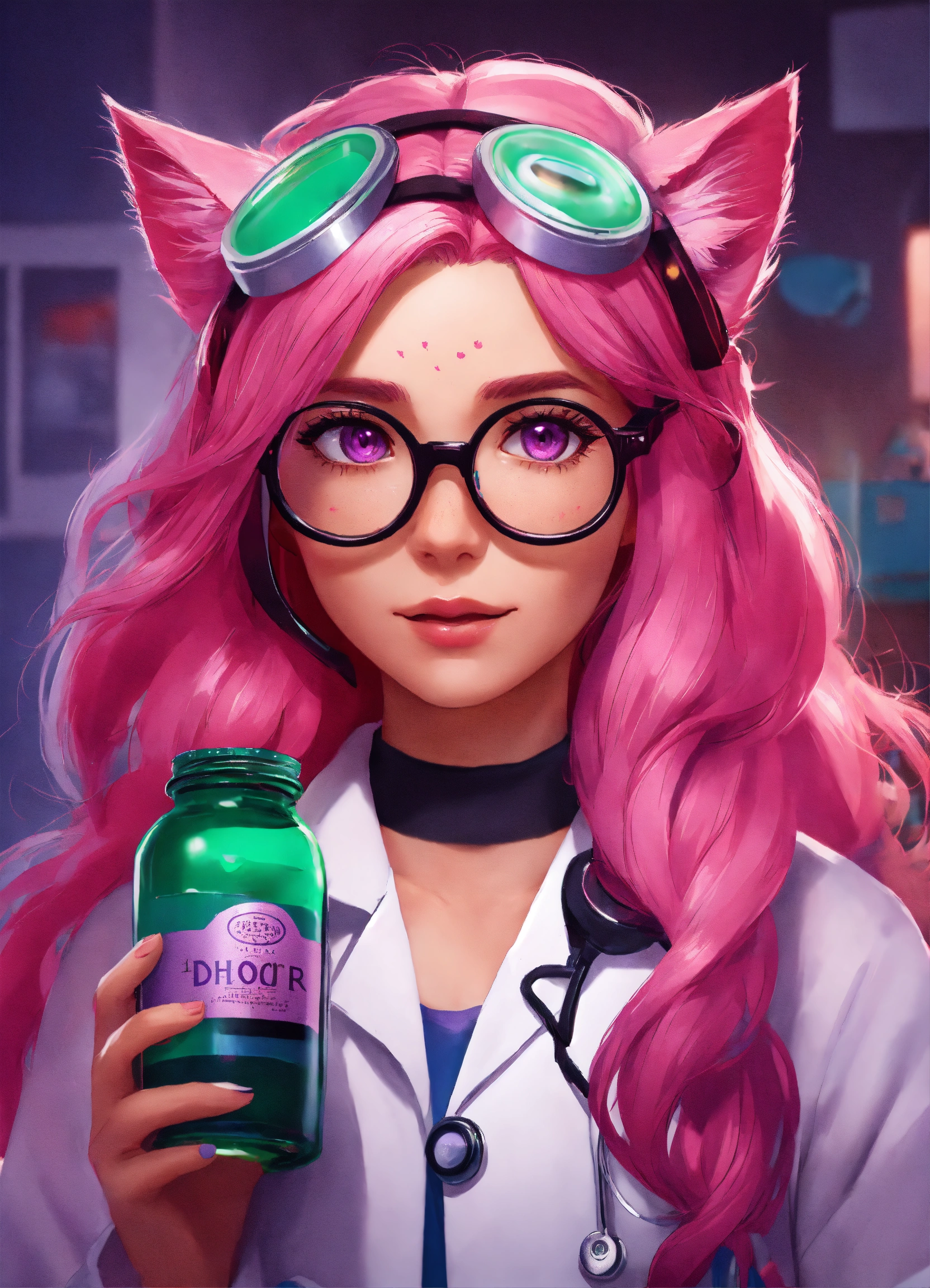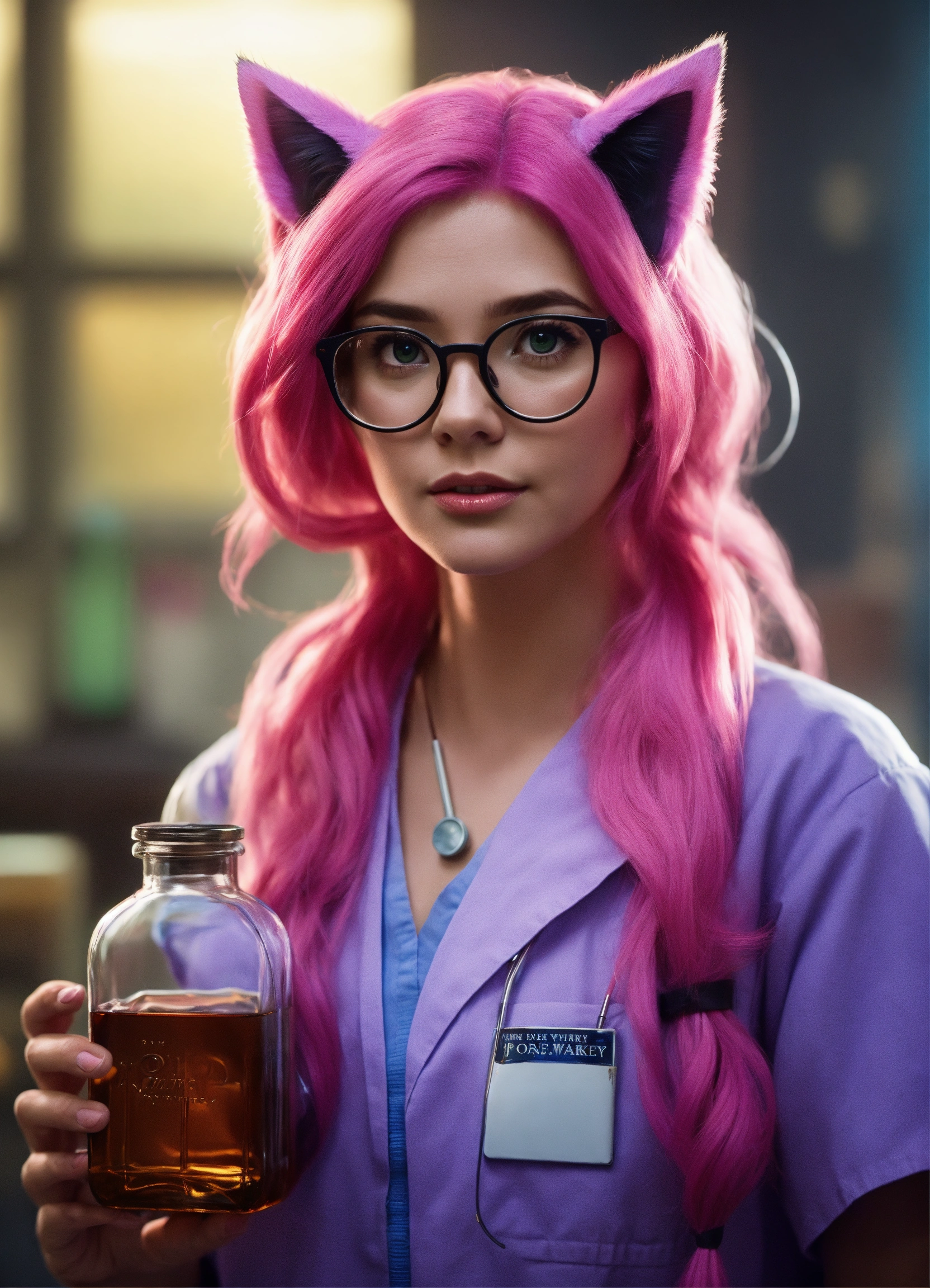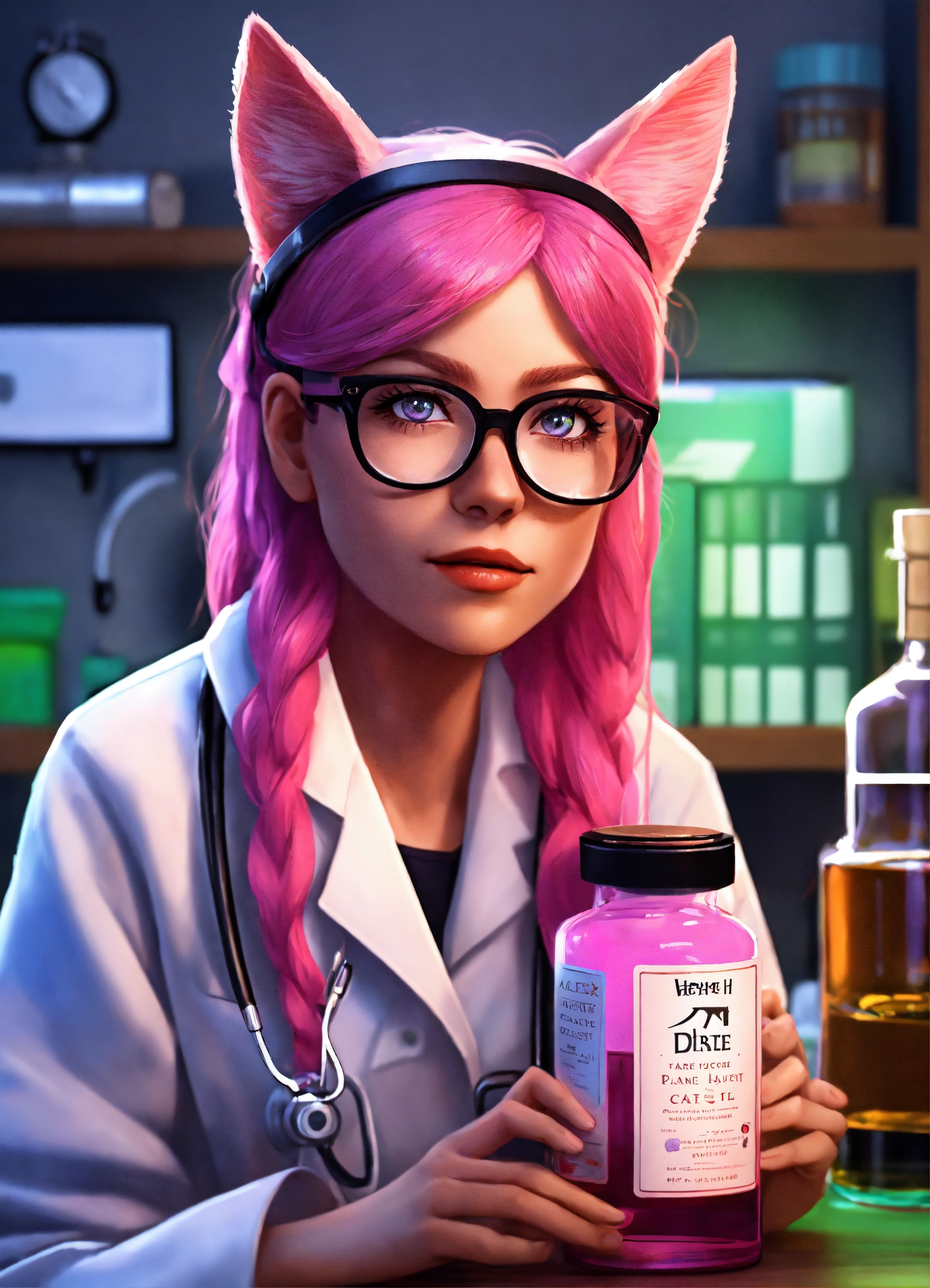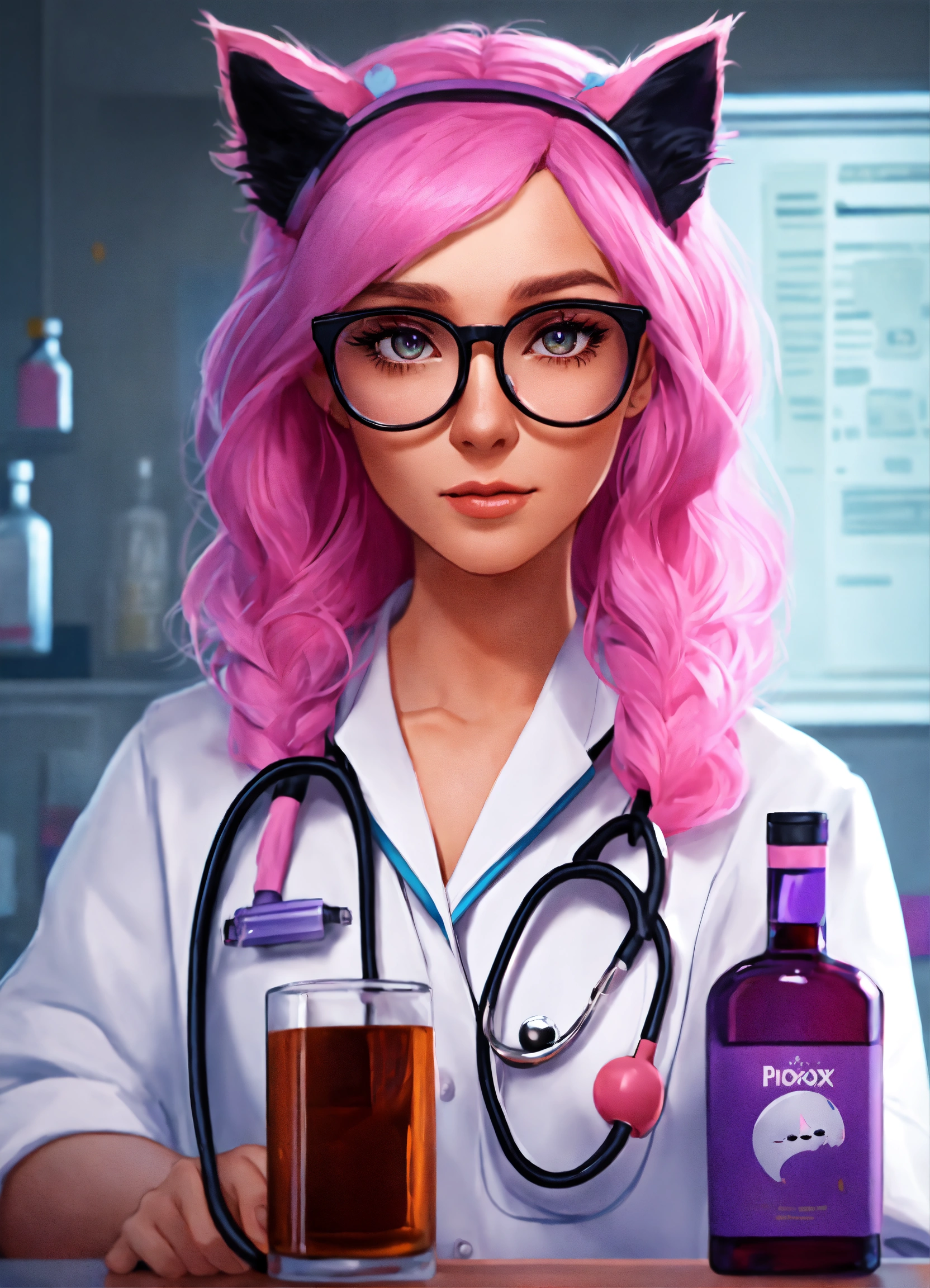 Female doctor, with long pink hair, with cat ears color black on her head, glasses and purple-pink eyes in hospital, pixar movie style with whiskey bottle