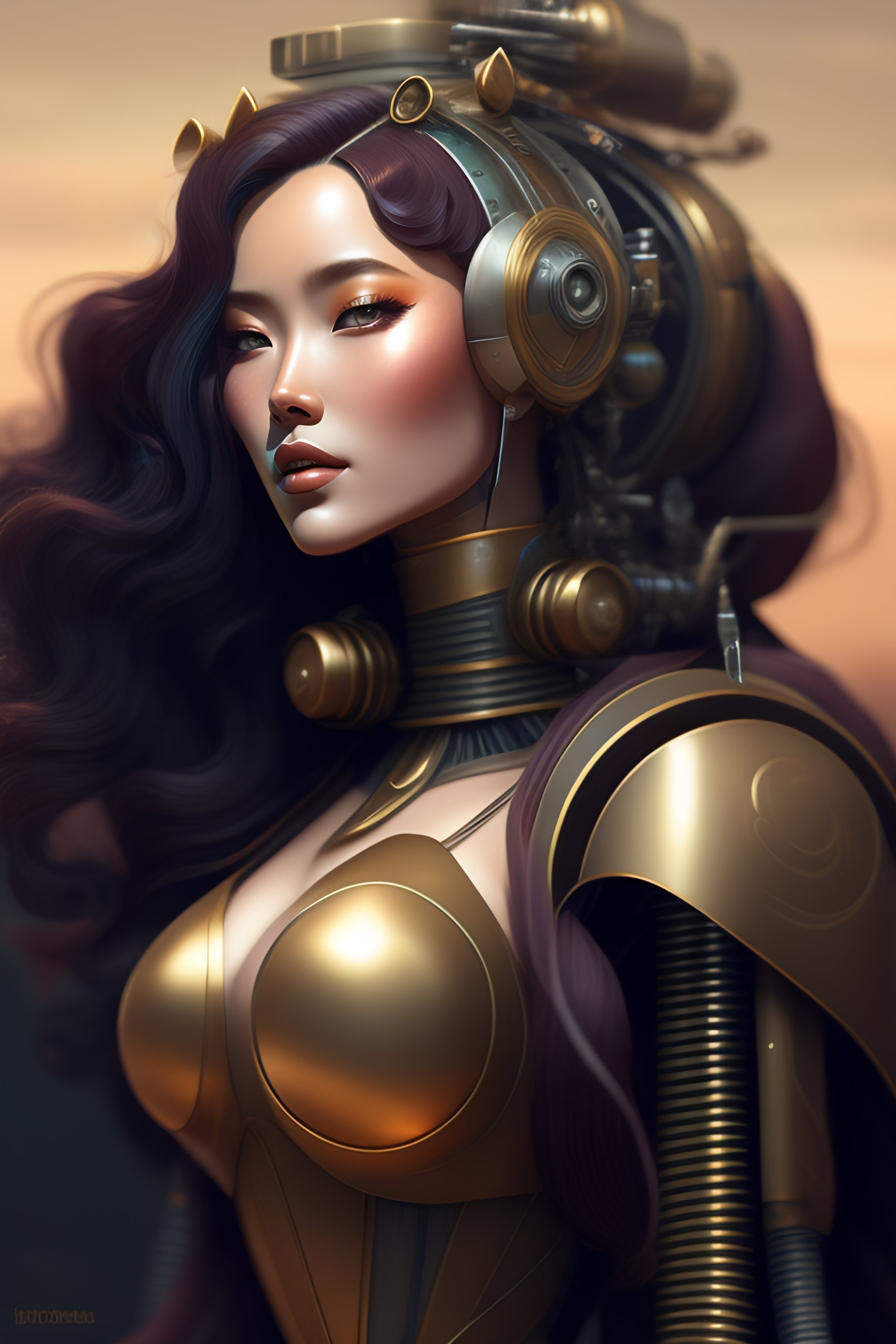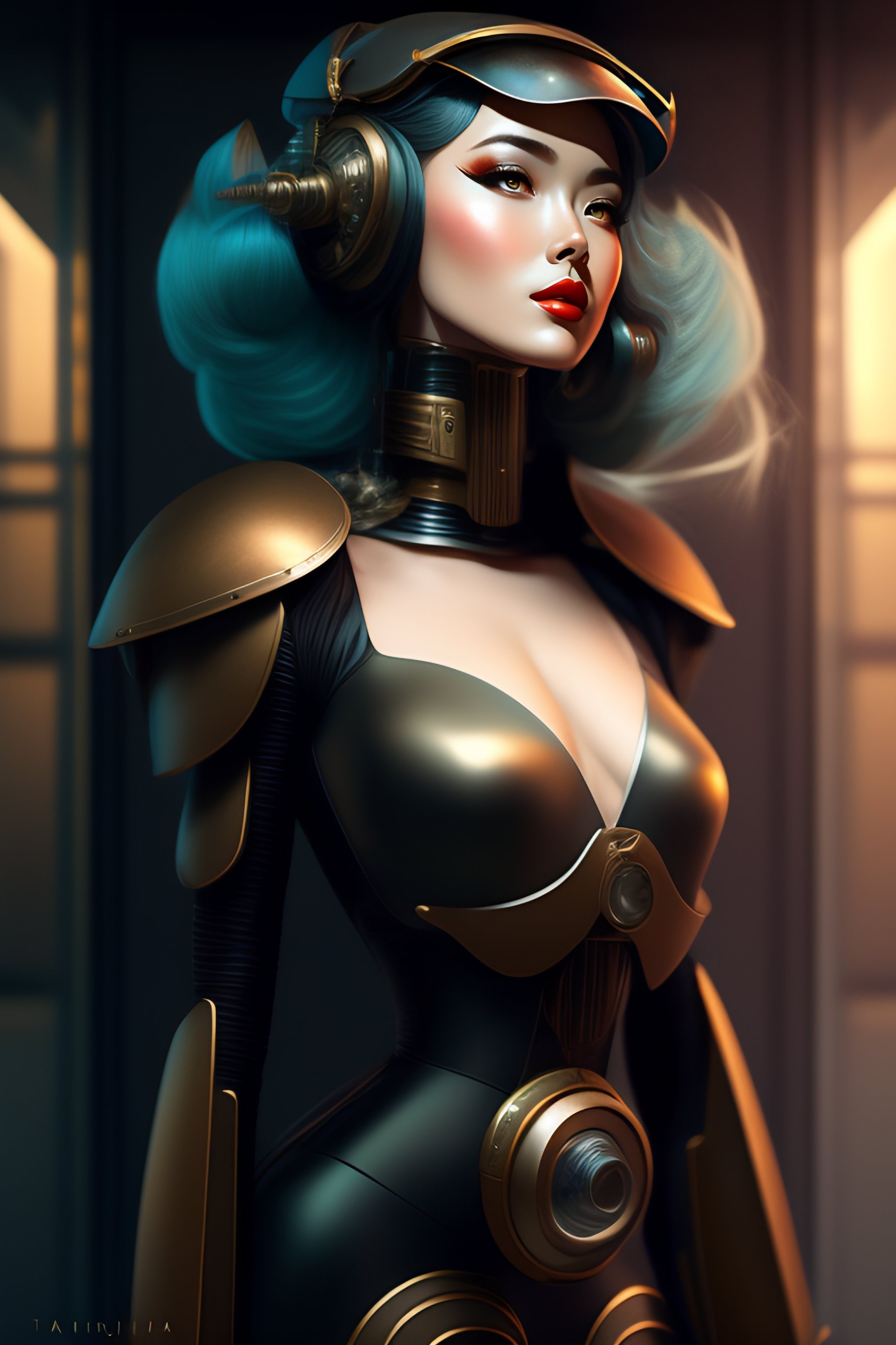 A full body pin-up girl near a robot, there is ugliness in beauty, but there is also beauty in ugliness. in the style of peter driben, rolf anstrong, forest h. glouw, surrealism, dark art by james jean, takato yamamoto, 1950 retro future art cubist designs borders lines decorations space machine, muted colors inspired by baptiste monge