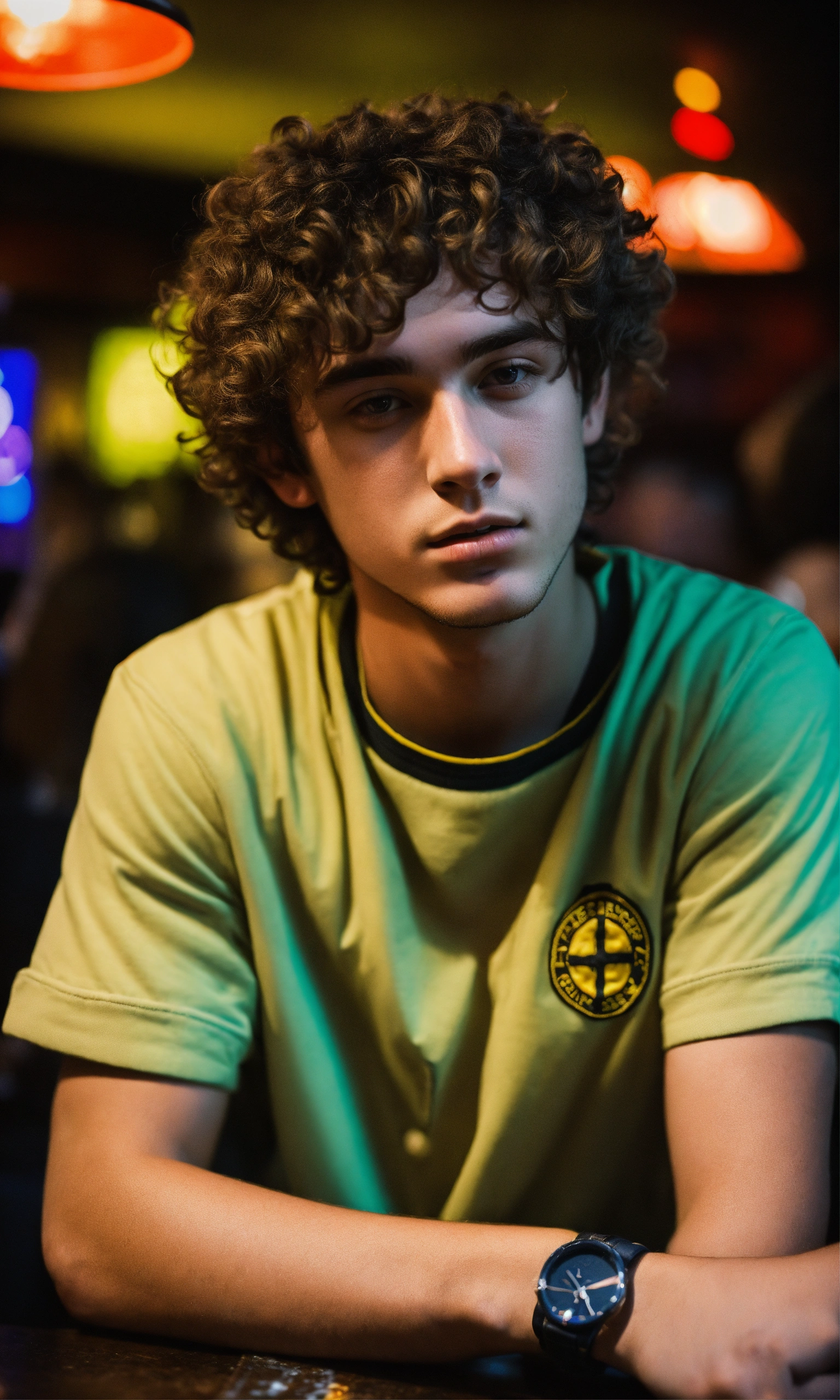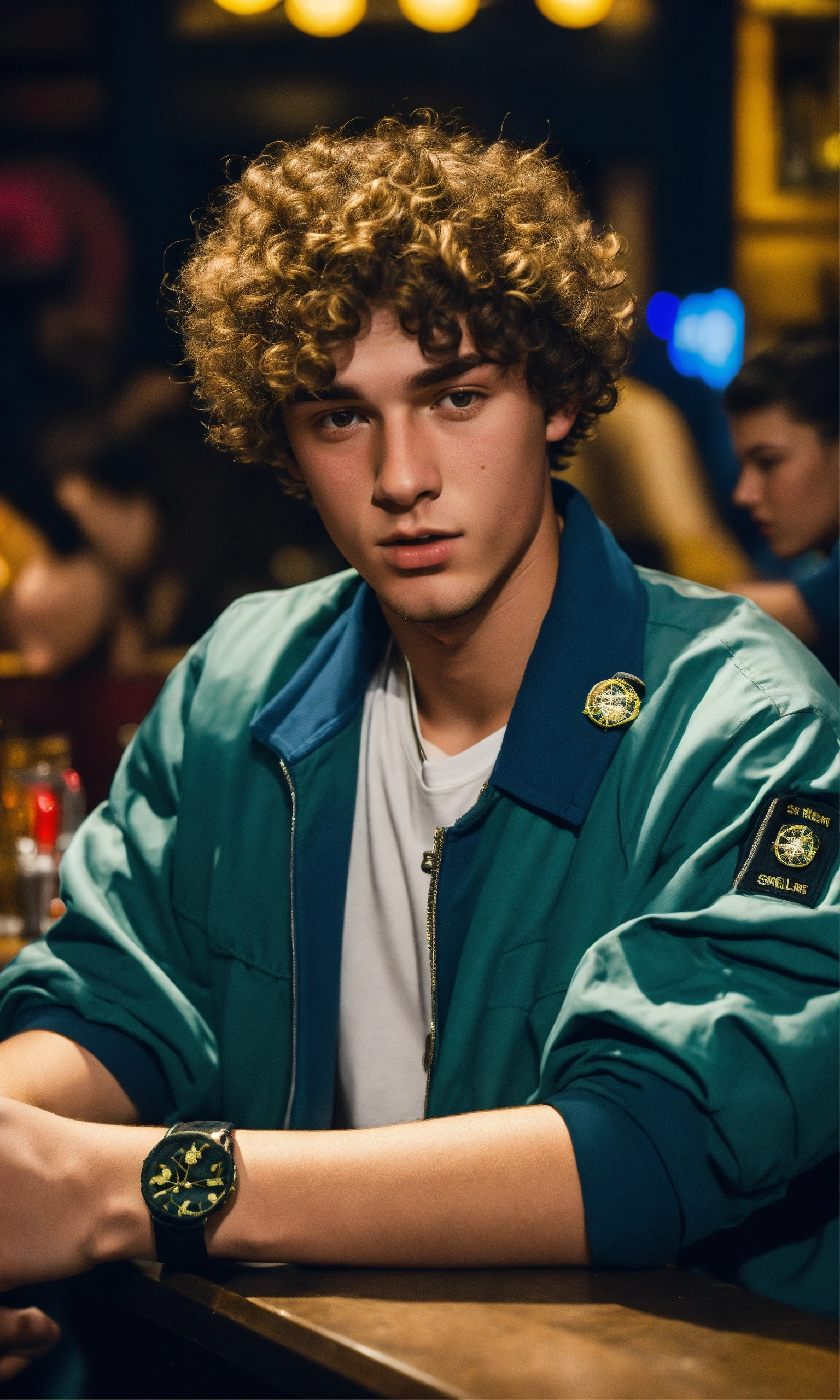 18 year old british chav, he has short curly hair, he is wearing stone island, he is talking to girls at a bar