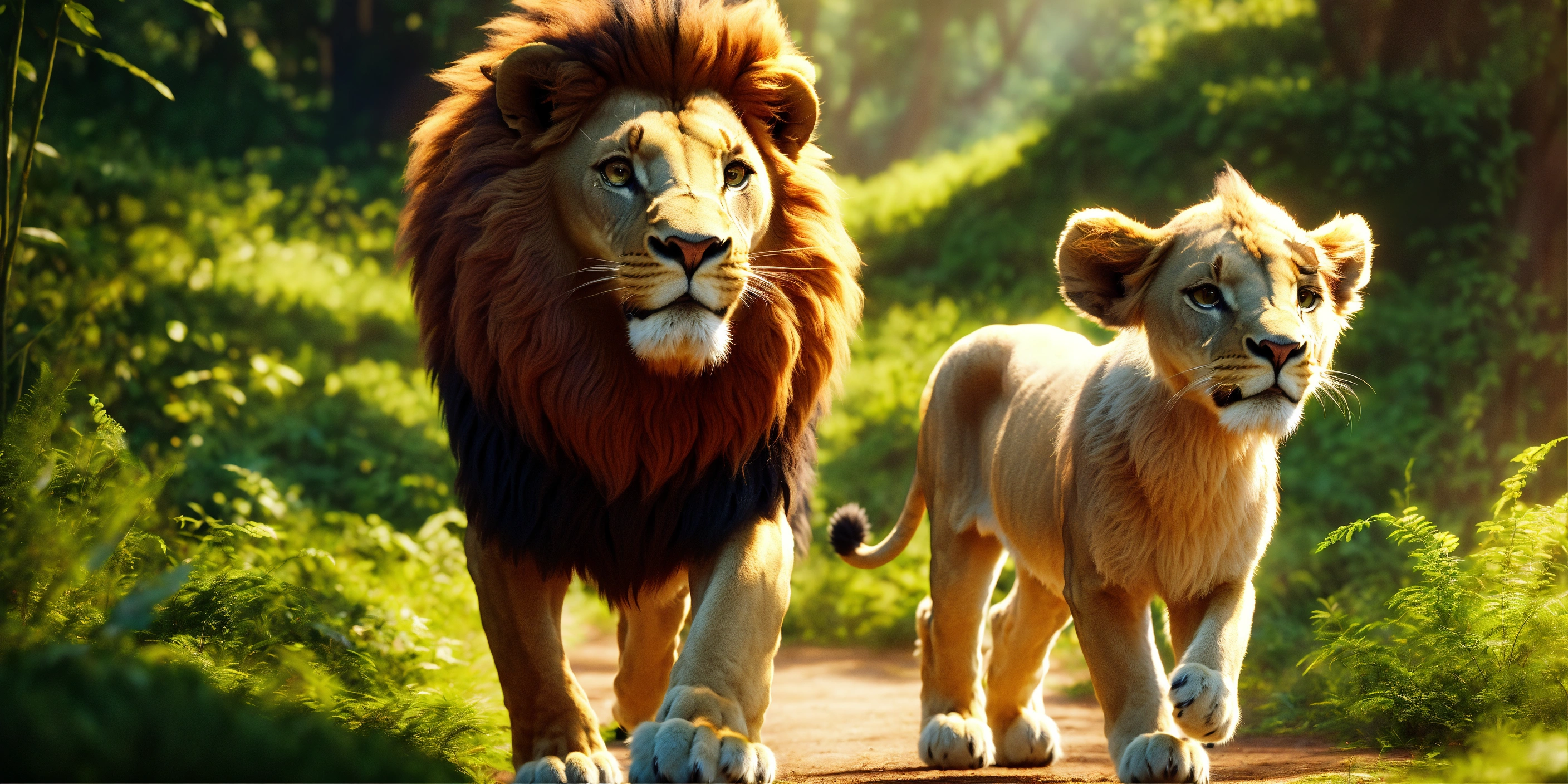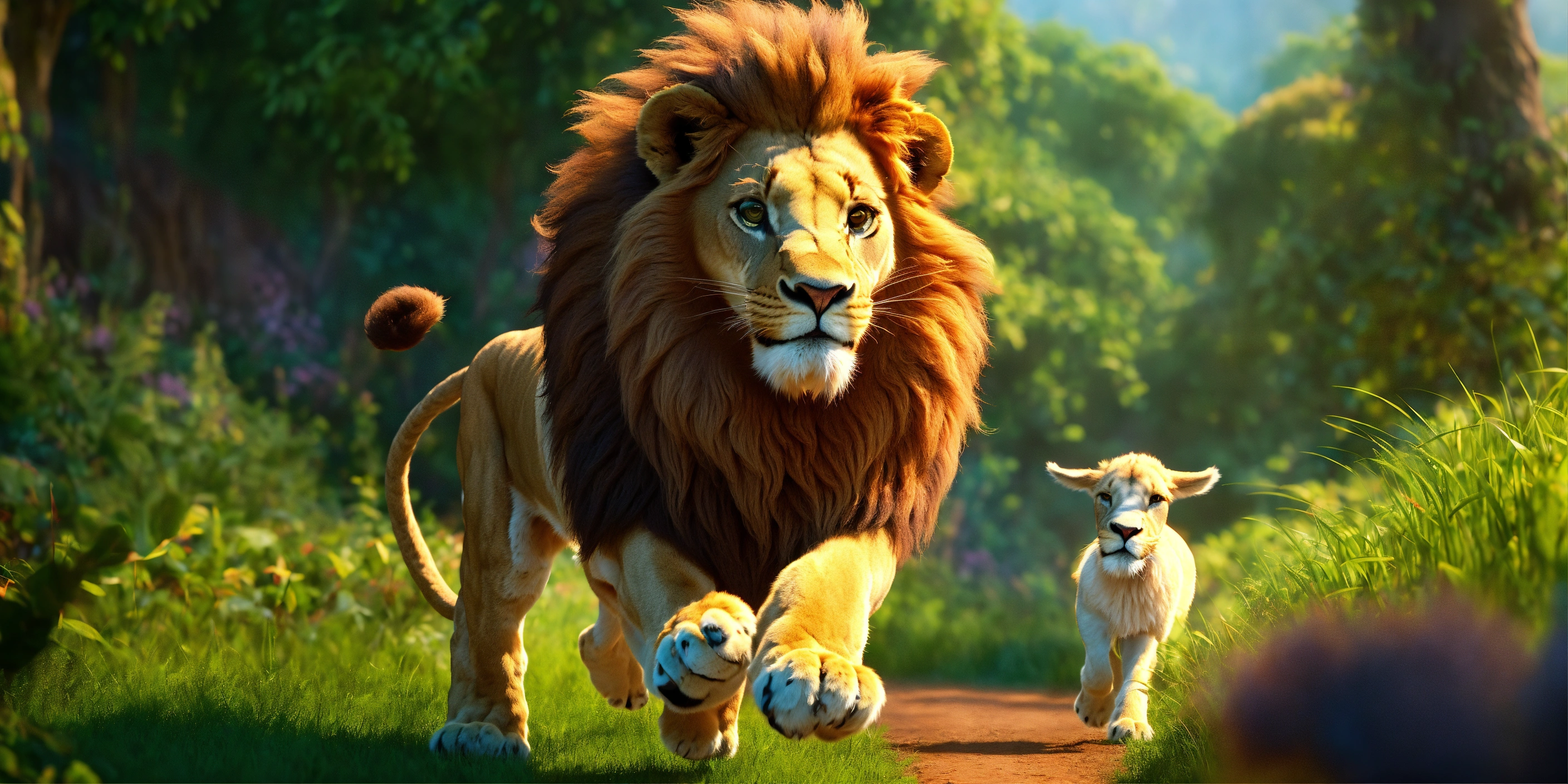 4d photographic image of a lion 4d photographic image of the full image lion jumps and the little lamb runs before the lion in the forest, surrounded by lush greenery. disney style, 8k ultra, studio ghibil hd pixar, cinema 4d, realistic, artistic photography, photorealistic concept art, soft natural volumetric cinematic perfect light, uhd, cartoon style
