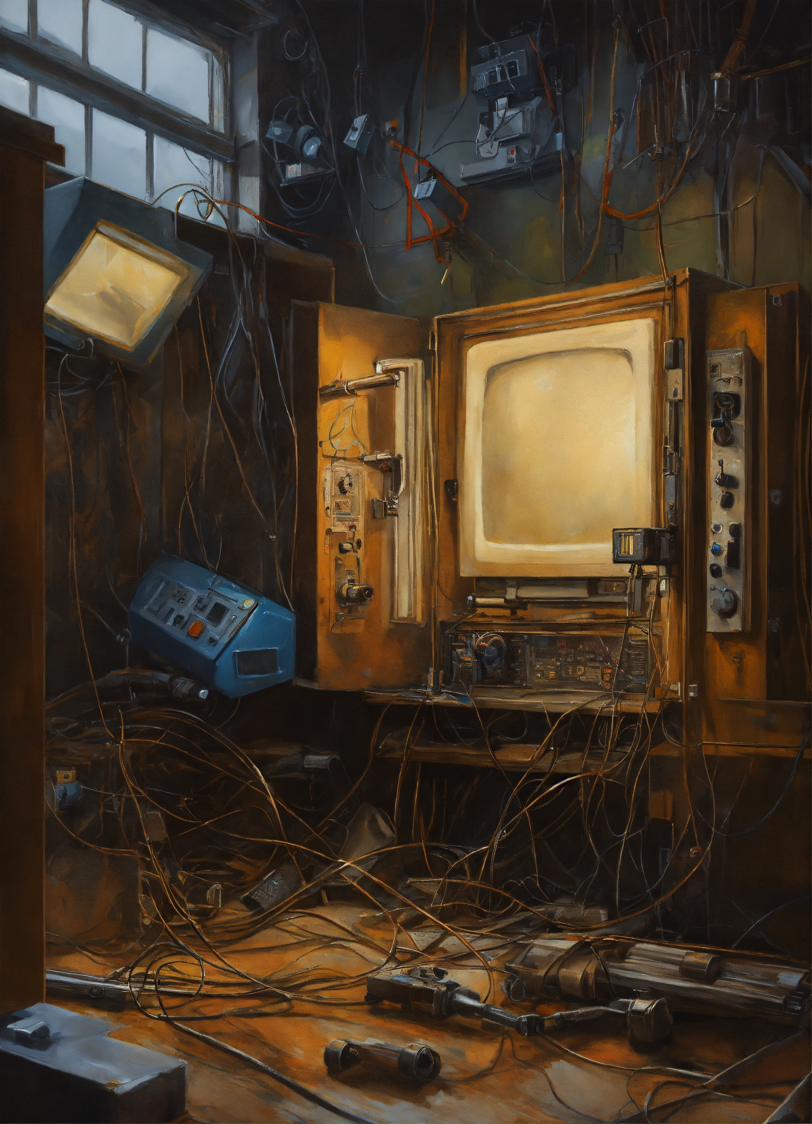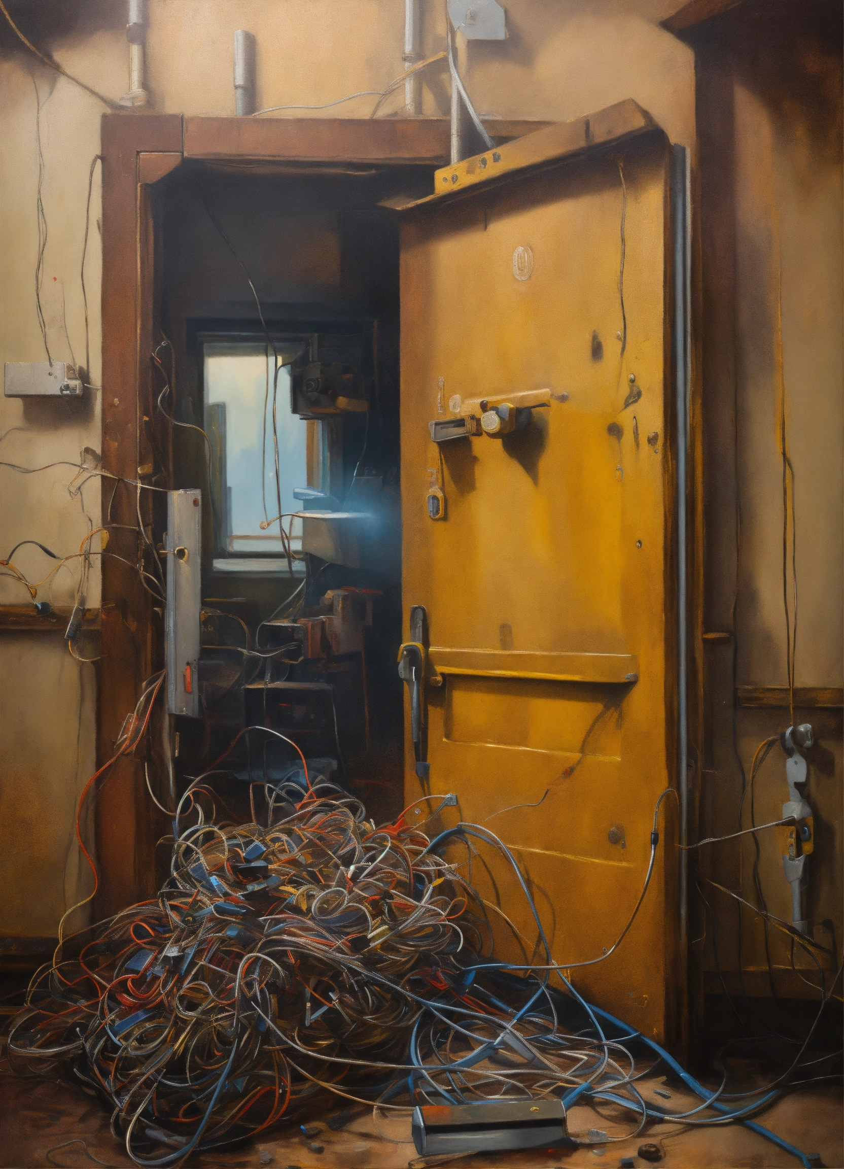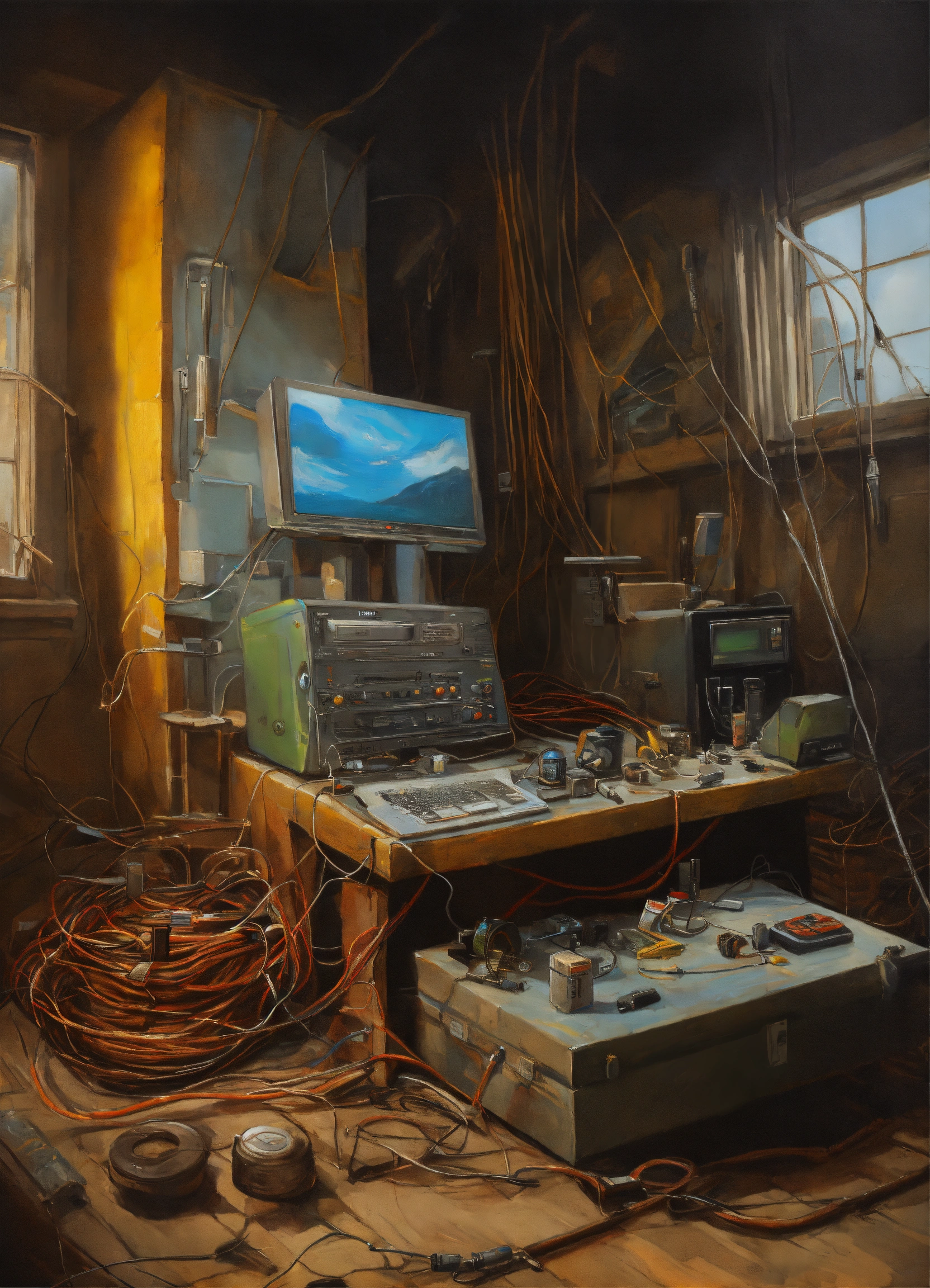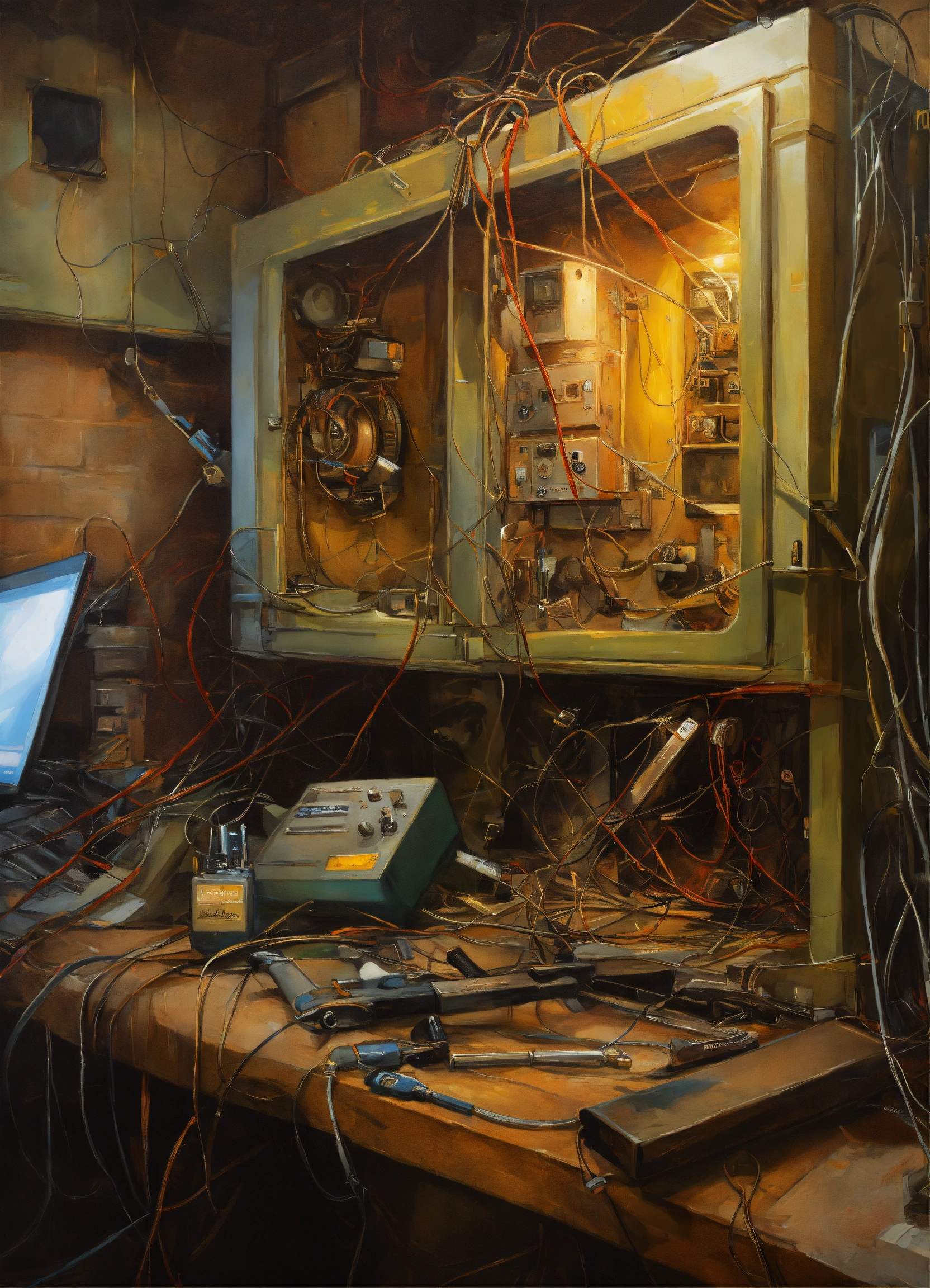 High tech breaking and entering tools with a lot of exposed wires in the background gritty hyper realistic oil painting style
