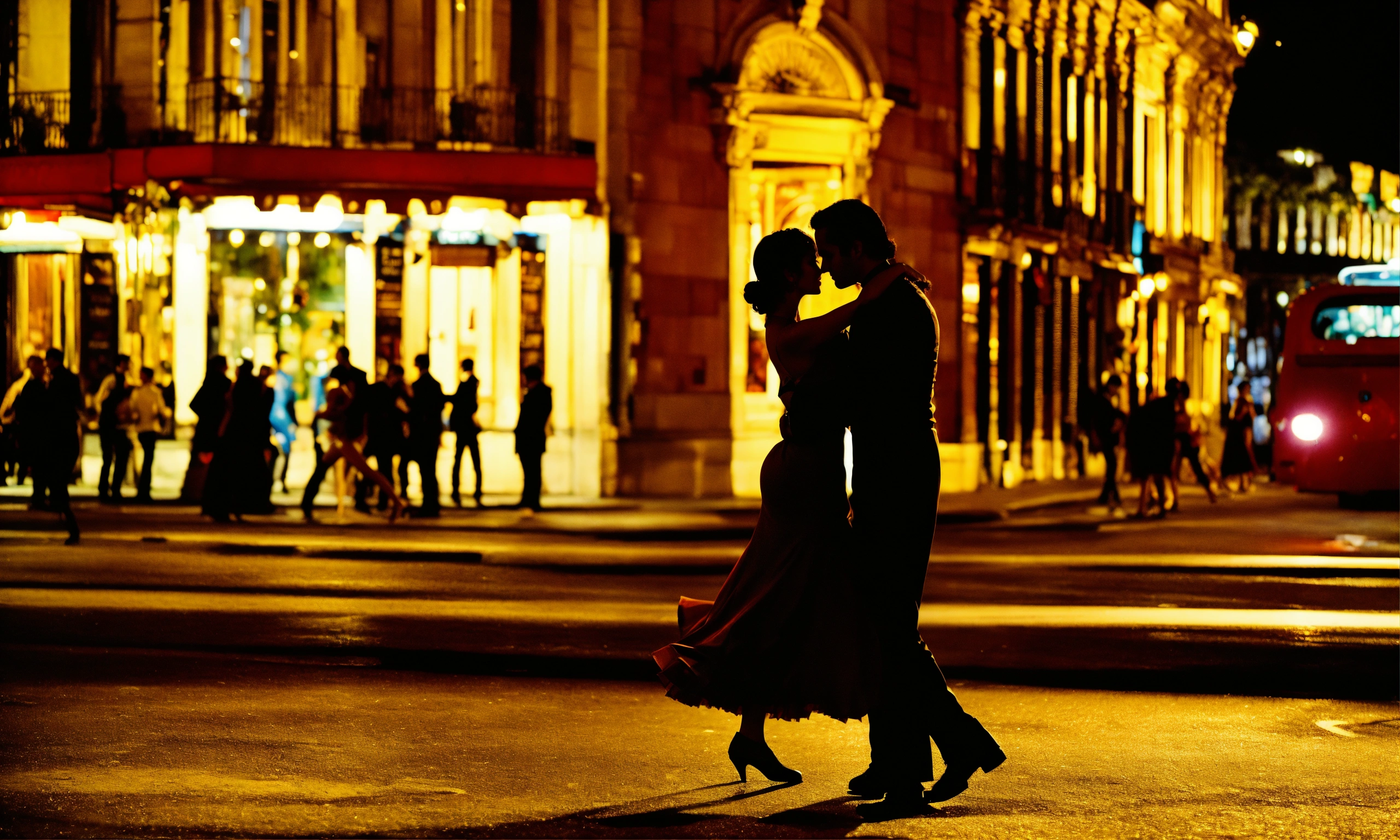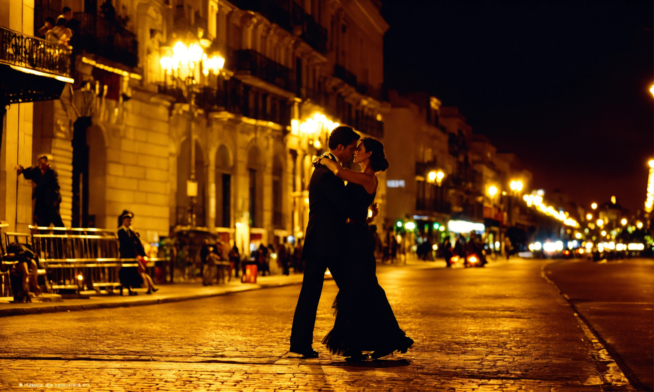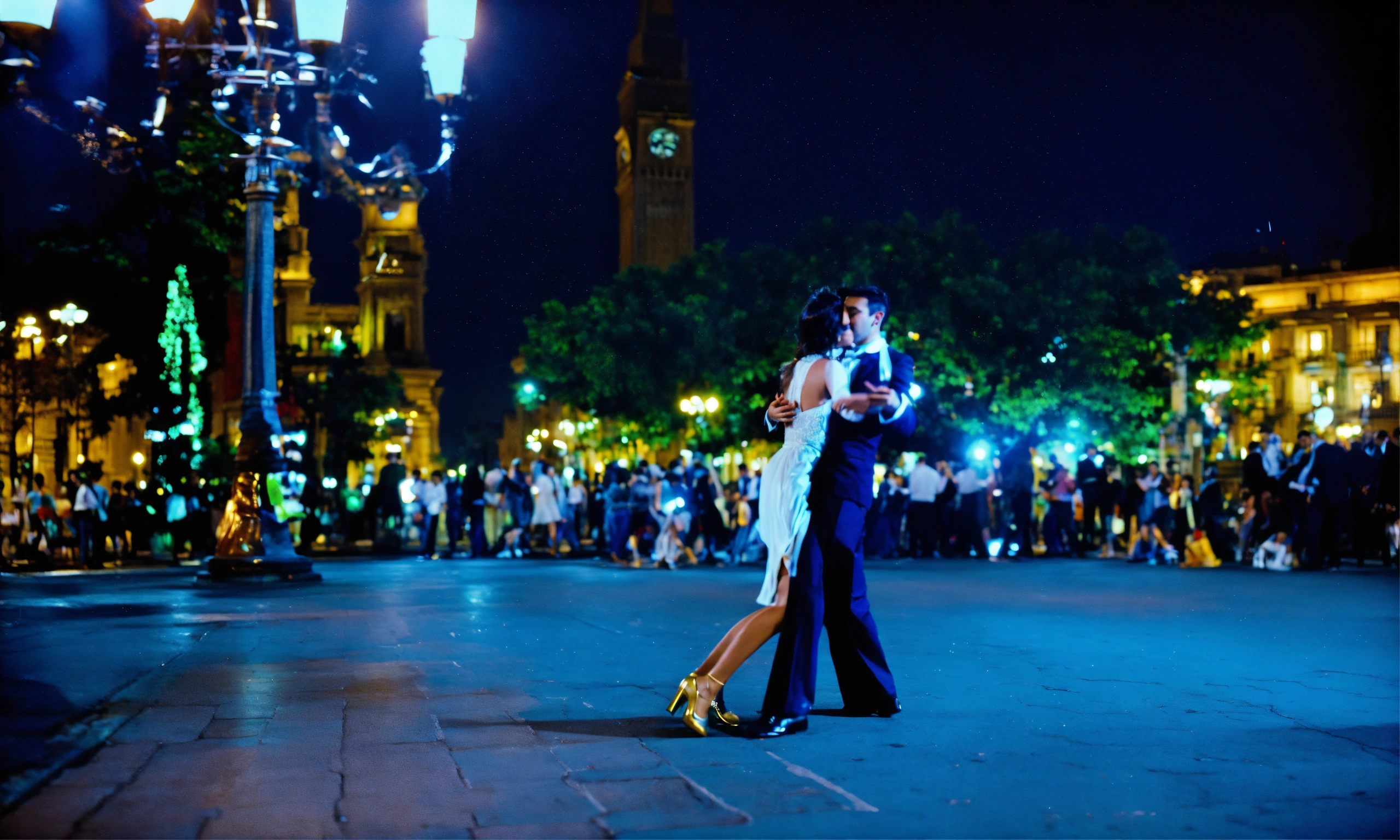 Dos esqueletos bailando tango en la calle, ciudad de buenos aires, en la noche, obelisco, portra 400, vintage photo