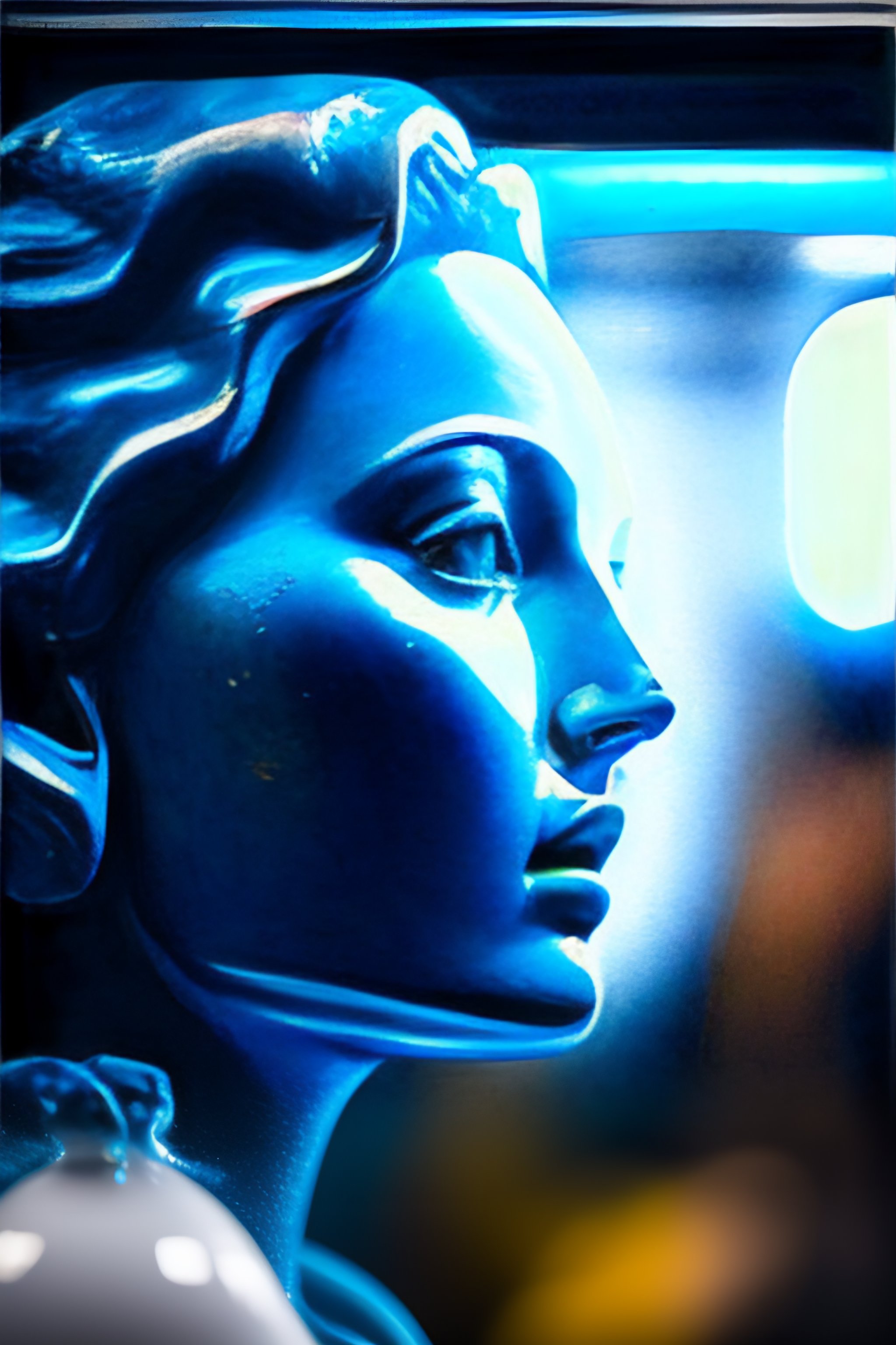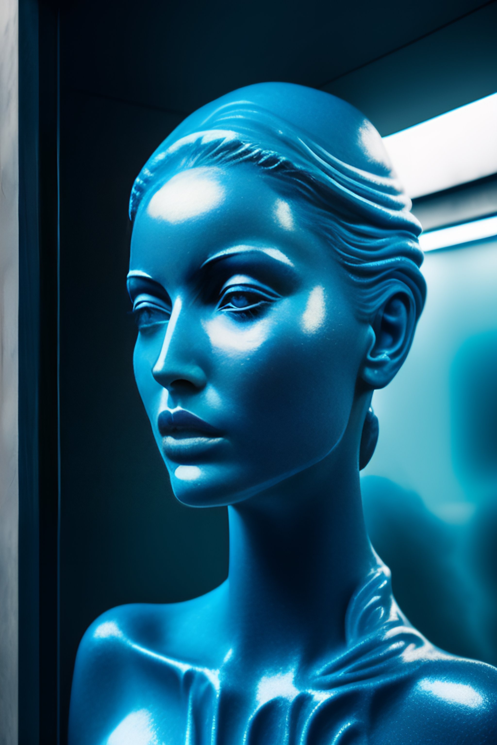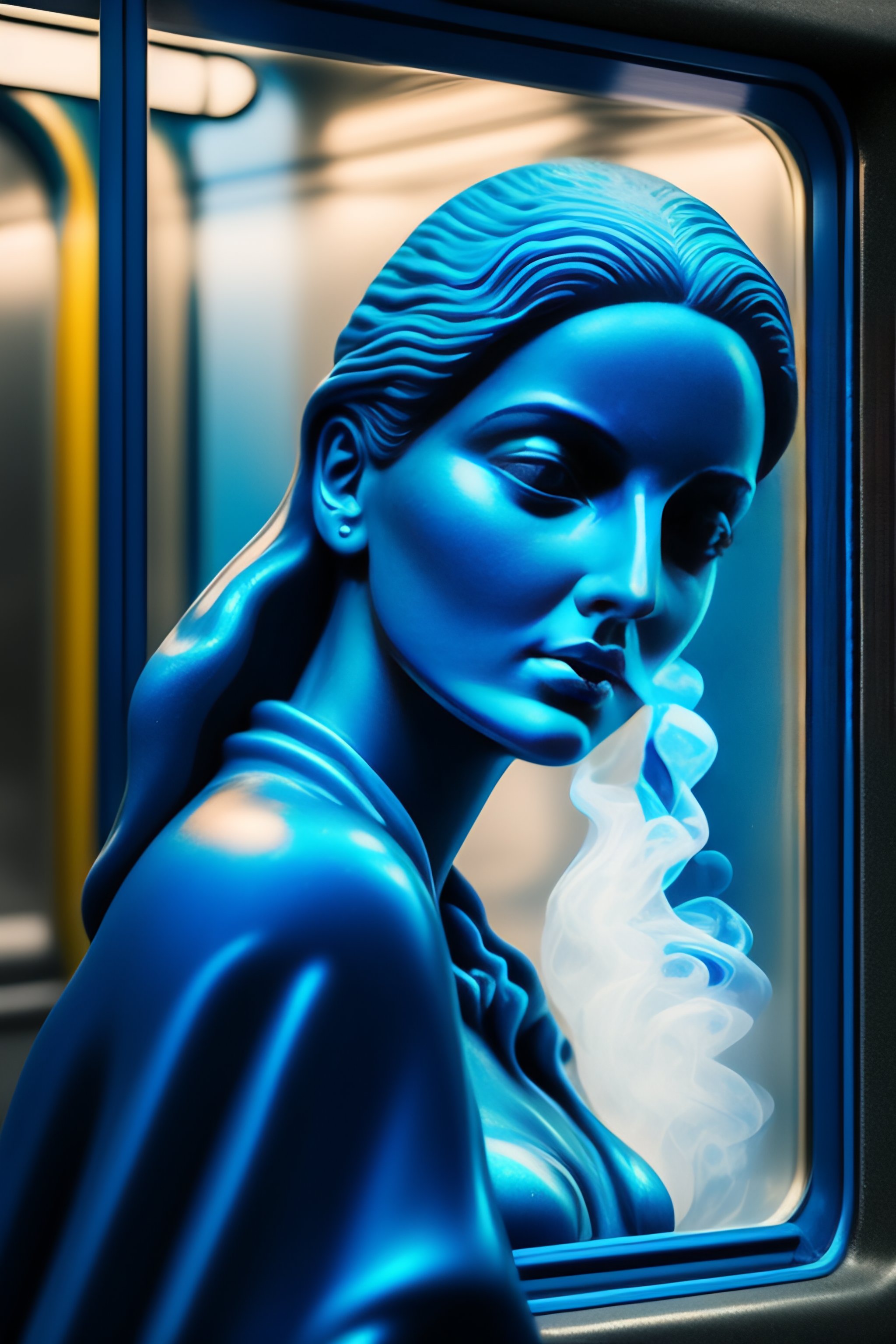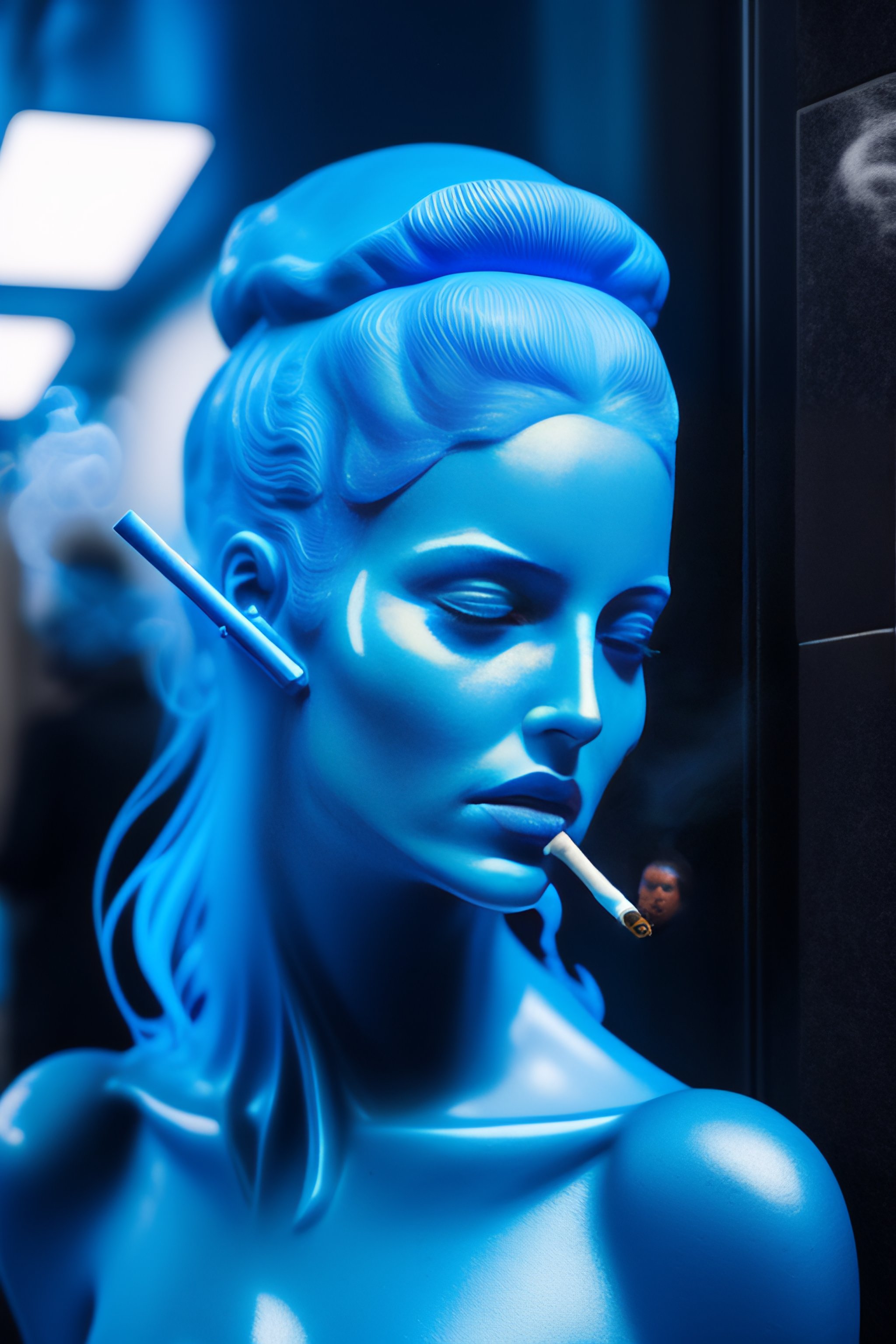 Face of a alien woman in texture blue glass statue smoking a cigarette