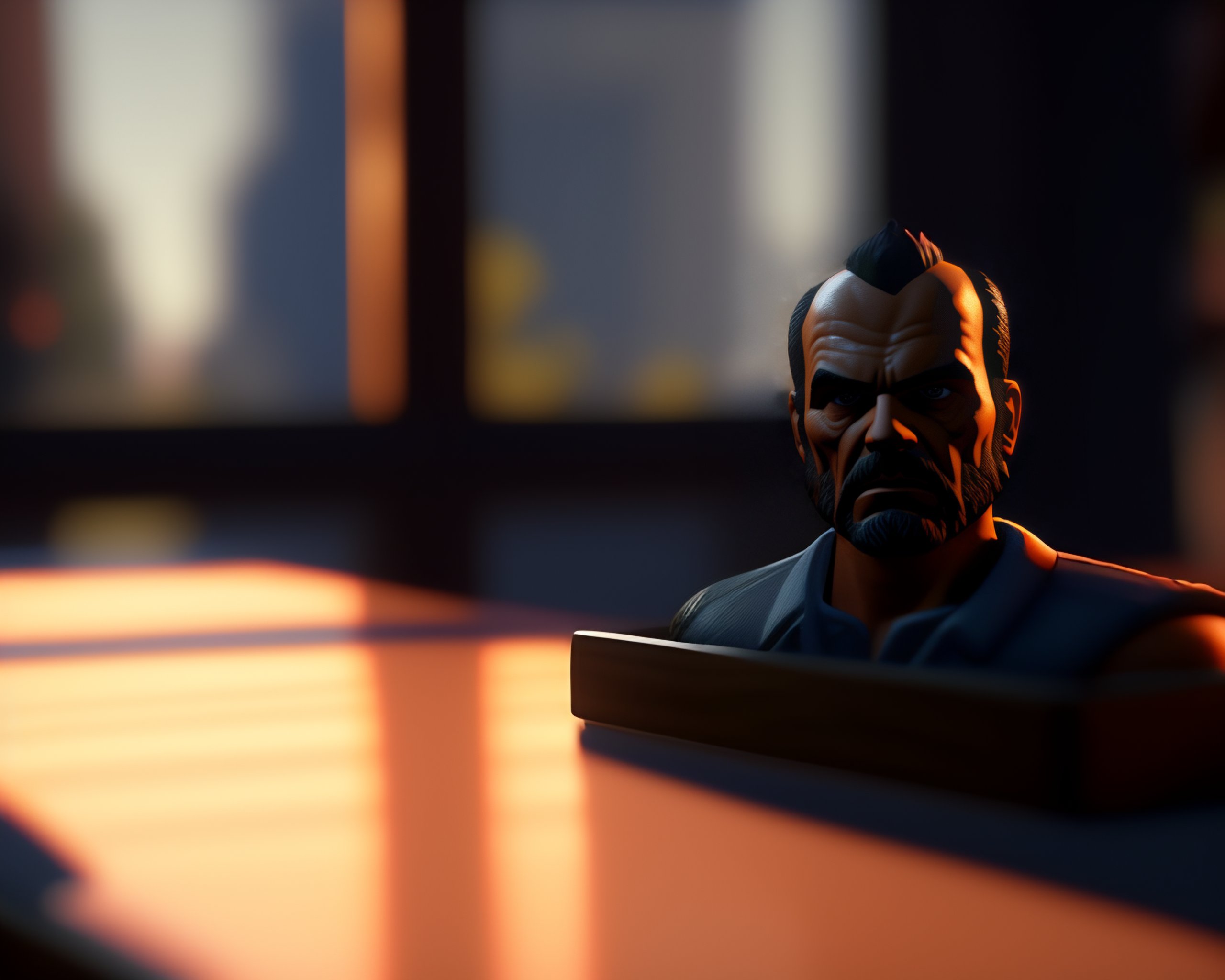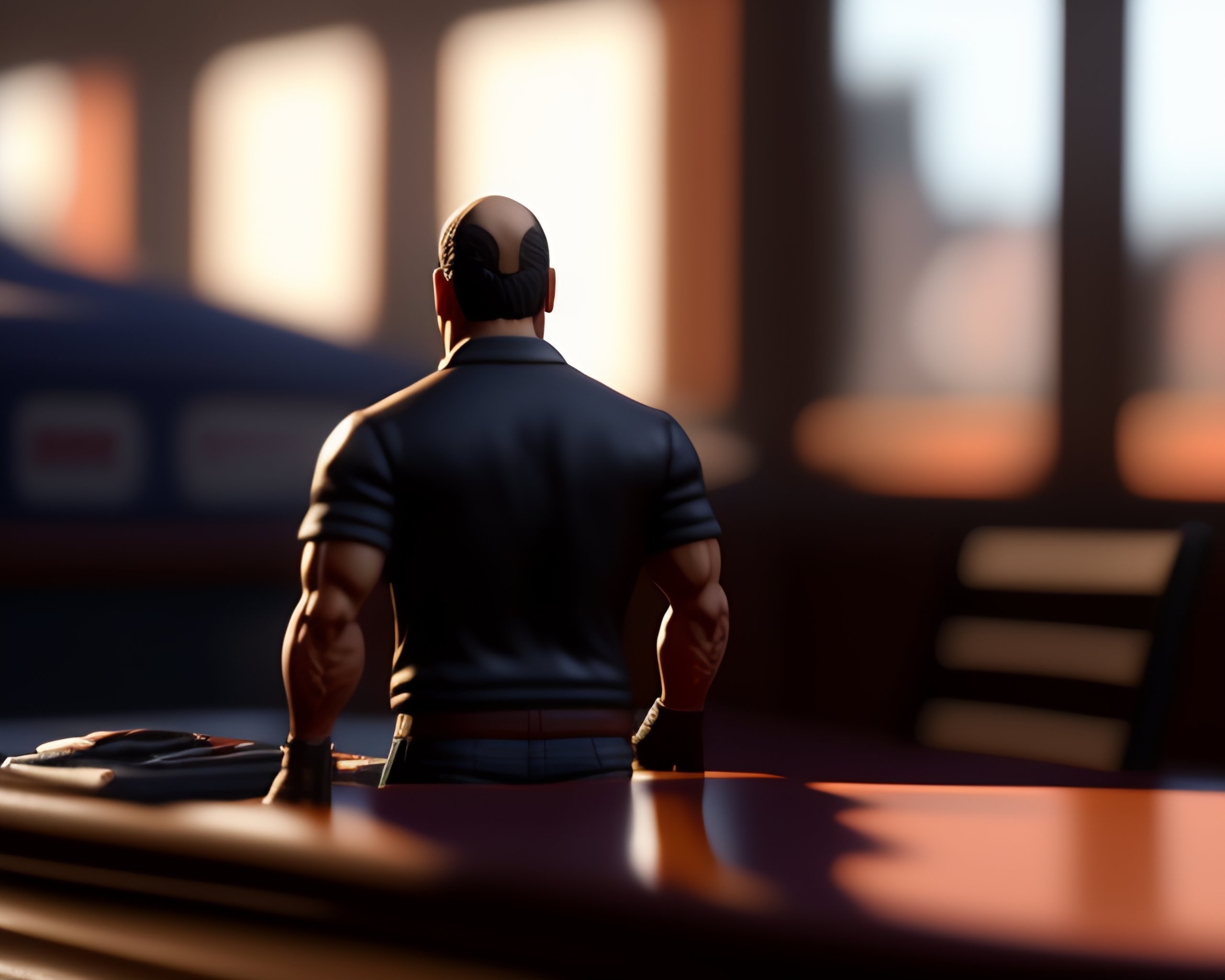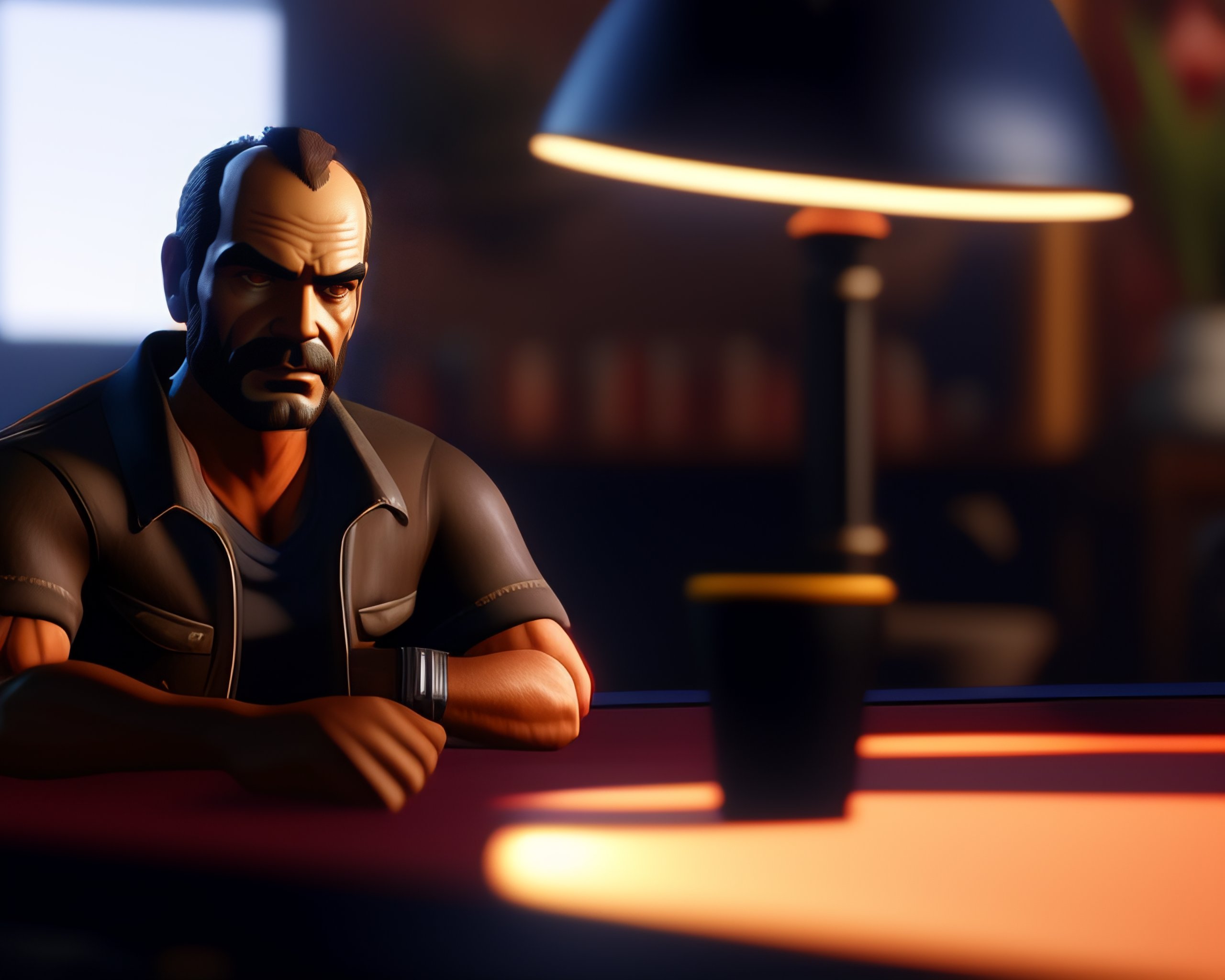 Action figure toy of trevor philips on a table, fov 200, gta v screenshot, high quality interior, lens flare