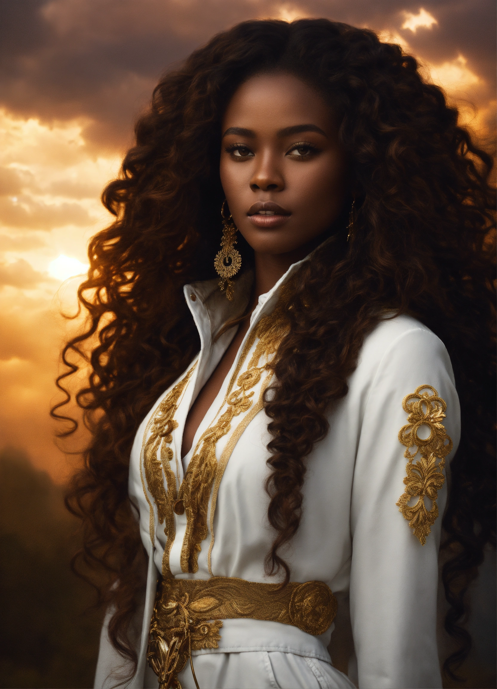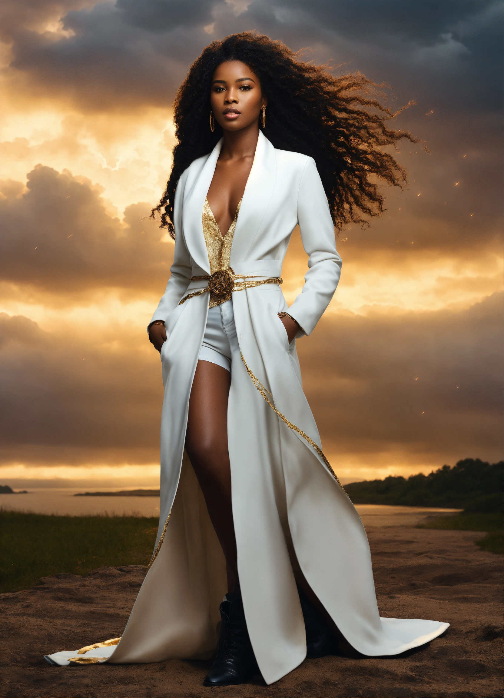 Full body beautiful black goddess with dark brown skin, beautiful gorgeous classy goddess black woman with dark brown skin, beautiful perfect face, shapely hour-glass figure long flowing braided hair, fully clothed in a stylish long white coat white blouse and black jeans and boots, she's floating in the sky with gold lightning and dark clouds behind her, high detail, realistic photo, high detail, digital painting, cinematic, stunning, hyper-realistic, sharp focus, high resolution 8k, insanely detailed