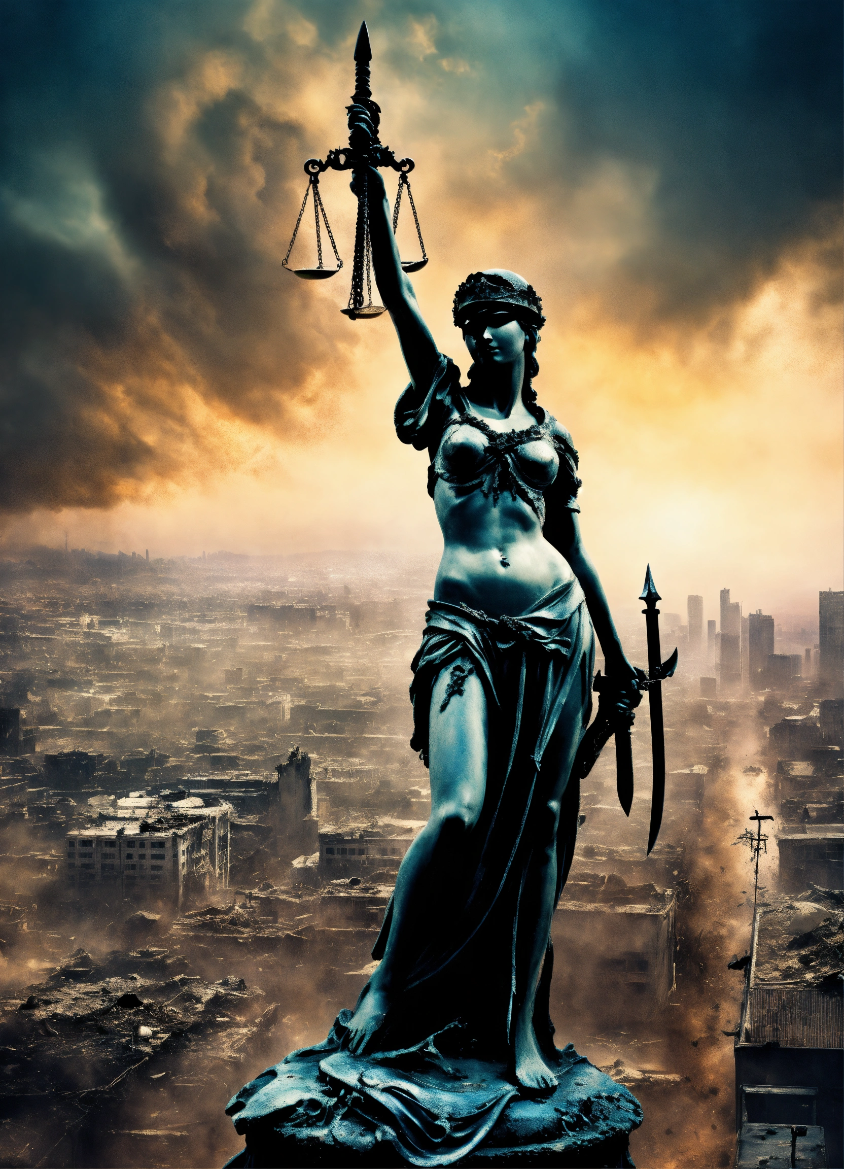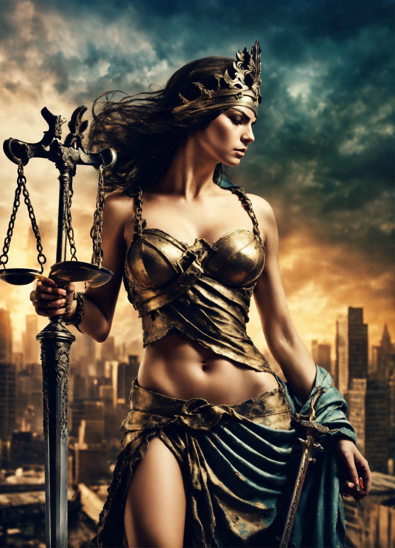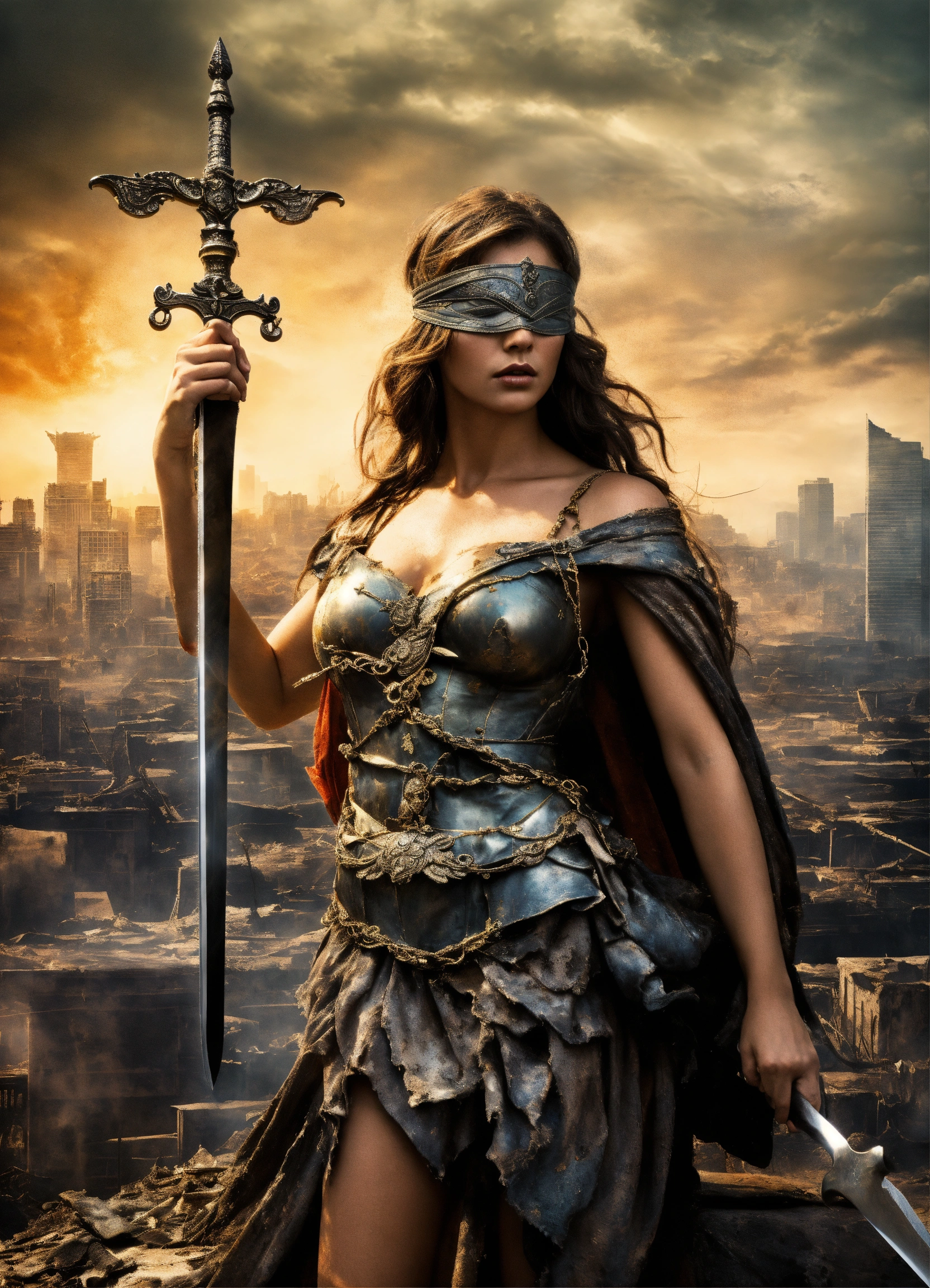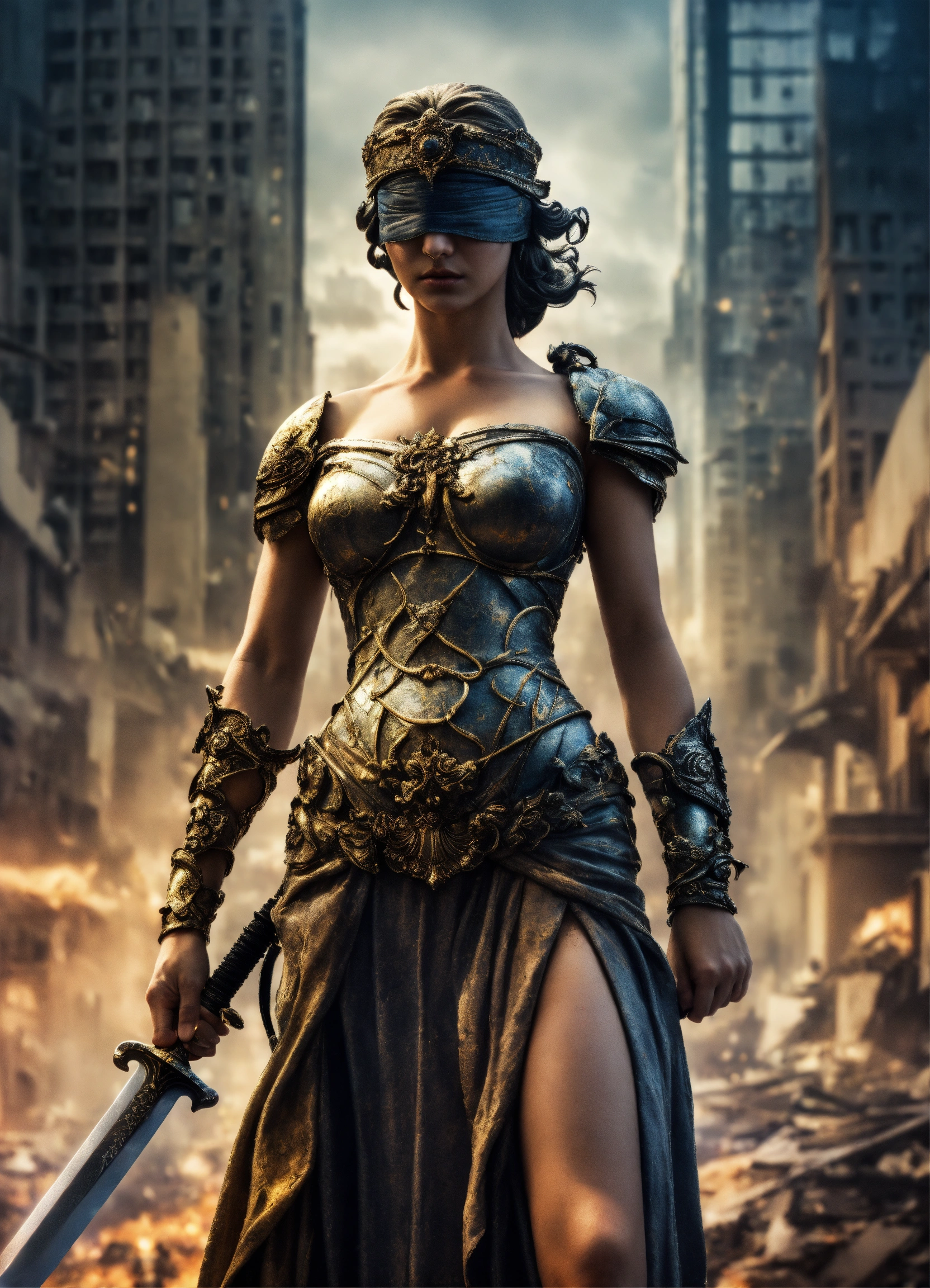 Beautiful, lady justice with blindfold, scales of justice, sword of truth, close up face, sword in hand, scales in hand, apocalyptic, tattered, ruined, city scape background, dramatic, close up, from waist up