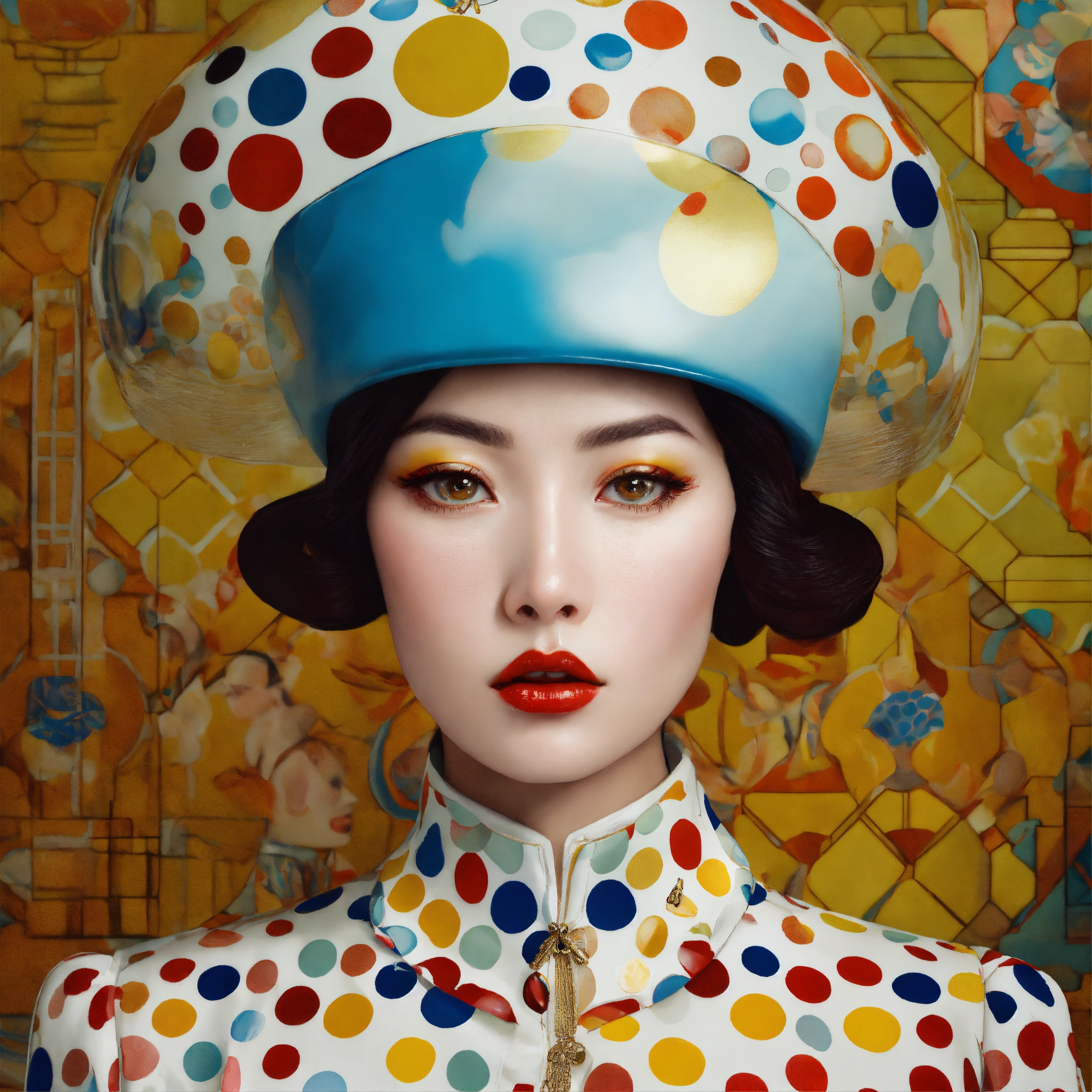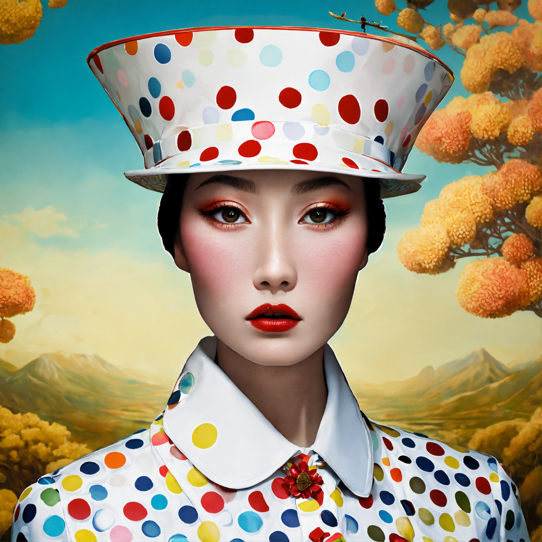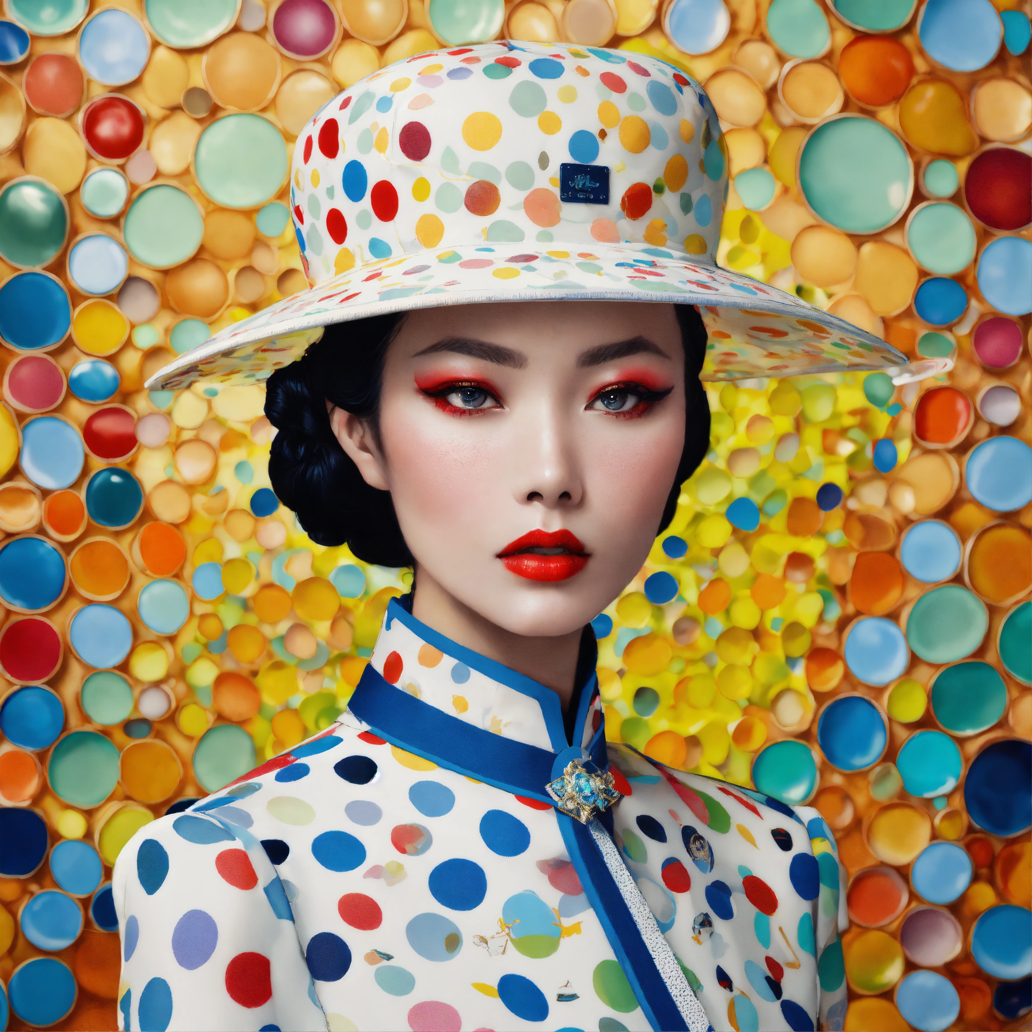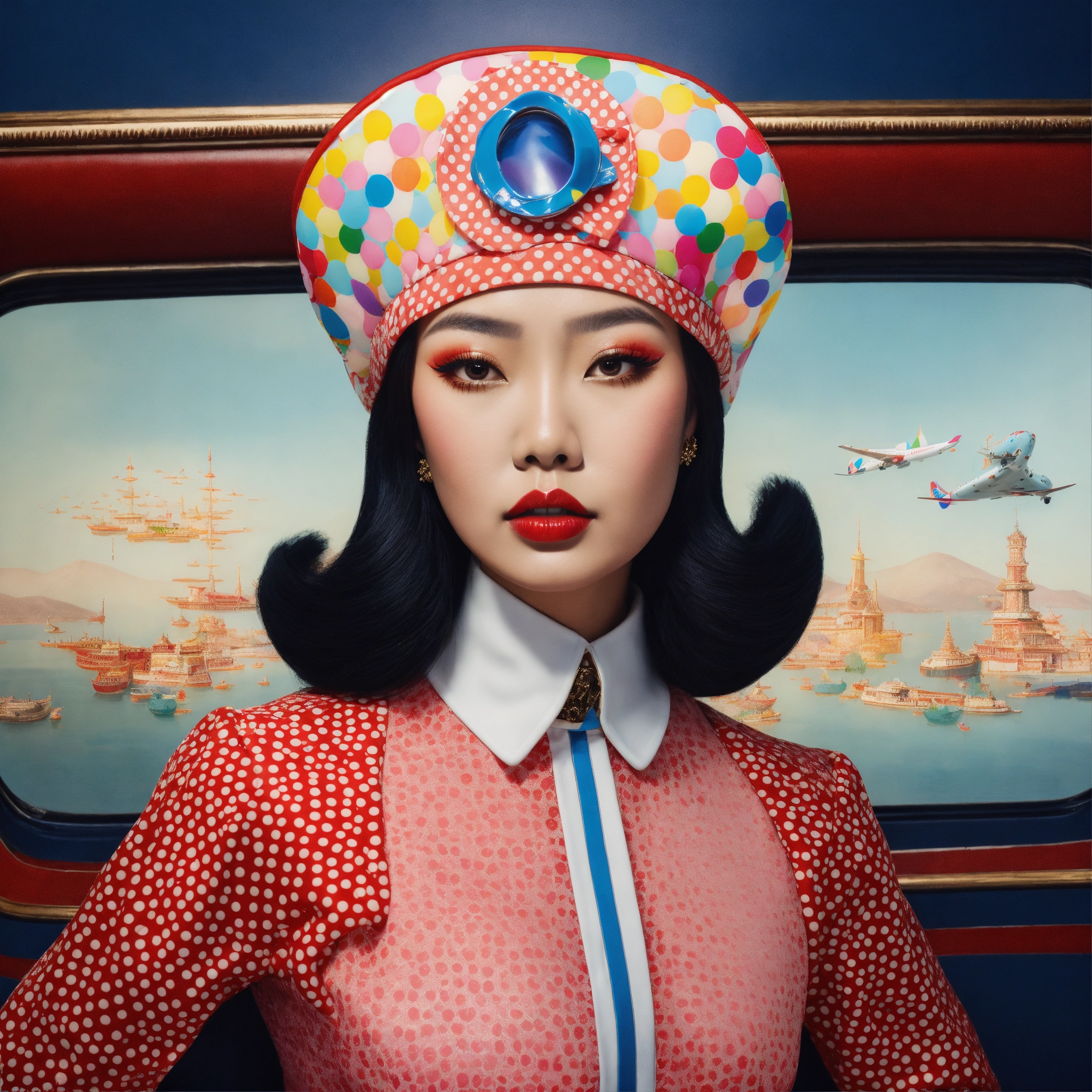 Front detailed portrait photography, transparent porcelain printed with multicolor pop polka dots, pop courreges air hostess asian woman with a kepi, an attractive, 80 degree view, art by sergio lopez, natalie shau, james jean and salvador dali