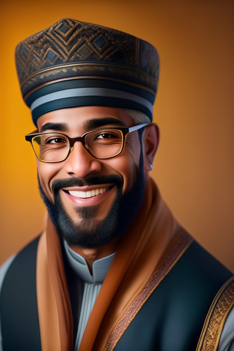 An image of a muslim uncle with a friendly and kind expression on his face. he has a well-groomed beard and is wearing a traditional islamic cap, such as a kufi or a taqiyah, on his head. he is dressed in modest attire, like a kurta or a thobe, and may be wearing a pair of glasses. the image showcases his warm smile, and his eyes reflect wisdom and compassion.
