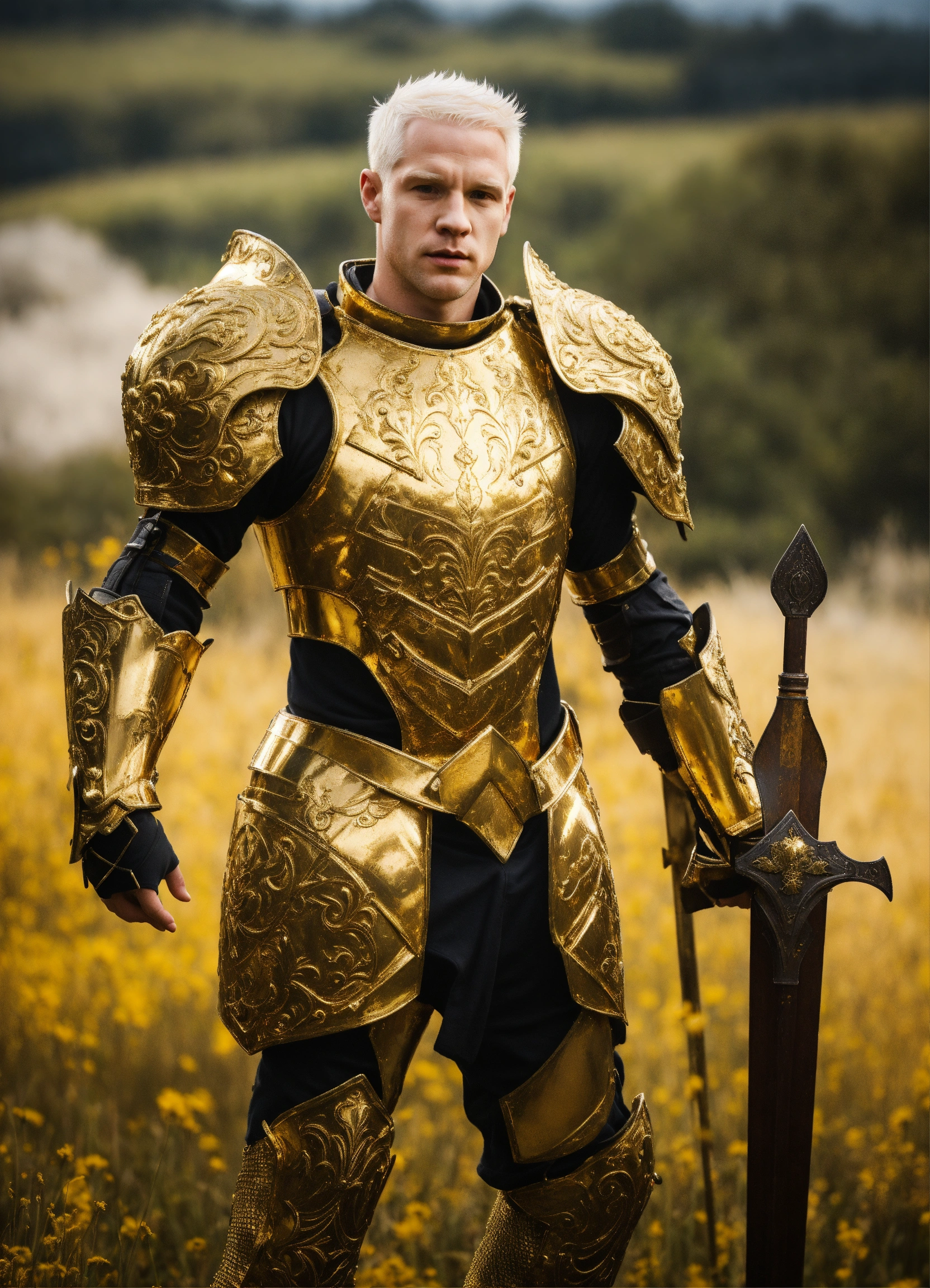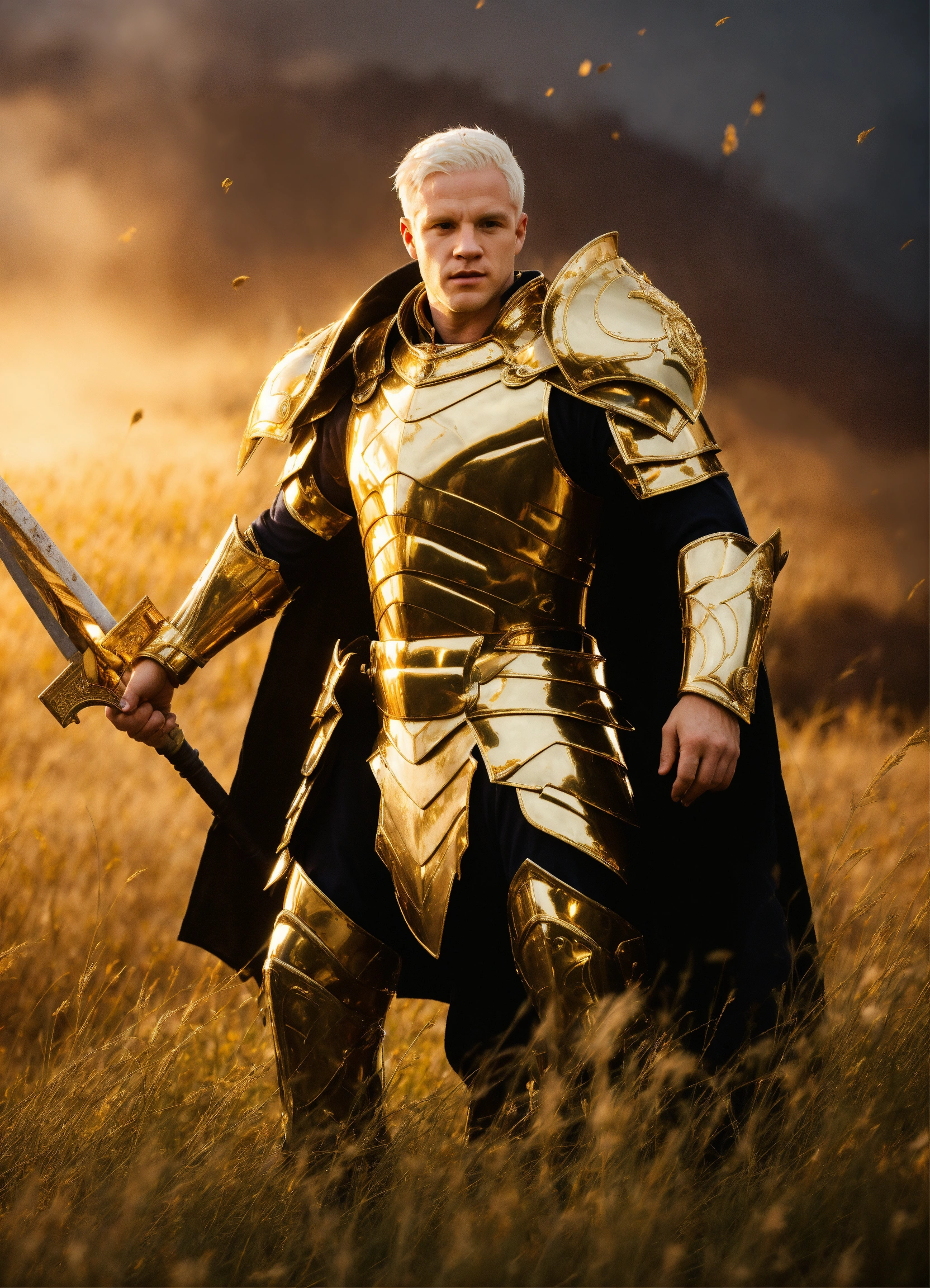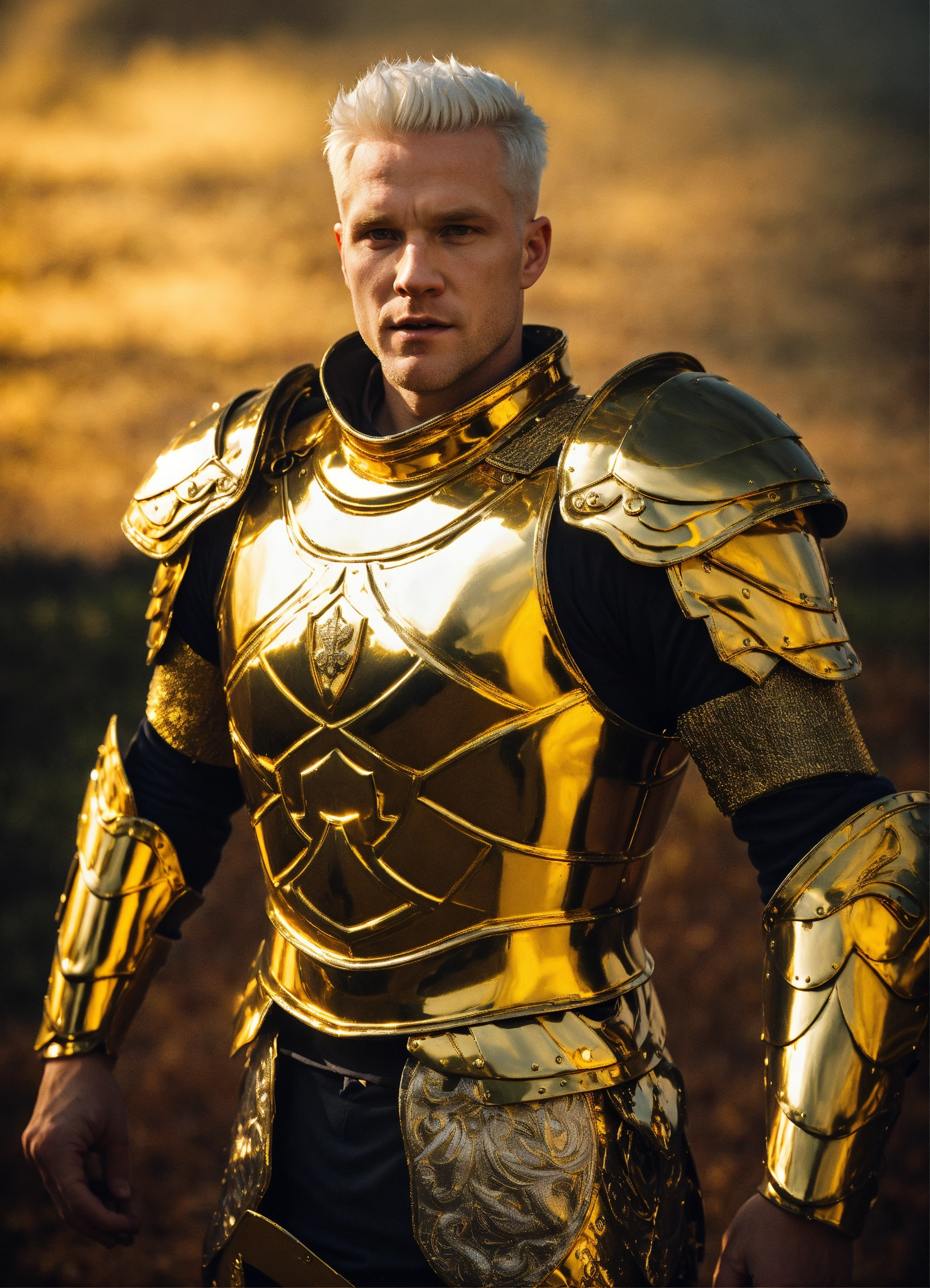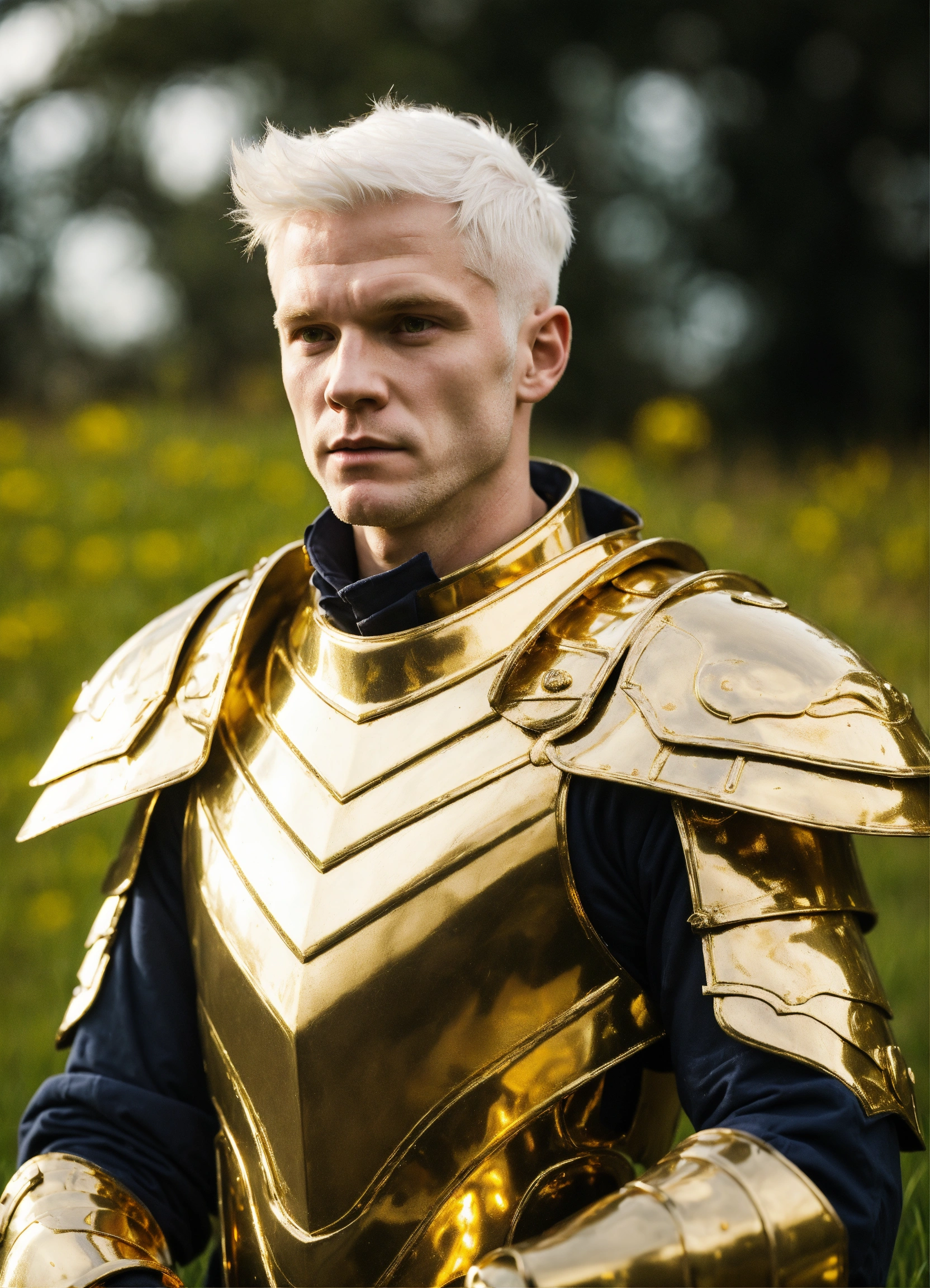 He is a gorgeous caucasian, 35-year-old albino man with short white hair and an athletic build. dressed in gold battle armor. in field with a menacing presence.