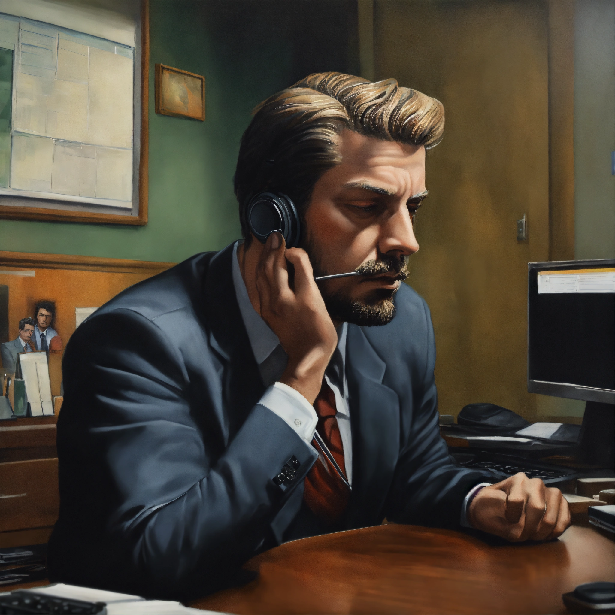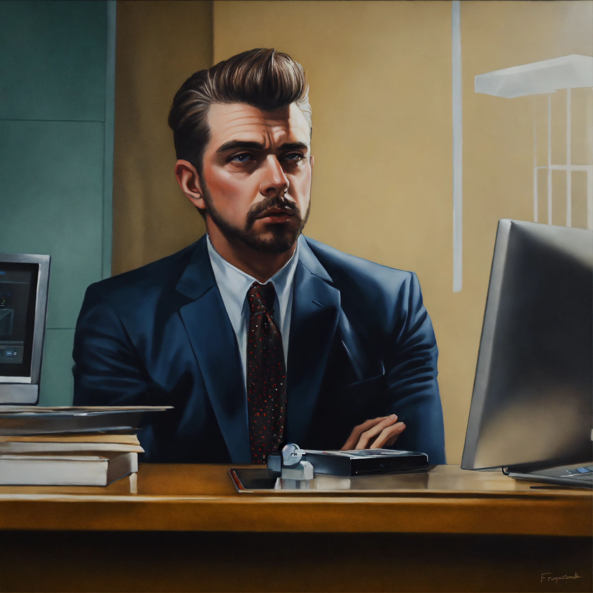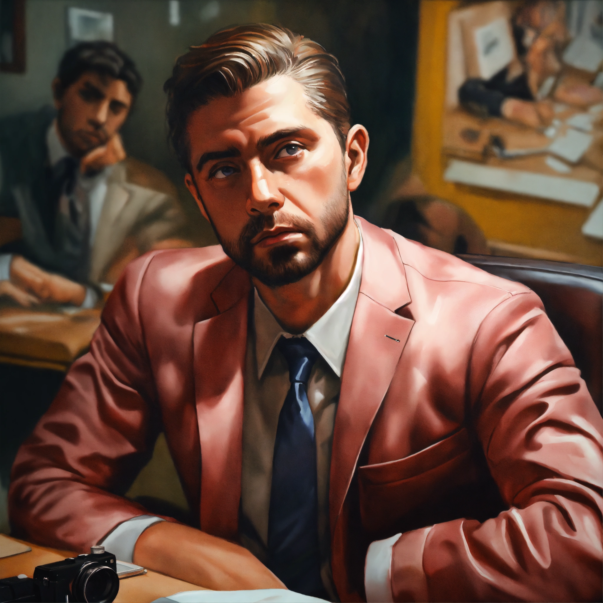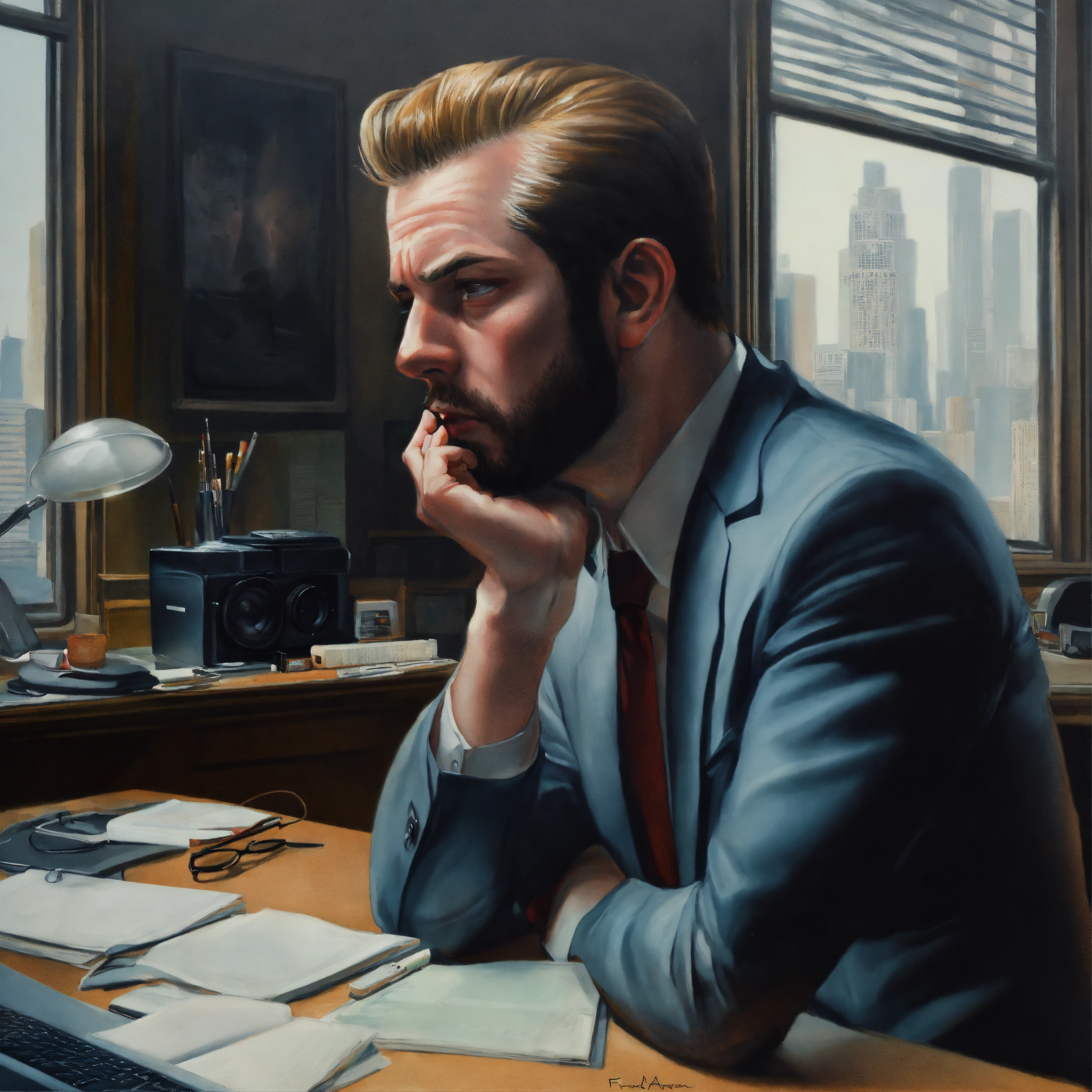Office, man shrugged, was seriously thinking about something, propped his cheek with his hand, face fronted. unreal engine, painted by francis bacon, surrealism, airbrush, stanley artgerm, very coherent, analog camera