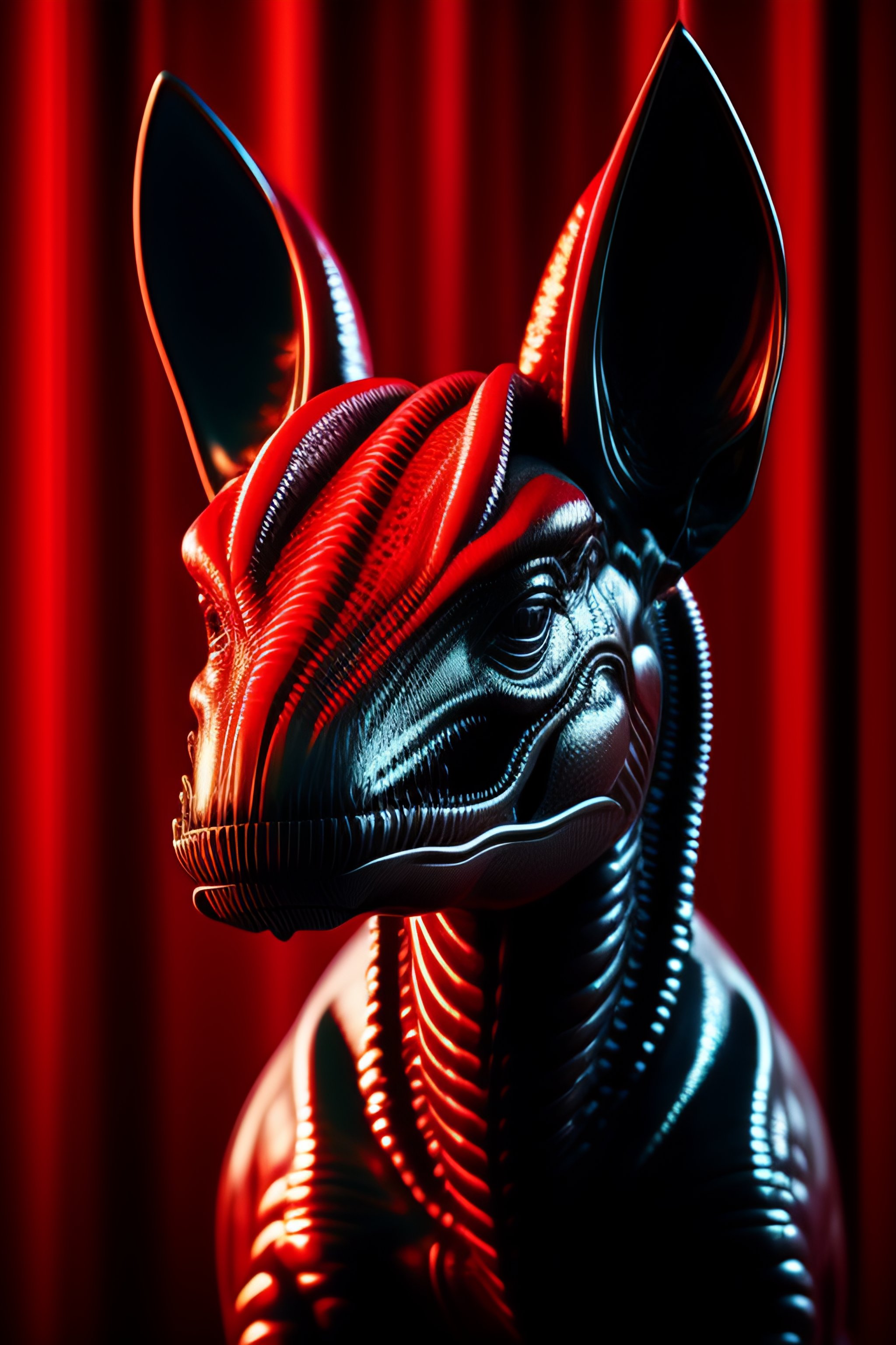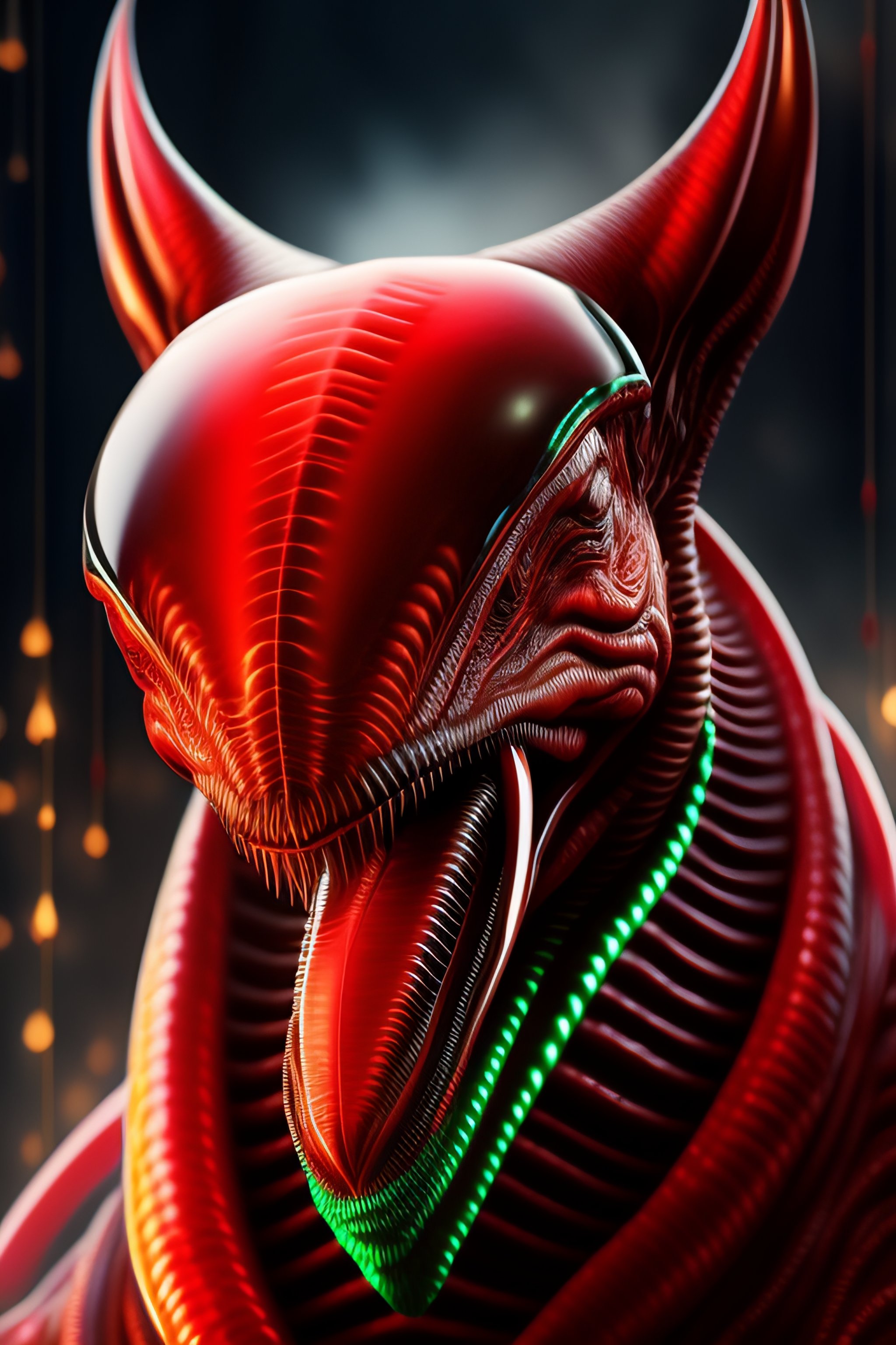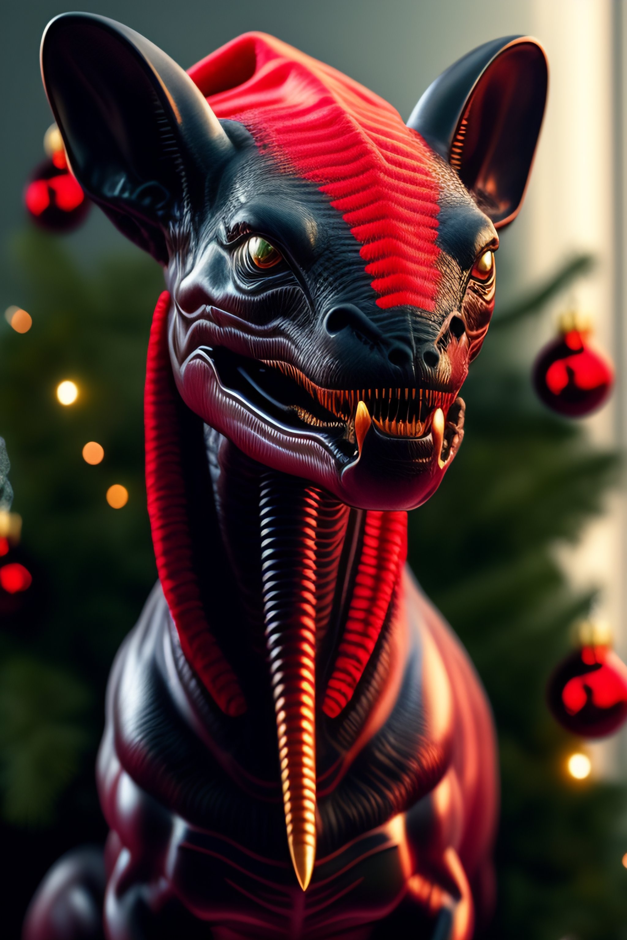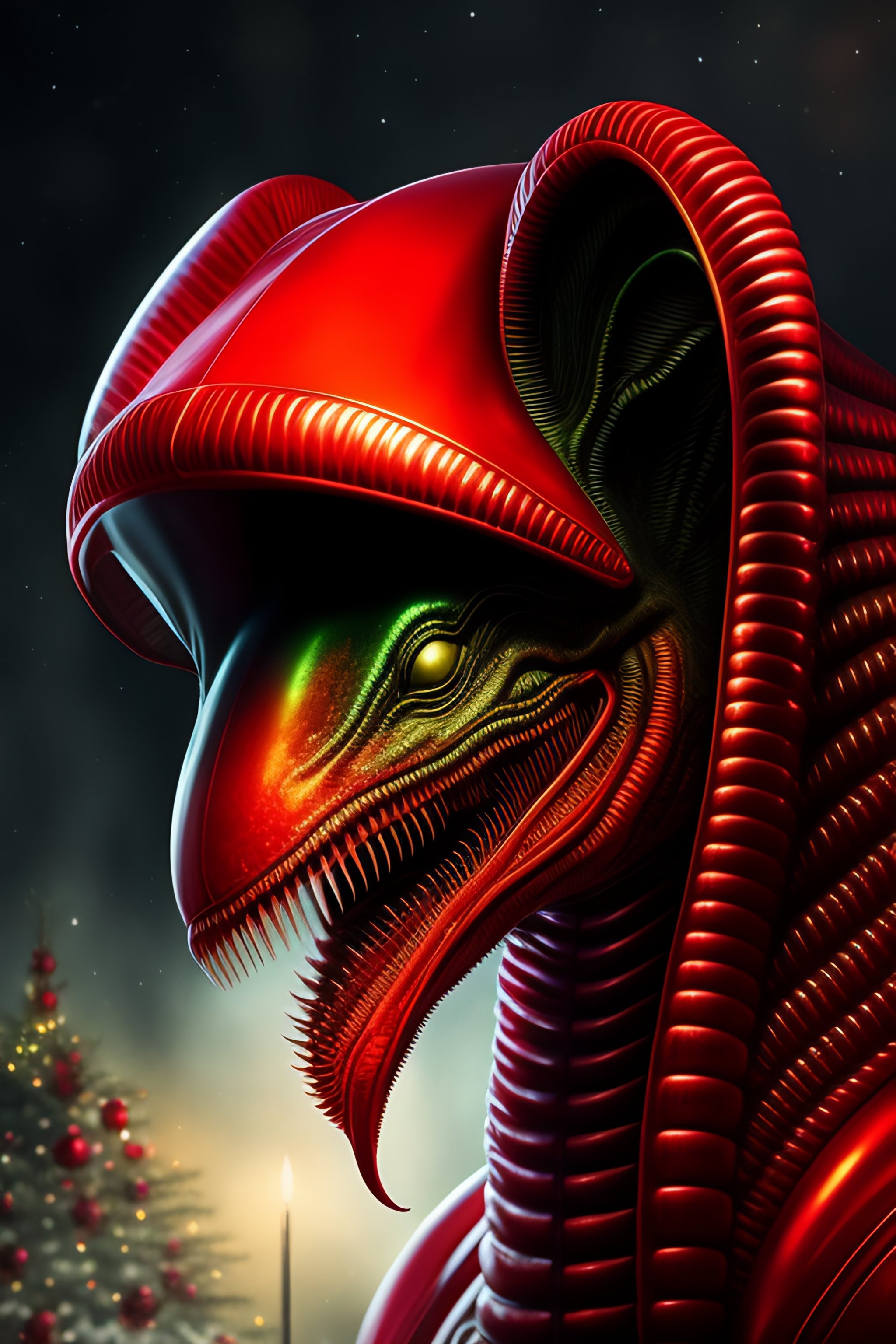 Alien xenomorph xx121 internecivus raptus detailed portrait, against the background of a christmas tree, in a red hat, a gift in its paws, an open mouth, a lot of sharp teeth, drooling from the mouth, a scary mouth