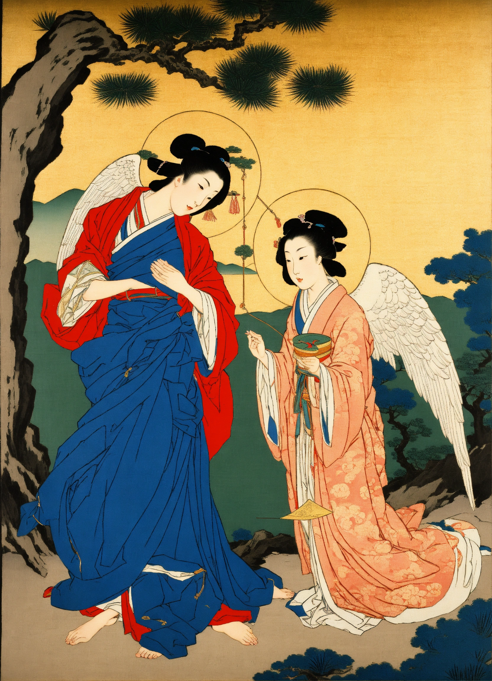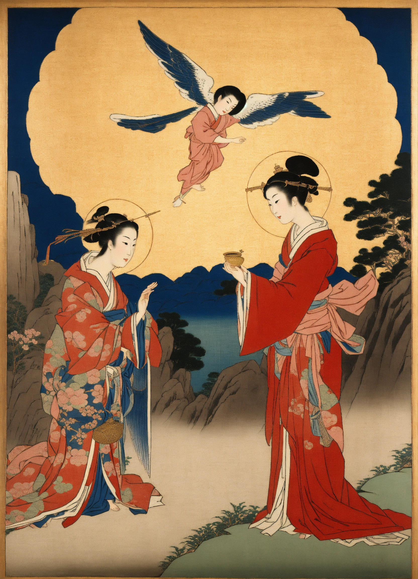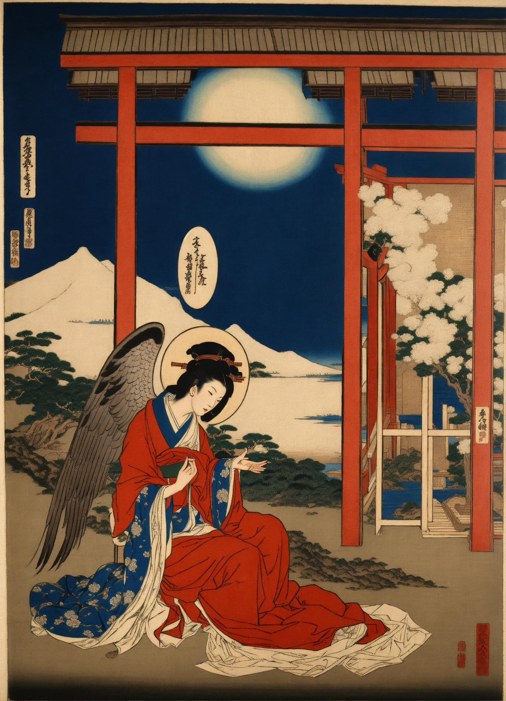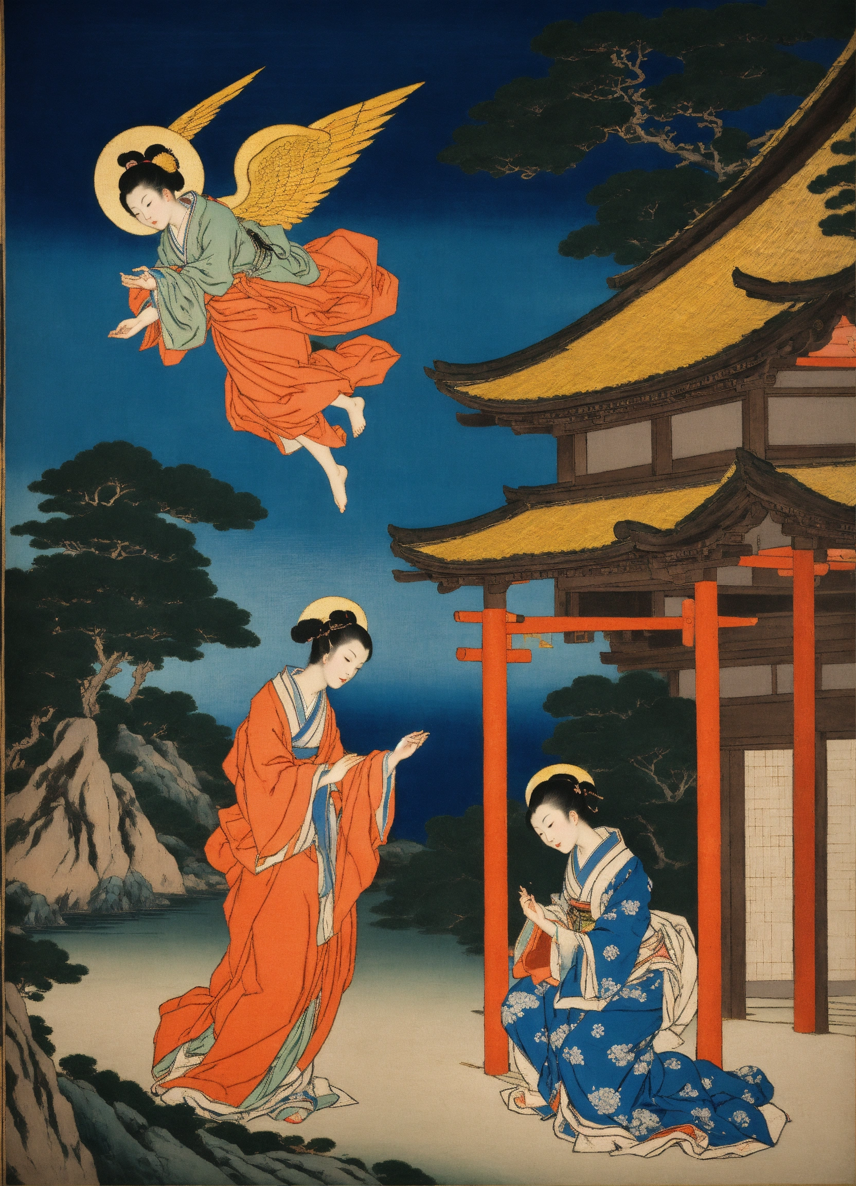 Edo period art depicting the annunciation of the lord to the virgin mary by the archangel gabriel, hokusai art, edo art, japanese art, vibrant color, woodblock print, asian, christian, gospel of luke, masterpiece, detailed scenery, the annunciation by el greco