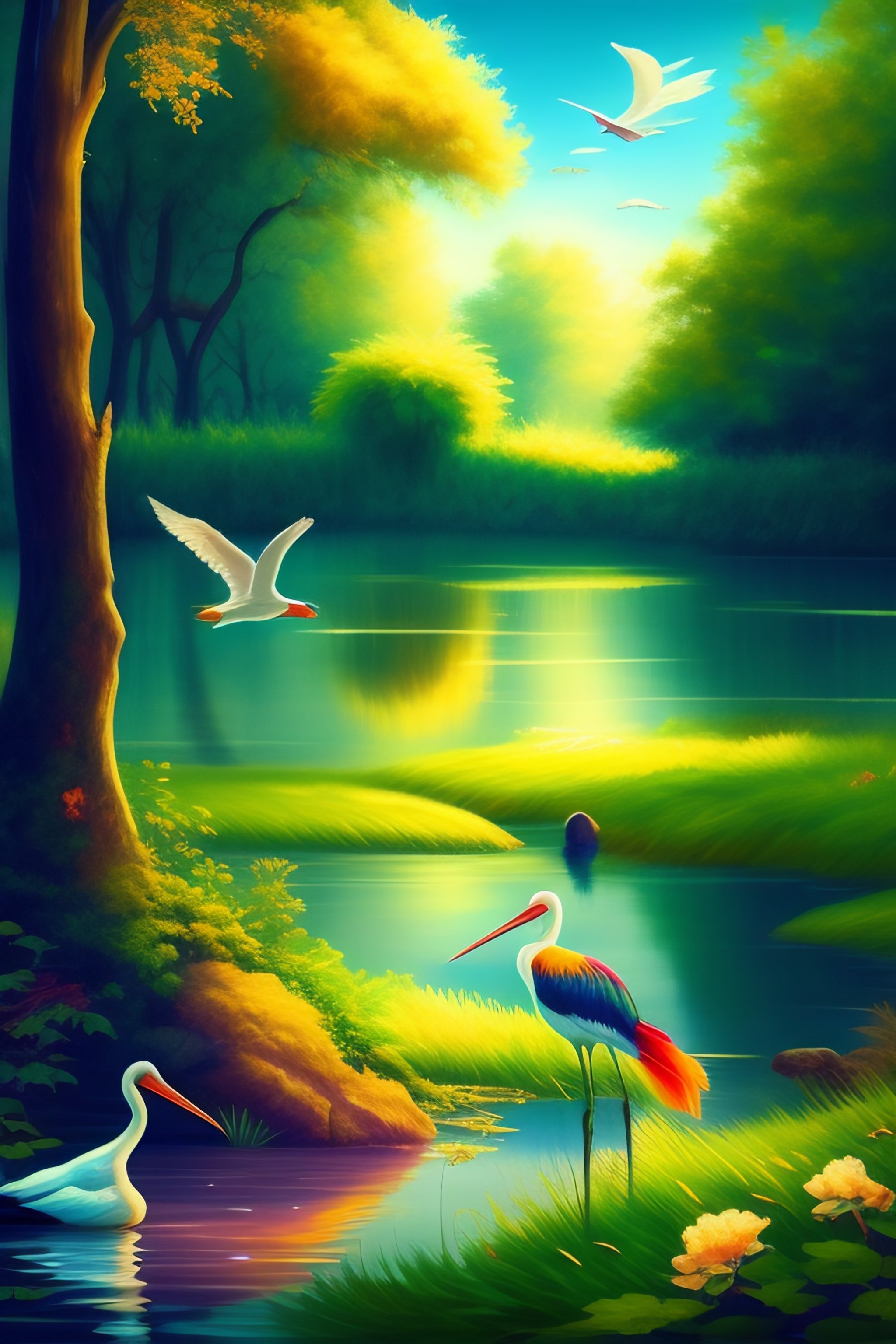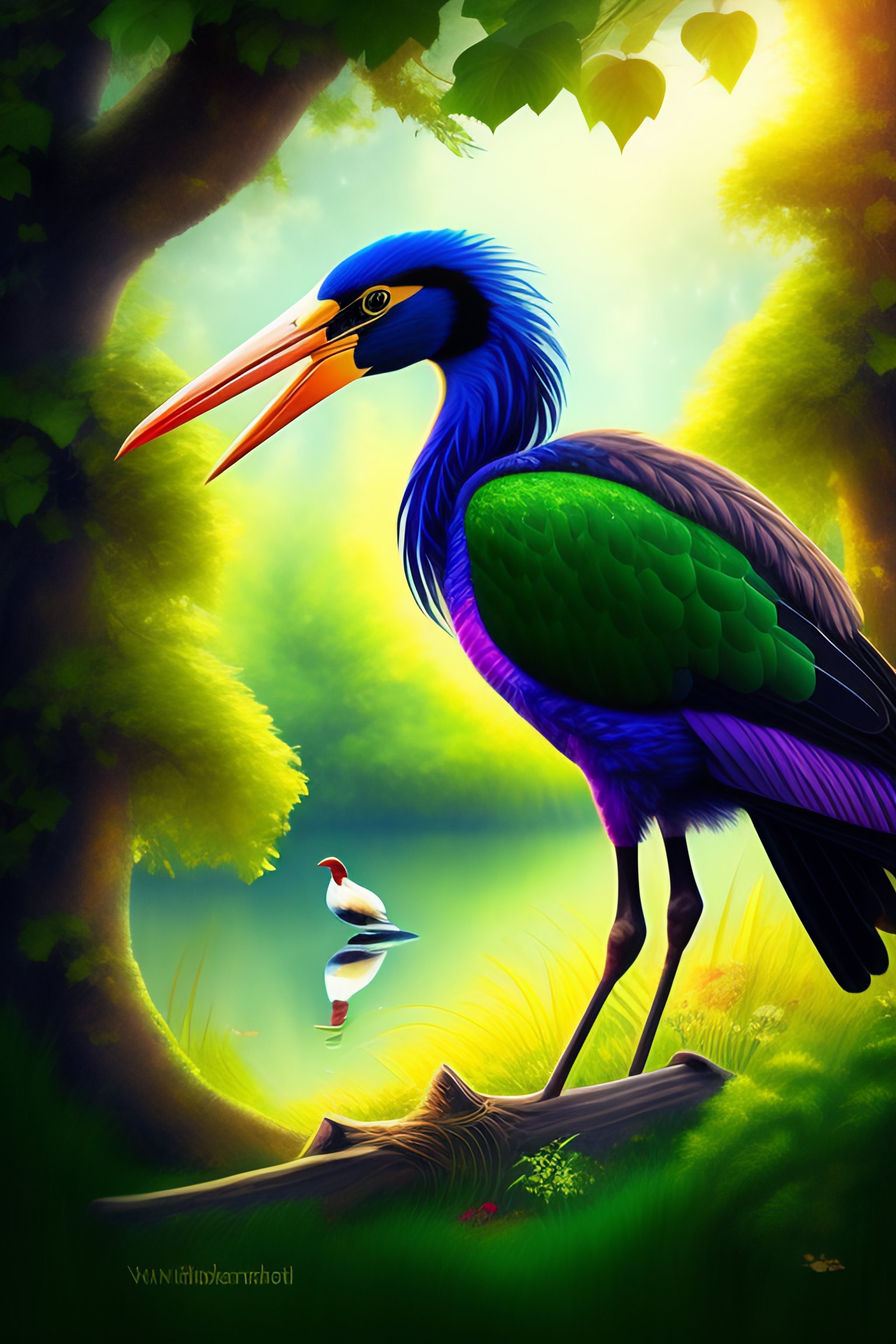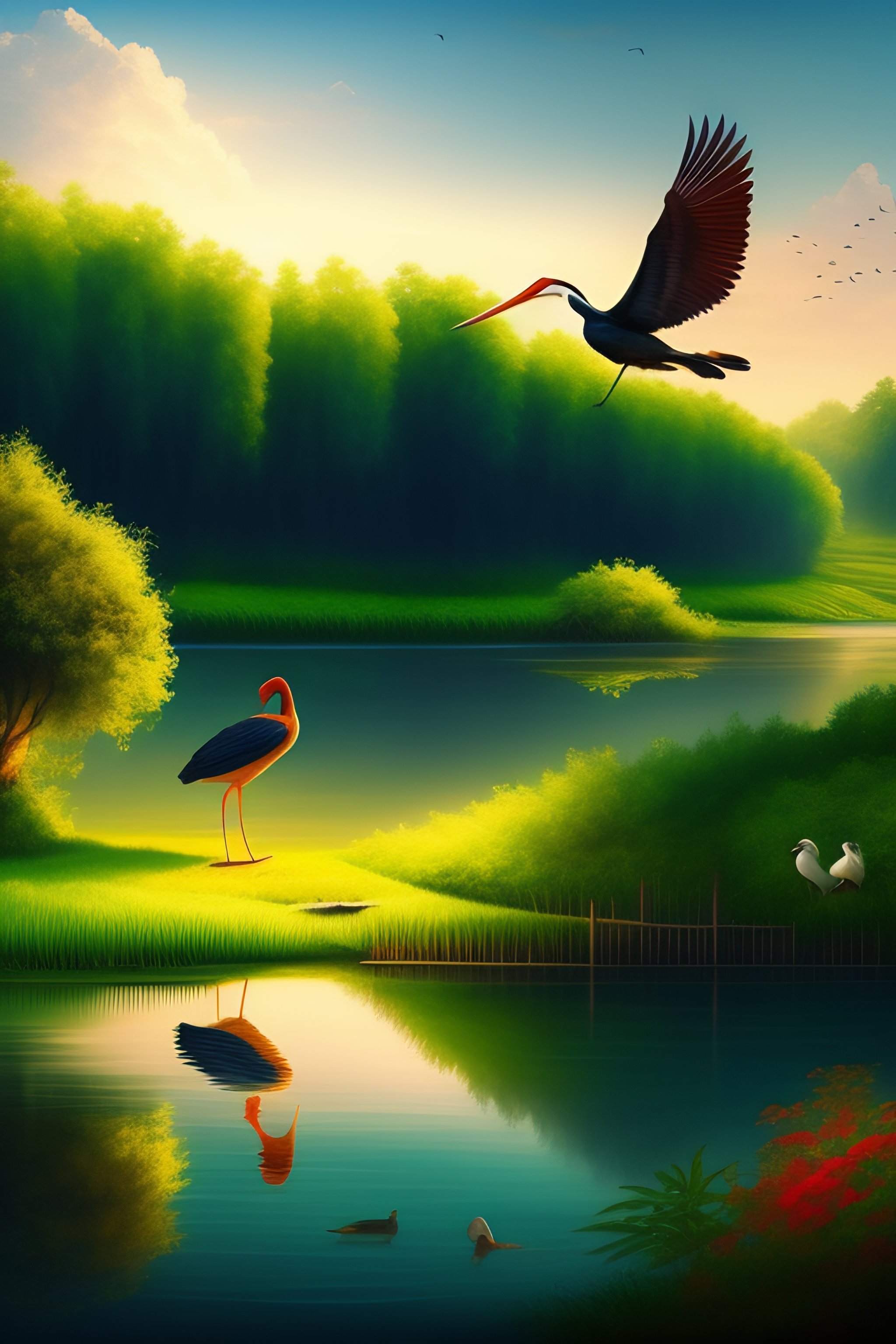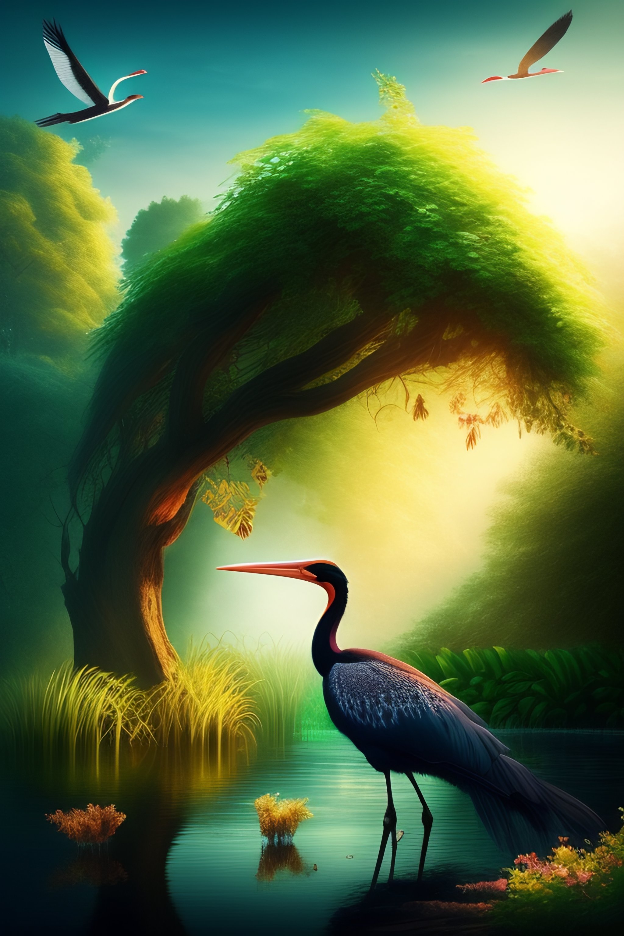 Phoenix, animals of the forest, vines, screams, wind breeze, green trees, stork by the pond, artistic