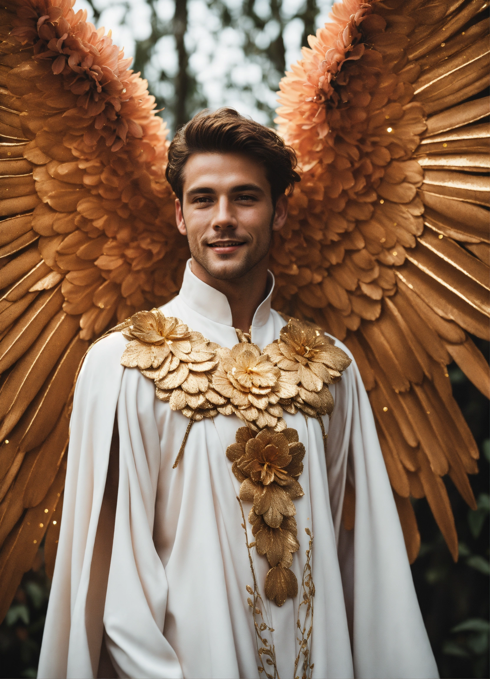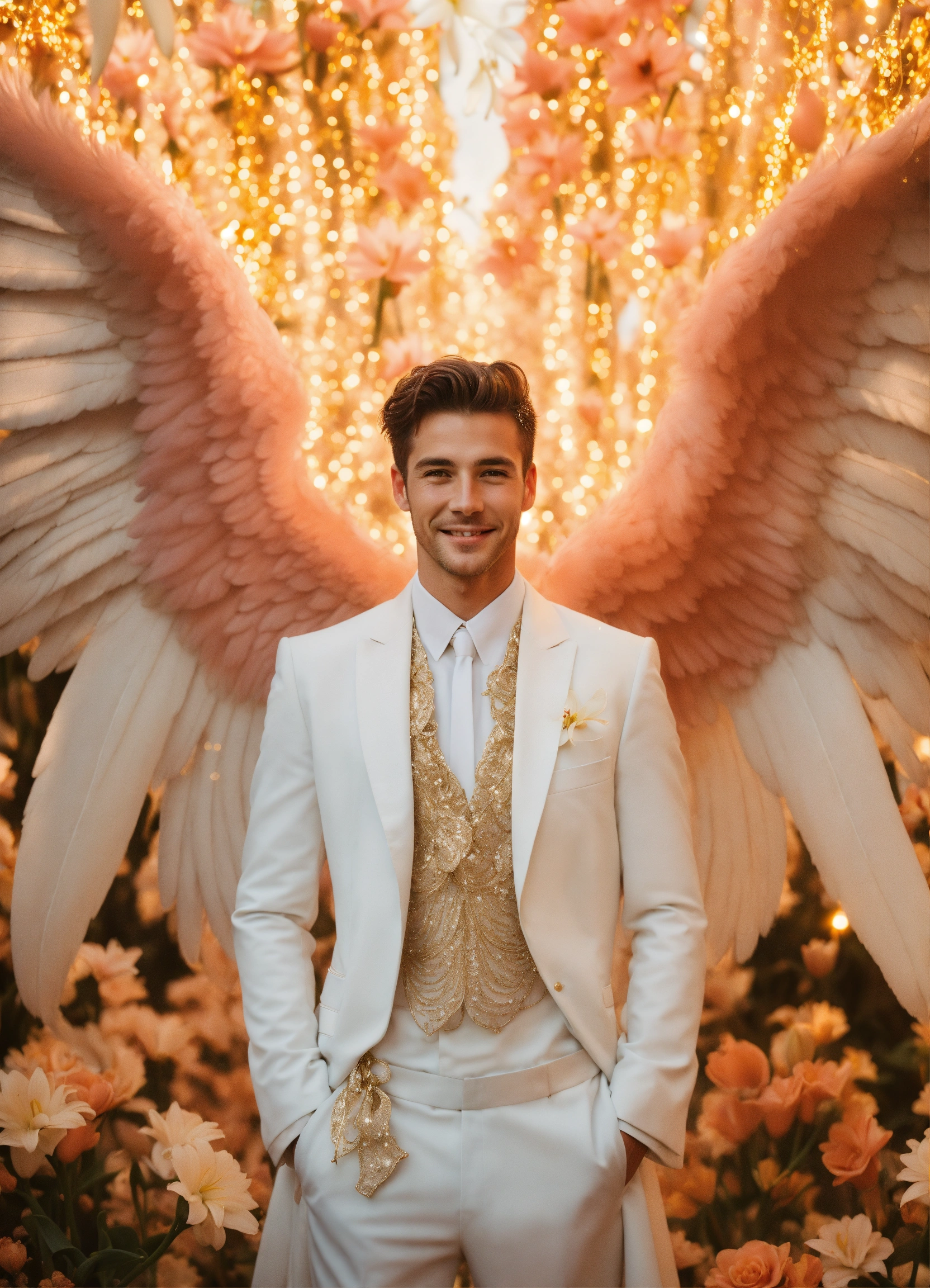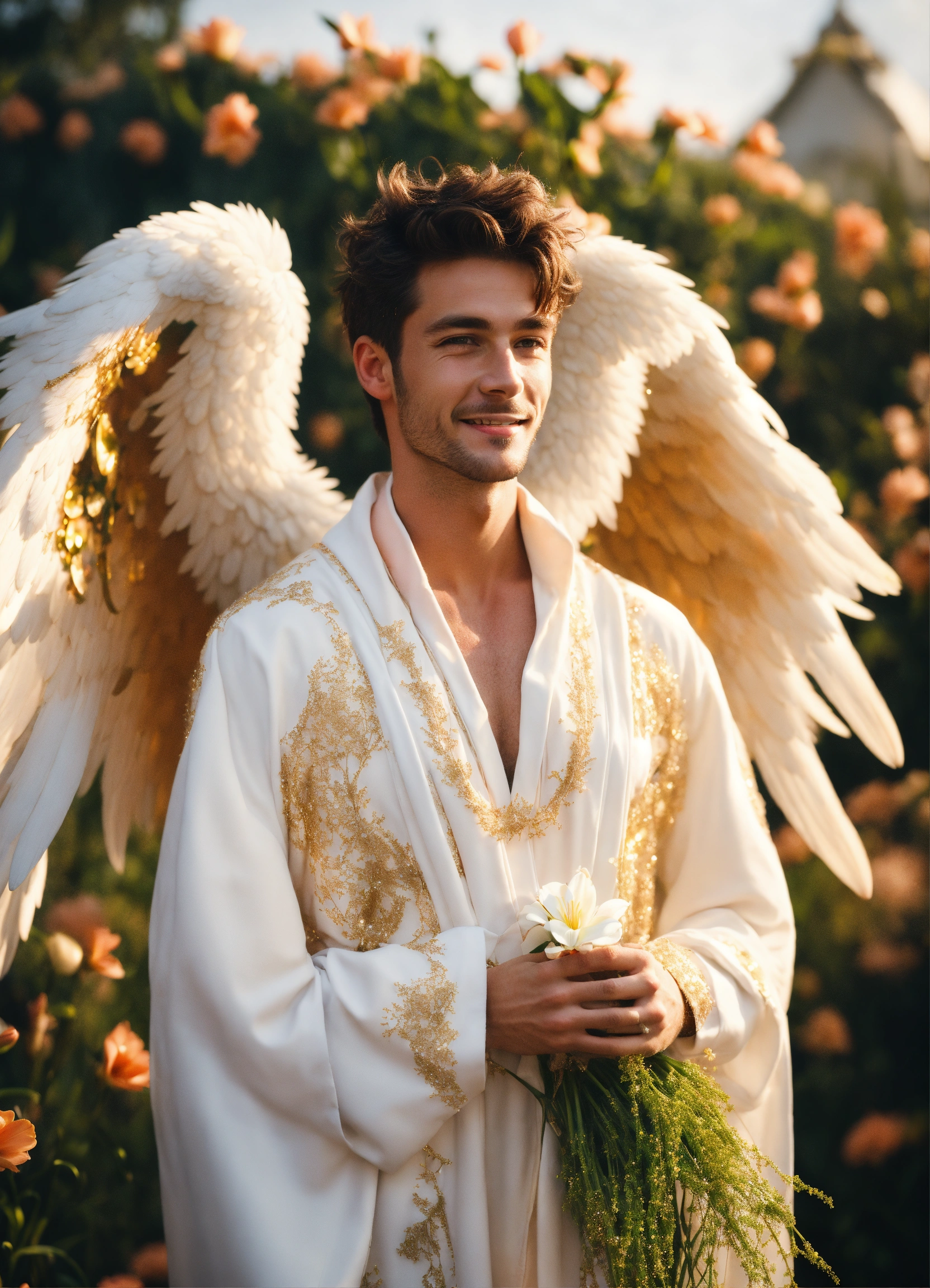 Iconoclastic surreal close-up photo portrait of happy, handsome happy masculine archangel male gorgeous supermodel white blissfully joyous, gentle friendly smile, staring lovingly straight ahead directly into camera at me, gigantic huge massive full white wings spreading out from his back, holding an lily, short brown hair, warm hazel eyes centred directly on me, wearing sparkling intricately-detailed peach and white choir robes with high neckline, symmetrical, iconic, striking, award winning photo, powerful, emotional, editorial fantasy photoshoot by alessio albi, background is raining gold sparkles over a flower garden in the morning. film grain.
