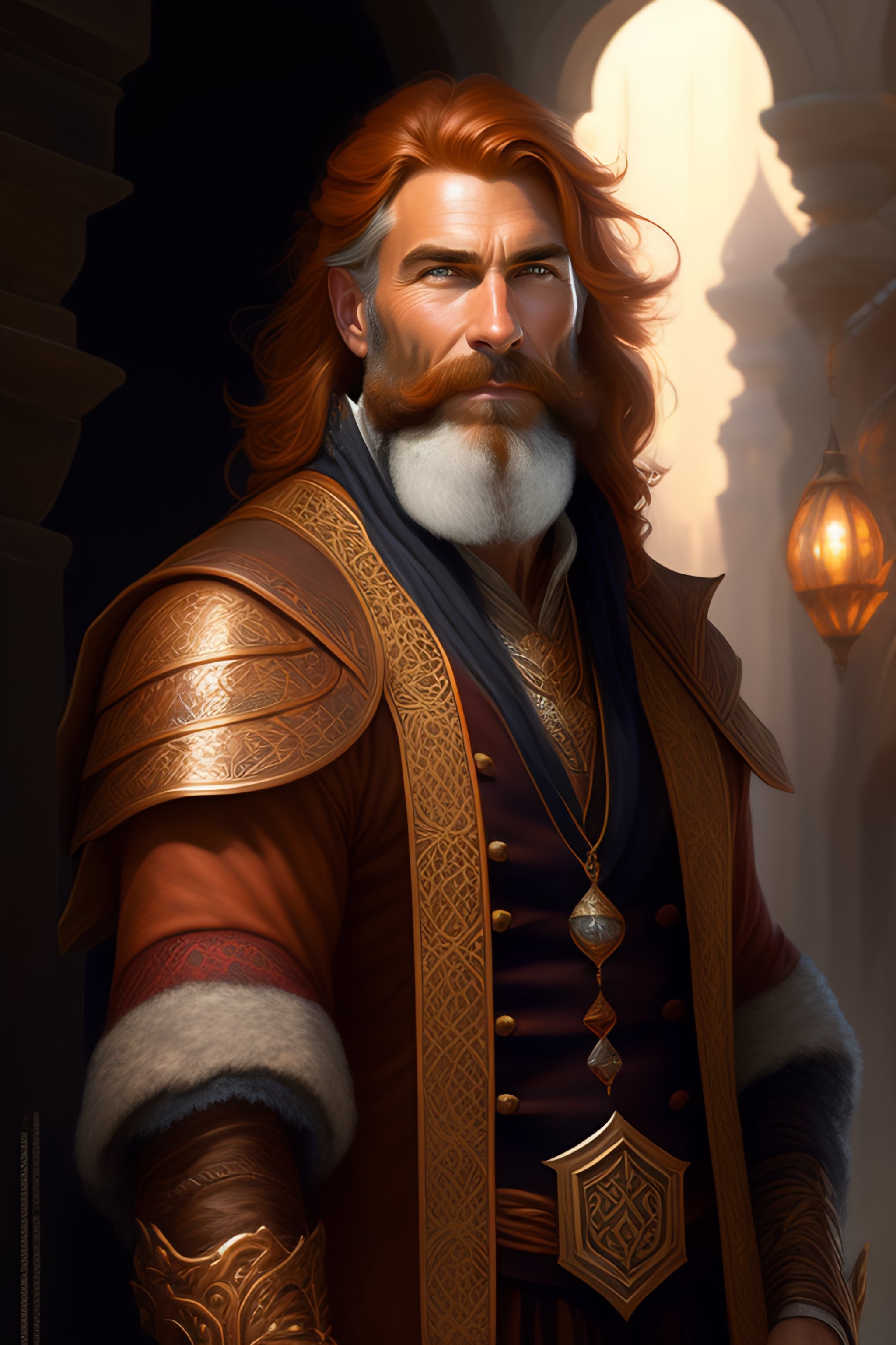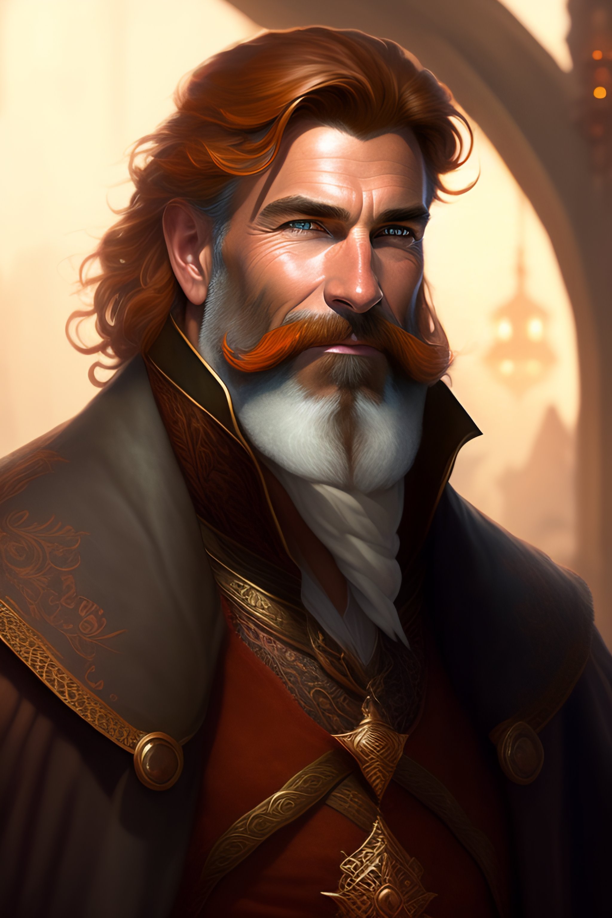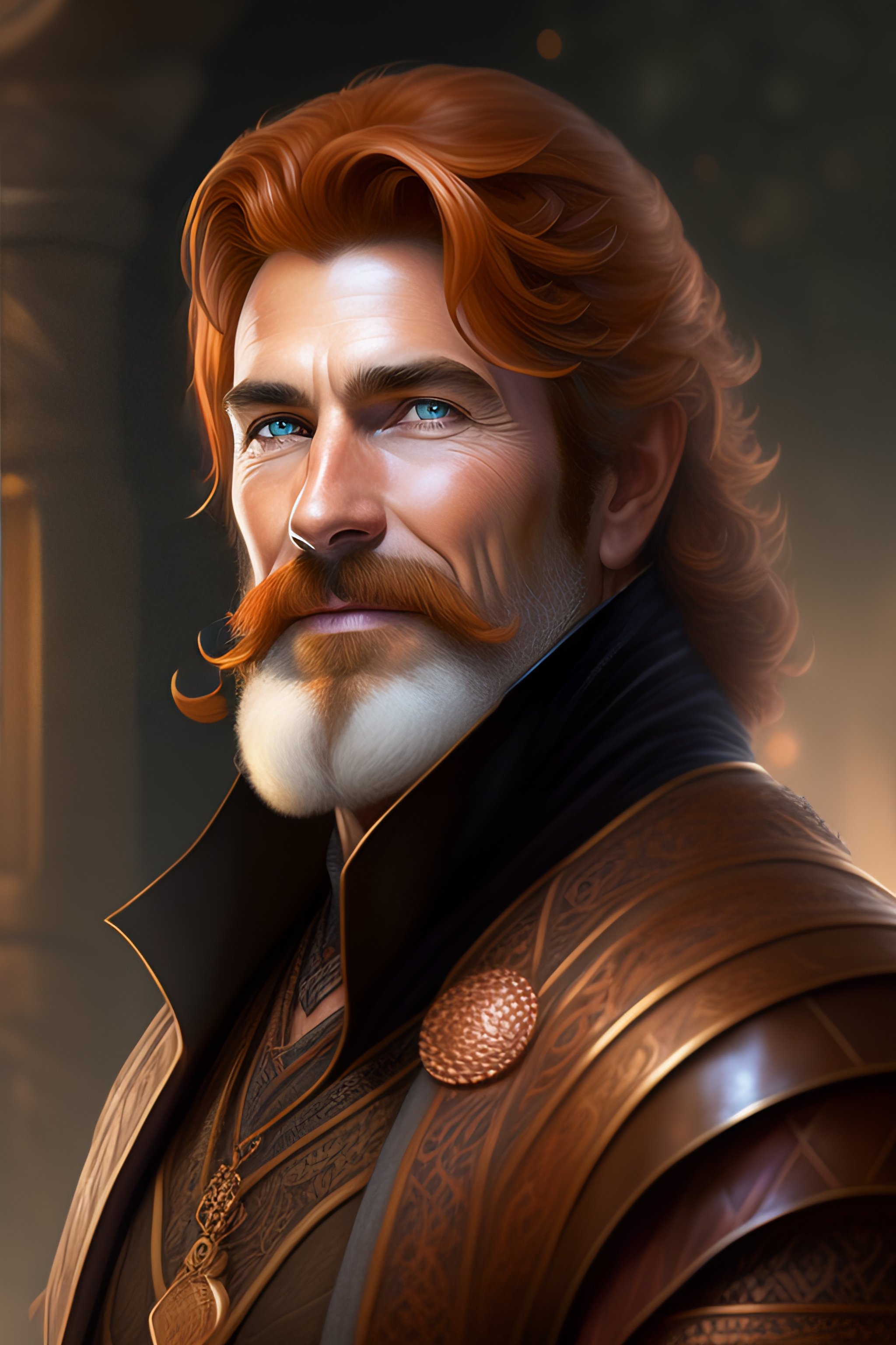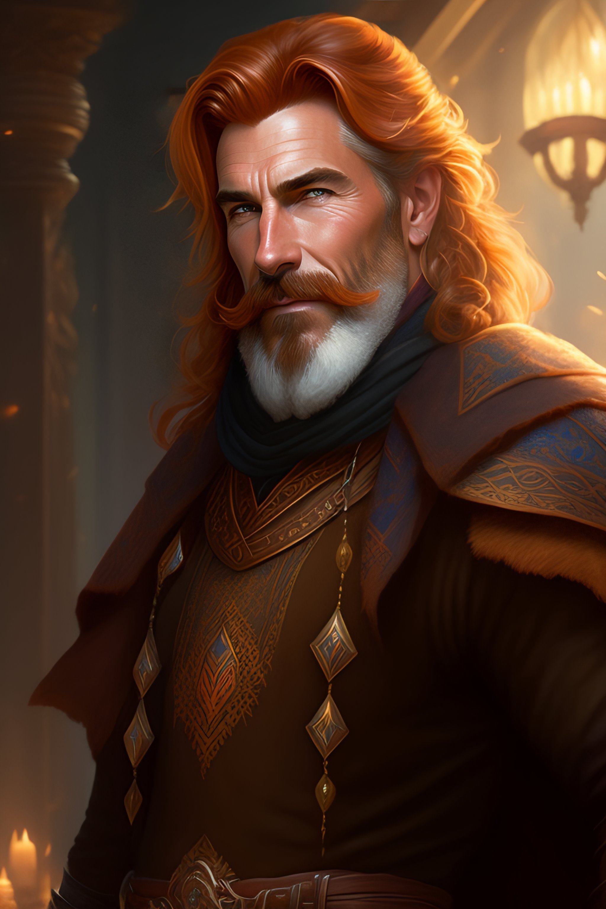 Portrait of a middle aged ruggedly handsome but joyful merchant, male, masculine, upper body, copper hair, short hair, wavy hair, d & d, fantasy, sharp features, intricate, velvet tunic, elegant, highly detailed, artstation, concept art, matte, sharp focus, illustration, art by artgerm and greg rutkowski and alphonse mucha