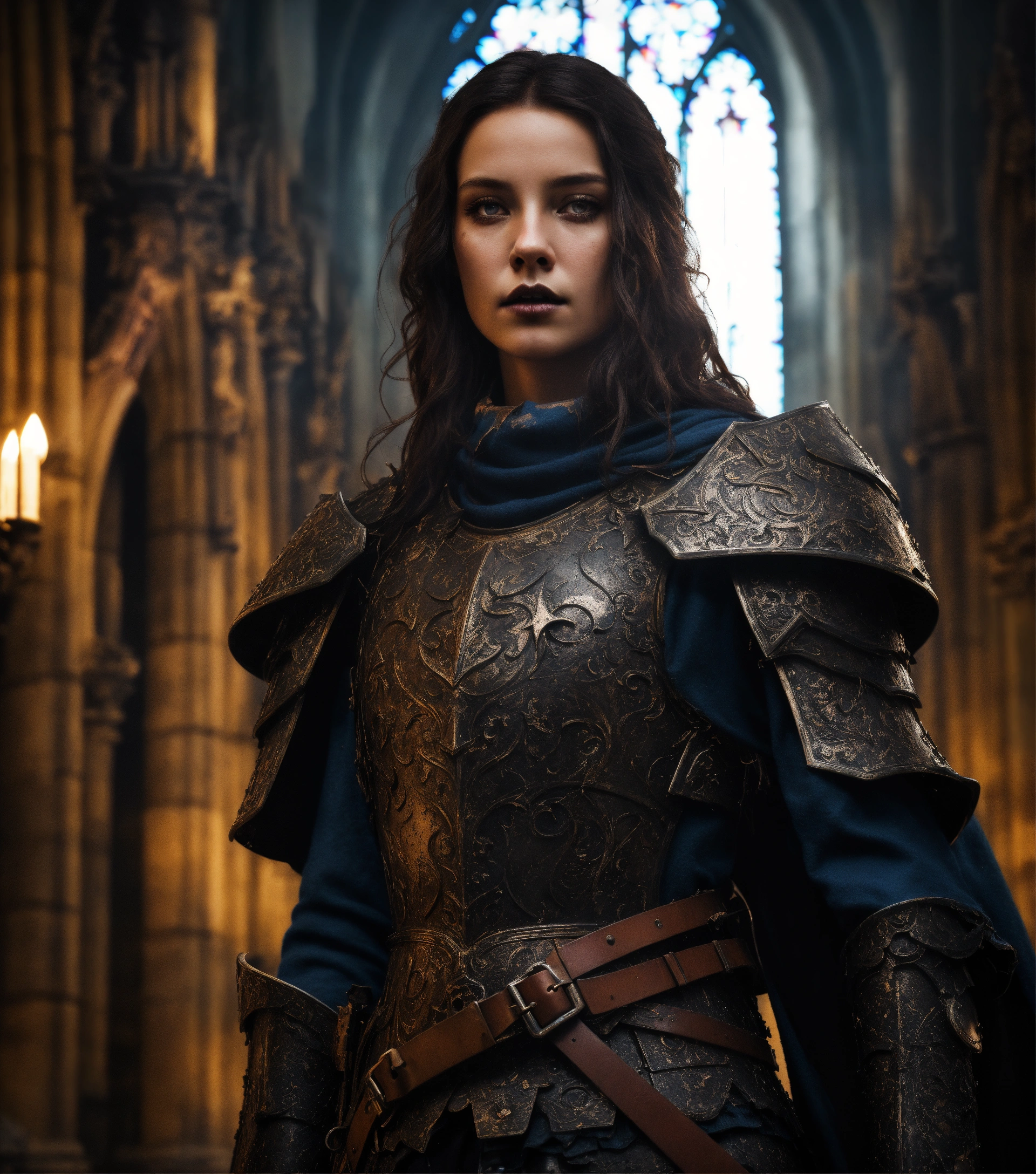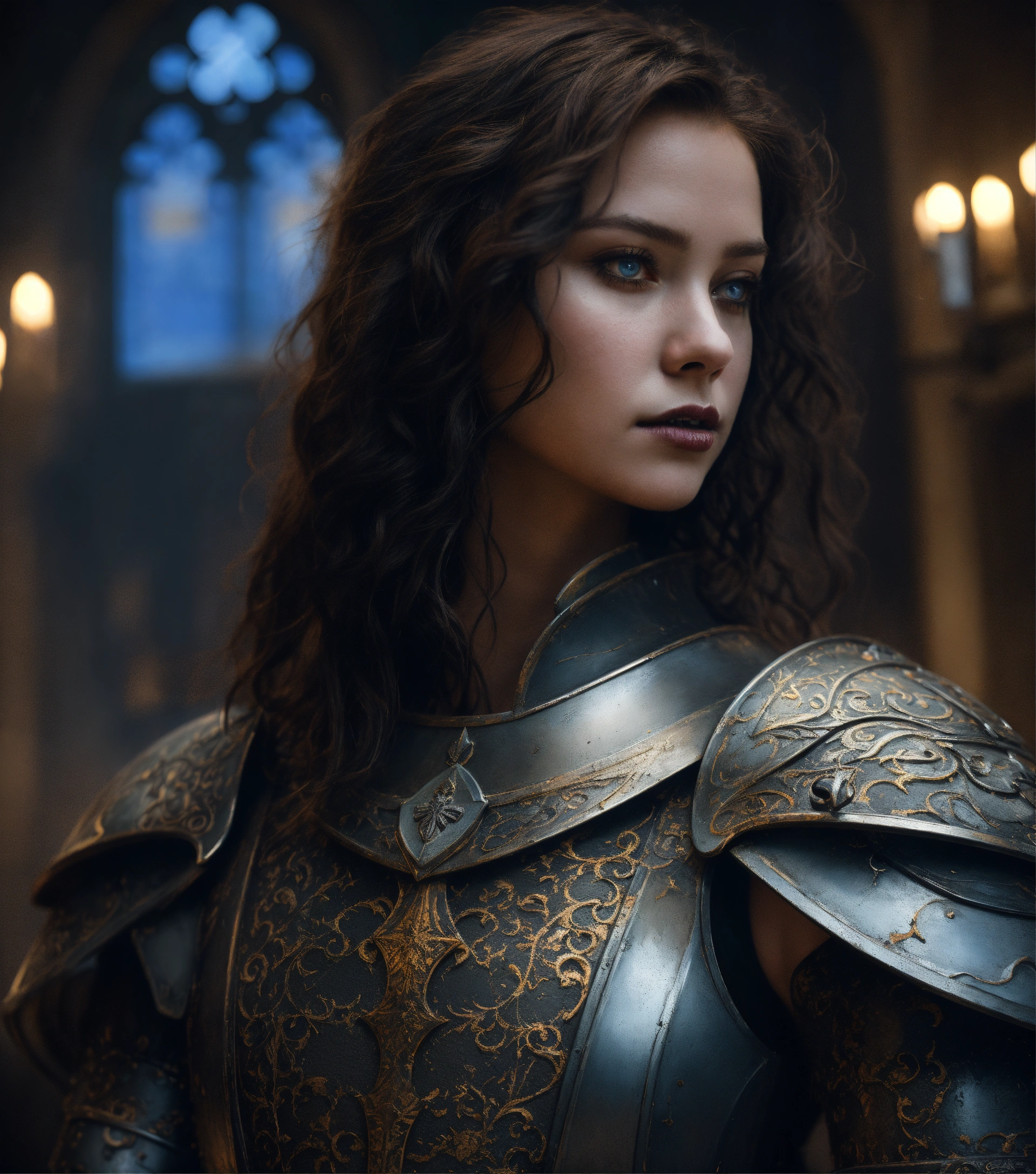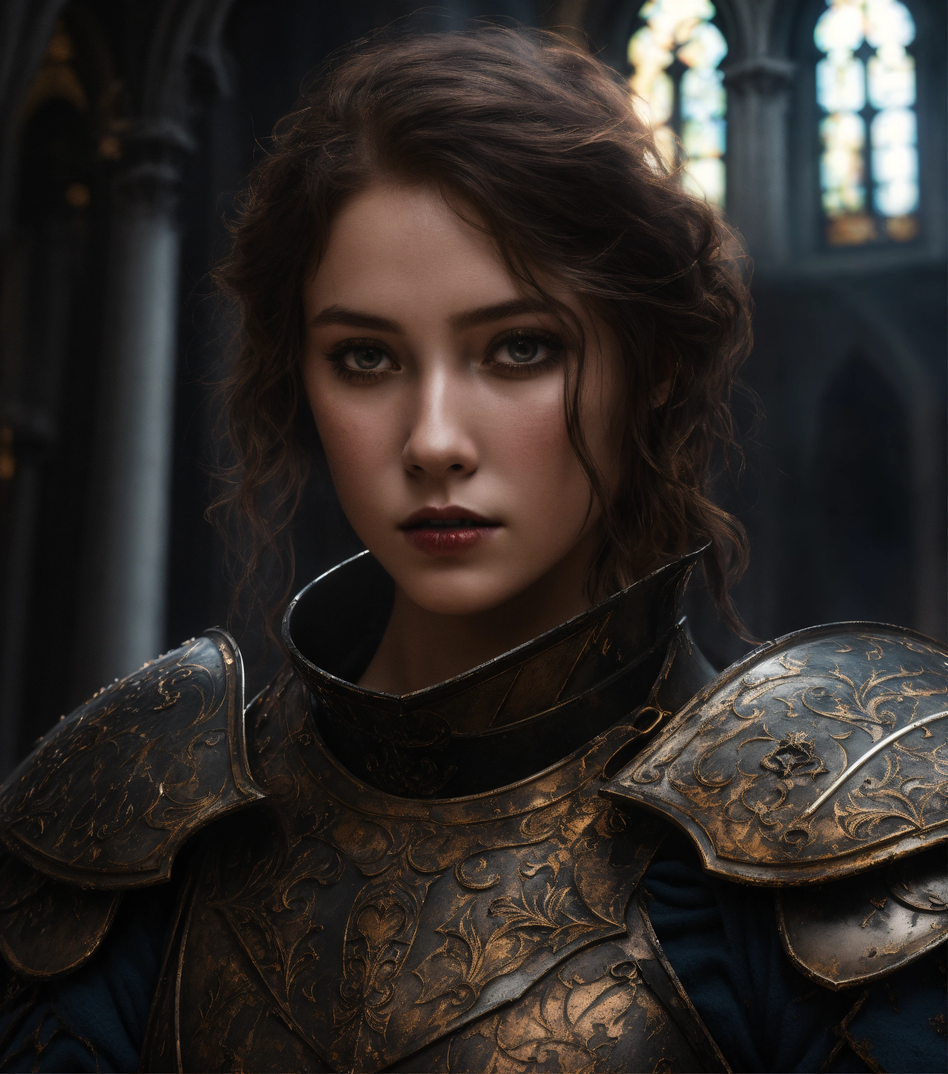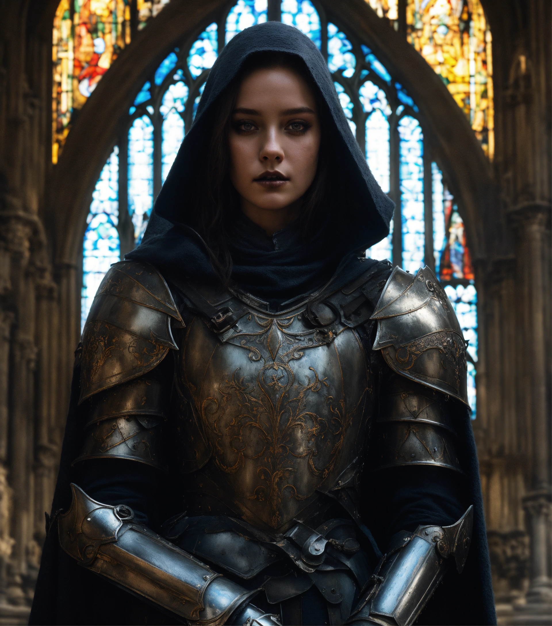 Mid-plan cinematic illustration by christopher rush. portrait in three-quarter close-up, dark fantasy film style, stunningly beautiful slender girl, (expressive and deep [symmetrical eyes]), stunning naive and innocent face, black long hair, ([girl wearing max detailed damaged full knight armor of blued steel | max detailed worn armor in dark fantasy film style | (intricately detailed1. 2) shabby black knight armor made of blued steel(top artstation1. 1) 20])+++, superbly detailed tattered dark brown wool cloak with coarse weave, (intricate dark corridors of gothic cathedral1 3), stained glass, dramatic background, gloomy and scary atmosphere, natural funnel texture, expressive background, super detail, hyperphotorealism, natural daylight, (12k, uhd, super resolution, rembrandt lighting)+++, natural reflections, natural textures, stained glass natural lighting, color illumination, cinematic lighting