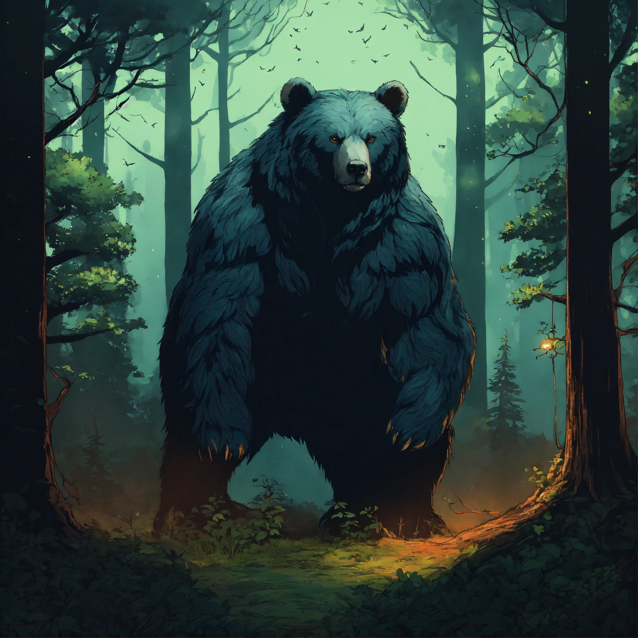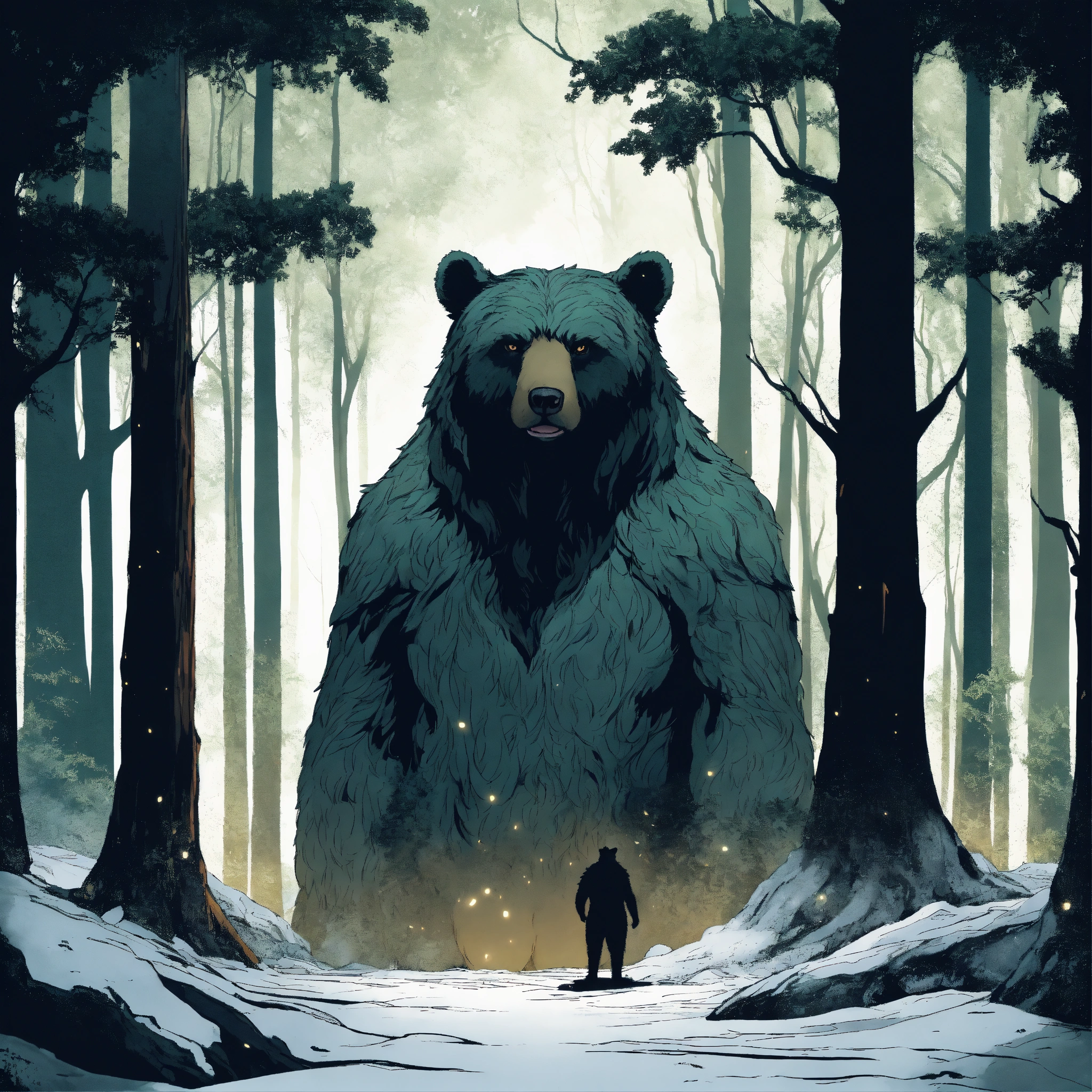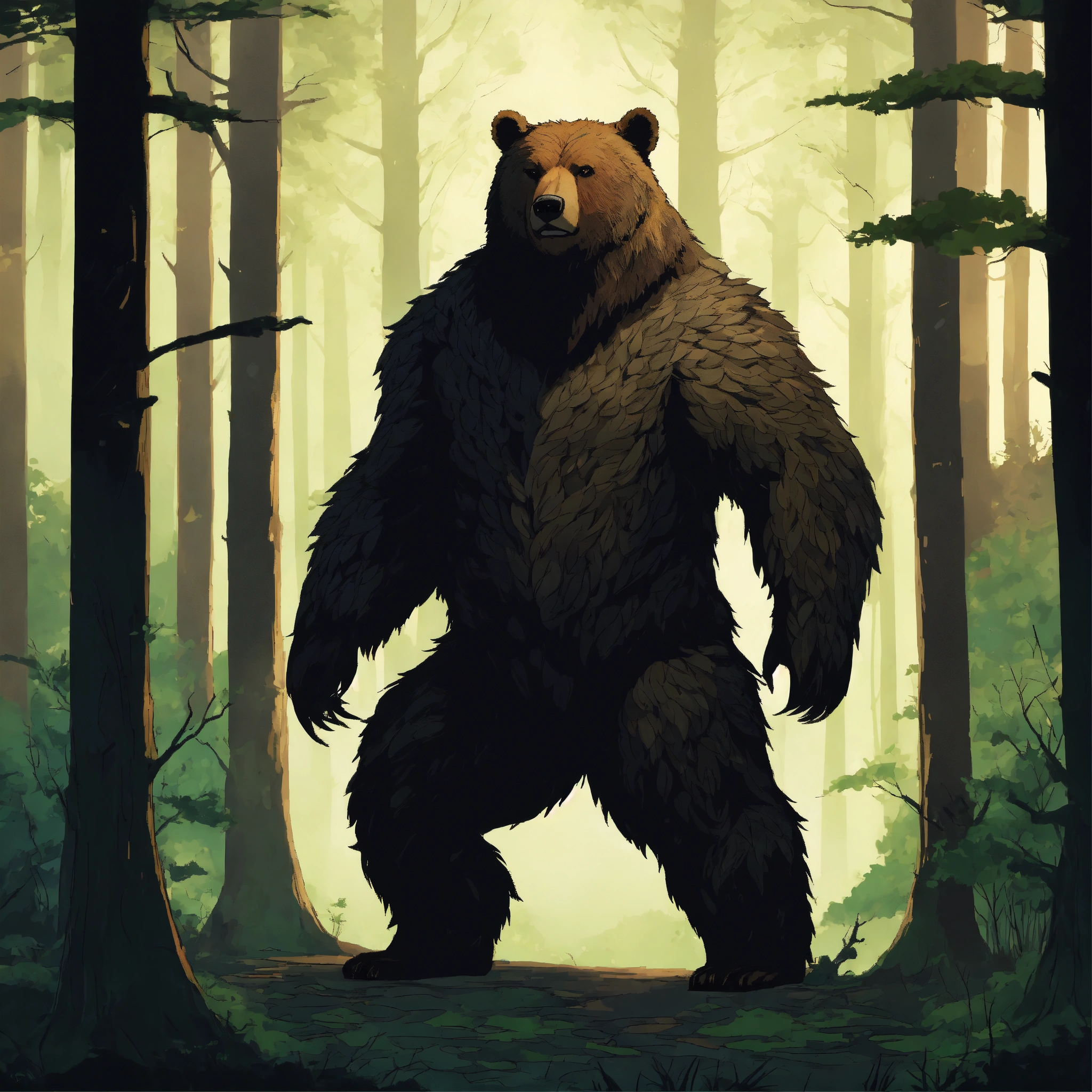 A fantasy creature that is a guardian of the forest, large in stature, looks like a bear and tree, background dark forest, graphic novel art