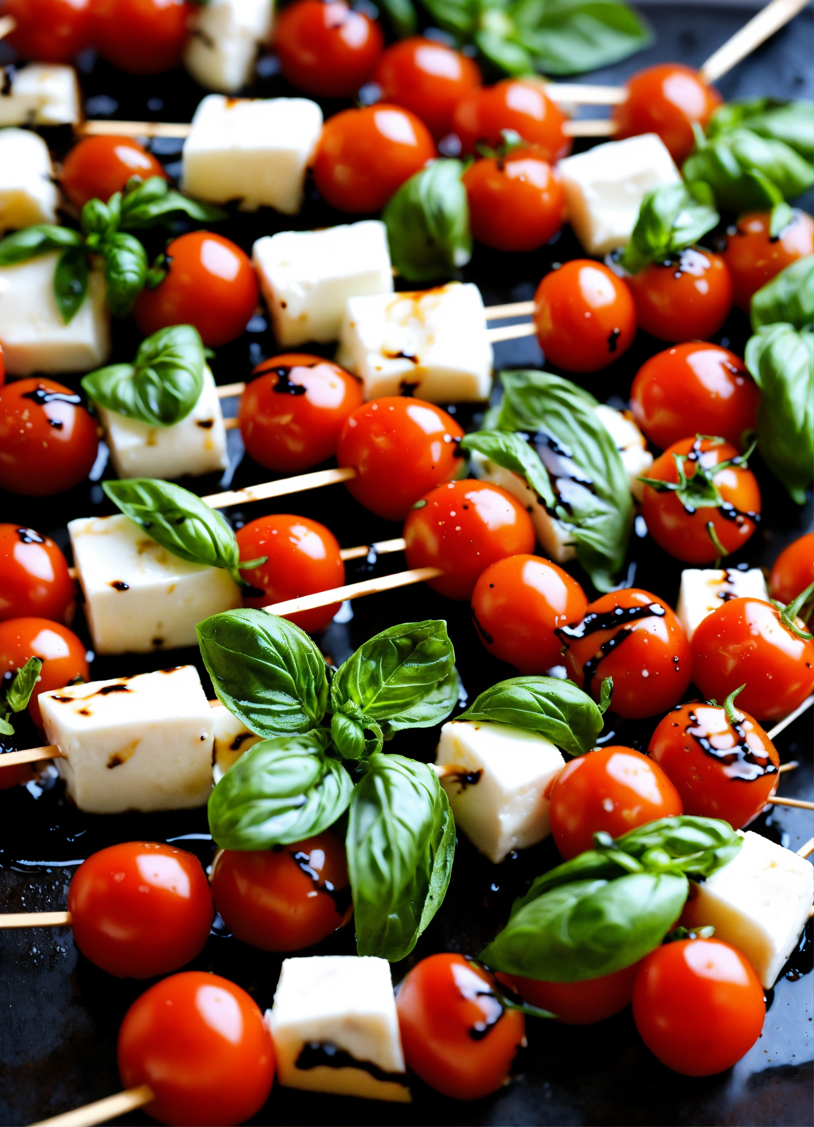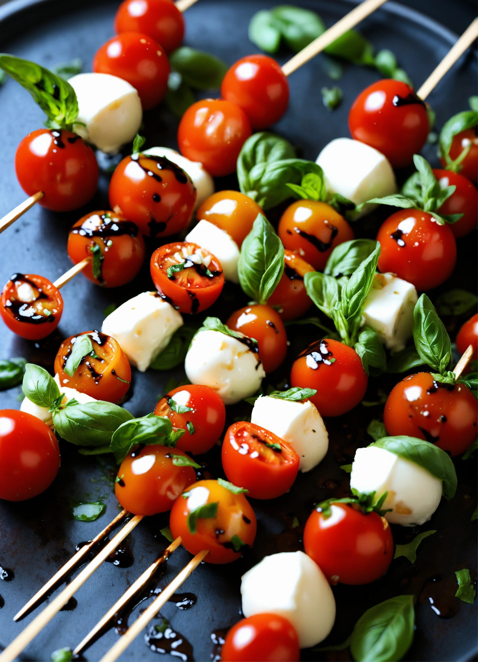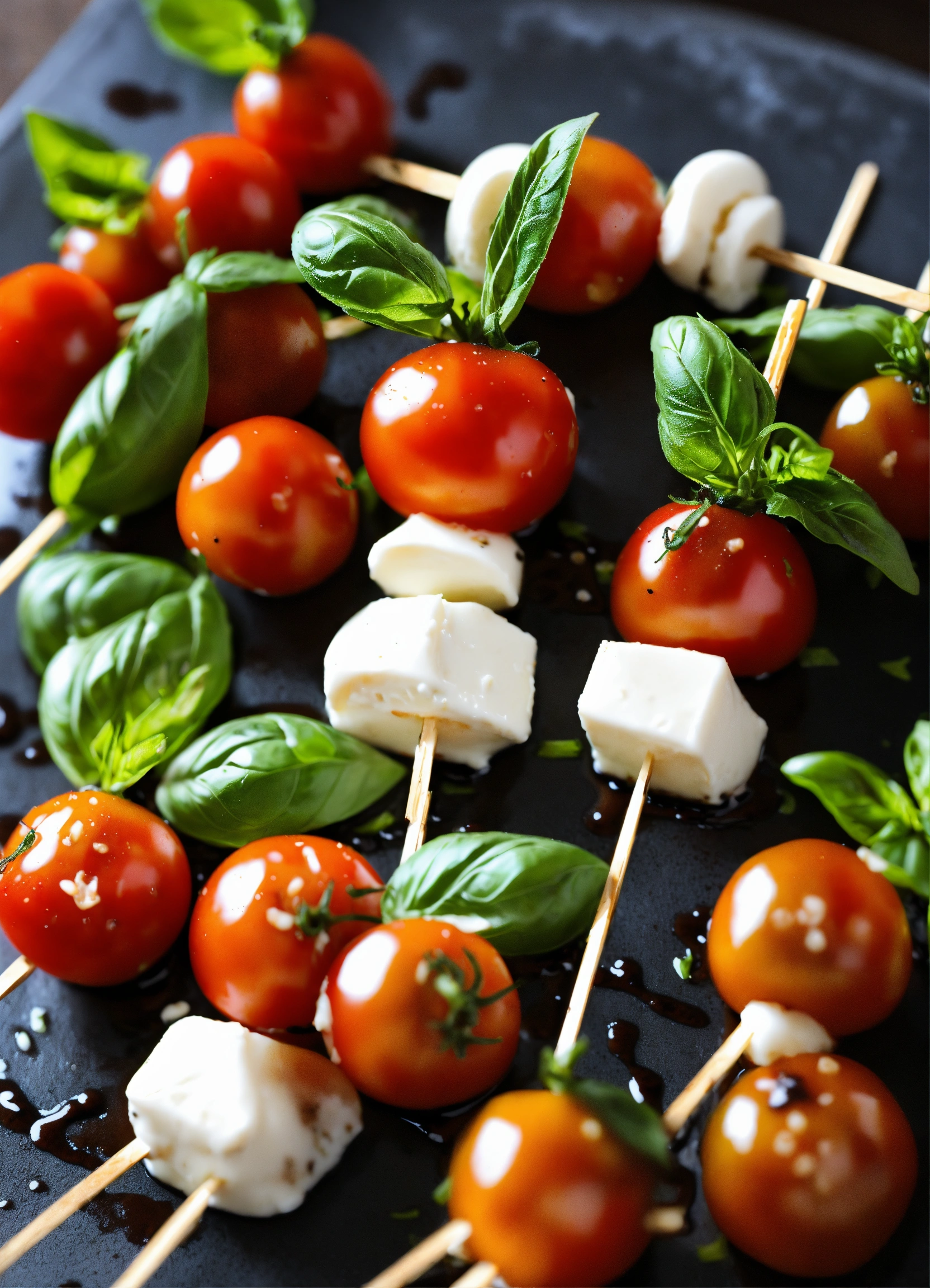 Caprese skewers ingredients cherry tomatoes, fresh basil leaves, dairy-free mozzarella, balsamic reduction. instructions thread cherry tomatoes, basil, and dairy-free mozzarella onto skewers. drizzle with balsamic reduction.