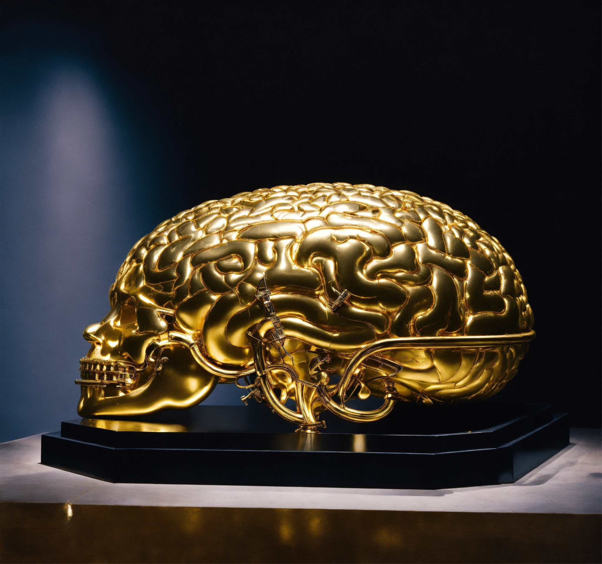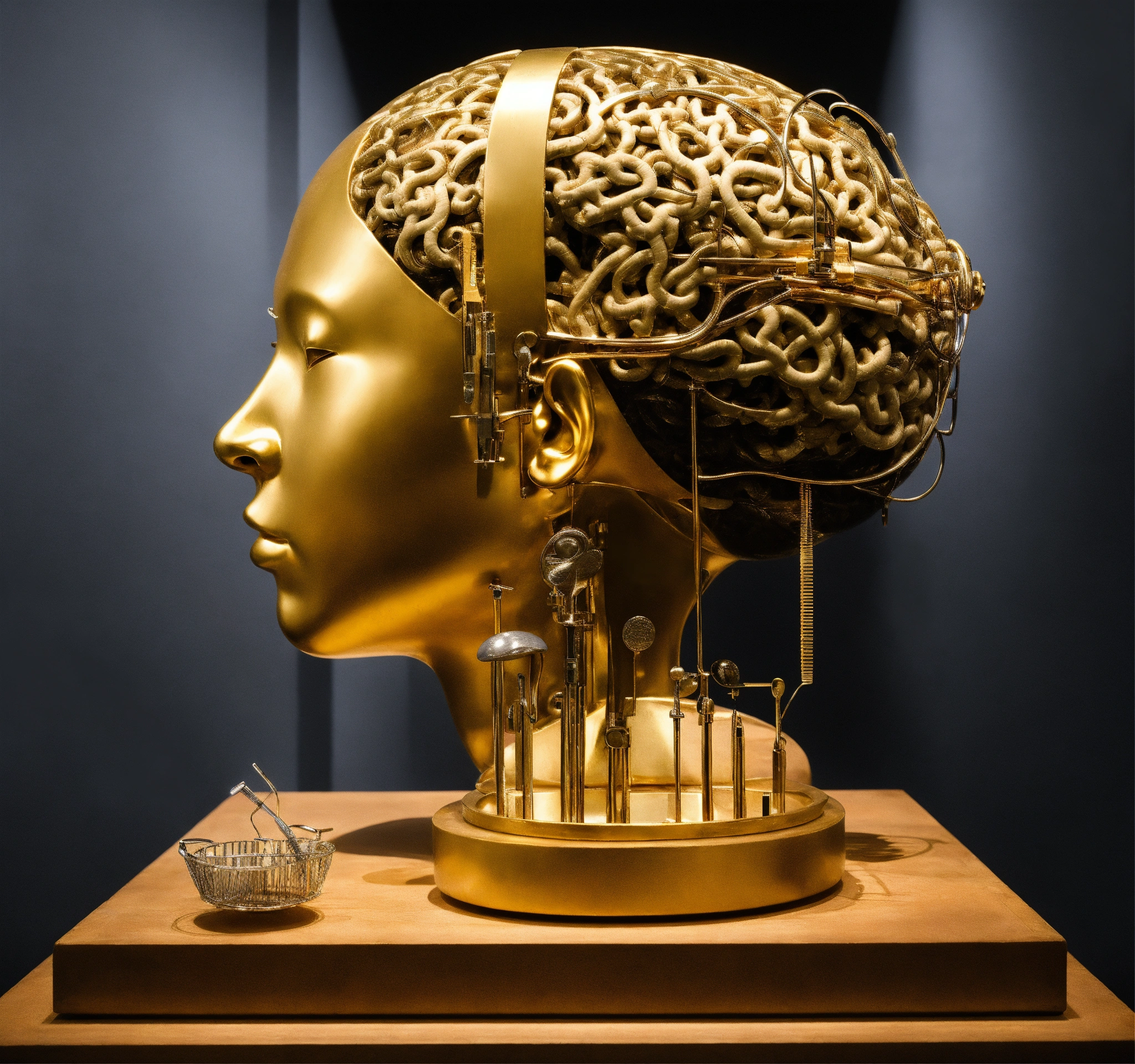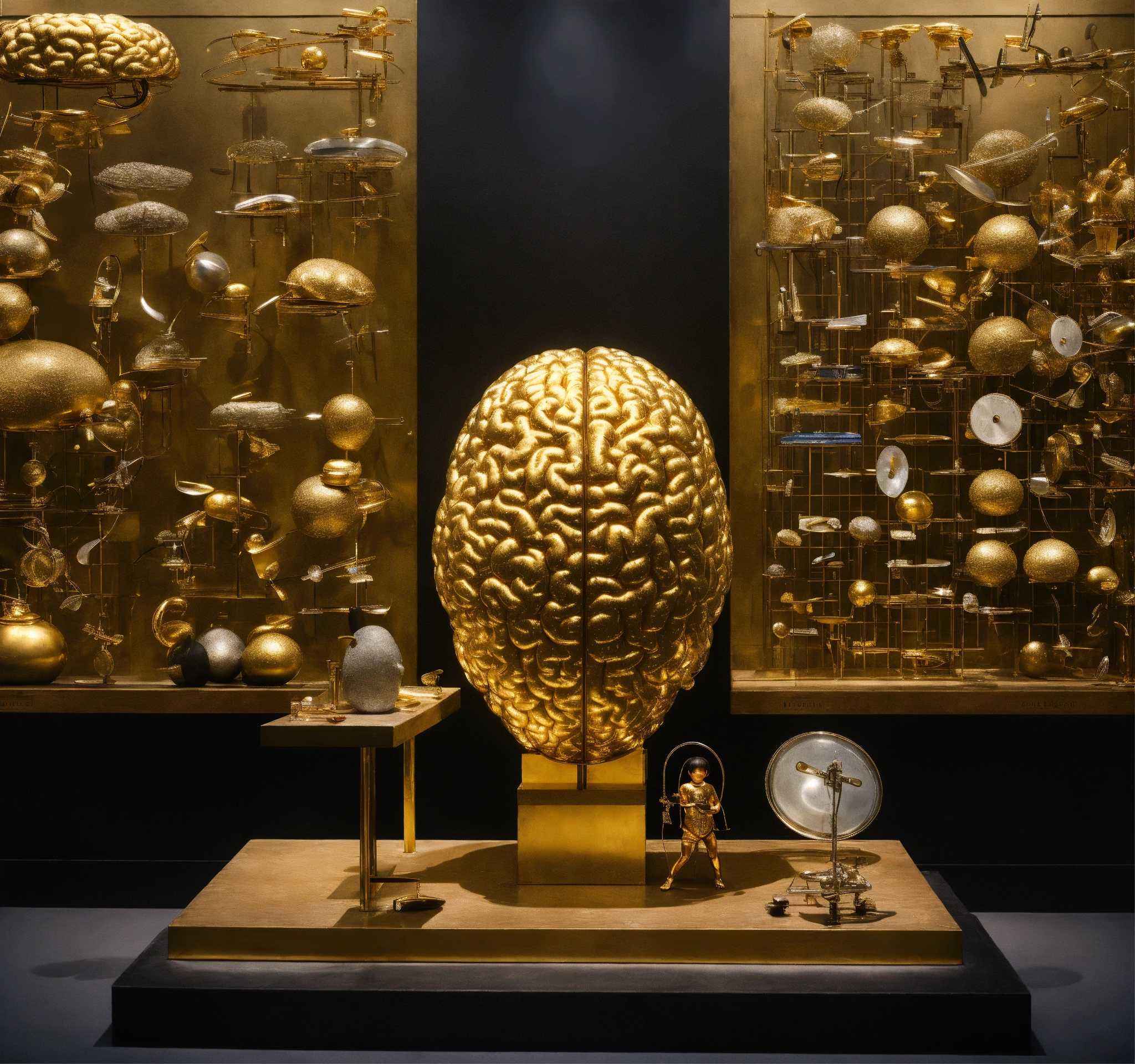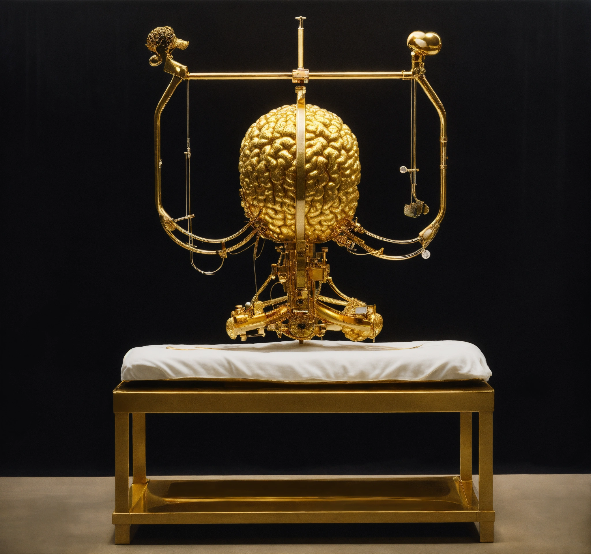A huge golden brain with complex surgical instruments, very small beautiful asian female human body, a chinese newborn boy, surrealism, symbolism, minimalism, black background, installation, sculpture by lucian freud, rene magritte, salvador dali