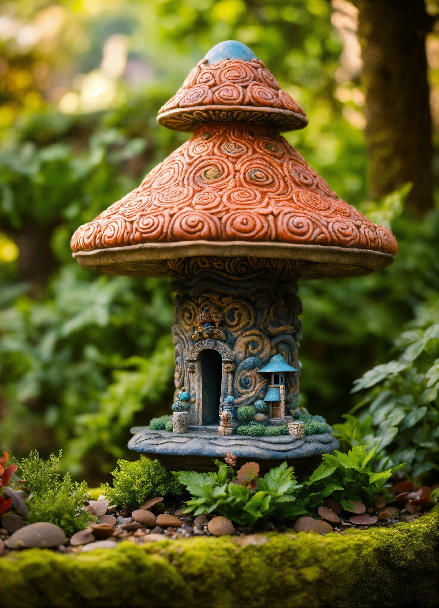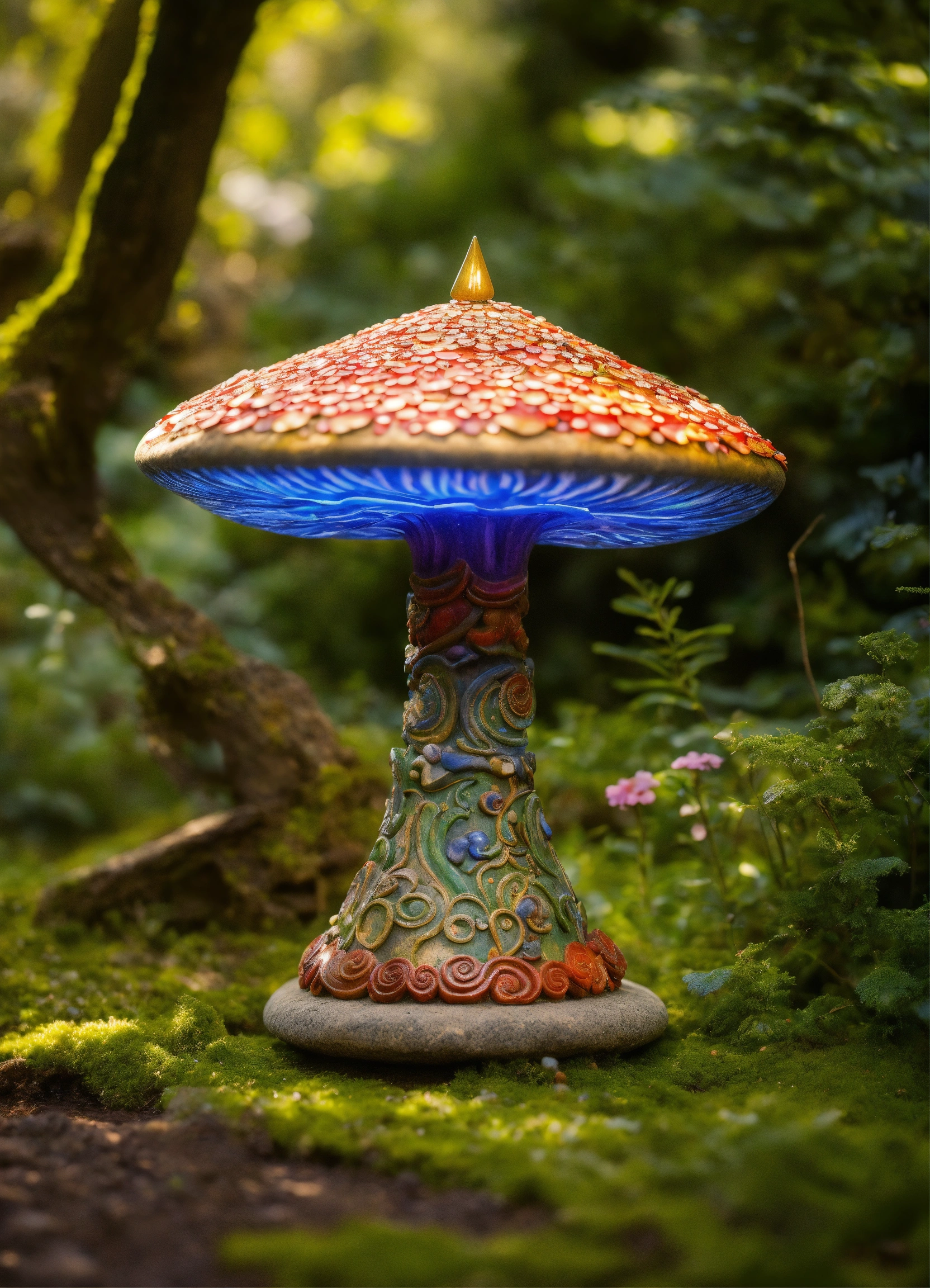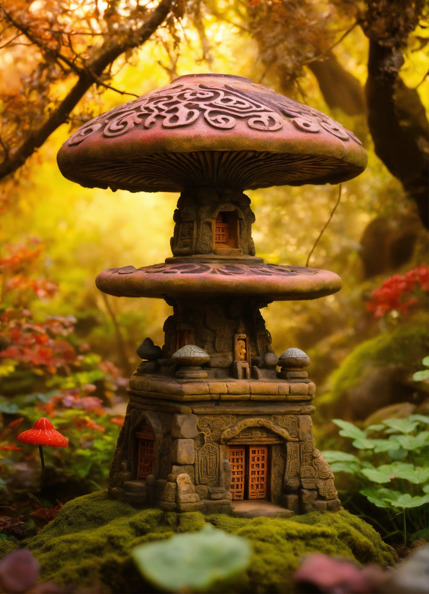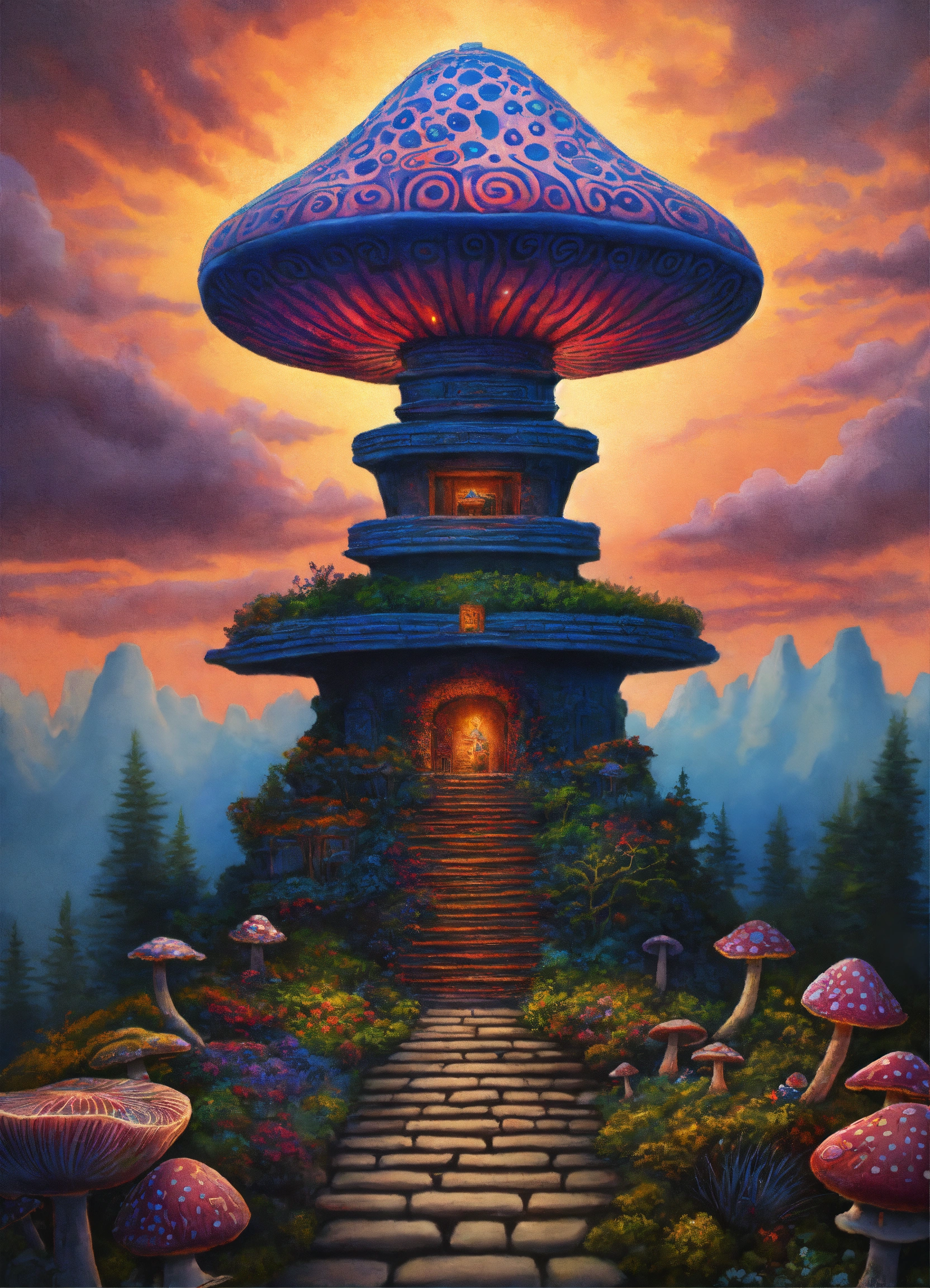 An ancient stone meditative magic mushroom pagoda totem garden ornament style of alex grey